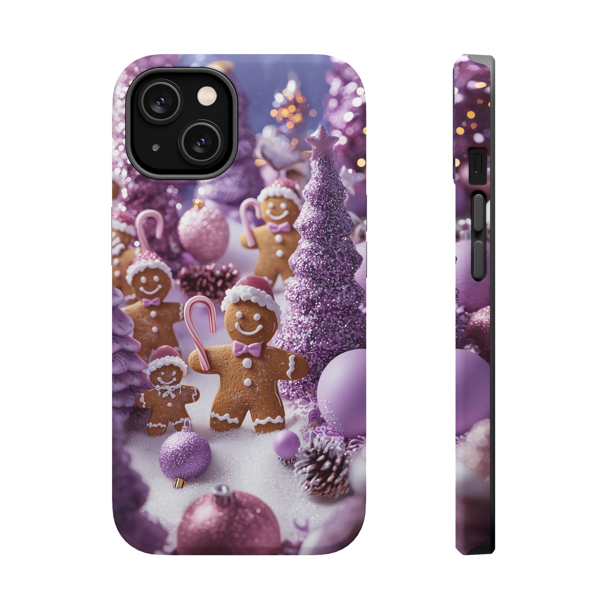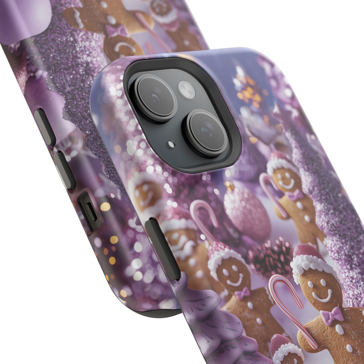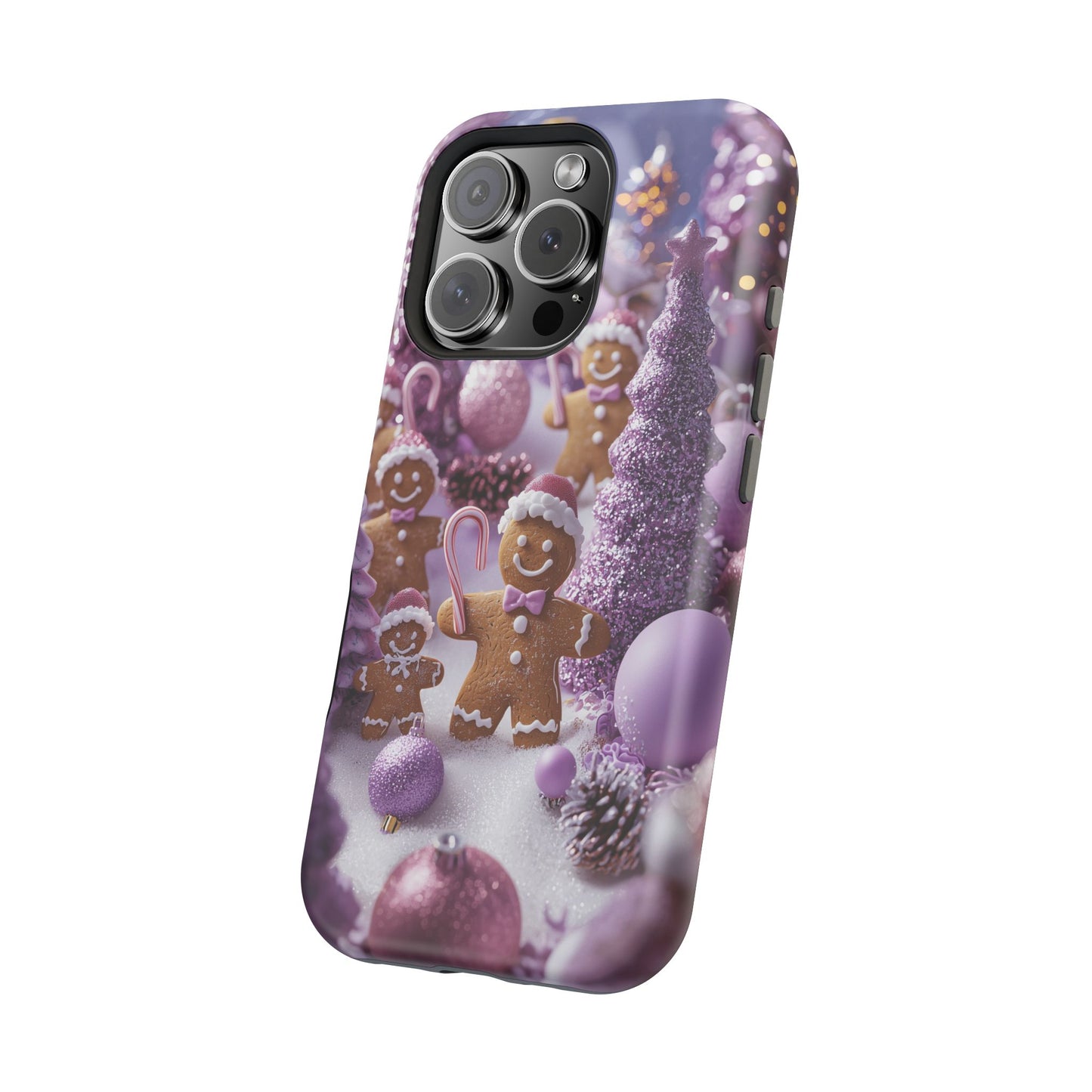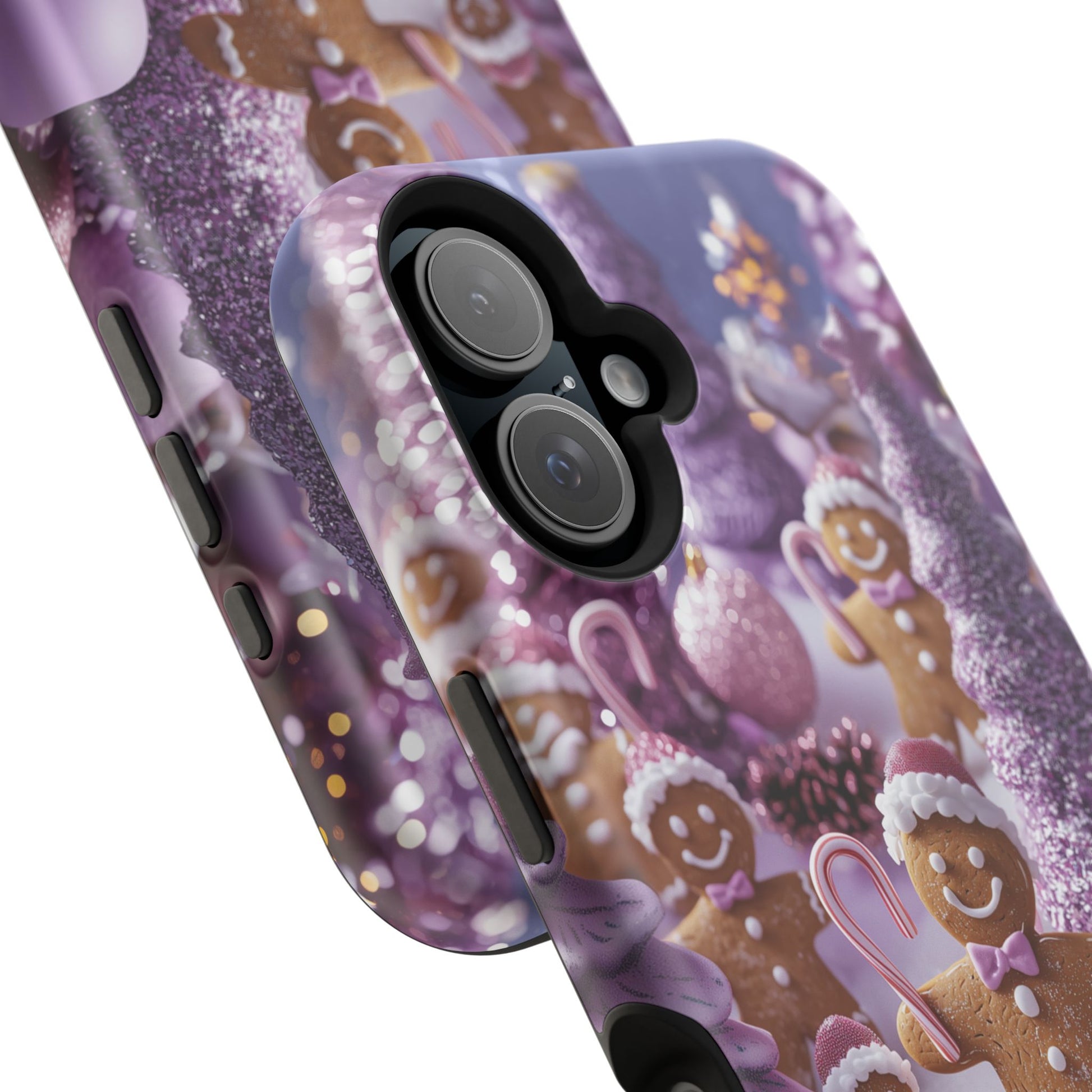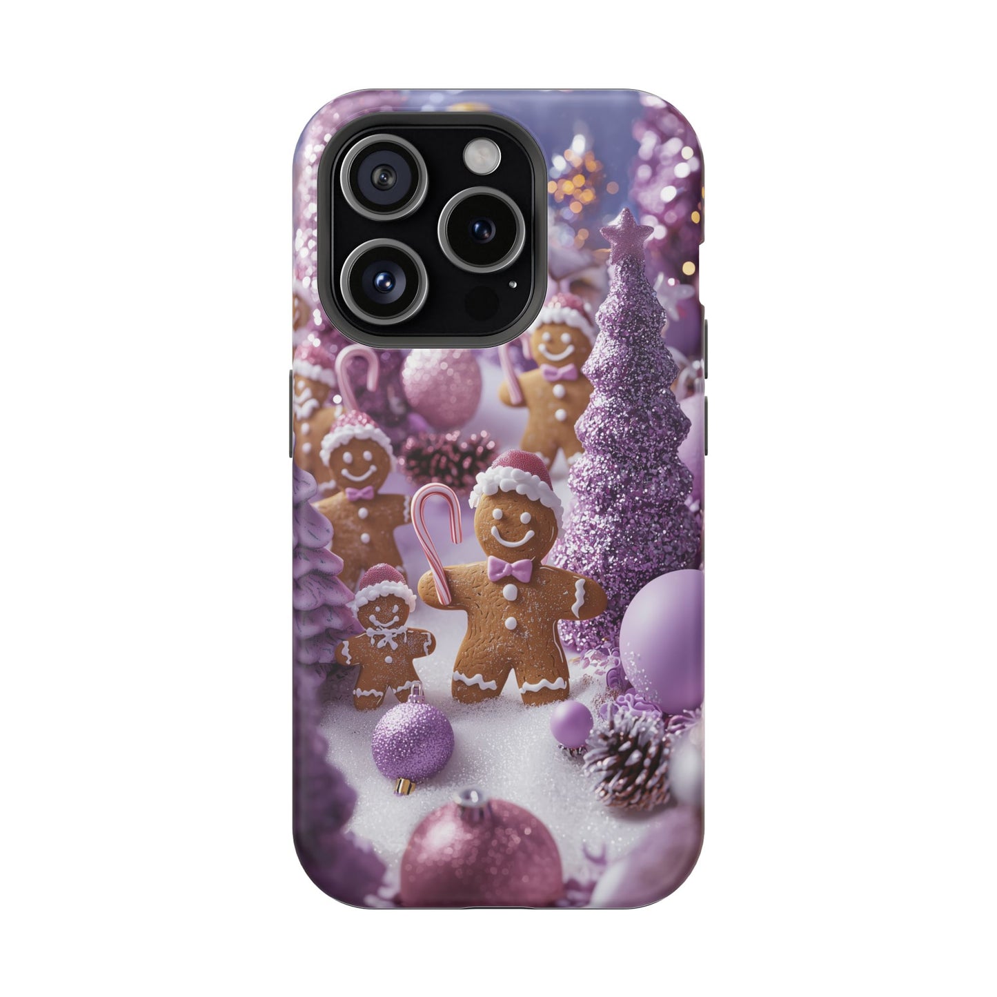 Step into a whimsical winter forest with our Pink Frosted Gingerbread Forest MagSafe iPhone case! This charming holiday design features a playful scene of gingerbread cookies dressed in Santa hats and bow ties, surrounded by sparkling pink and lavender Christmas trees, frosted ornaments, and f...