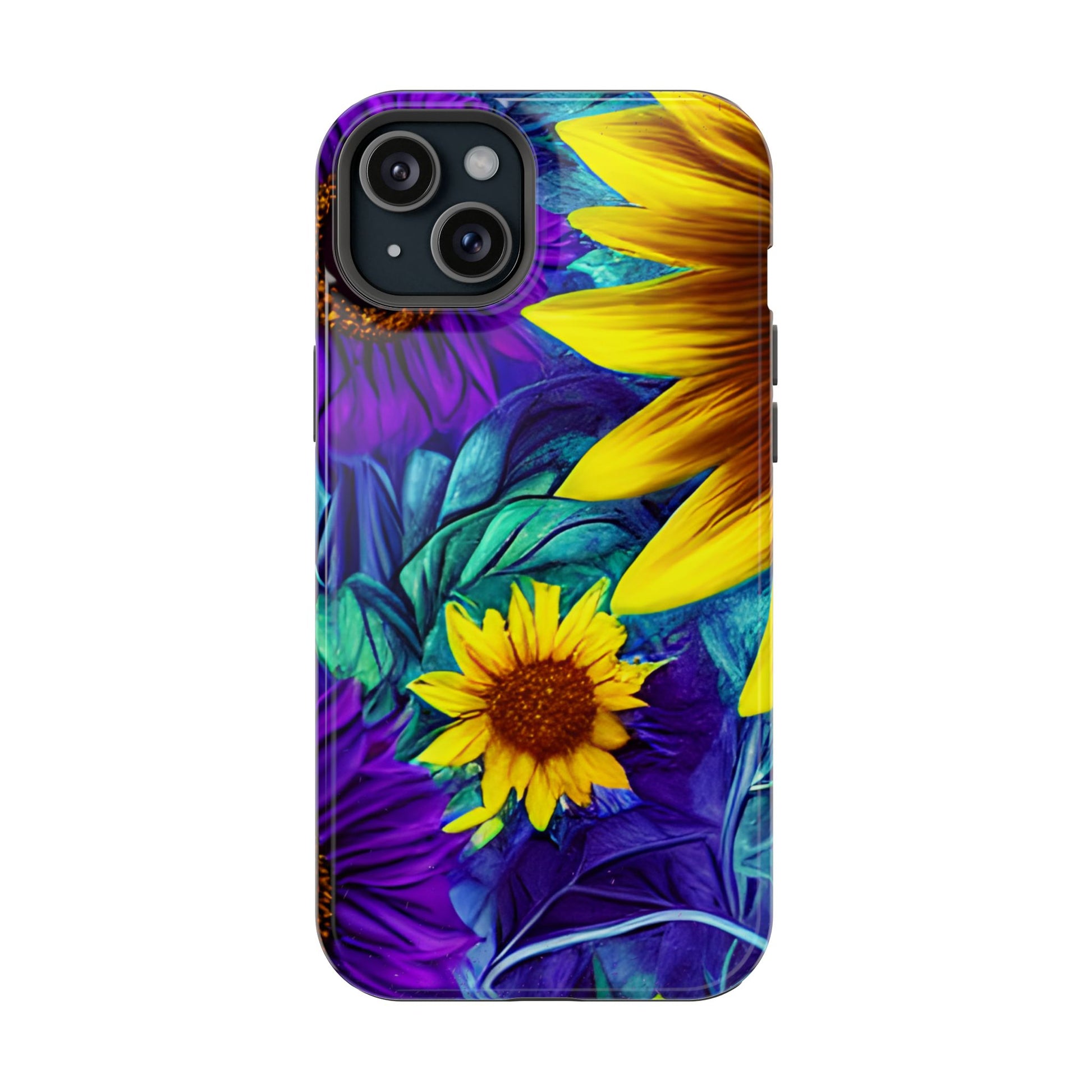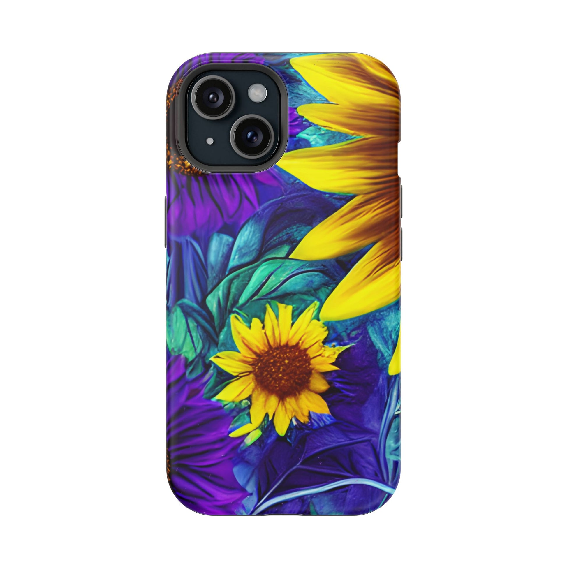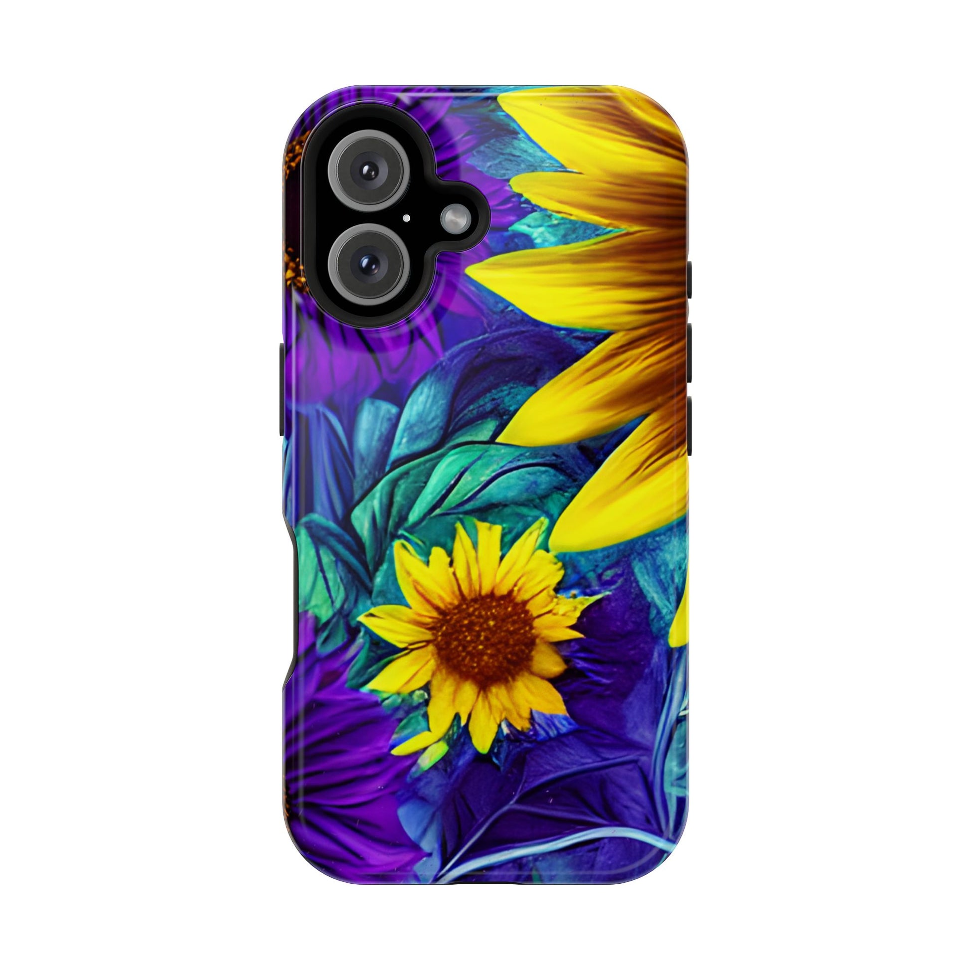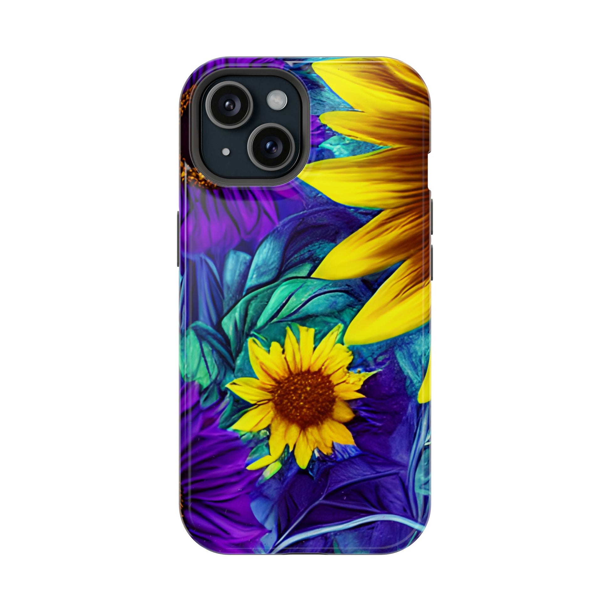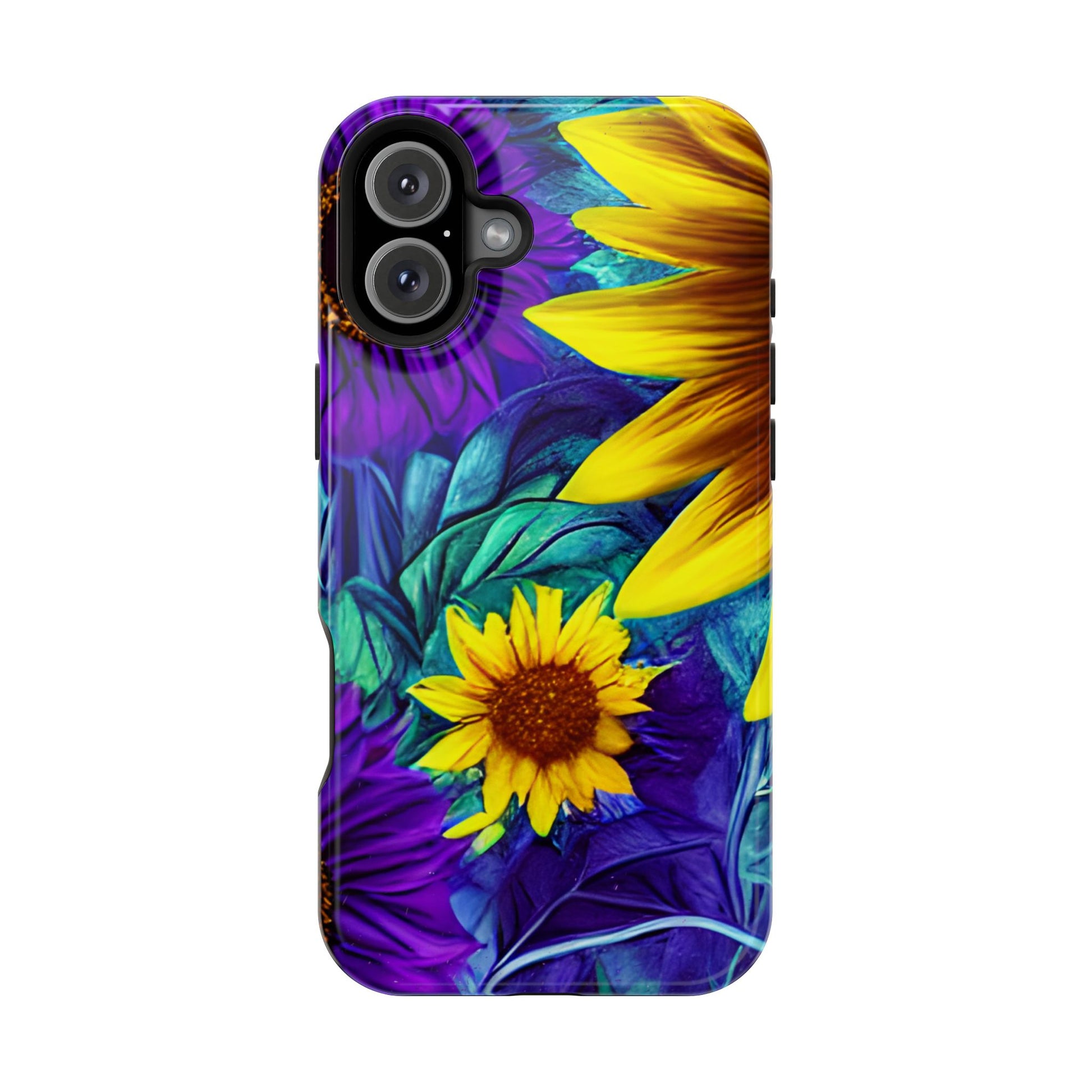Add a pop of color to your phone with our Purple & Gold Sunflower Dream MagSafe  iPhone Case! Featuring a stunning mix of deep purple and vibrant yellow sunflowers against a bold, blue-green leafy background, this case is a perfect blend of elegance and whimsy. Ideal for anyone who loves unique, eye-catching designs, it provides a dramatic look that stands out. Made with a durable polycarbonate shell and a shock-absorbent TPU liner, this case offers reliable protection along with its artistic flair. Bring this floral fantasy with you everywhere you go!