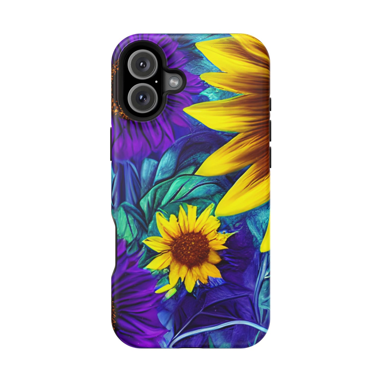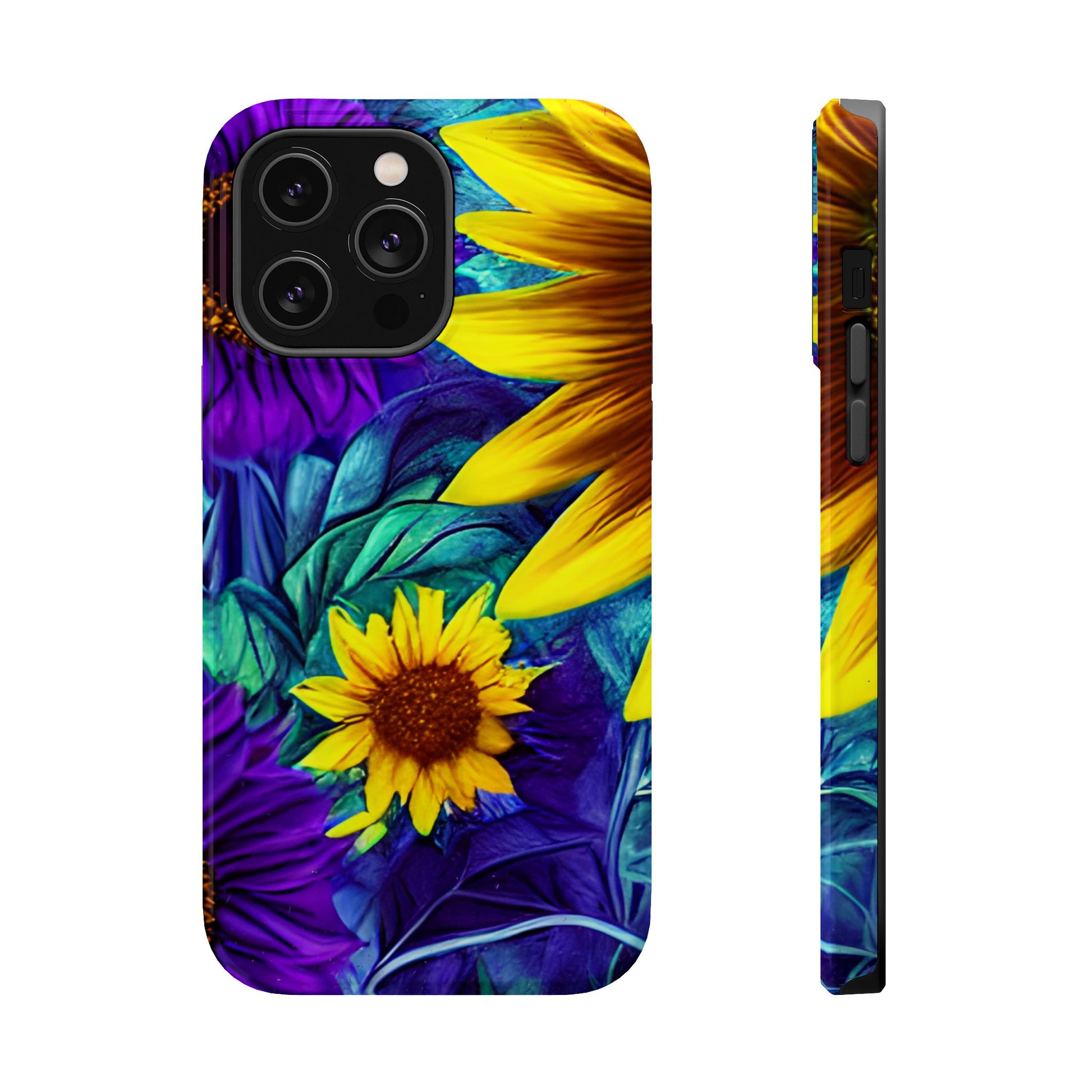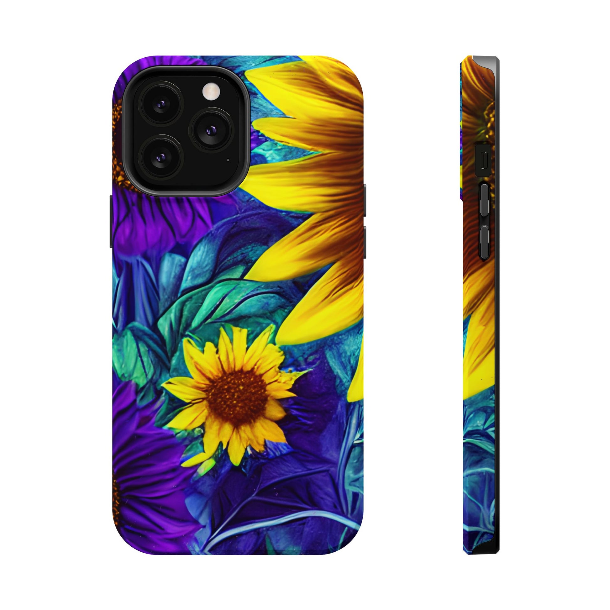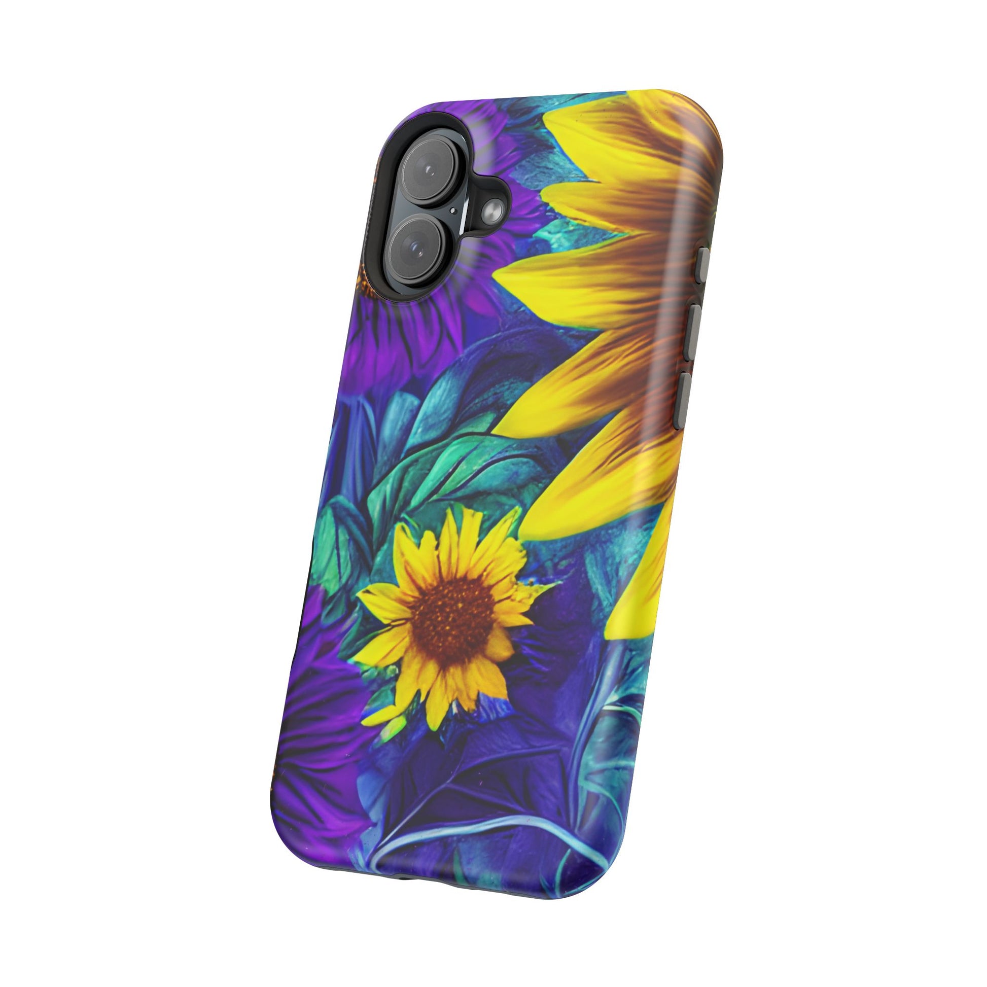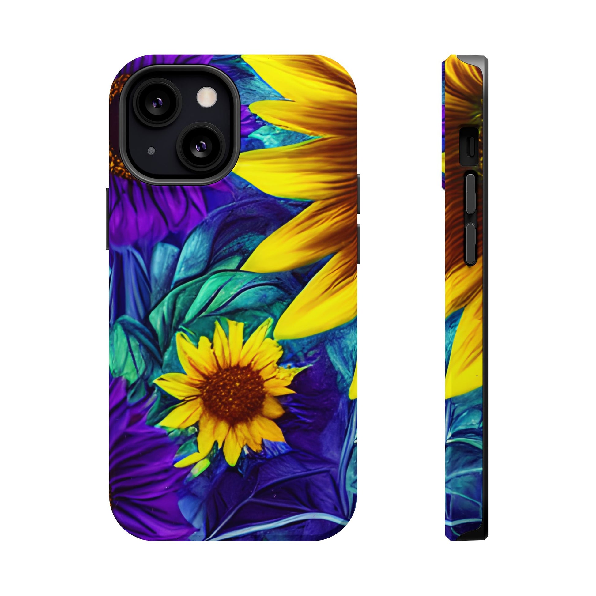 Add a pop of color to your phone with our Purple & Gold Sunflower Dream MagSafe  iPhone Case! Featuring a stunning mix of deep purple and vibrant yellow sunflowers against a bold, blue-green leafy background, this case is a perfect blend of elegance and whimsy. Ideal for anyone who loves unique, eye-catching designs, it provides a dramatic look that stands out. Made with a durable polycarbonate shell and a shock-absorbent TPU liner, this case offers reliable protection along with its artistic flair. Bring this floral fantasy with you everywhere you go!