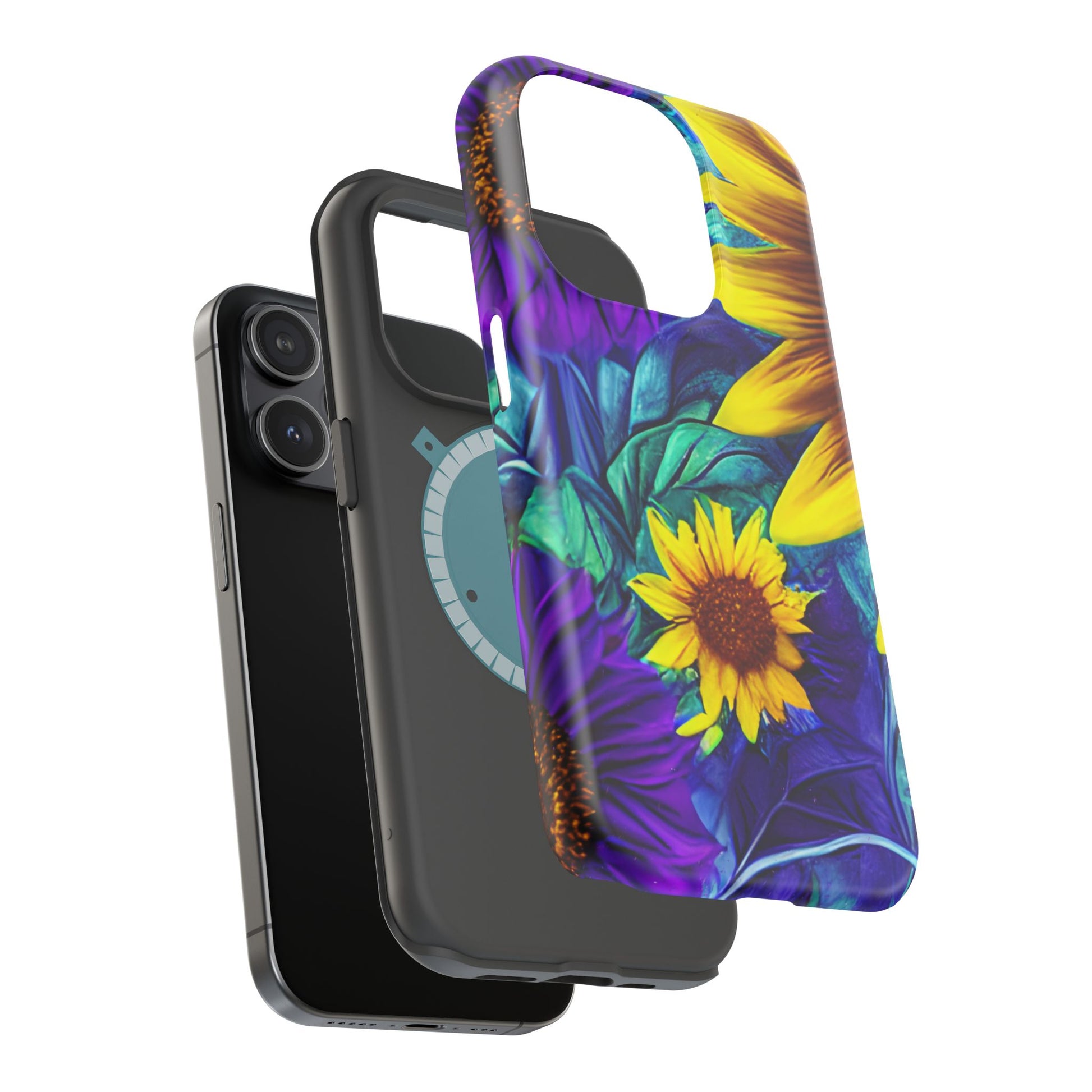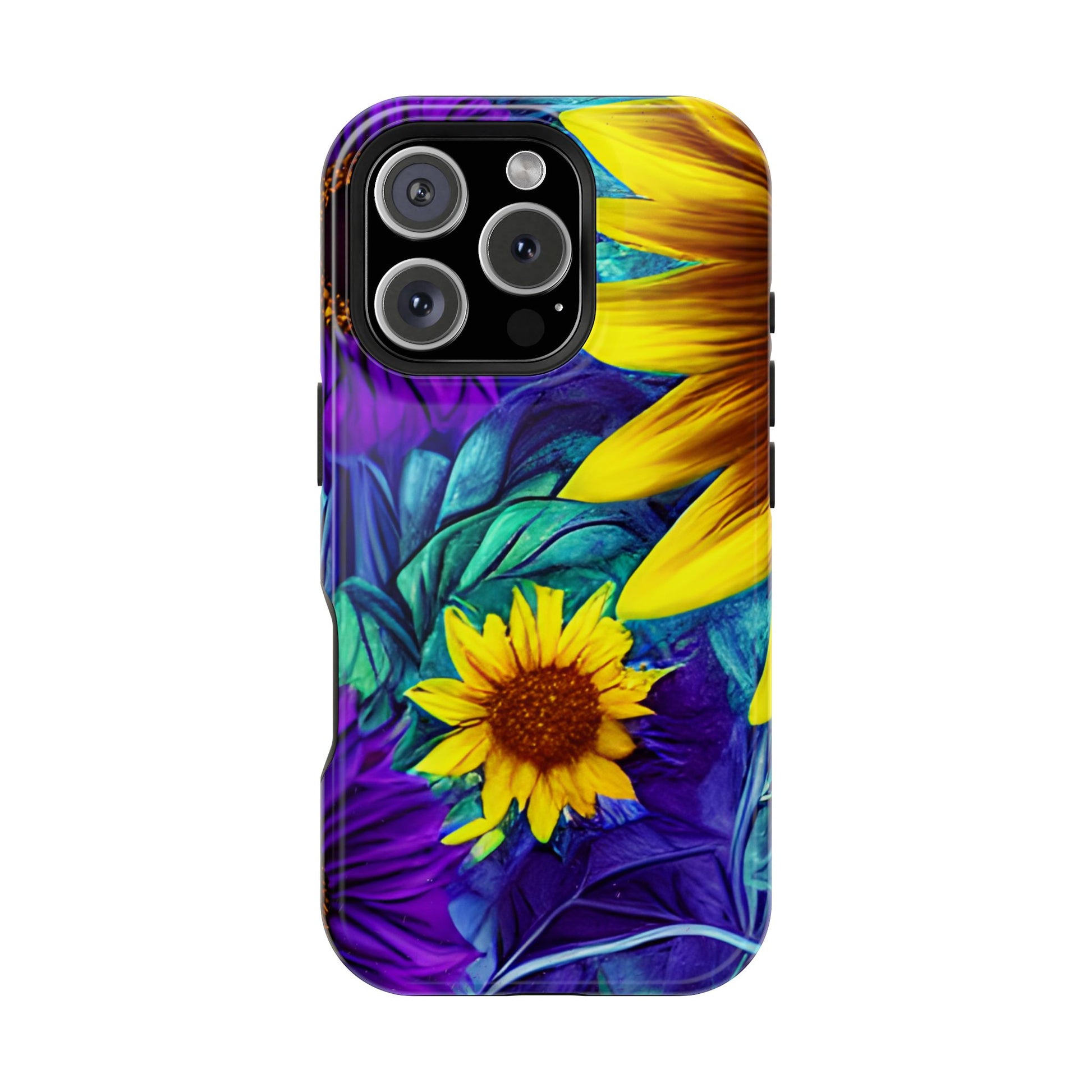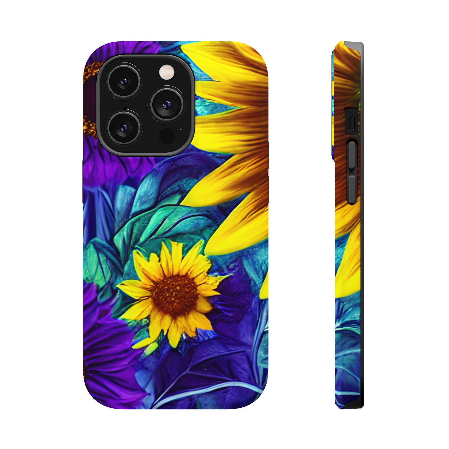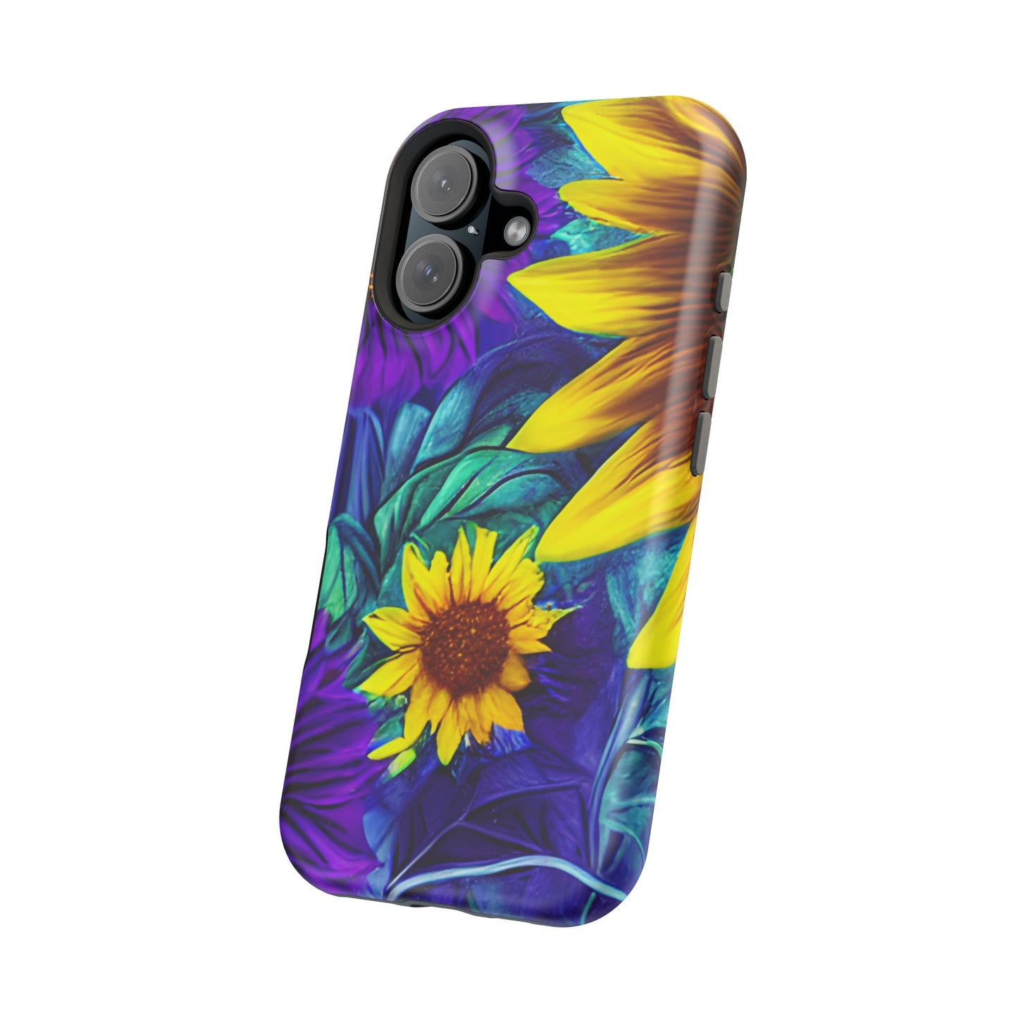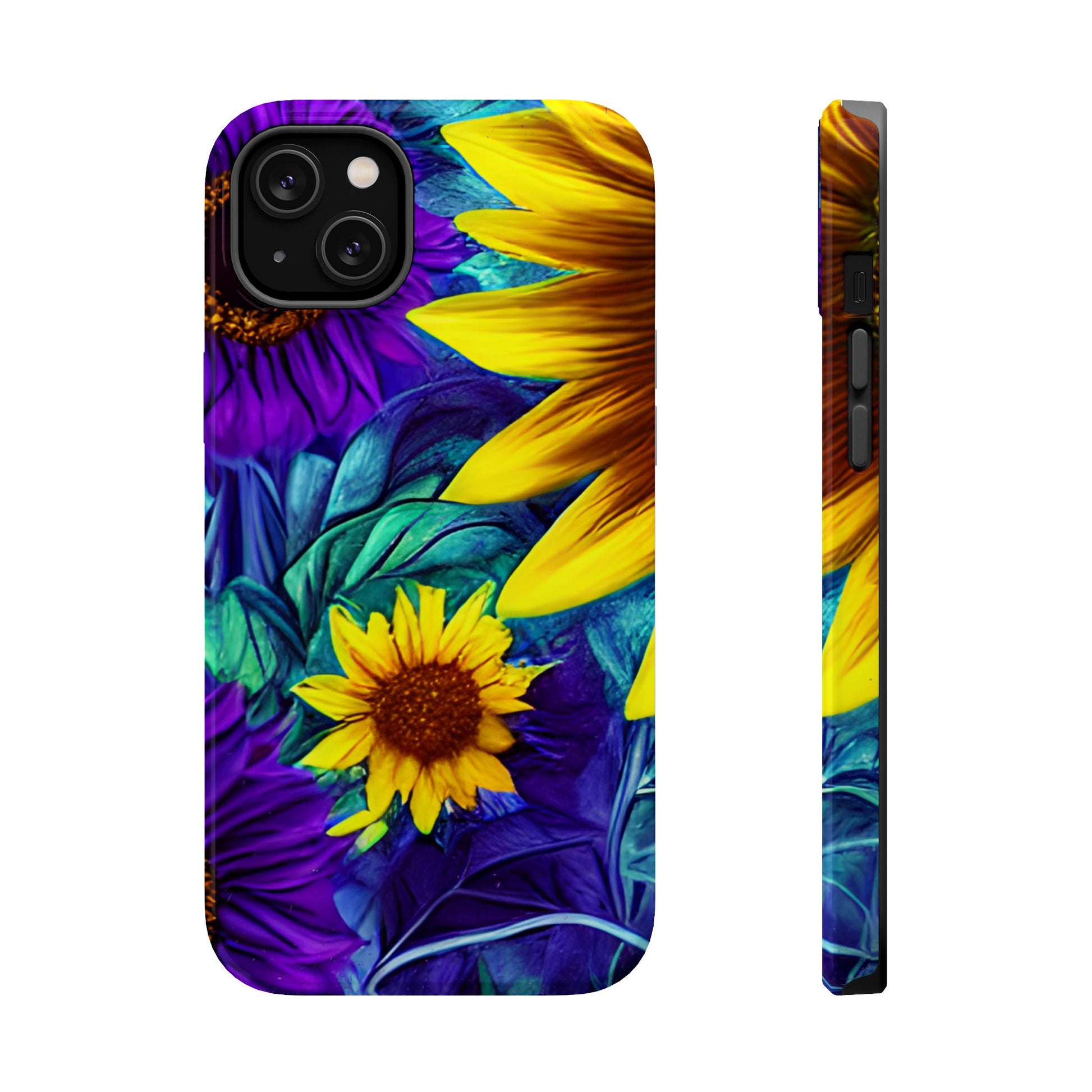Add a pop of color to your phone with our Purple & Gold Sunflower Dream MagSafe  iPhone Case! Featuring a stunning mix of deep purple and vibrant yellow sunflowers against a bold, blue-green leafy background, this case is a perfect blend of elegance and whimsy. Ideal for anyone who loves unique, eye-catching designs, it provides a dramatic look that stands out. Made with a durable polycarbonate shell and a shock-absorbent TPU liner, this case offers reliable protection along with its artistic flair. Bring this floral fantasy with you everywhere you go!