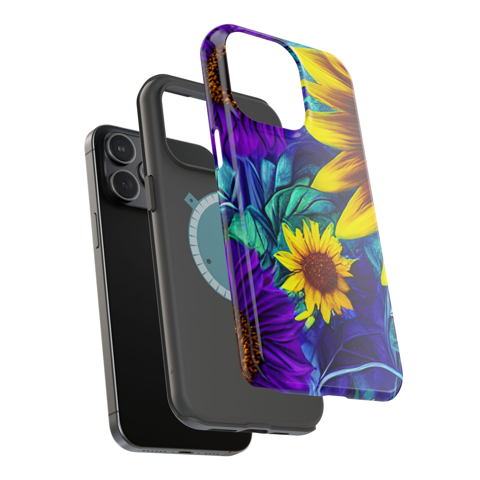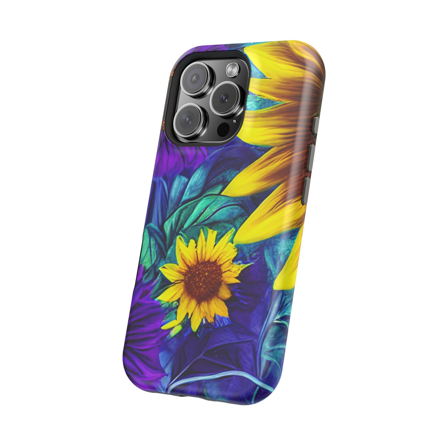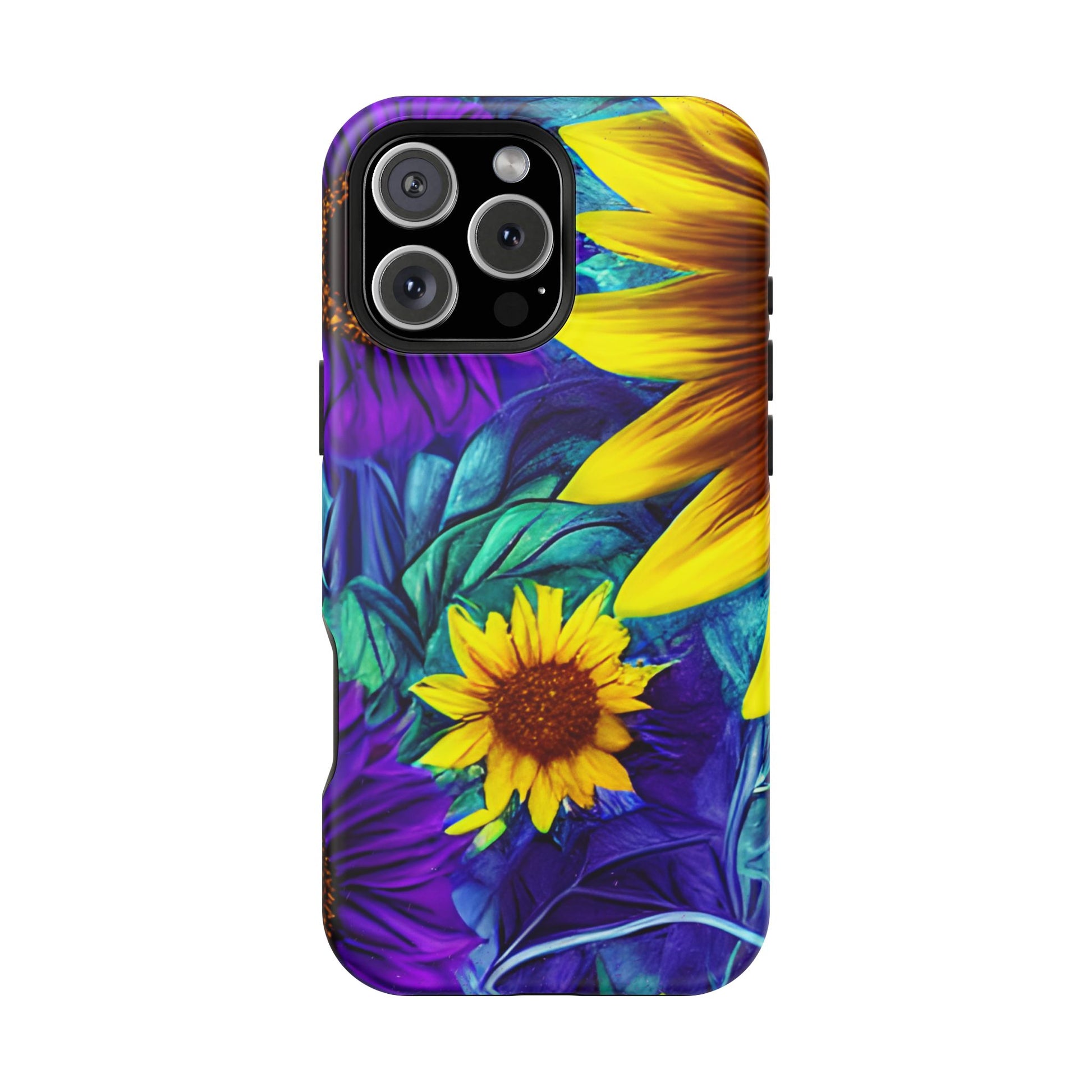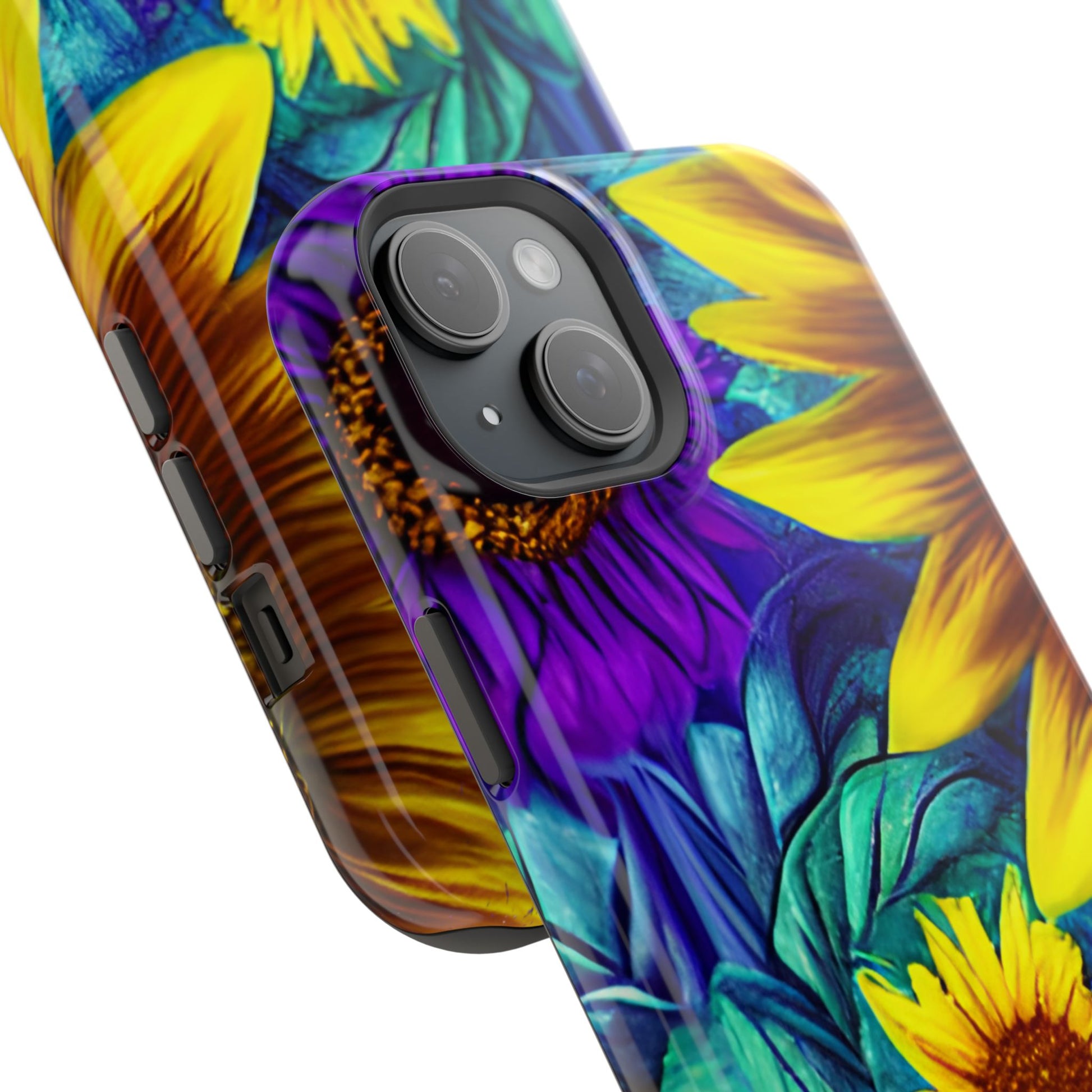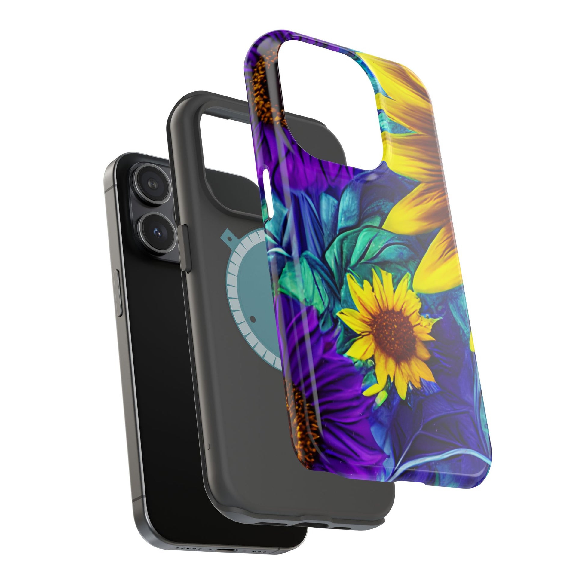 Add a pop of color to your phone with our Purple & Gold Sunflower Dream MagSafe  iPhone Case! Featuring a stunning mix of deep purple and vibrant yellow sunflowers against a bold, blue-green leafy background, this case is a perfect blend of elegance and whimsy. Ideal for anyone who loves unique, eye-catching designs, it provides a dramatic look that stands out. Made with a durable polycarbonate shell and a shock-absorbent TPU liner, this case offers reliable protection along with its artistic flair. Bring this floral fantasy with you everywhere you go!