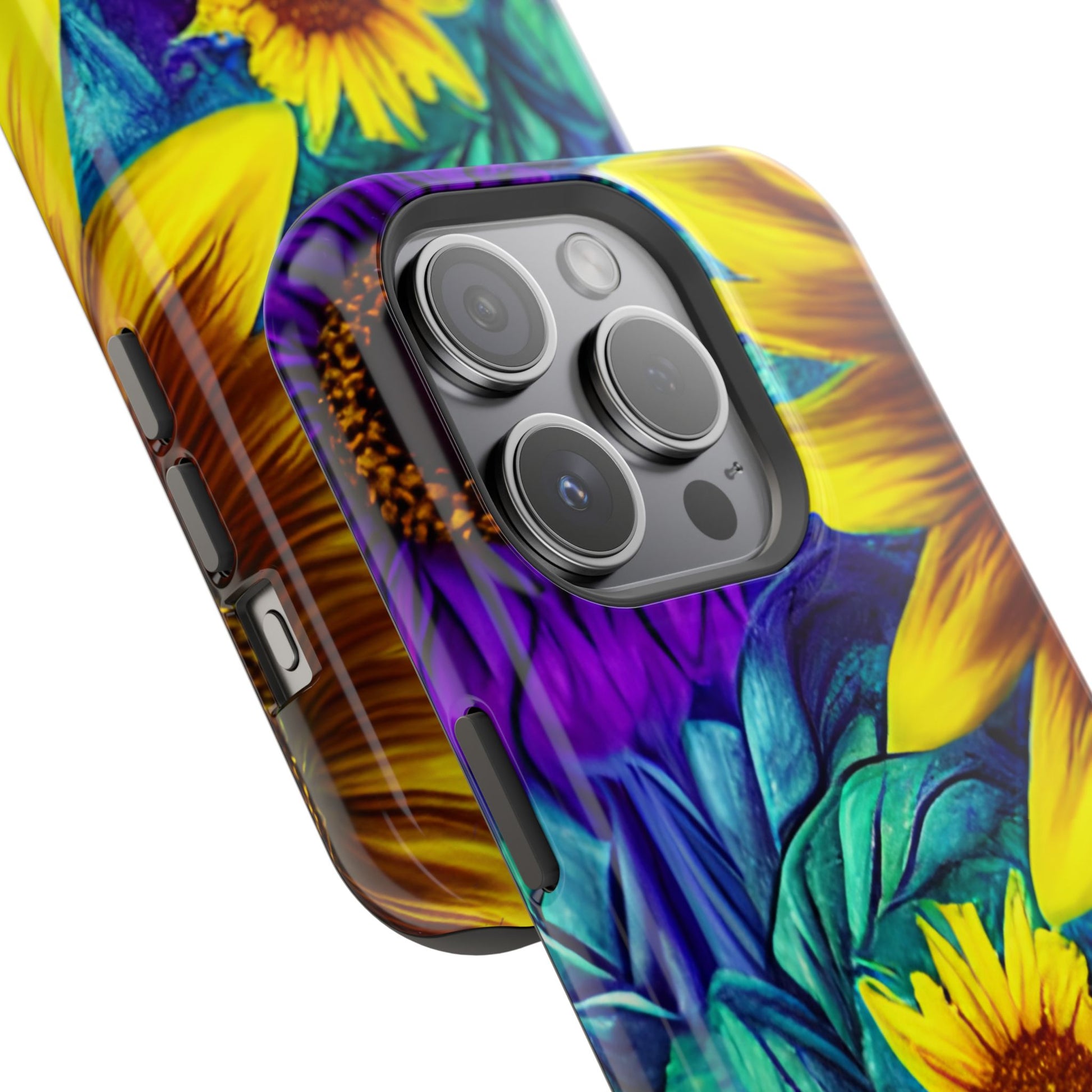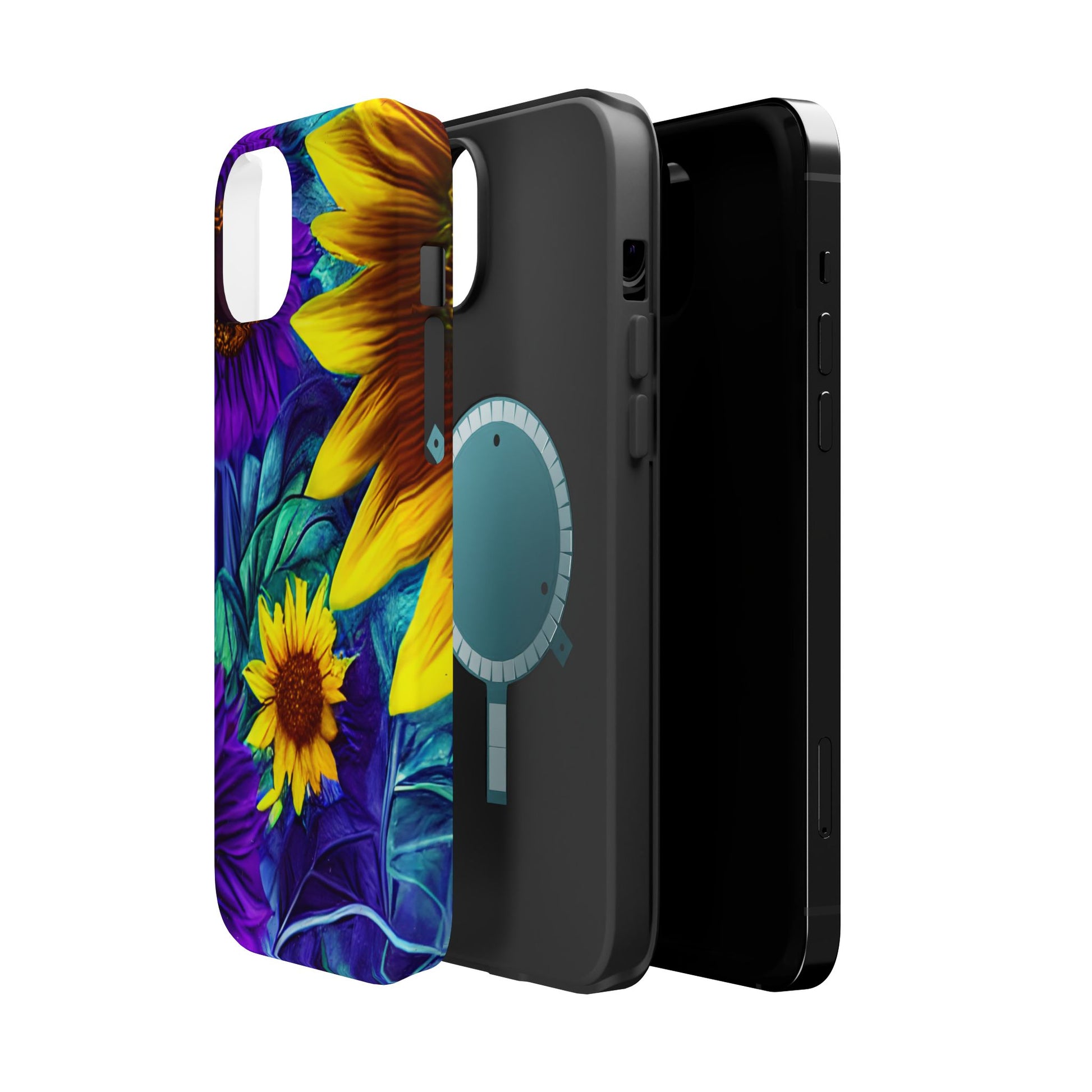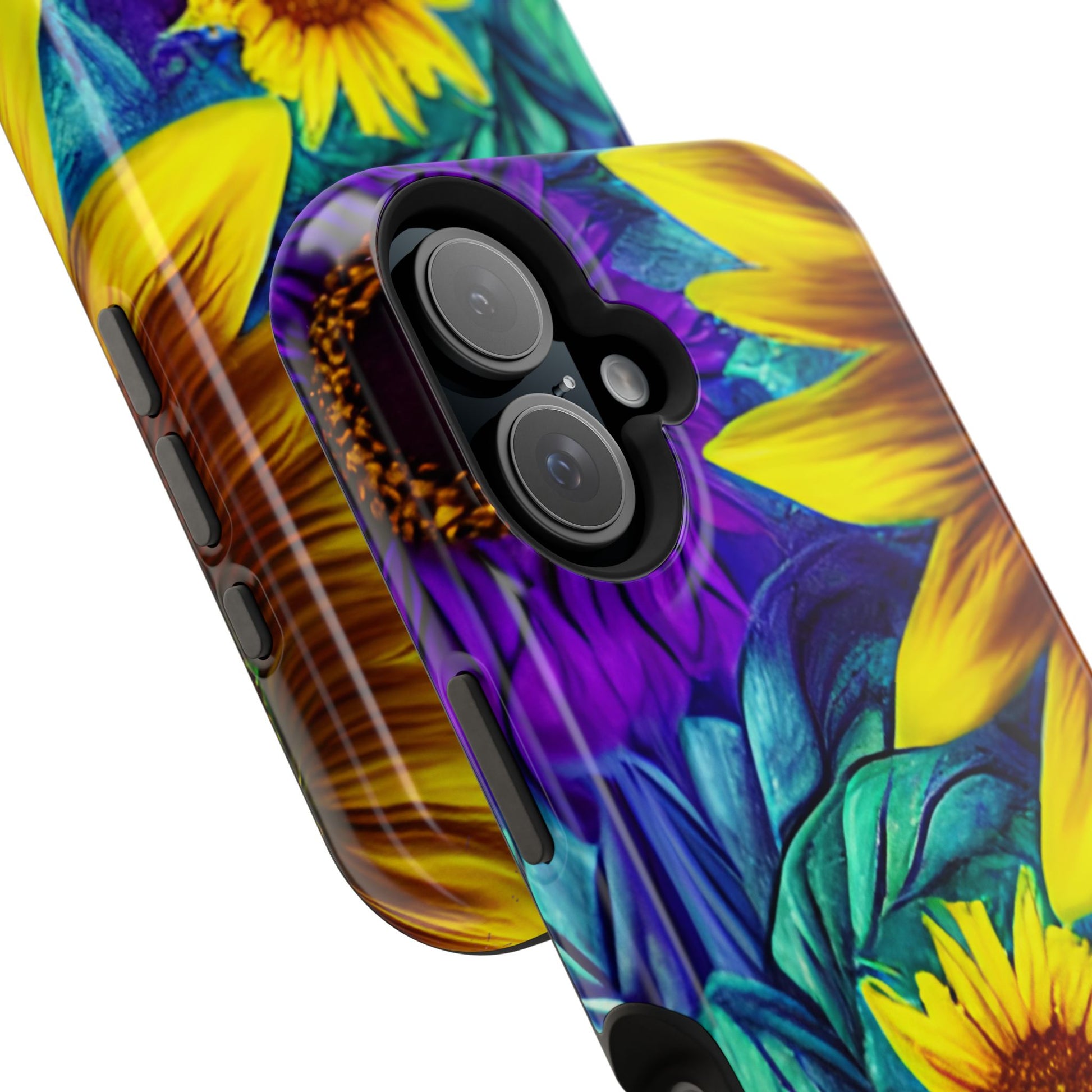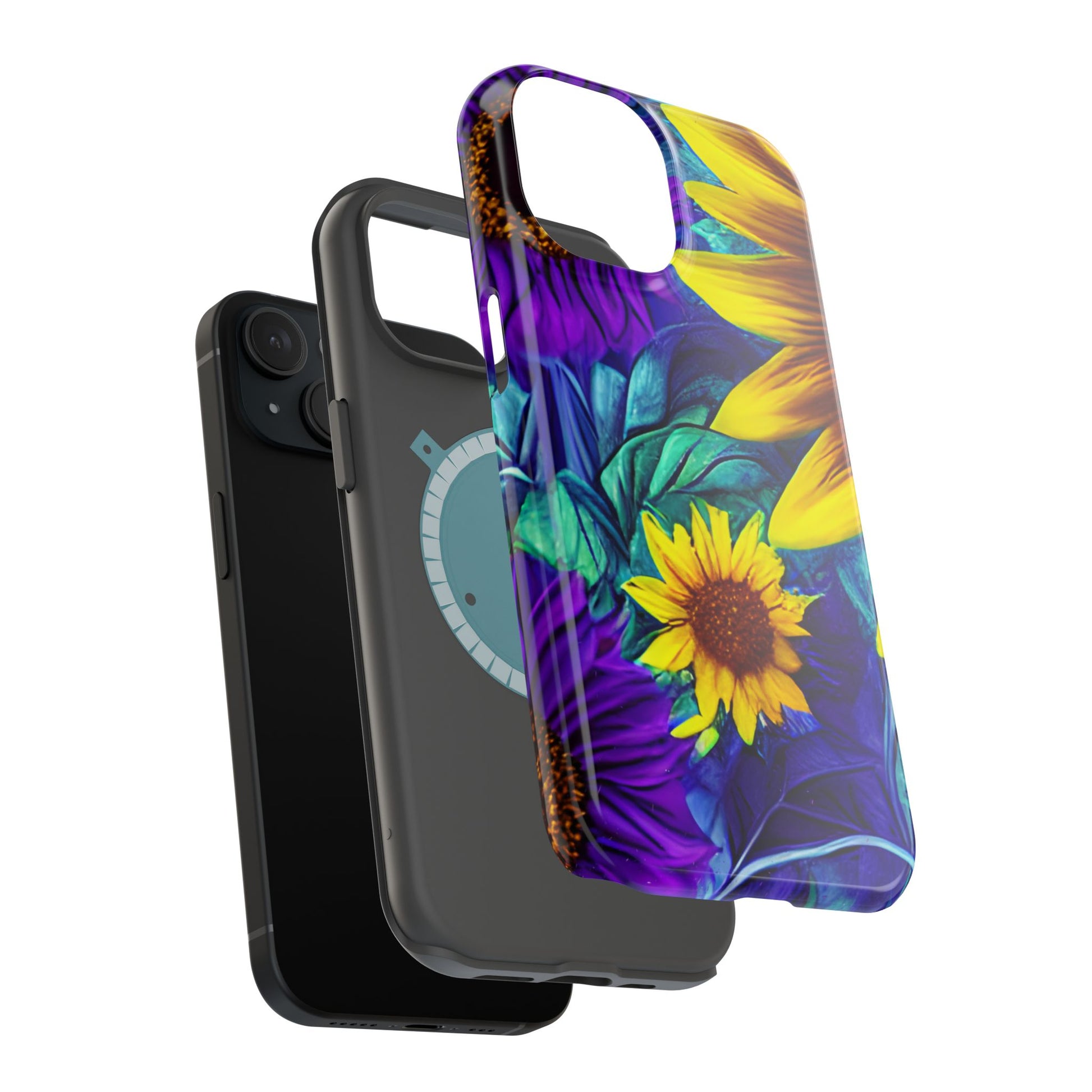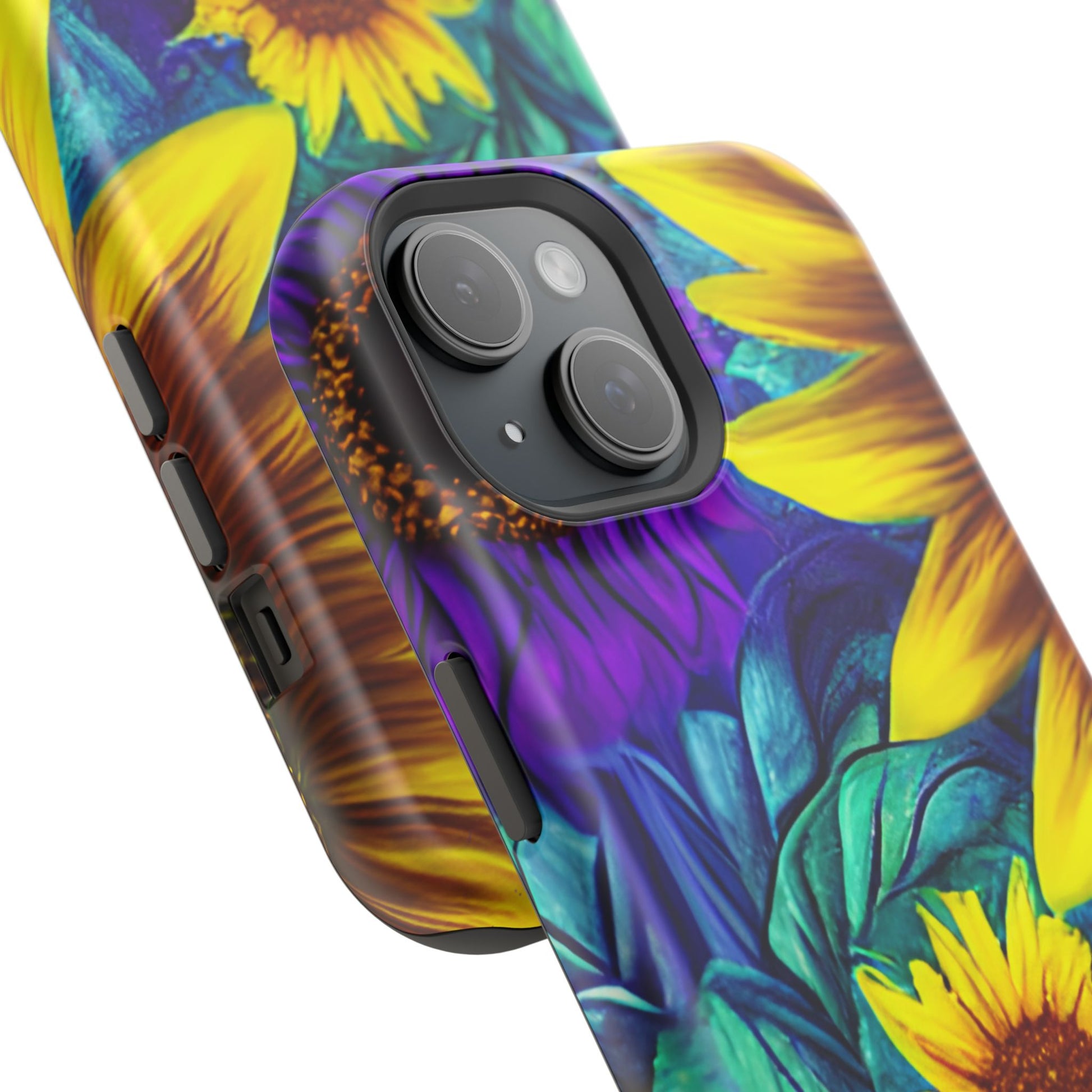 Add a pop of color to your phone with our Purple & Gold Sunflower Dream MagSafe  iPhone Case! Featuring a stunning mix of deep purple and vibrant yellow sunflowers against a bold, blue-green leafy background, this case is a perfect blend of elegance and whimsy. Ideal for anyone who loves unique, eye-catching designs, it provides a dramatic look that stands out. Made with a durable polycarbonate shell and a shock-absorbent TPU liner, this case offers reliable protection along with its artistic flair. Bring this floral fantasy with you everywhere you go!