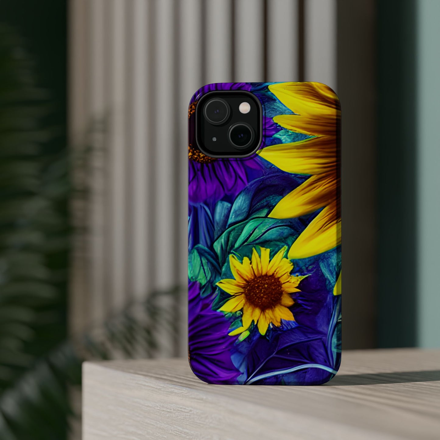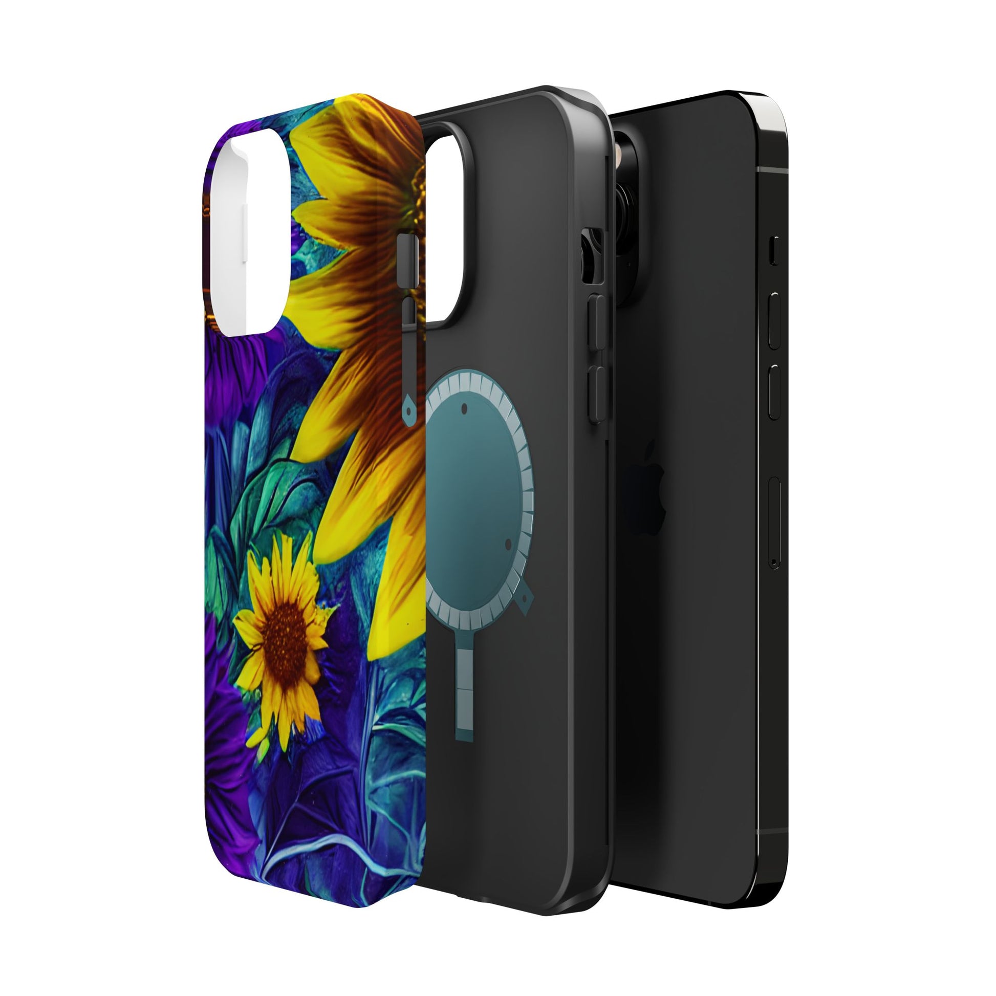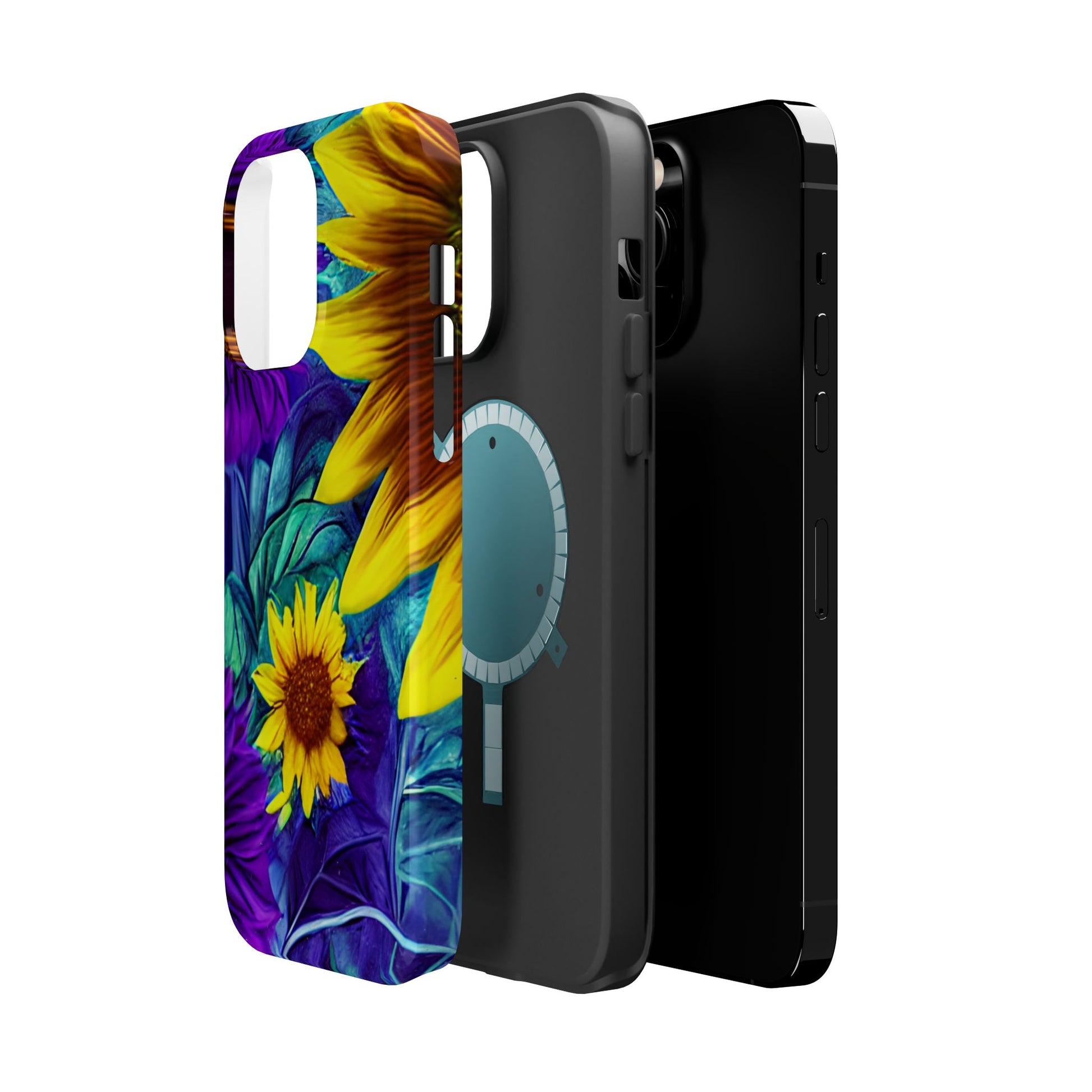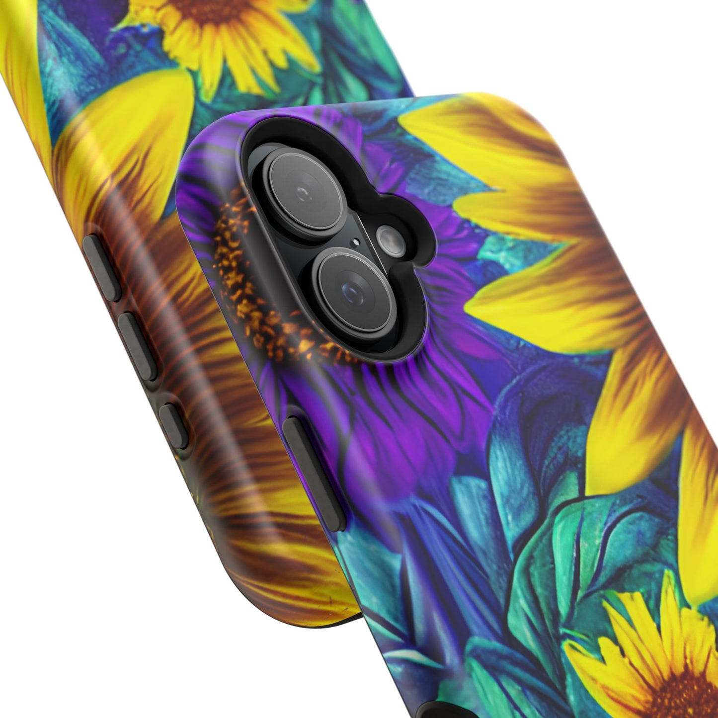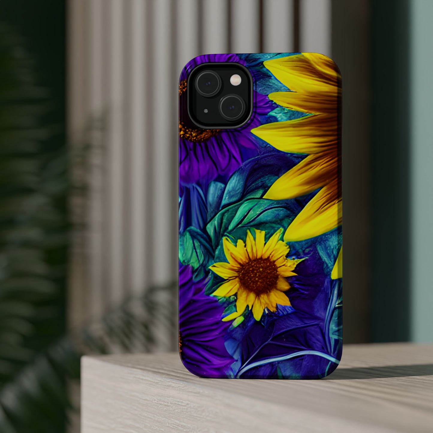 Add a pop of color to your phone with our Purple & Gold Sunflower Dream MagSafe  iPhone Case! Featuring a stunning mix of deep purple and vibrant yellow sunflowers against a bold, blue-green leafy background, this case is a perfect blend of elegance and whimsy. Ideal for anyone who loves unique, eye-catching designs, it provides a dramatic look that stands out. Made with a durable polycarbonate shell and a shock-absorbent TPU liner, this case offers reliable protection along with its artistic flair. Bring this floral fantasy with you everywhere you go!