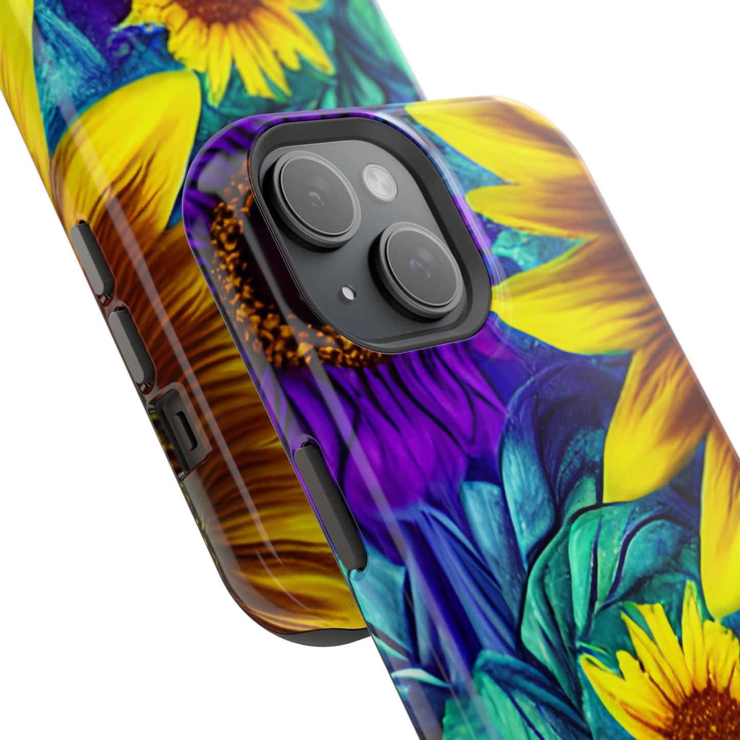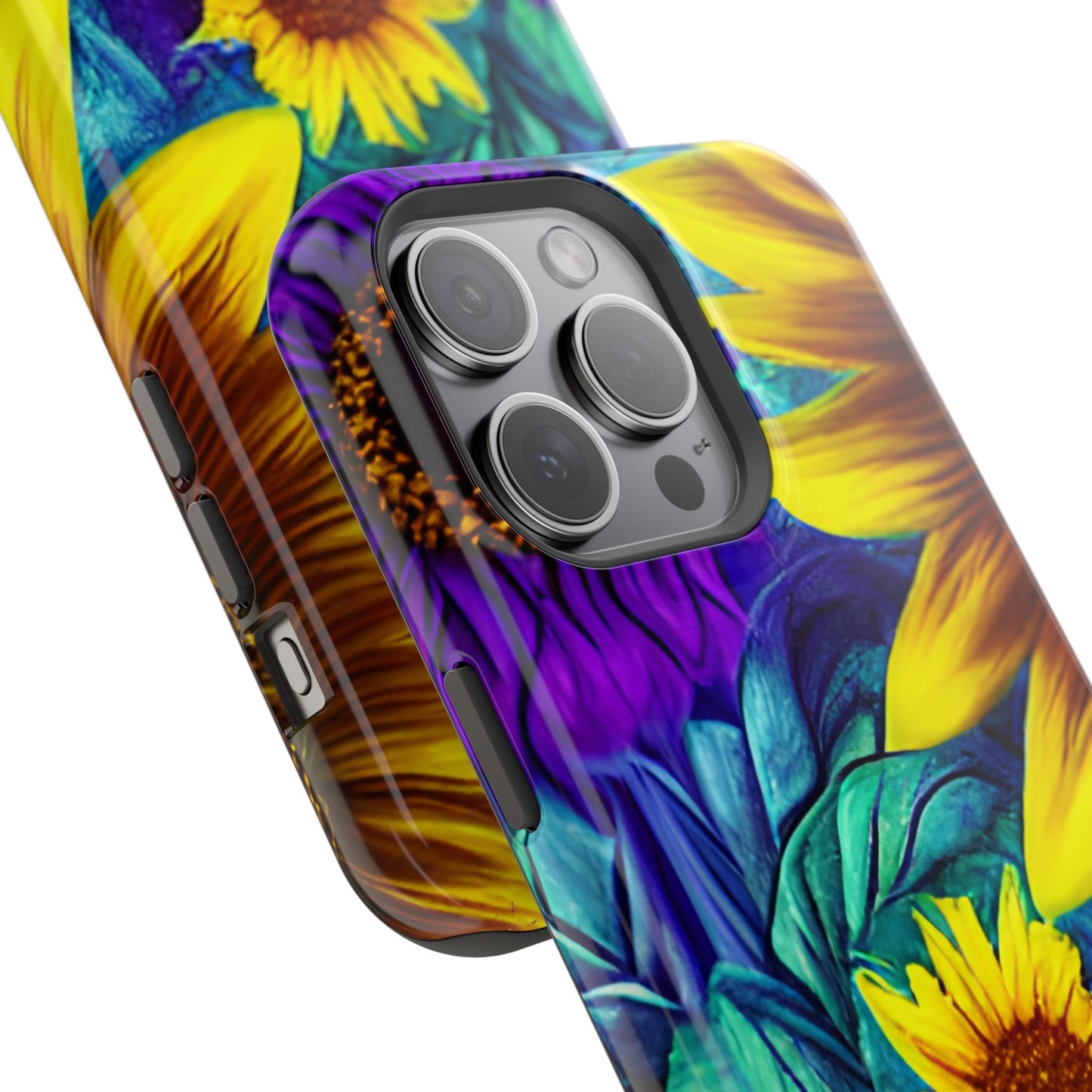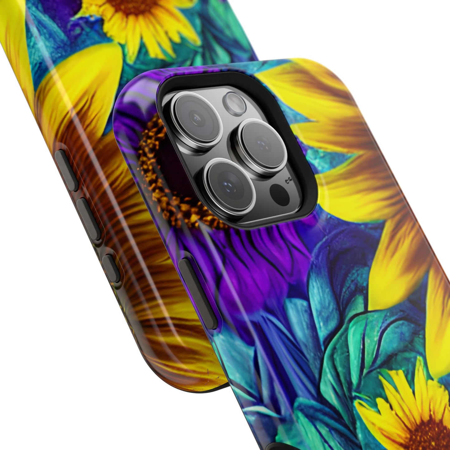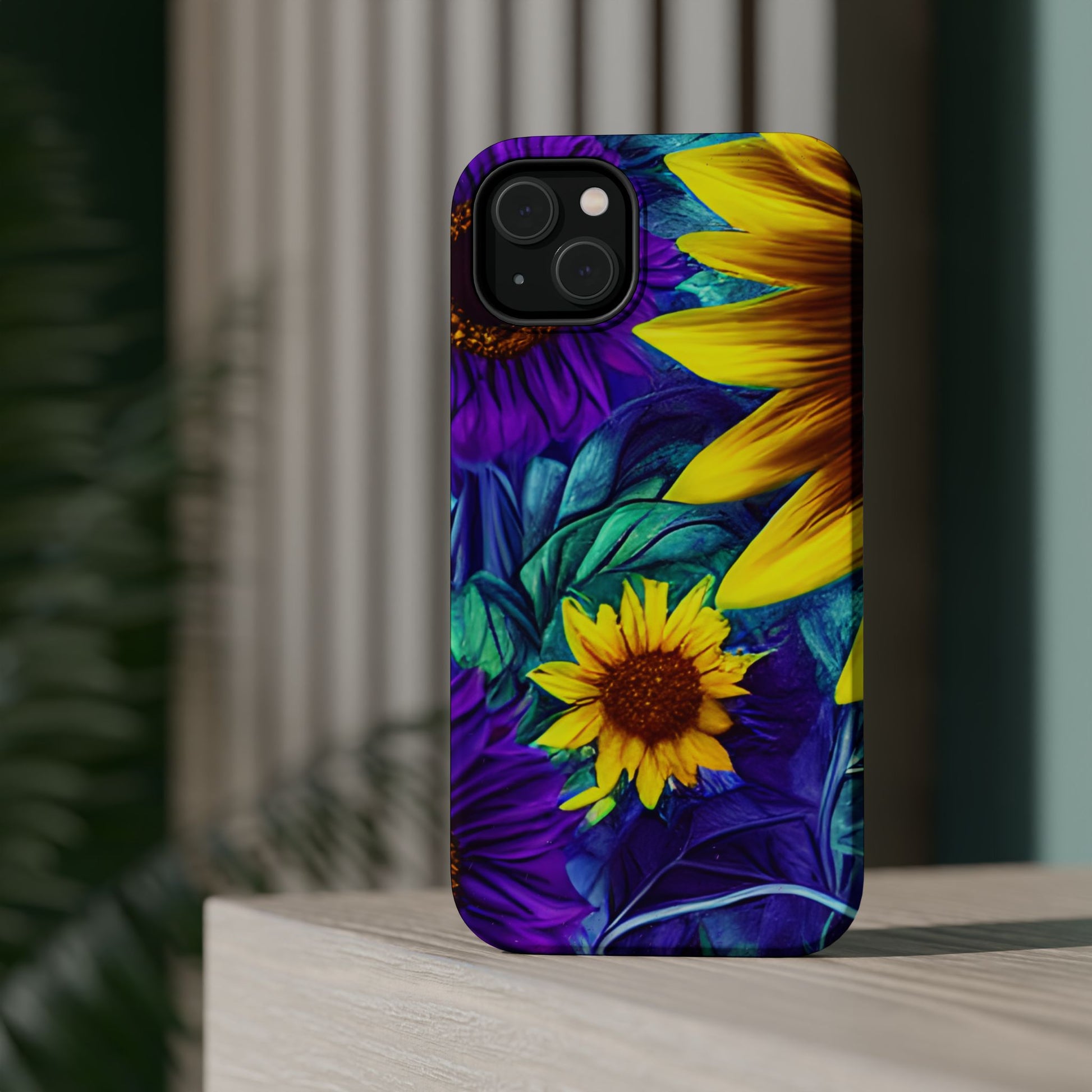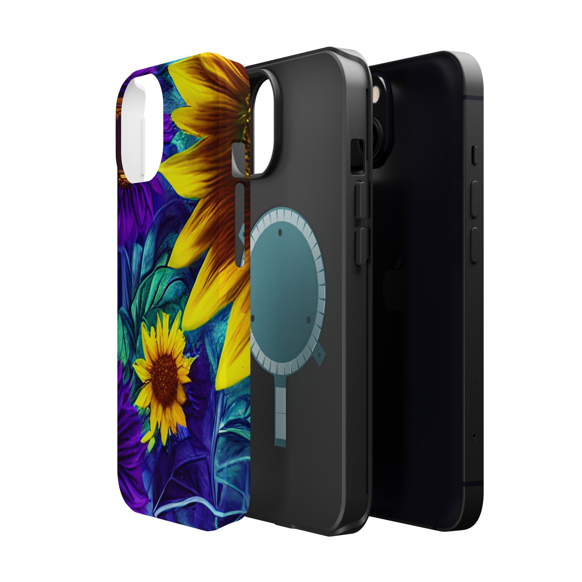 Add a pop of color to your phone with our Purple & Gold Sunflower Dream MagSafe  iPhone Case! Featuring a stunning mix of deep purple and vibrant yellow sunflowers against a bold, blue-green leafy background, this case is a perfect blend of elegance and whimsy. Ideal for anyone who loves unique, eye-catching designs, it provides a dramatic look that stands out. Made with a durable polycarbonate shell and a shock-absorbent TPU liner, this case offers reliable protection along with its artistic flair. Bring this floral fantasy with you everywhere you go!