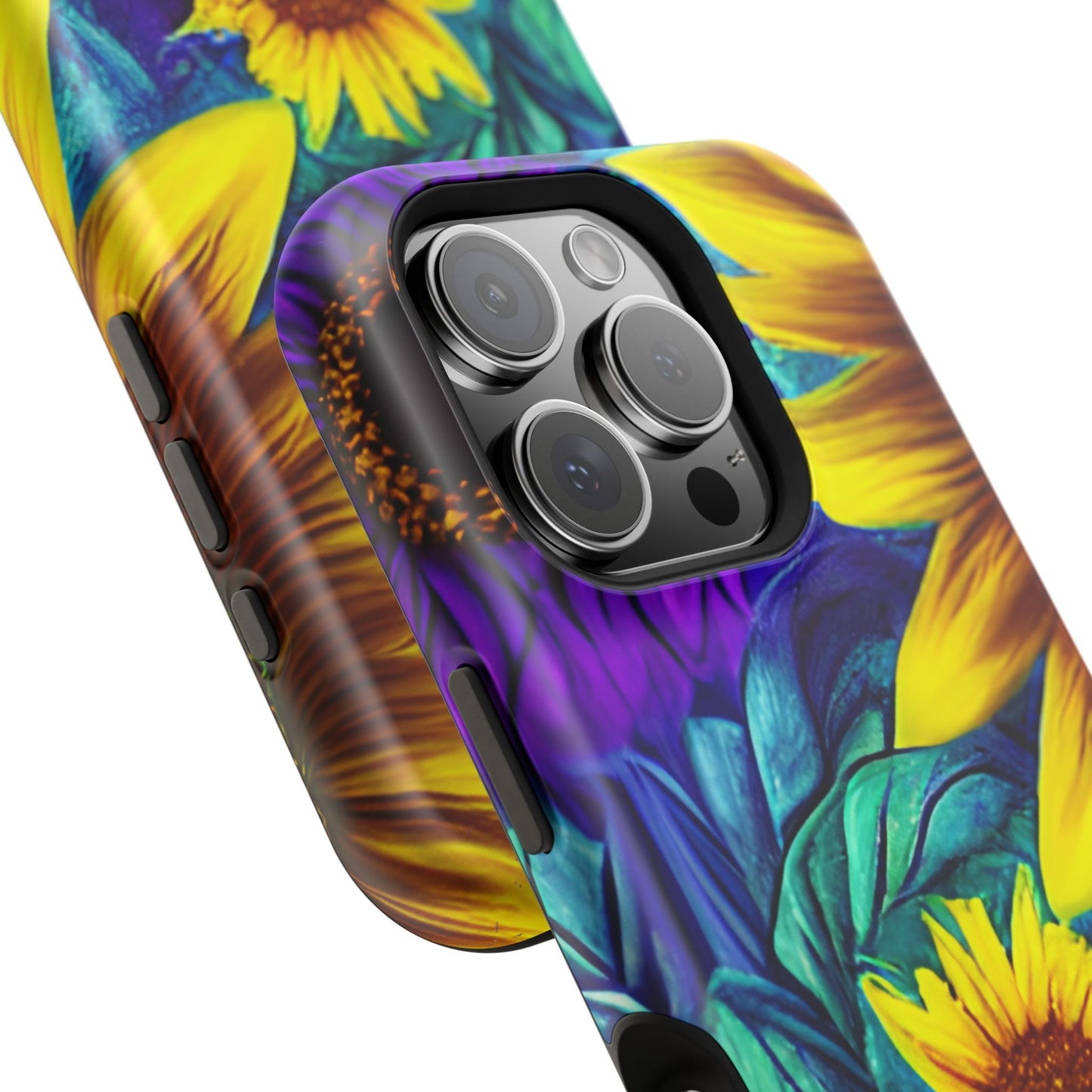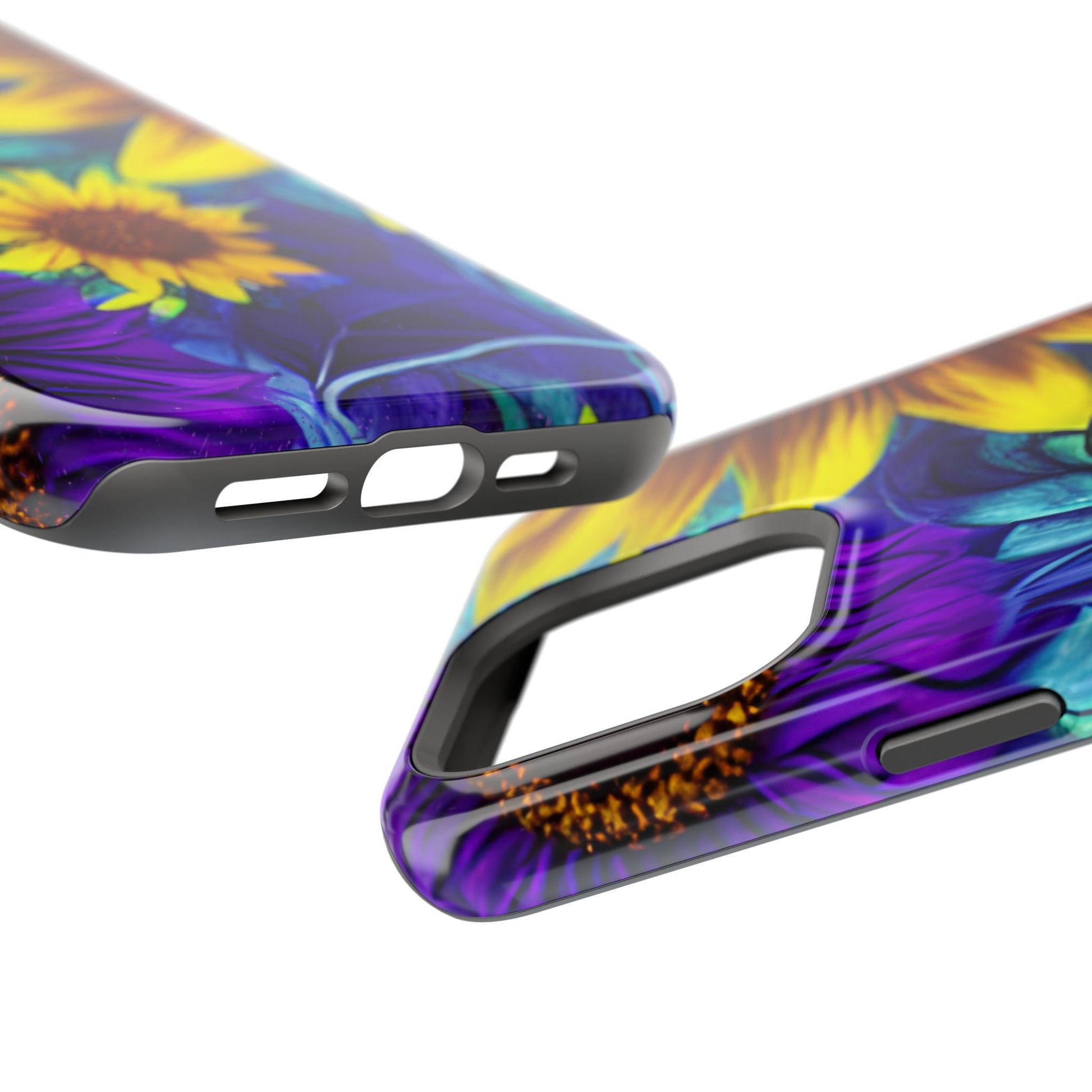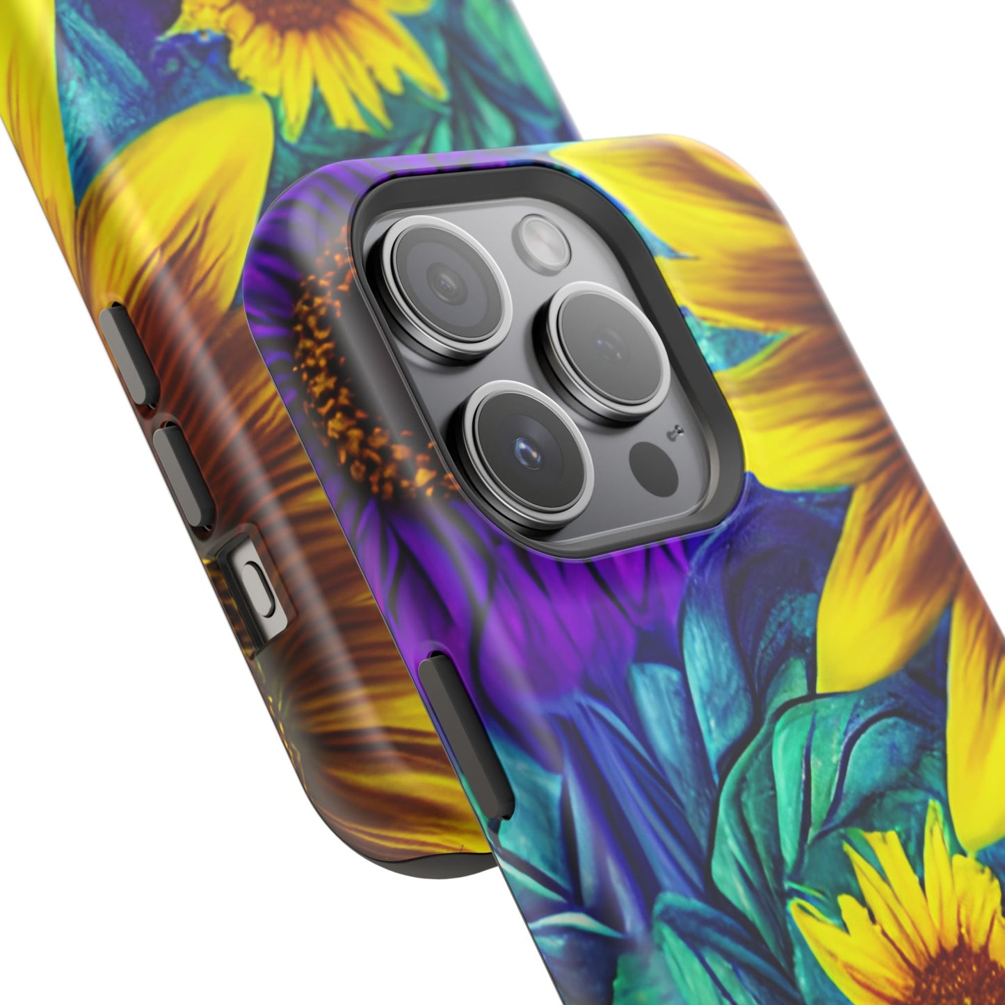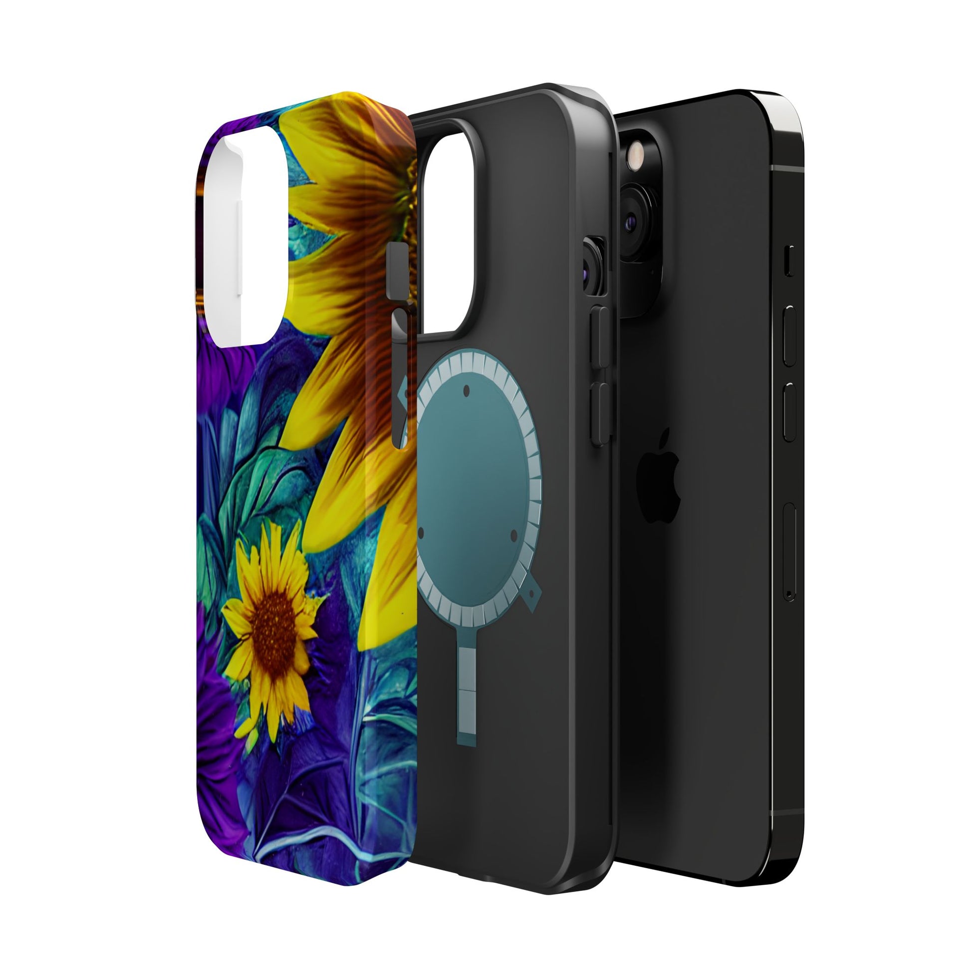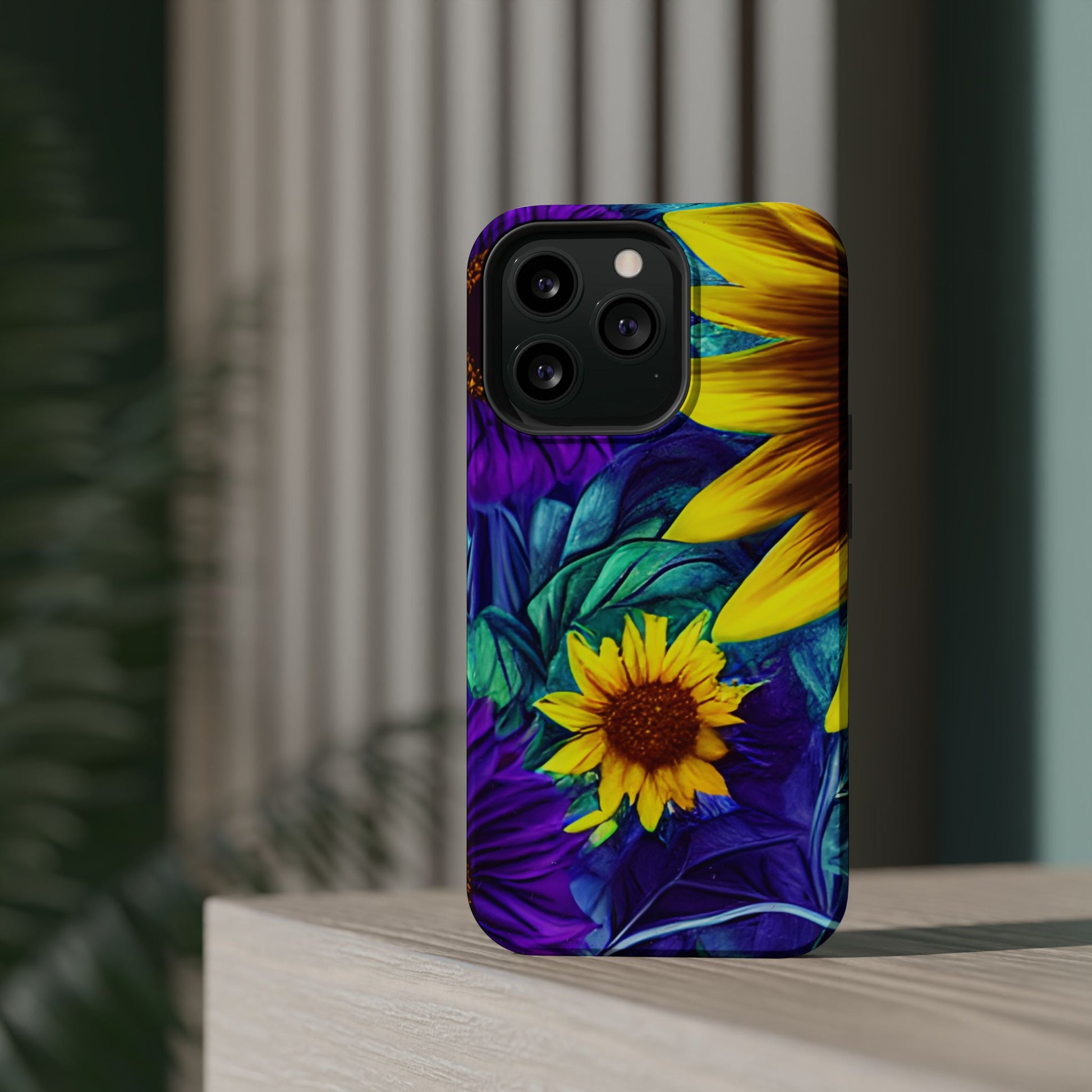 Add a pop of color to your phone with our Purple & Gold Sunflower Dream MagSafe  iPhone Case! Featuring a stunning mix of deep purple and vibrant yellow sunflowers against a bold, blue-green leafy background, this case is a perfect blend of elegance and whimsy. Ideal for anyone who loves unique, eye-catching designs, it provides a dramatic look that stands out. Made with a durable polycarbonate shell and a shock-absorbent TPU liner, this case offers reliable protection along with its artistic flair. Bring this floral fantasy with you everywhere you go!