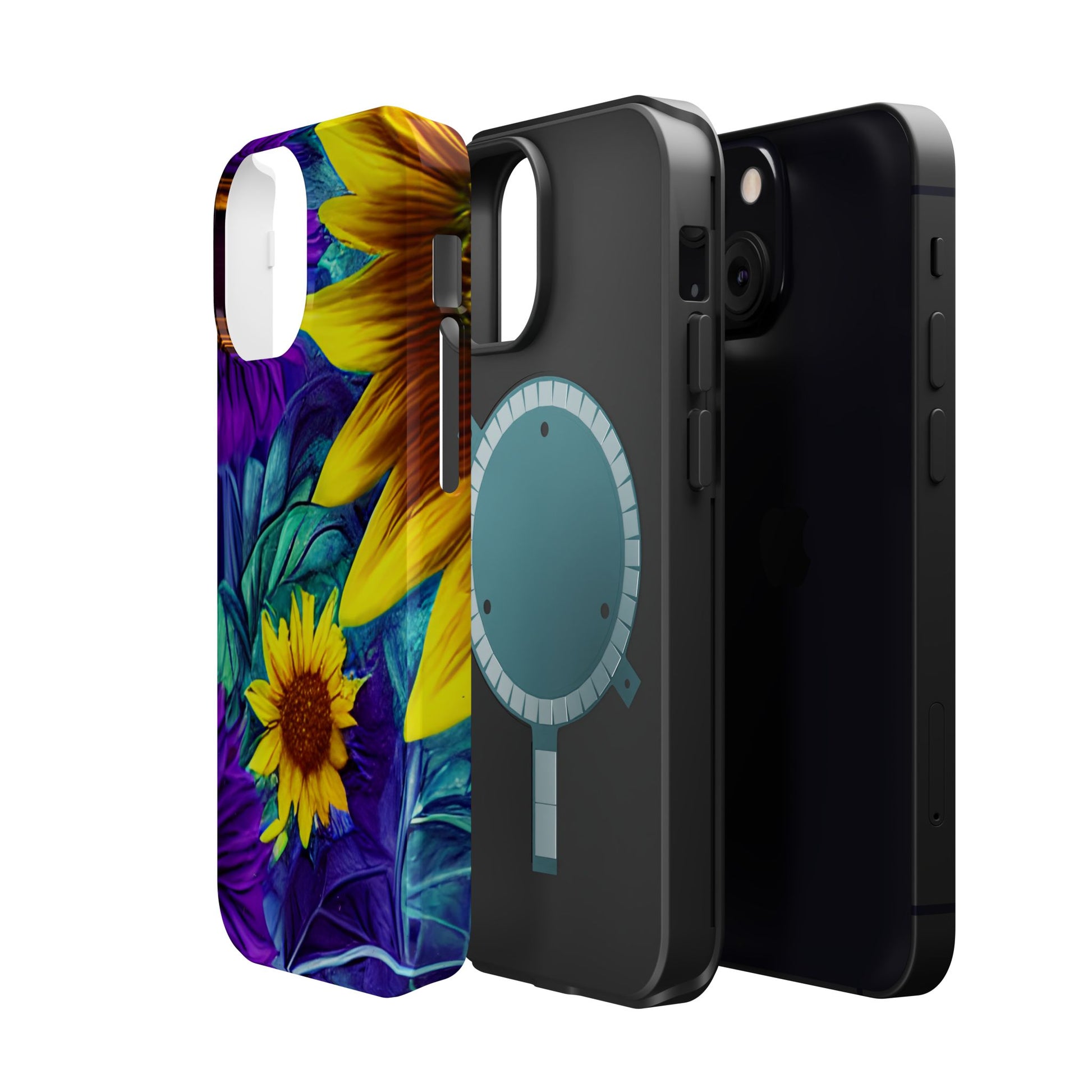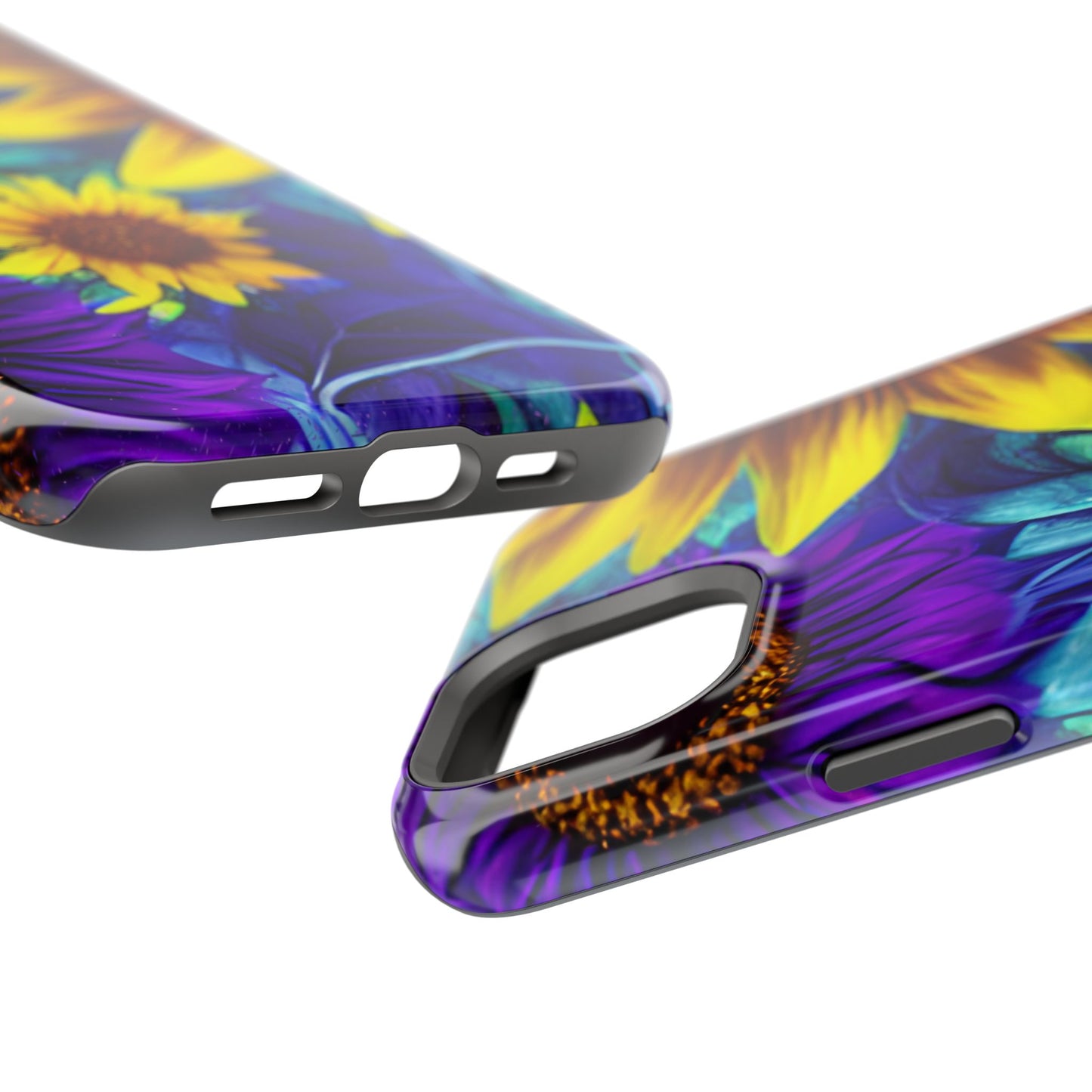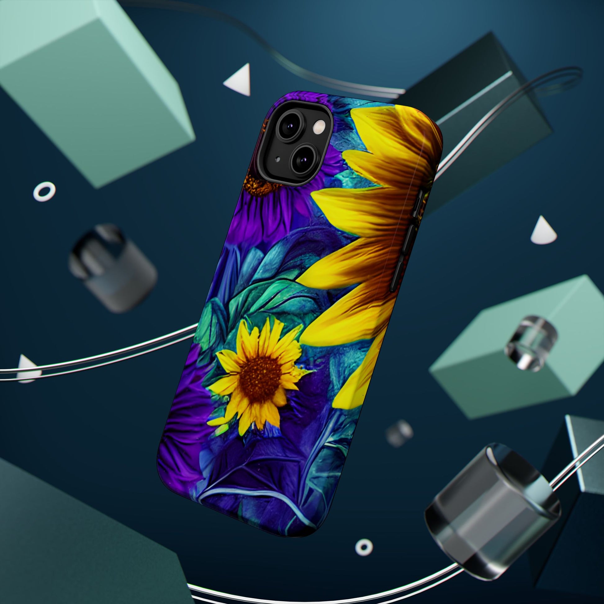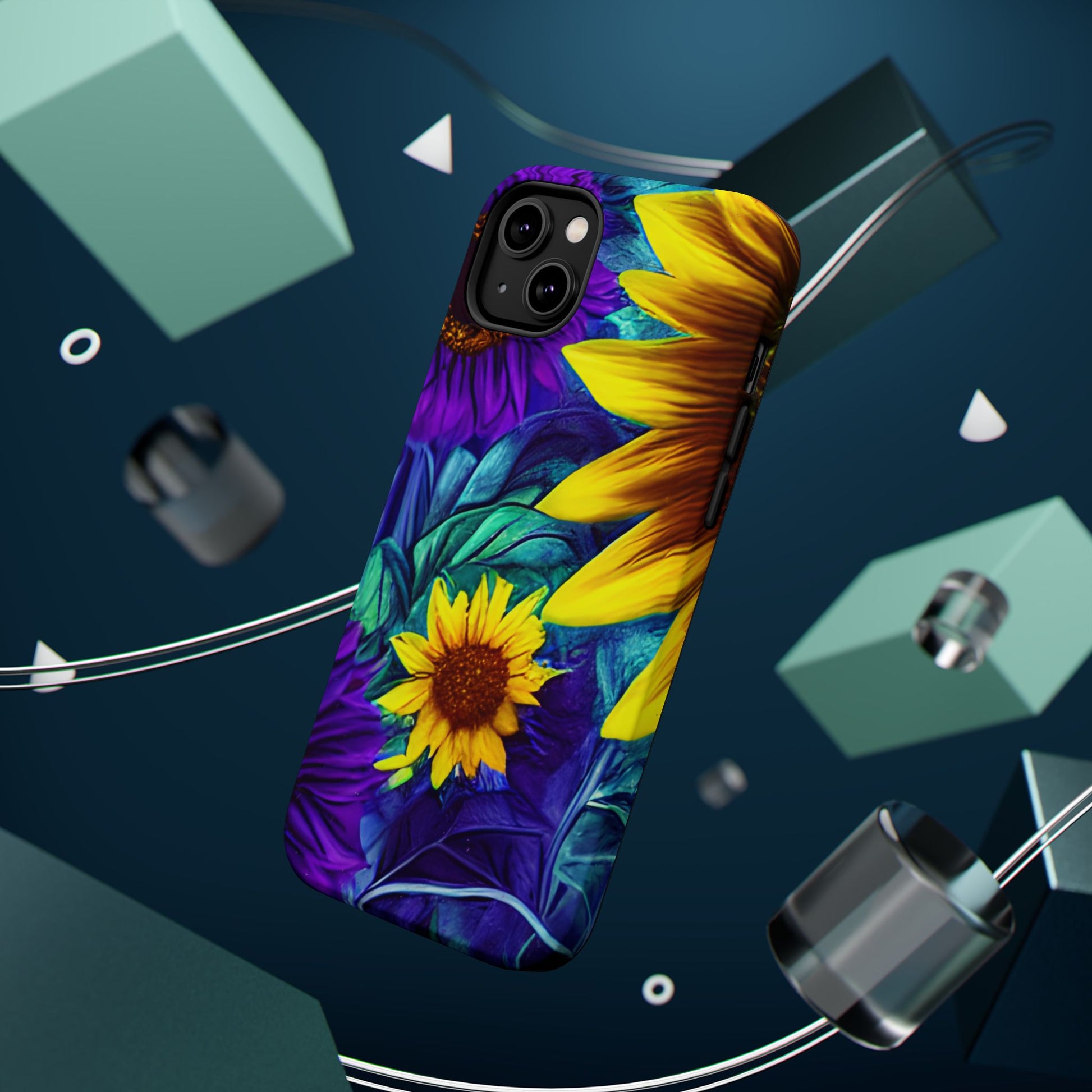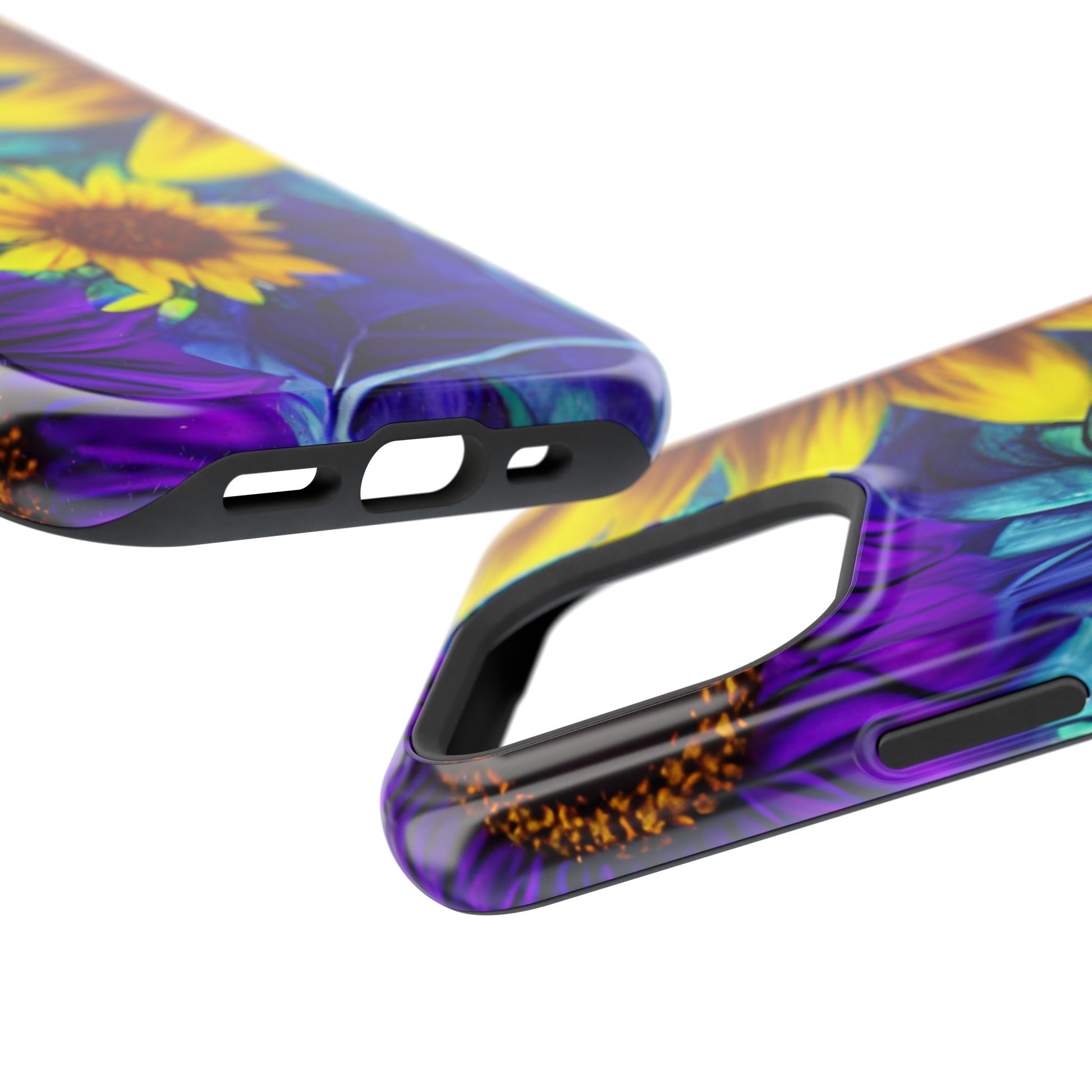 Add a pop of color to your phone with our Purple & Gold Sunflower Dream MagSafe  iPhone Case! Featuring a stunning mix of deep purple and vibrant yellow sunflowers against a bold, blue-green leafy background, this case is a perfect blend of elegance and whimsy. Ideal for anyone who loves unique, eye-catching designs, it provides a dramatic look that stands out. Made with a durable polycarbonate shell and a shock-absorbent TPU liner, this case offers reliable protection along with its artistic flair. Bring this floral fantasy with you everywhere you go!