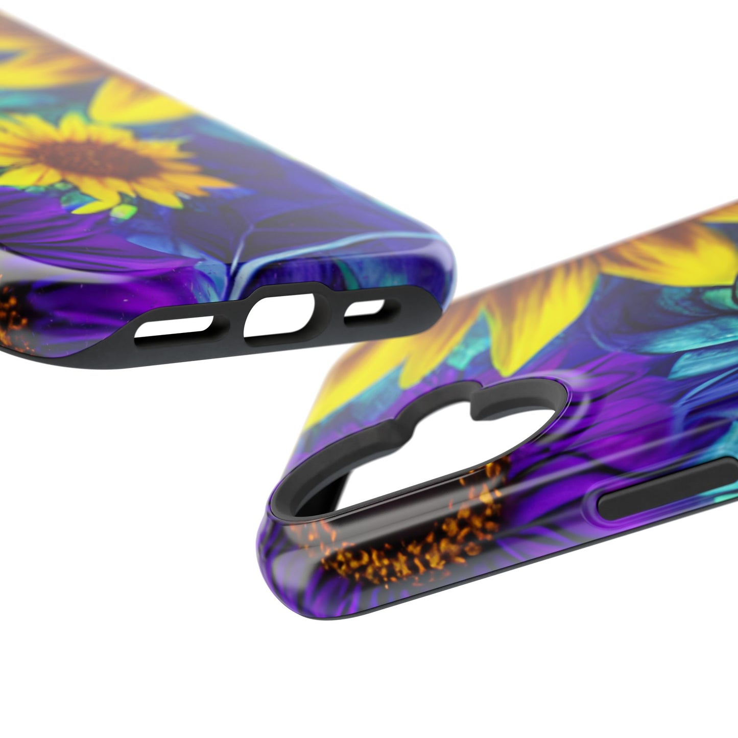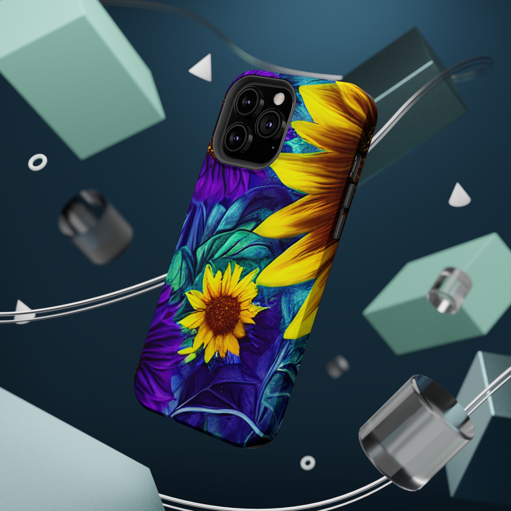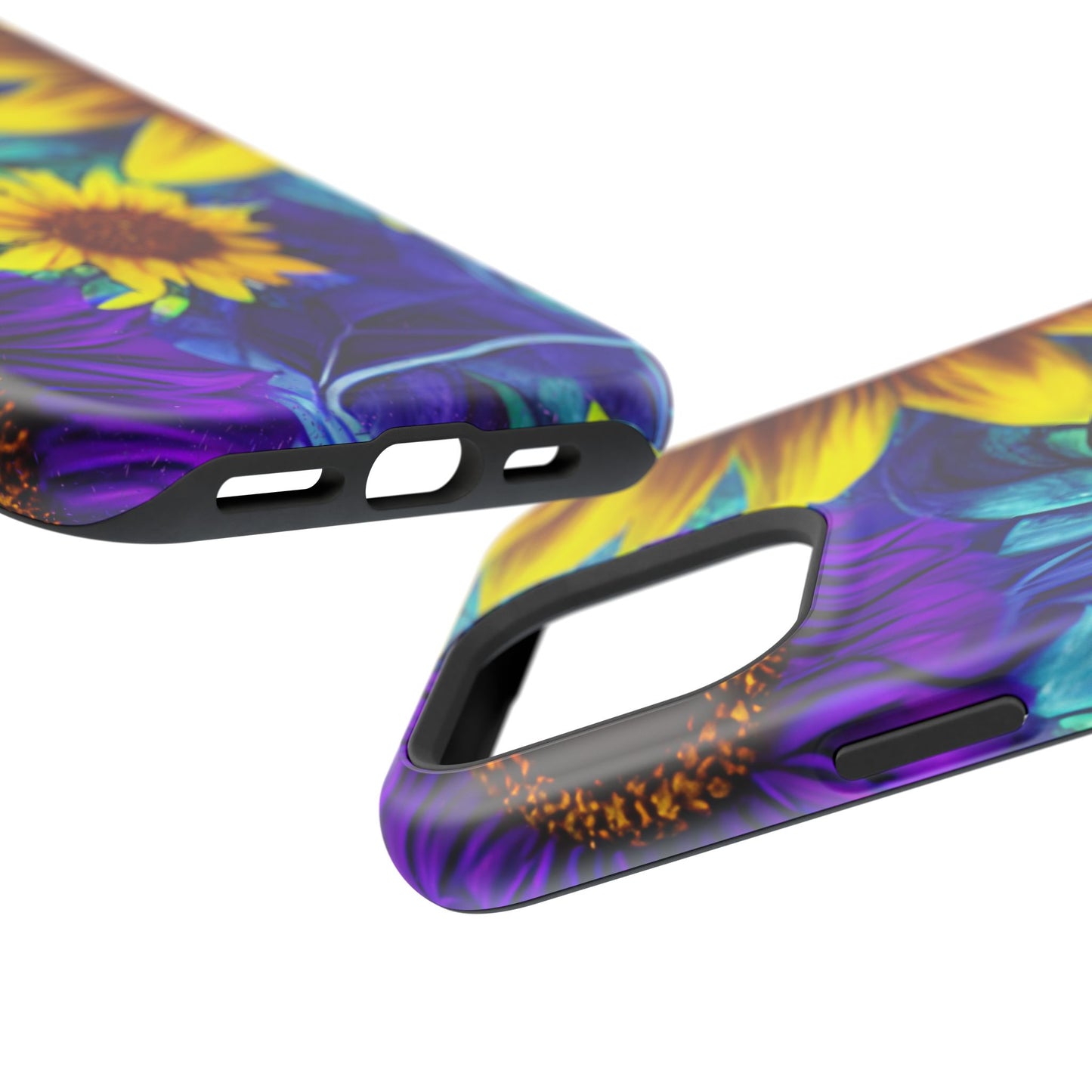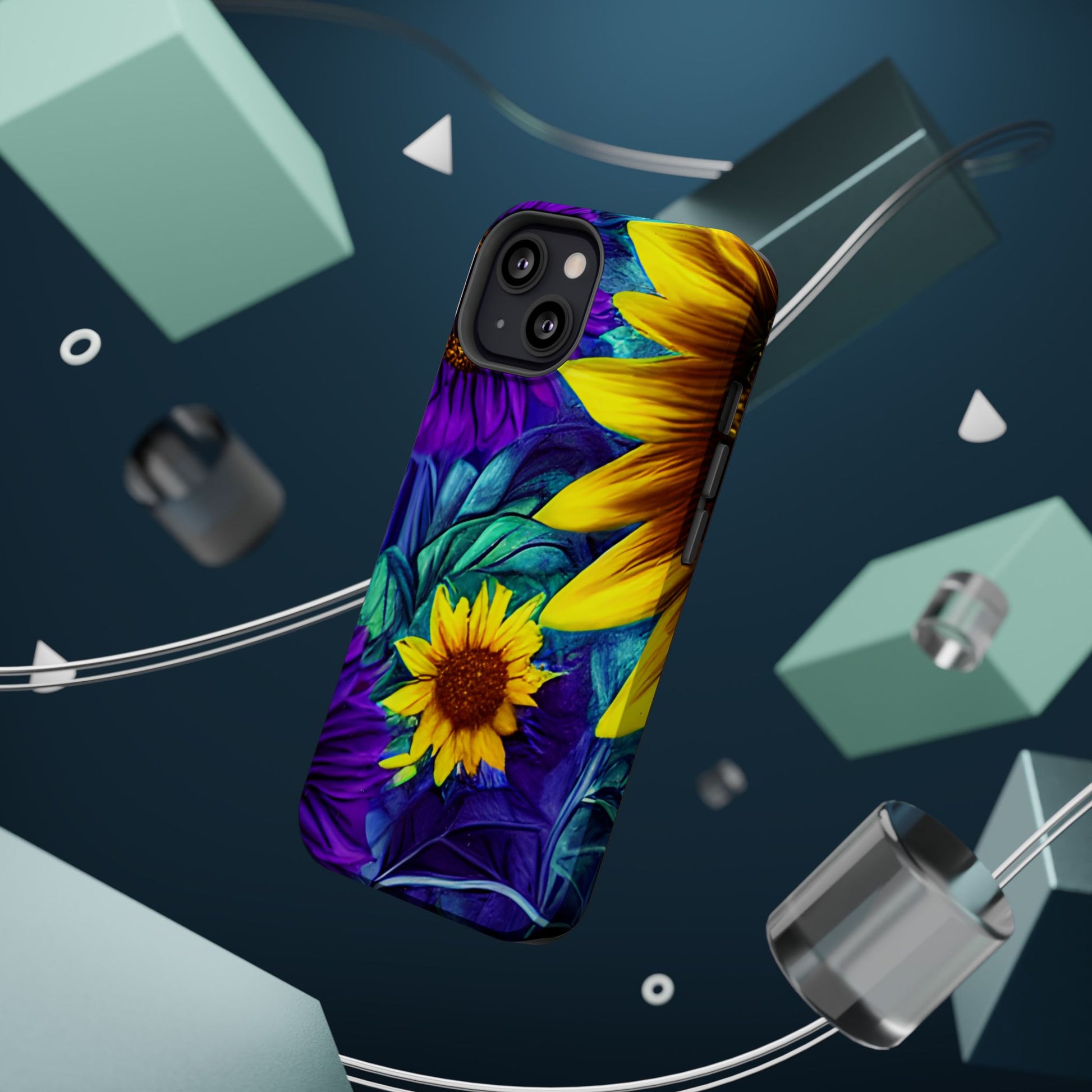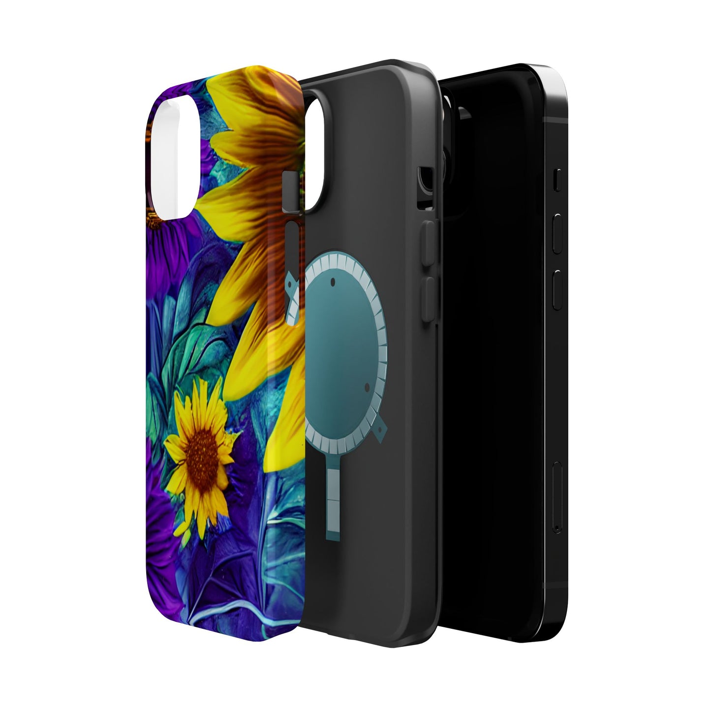 Add a pop of color to your phone with our Purple & Gold Sunflower Dream MagSafe  iPhone Case! Featuring a stunning mix of deep purple and vibrant yellow sunflowers against a bold, blue-green leafy background, this case is a perfect blend of elegance and whimsy. Ideal for anyone who loves unique, eye-catching designs, it provides a dramatic look that stands out. Made with a durable polycarbonate shell and a shock-absorbent TPU liner, this case offers reliable protection along with its artistic flair. Bring this floral fantasy with you everywhere you go!