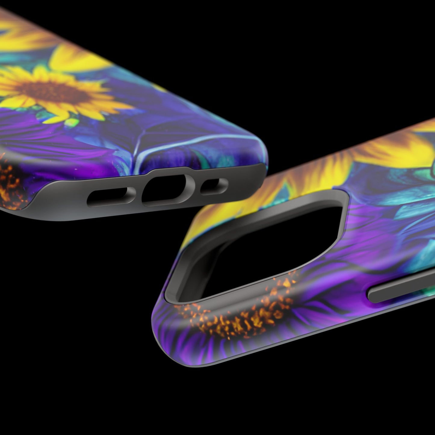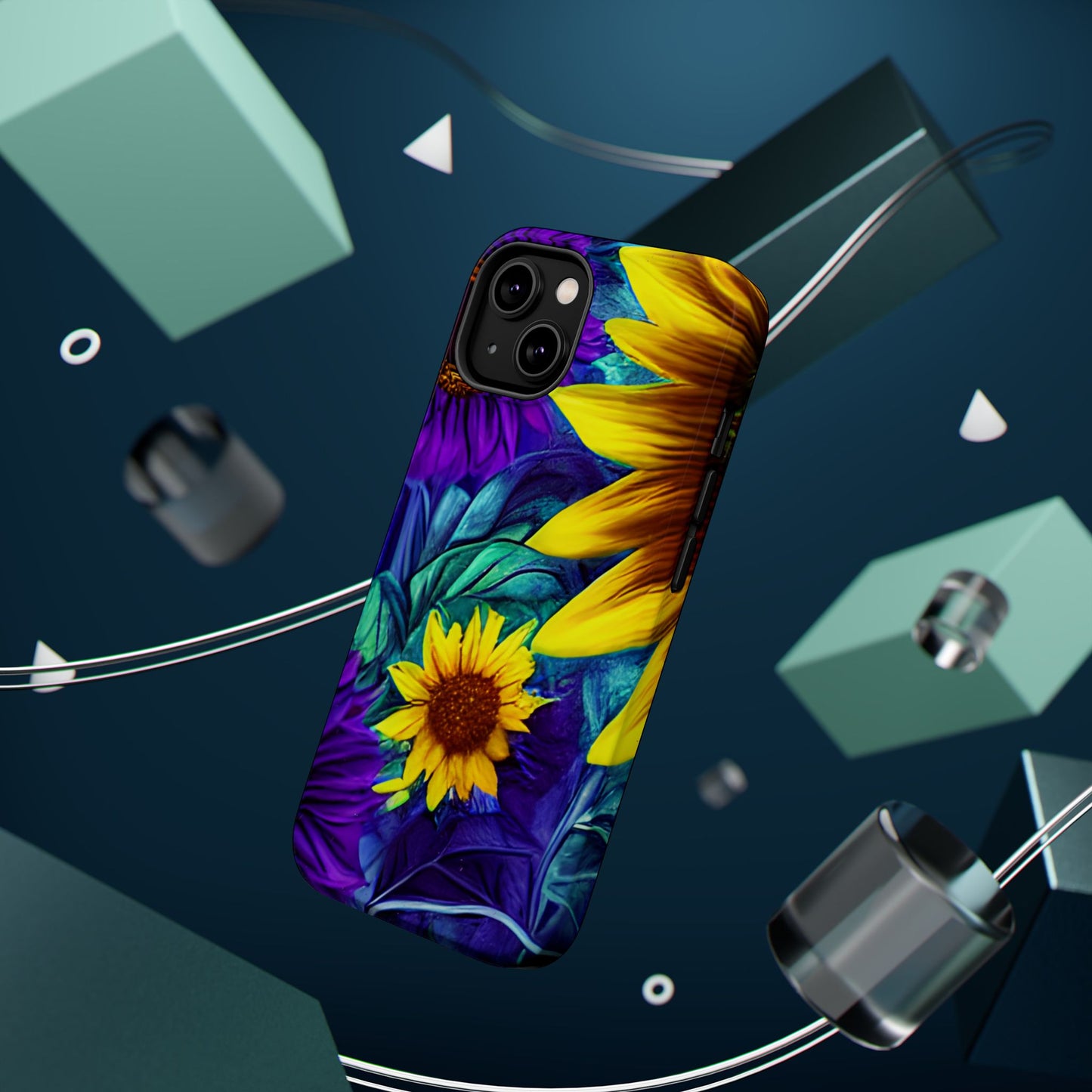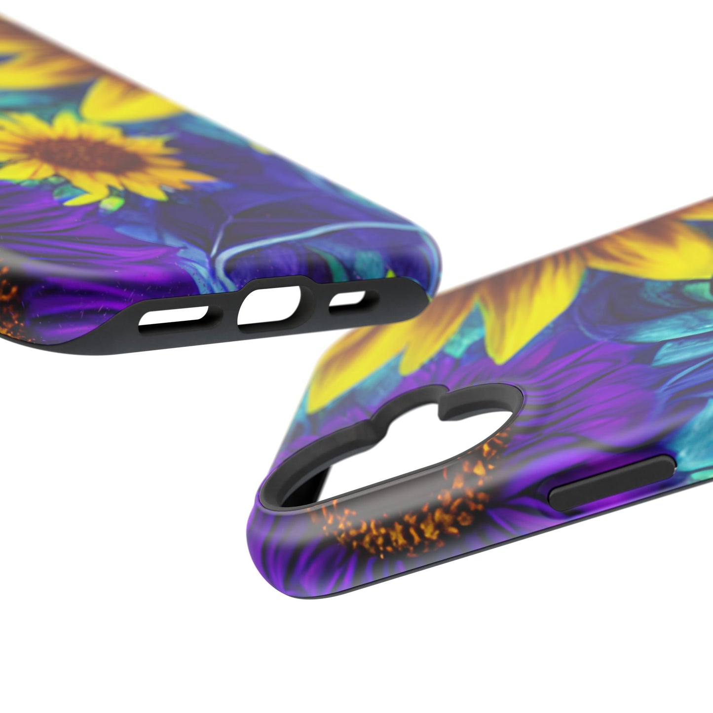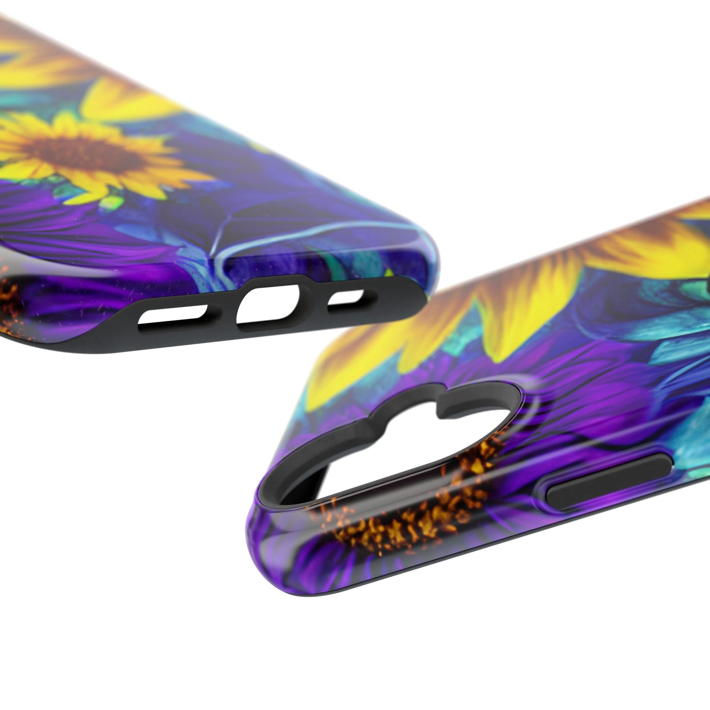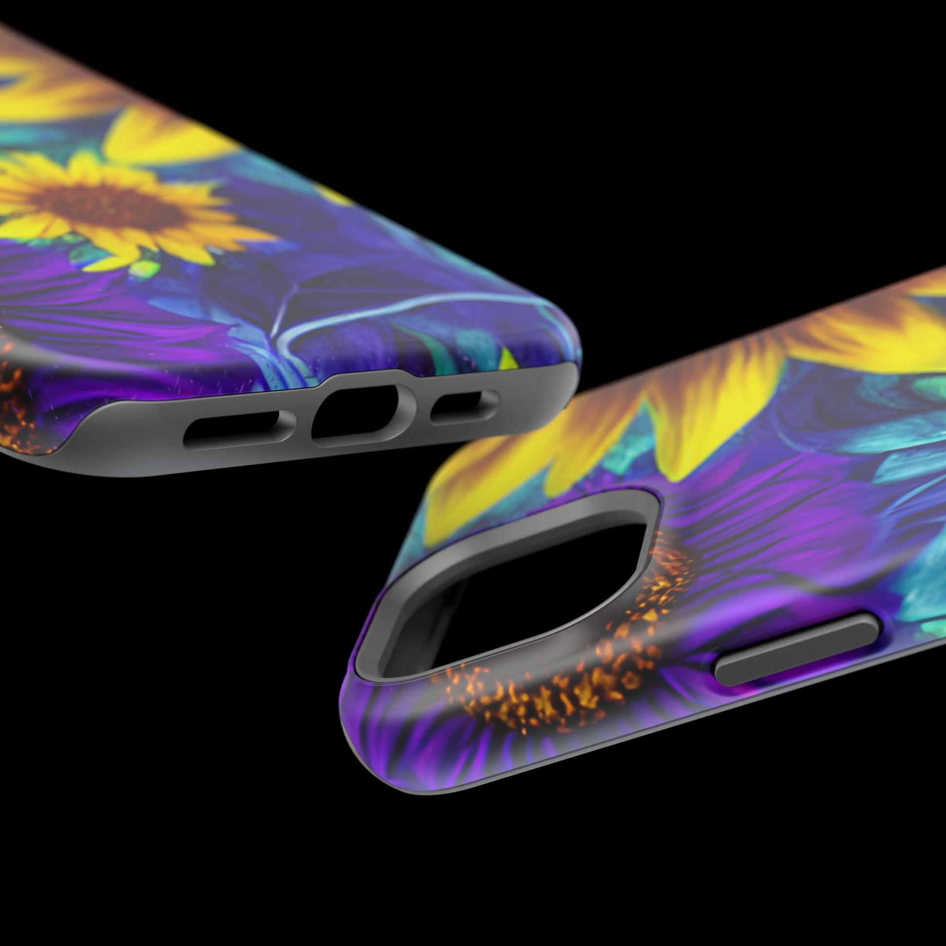 Add a pop of color to your phone with our Purple & Gold Sunflower Dream MagSafe  iPhone Case! Featuring a stunning mix of deep purple and vibrant yellow sunflowers against a bold, blue-green leafy background, this case is a perfect blend of elegance and whimsy. Ideal for anyone who loves unique, eye-catching designs, it provides a dramatic look that stands out. Made with a durable polycarbonate shell and a shock-absorbent TPU liner, this case offers reliable protection along with its artistic flair. Bring this floral fantasy with you everywhere you go!