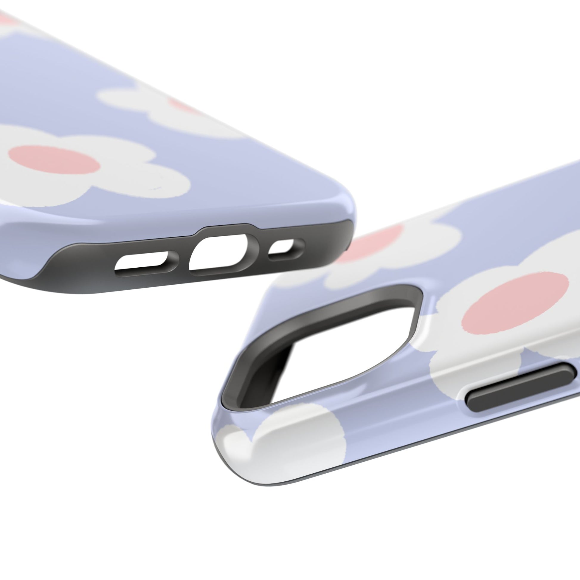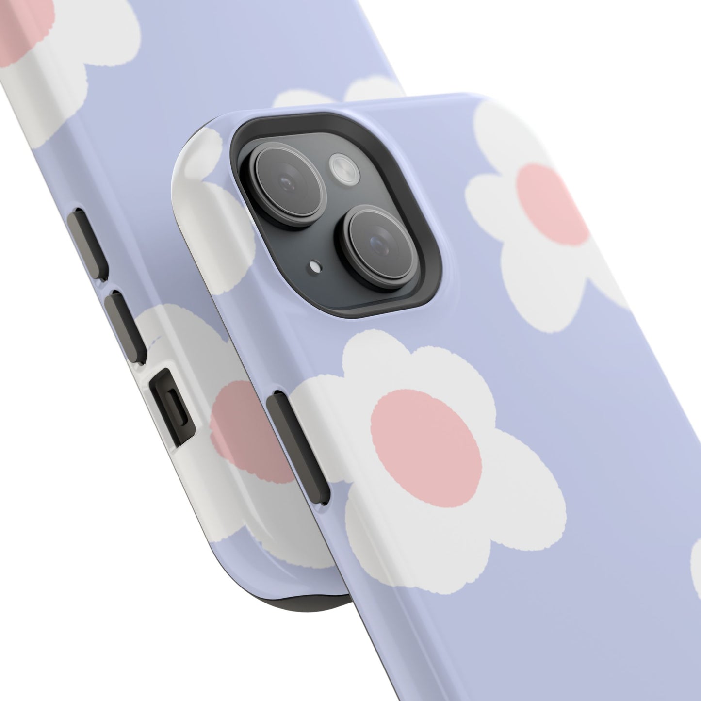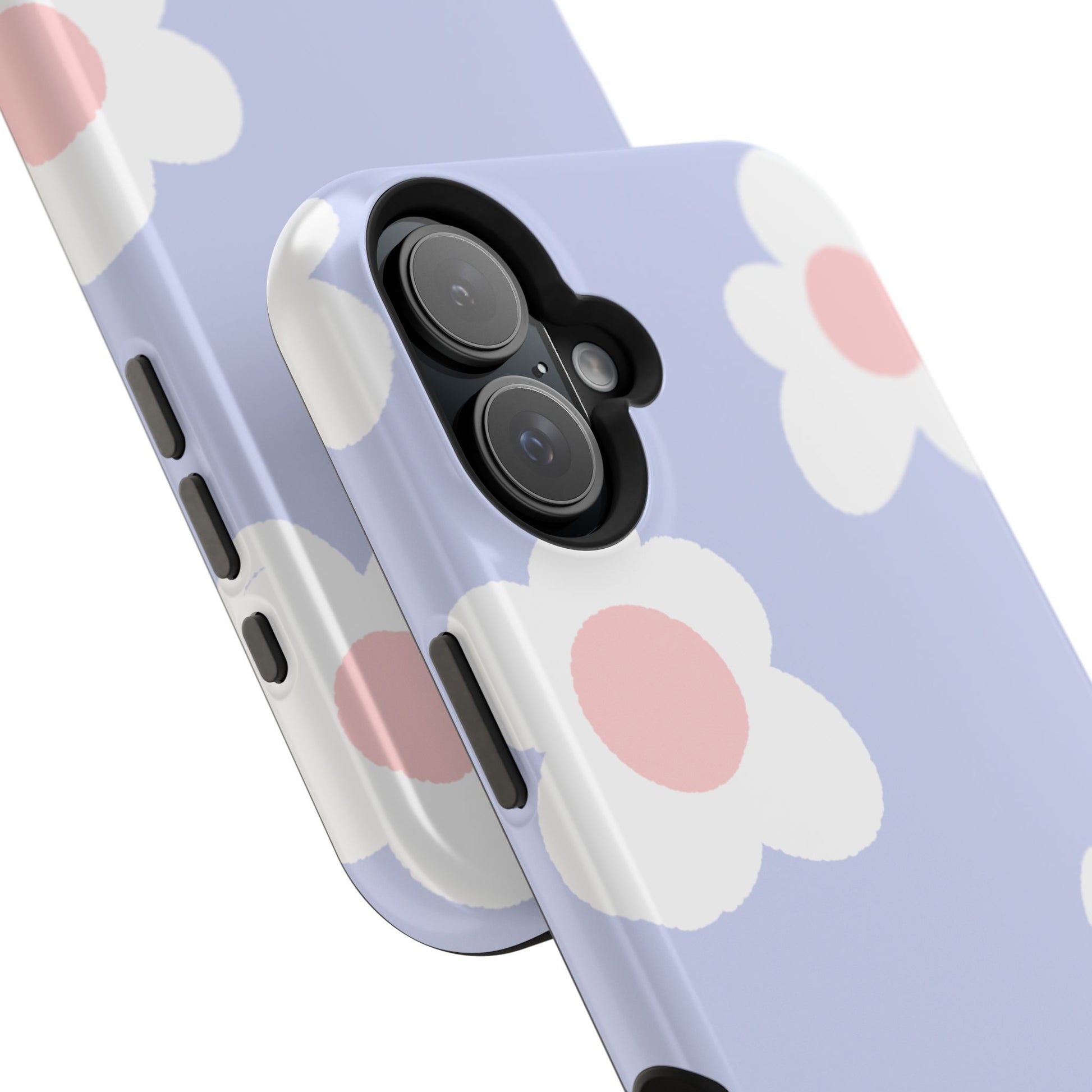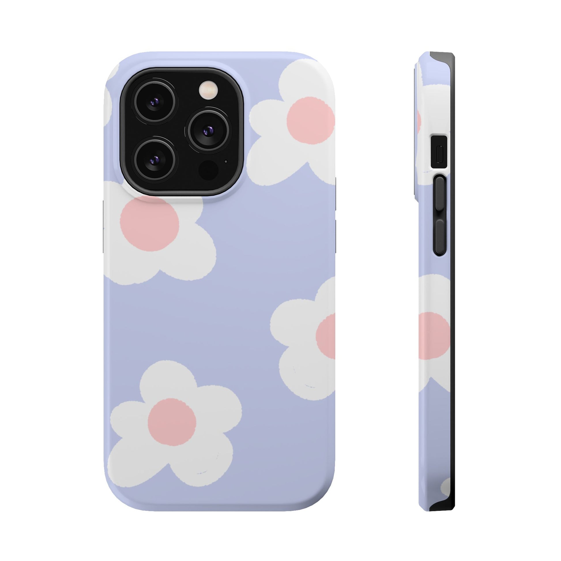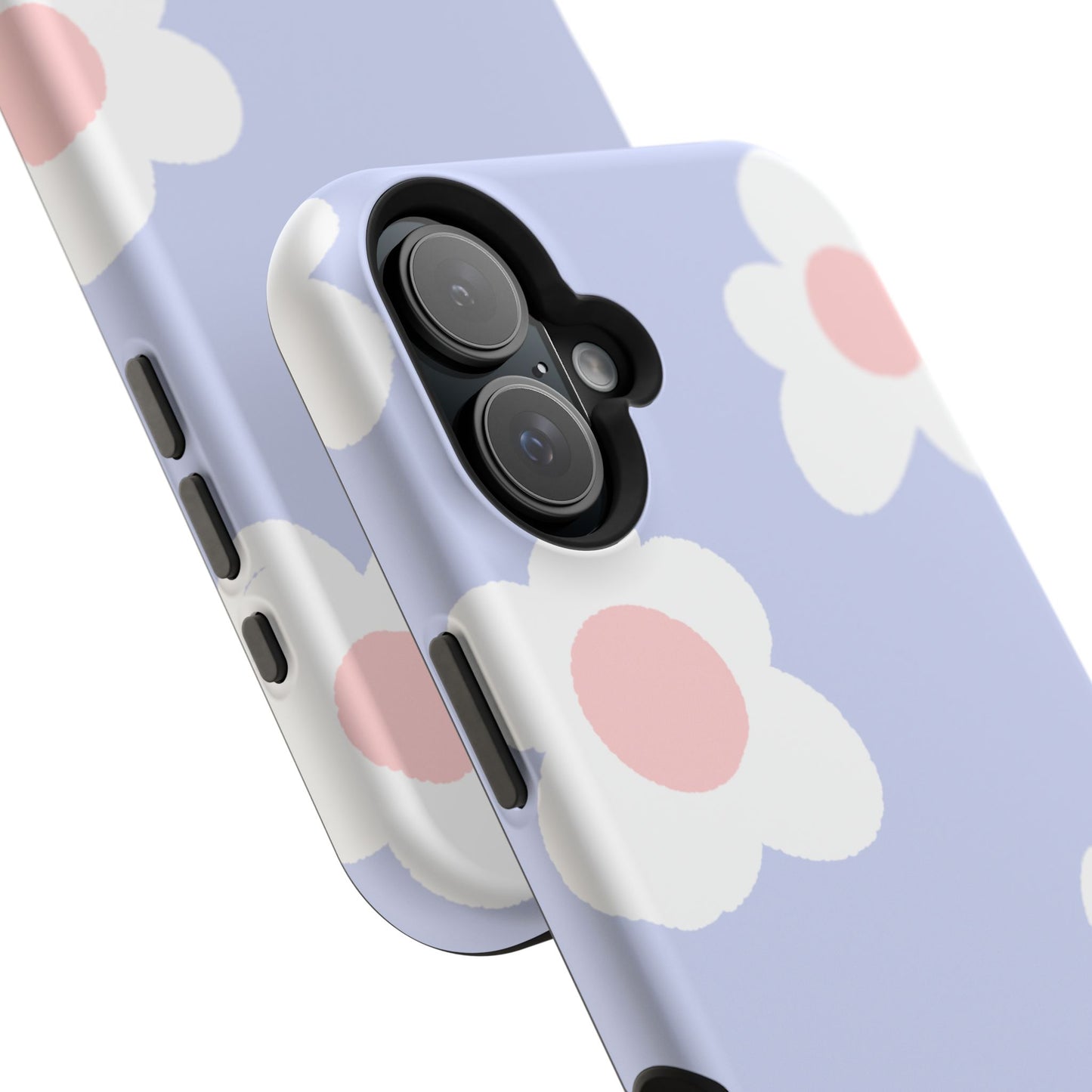 Add a playful retro vibe to your phone with our Retro Daisy Pastel Tough MagSafe iPhone Case. Featuring a charming pattern of hand-drawn white daisies with soft pink centers on a periwinkle blue background, this case evokes a sweet, nostalgic feel. Perfect for lovers of vintage-inspired design, it offers reliable protection with a dual-layer structure that guards against drops and bumps. The smooth matte finish enhances the daisy design while providing a comfortable, non-slip grip.