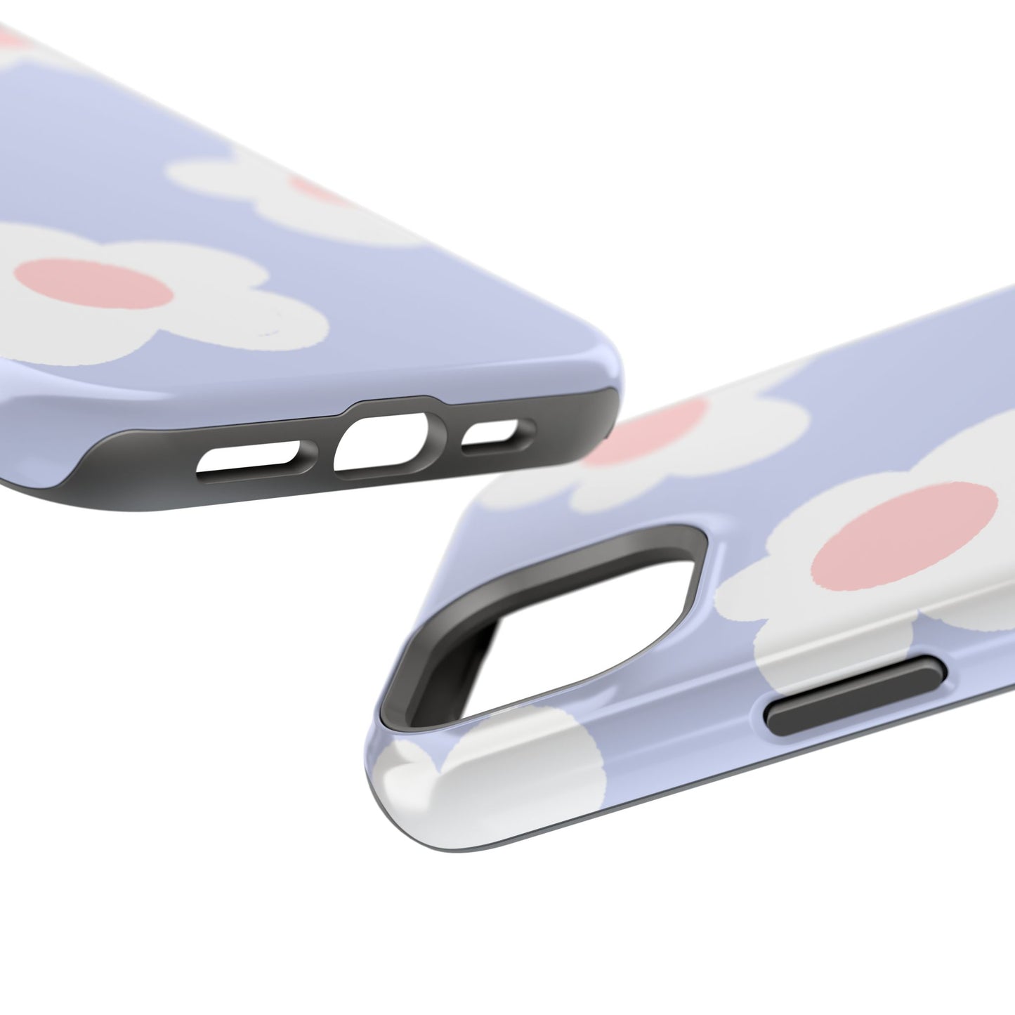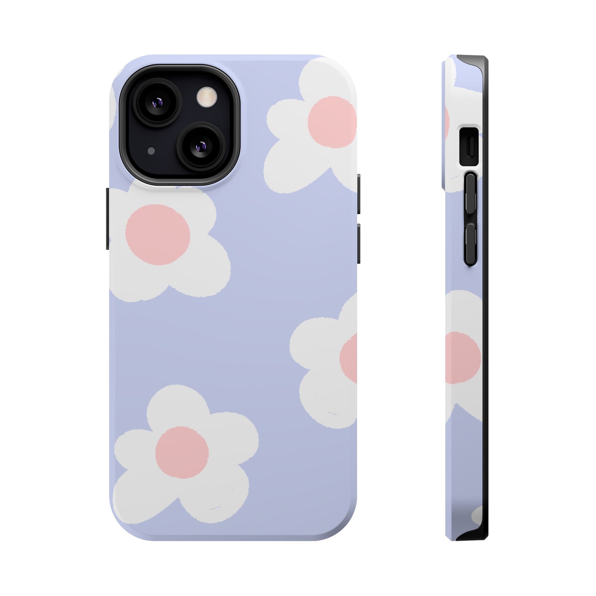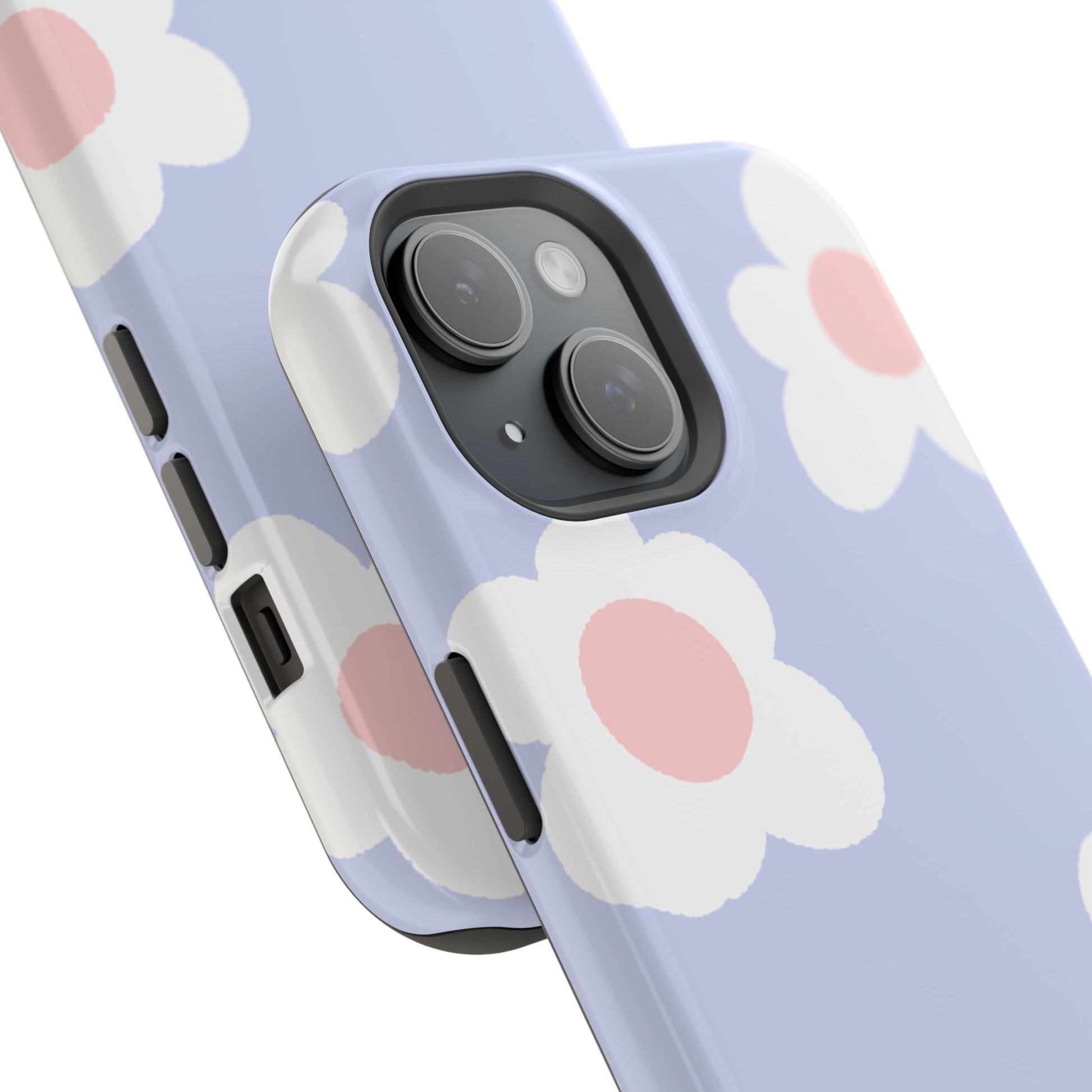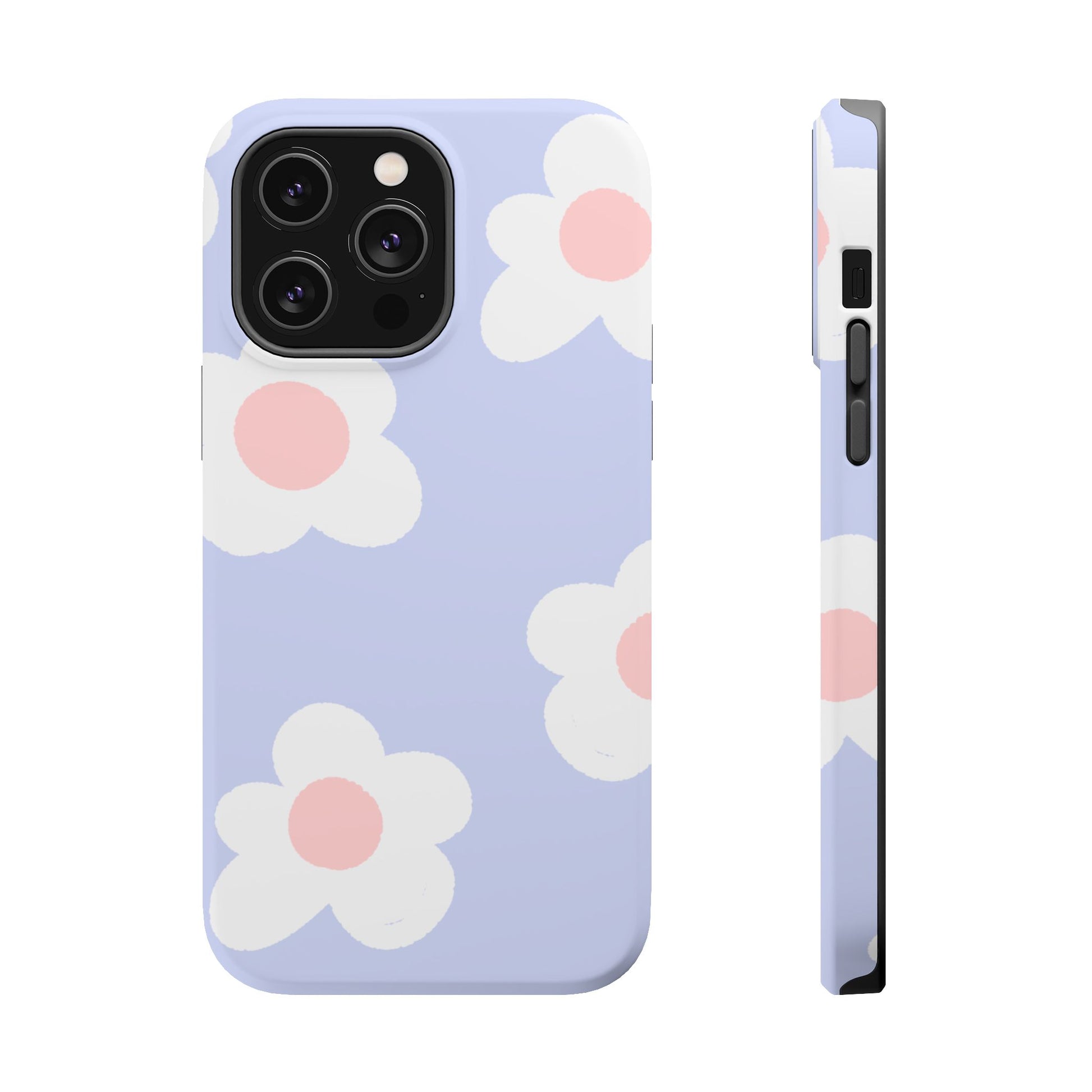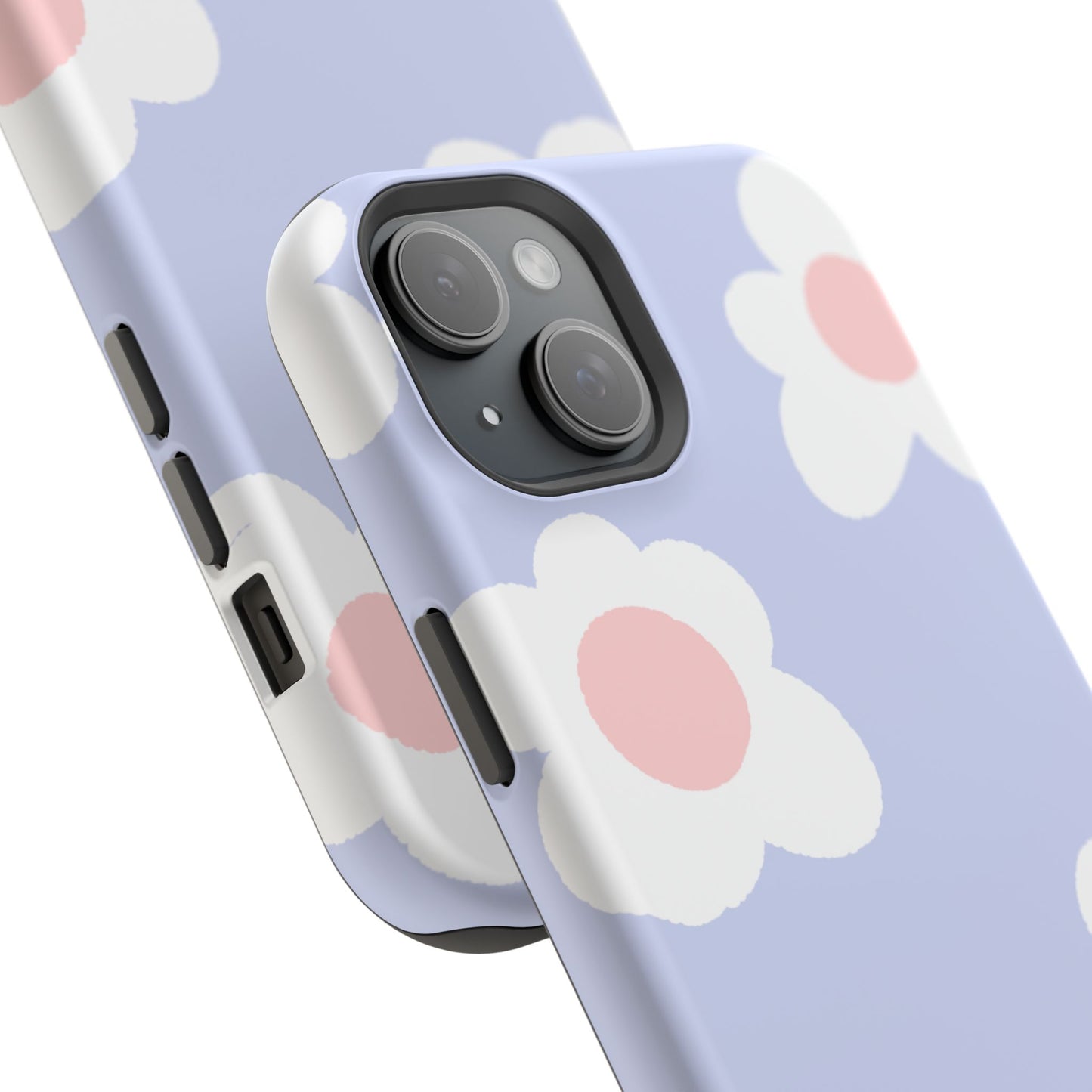 Add a playful retro vibe to your phone with our Retro Daisy Pastel Tough MagSafe iPhone Case. Featuring a charming pattern of hand-drawn white daisies with soft pink centers on a periwinkle blue background, this case evokes a sweet, nostalgic feel. Perfect for lovers of vintage-inspired design, it offers reliable protection with a dual-layer structure that guards against drops and bumps. The smooth matte finish enhances the daisy design while providing a comfortable, non-slip grip.