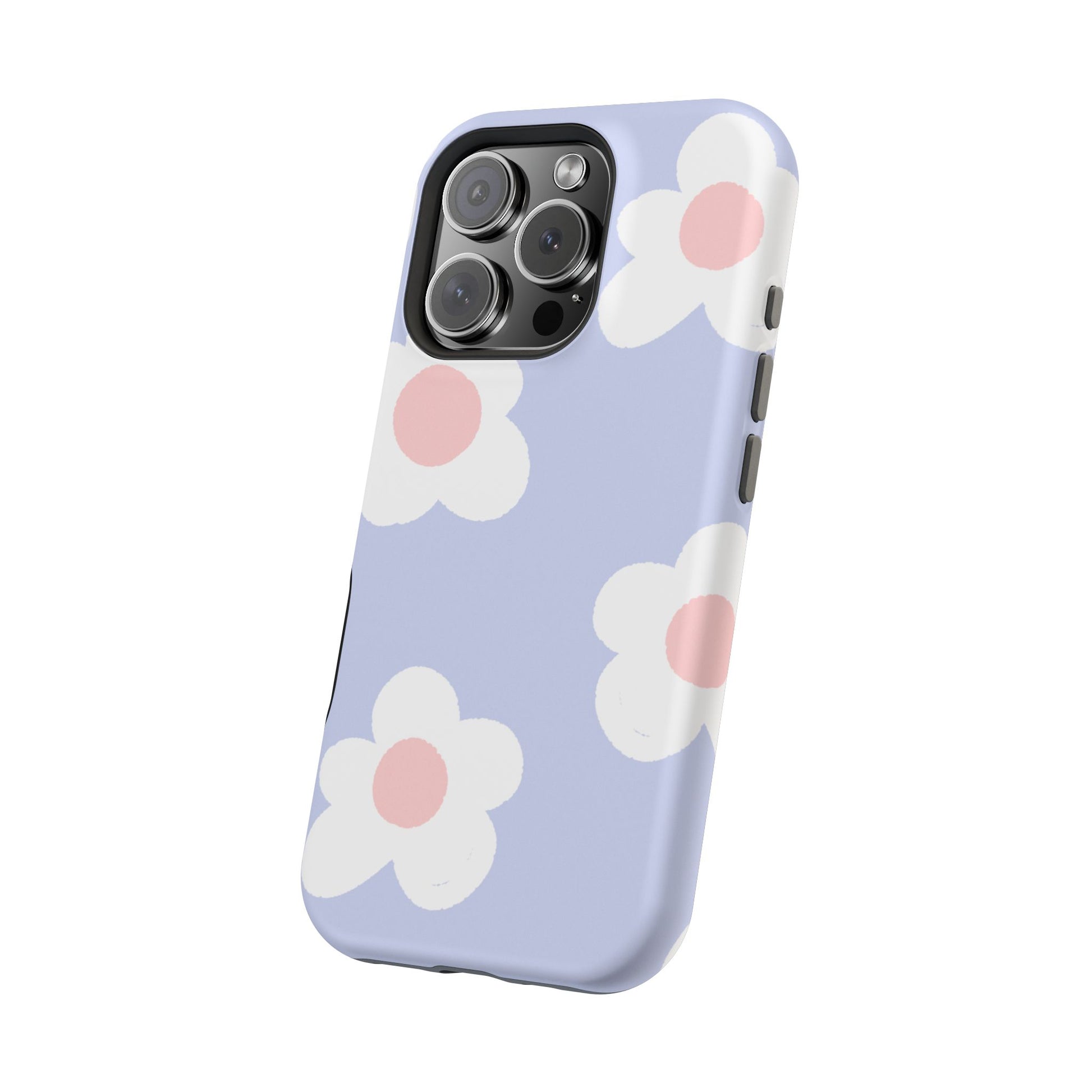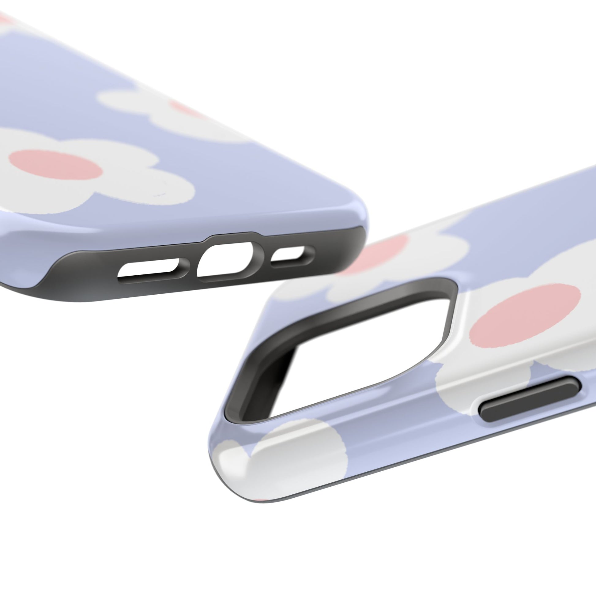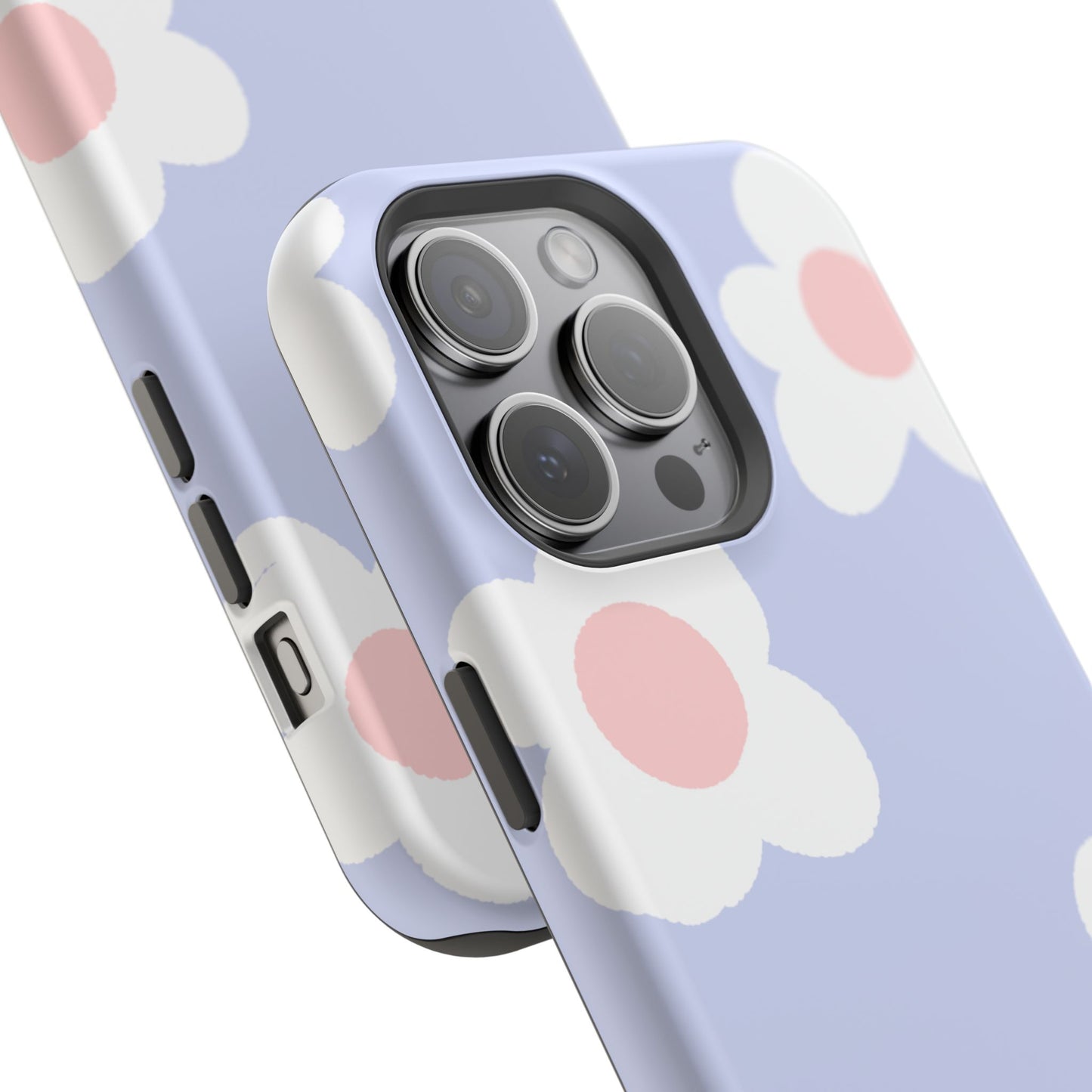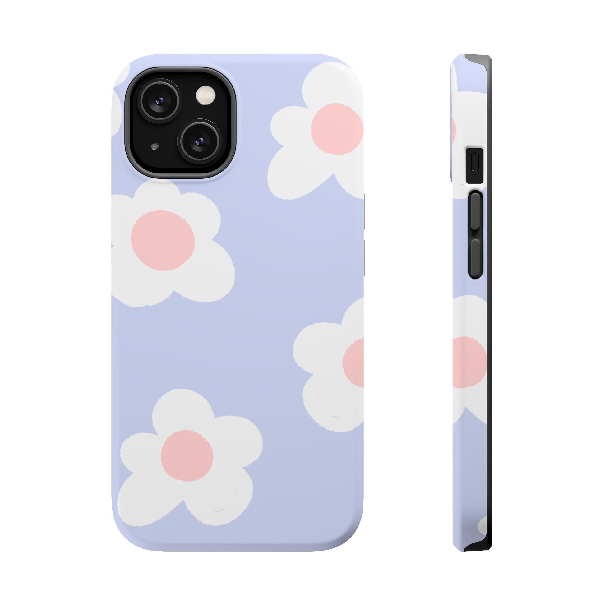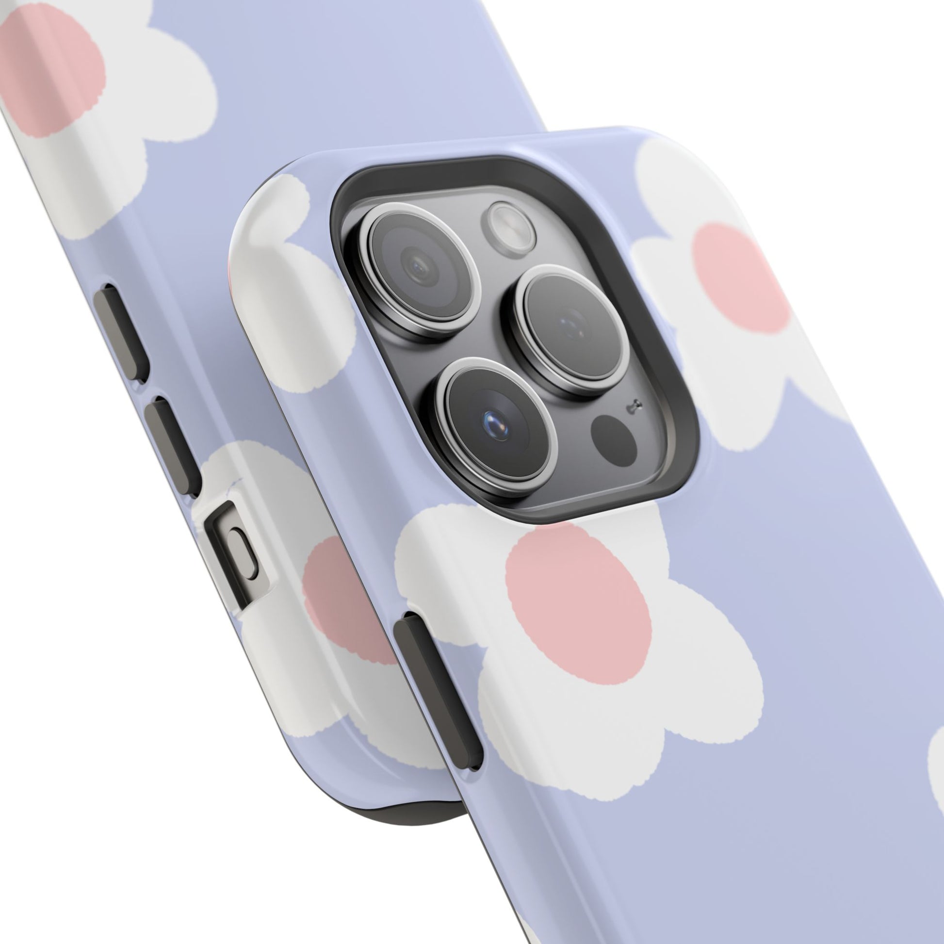 Add a playful retro vibe to your phone with our Retro Daisy Pastel Tough MagSafe iPhone Case. Featuring a charming pattern of hand-drawn white daisies with soft pink centers on a periwinkle blue background, this case evokes a sweet, nostalgic feel. Perfect for lovers of vintage-inspired design, it offers reliable protection with a dual-layer structure that guards against drops and bumps. The smooth matte finish enhances the daisy design while providing a comfortable, non-slip grip.
