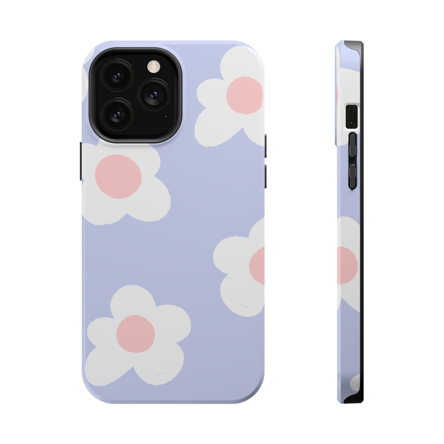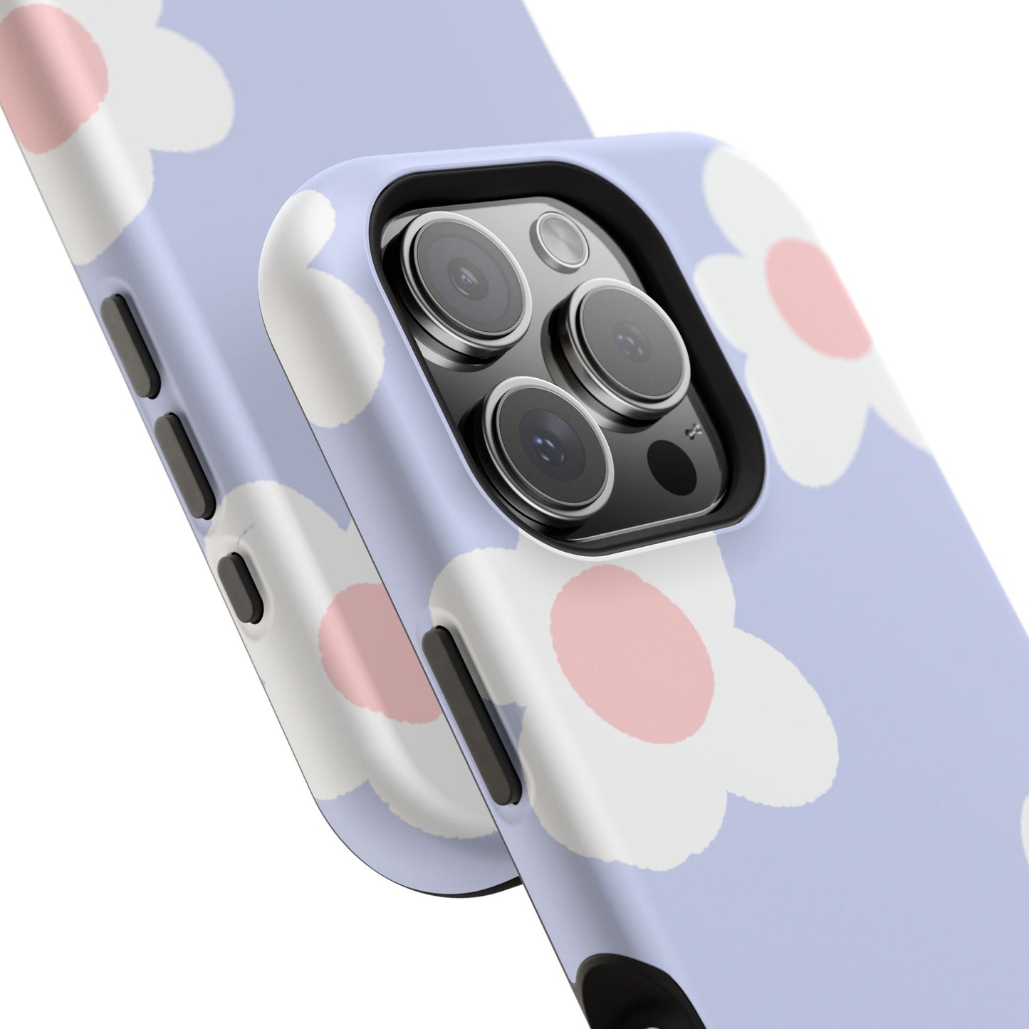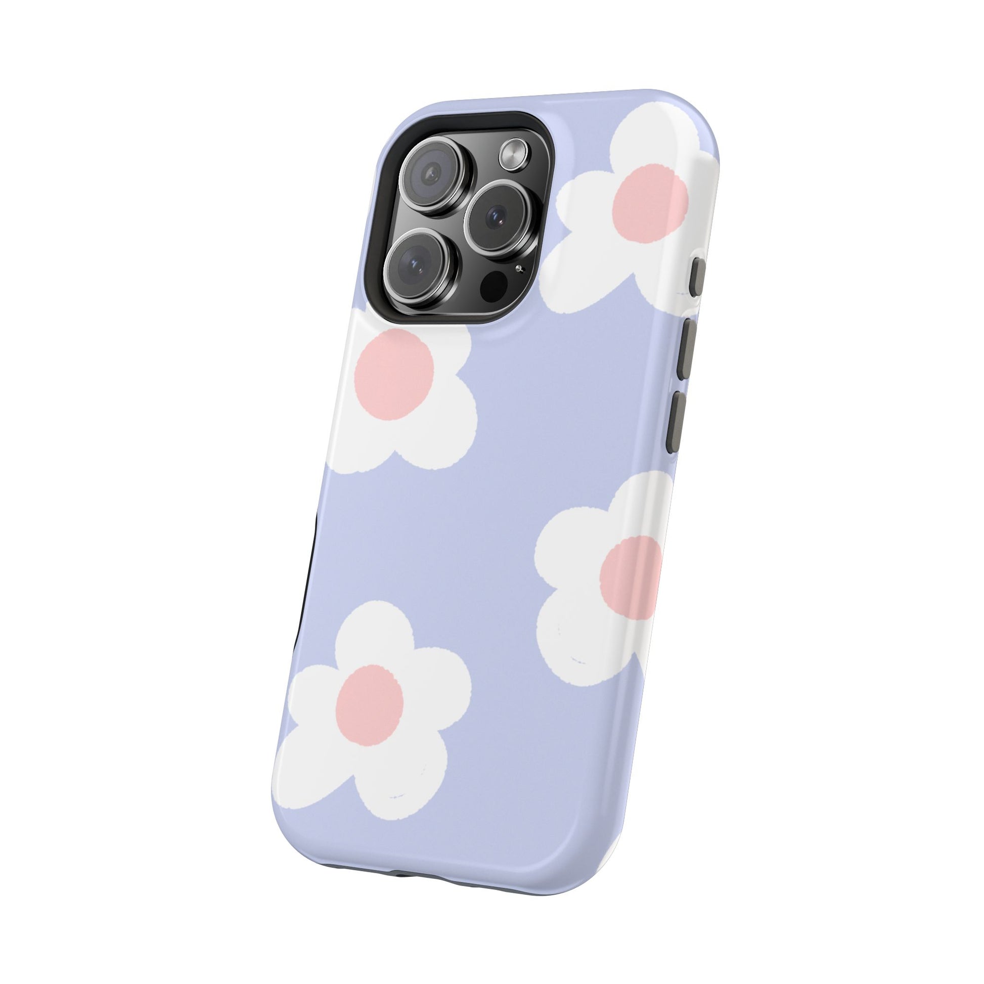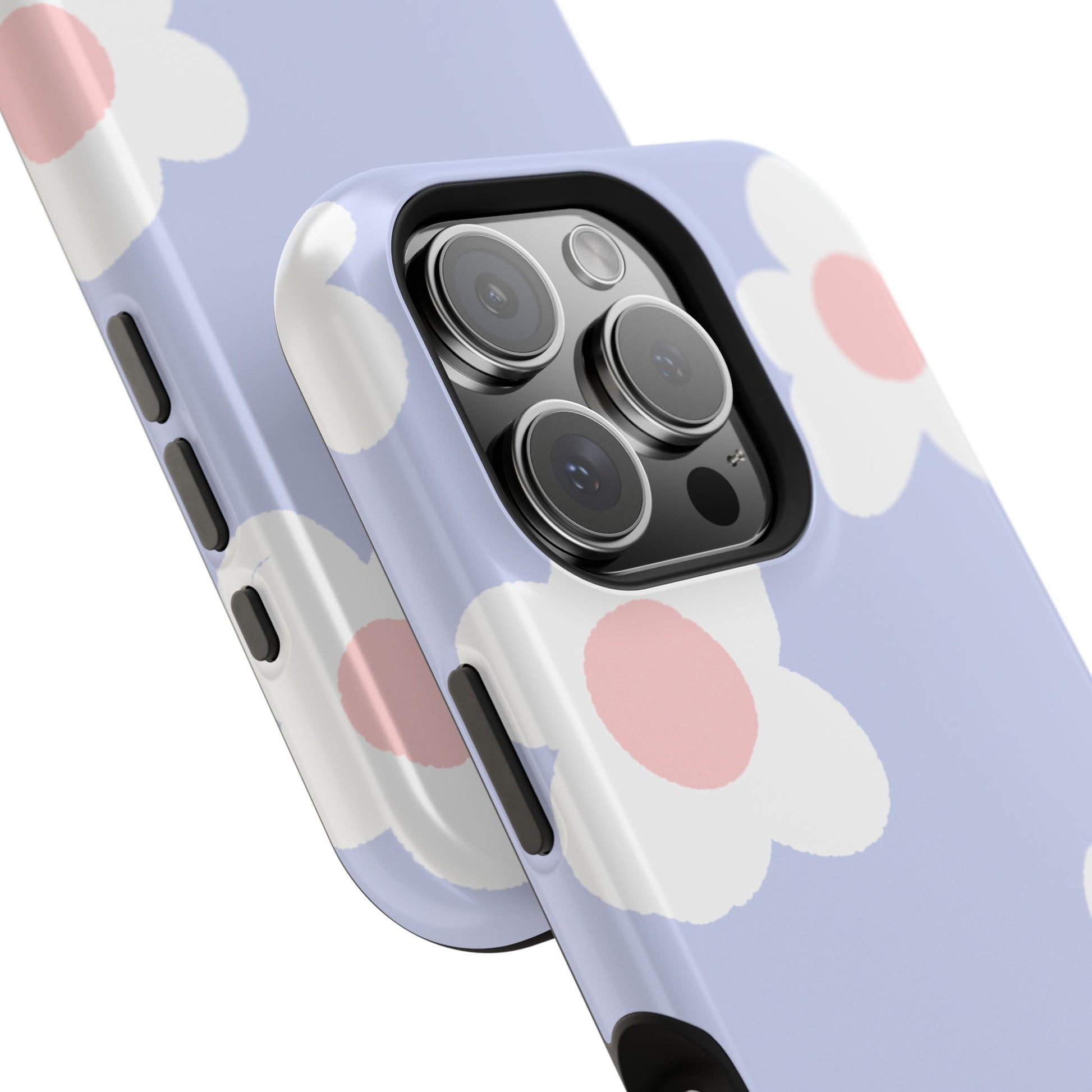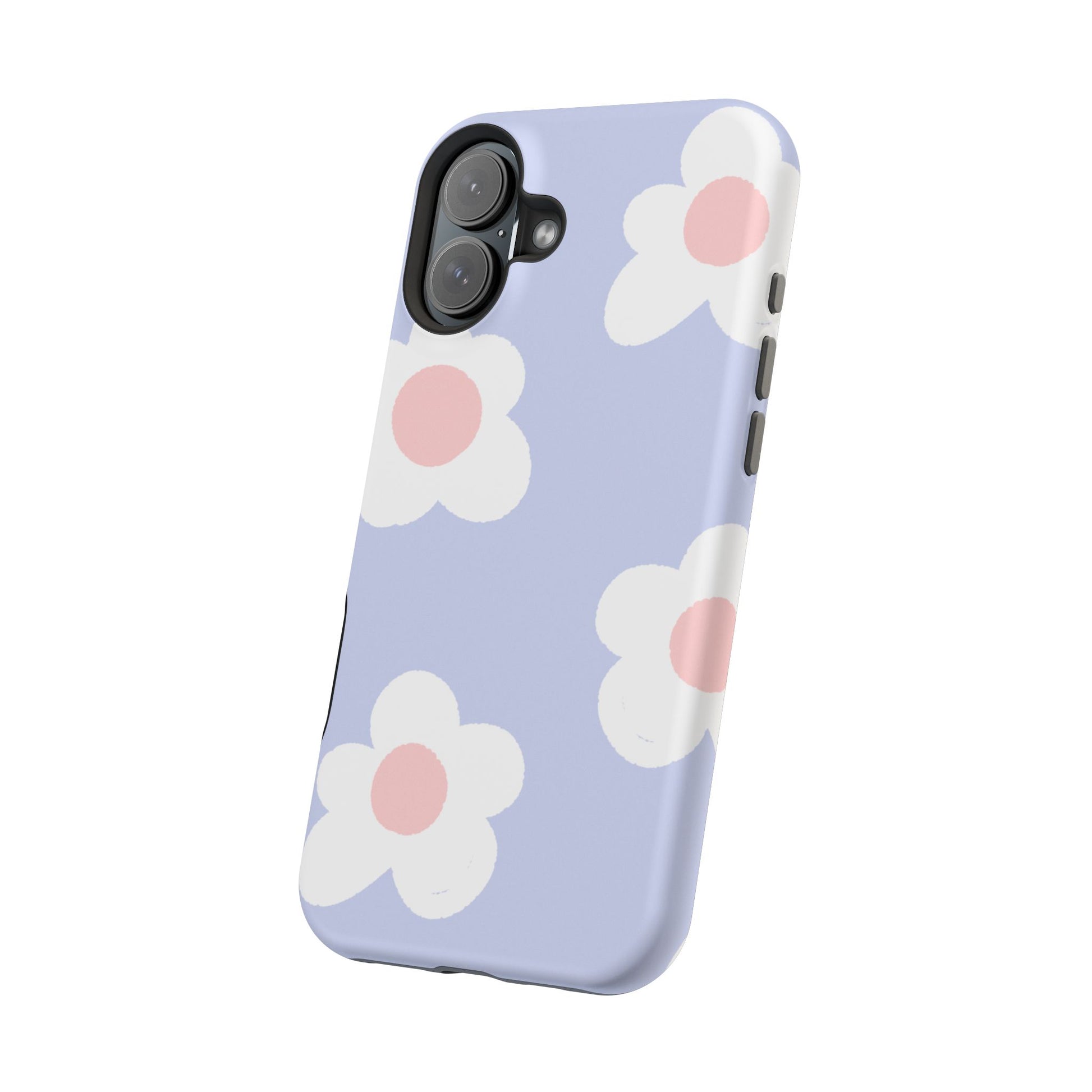 Add a playful retro vibe to your phone with our Retro Daisy Pastel Tough MagSafe iPhone Case. Featuring a charming pattern of hand-drawn white daisies with soft pink centers on a periwinkle blue background, this case evokes a sweet, nostalgic feel. Perfect for lovers of vintage-inspired design, it offers reliable protection with a dual-layer structure that guards against drops and bumps. The smooth matte finish enhances the daisy design while providing a comfortable, non-slip grip.