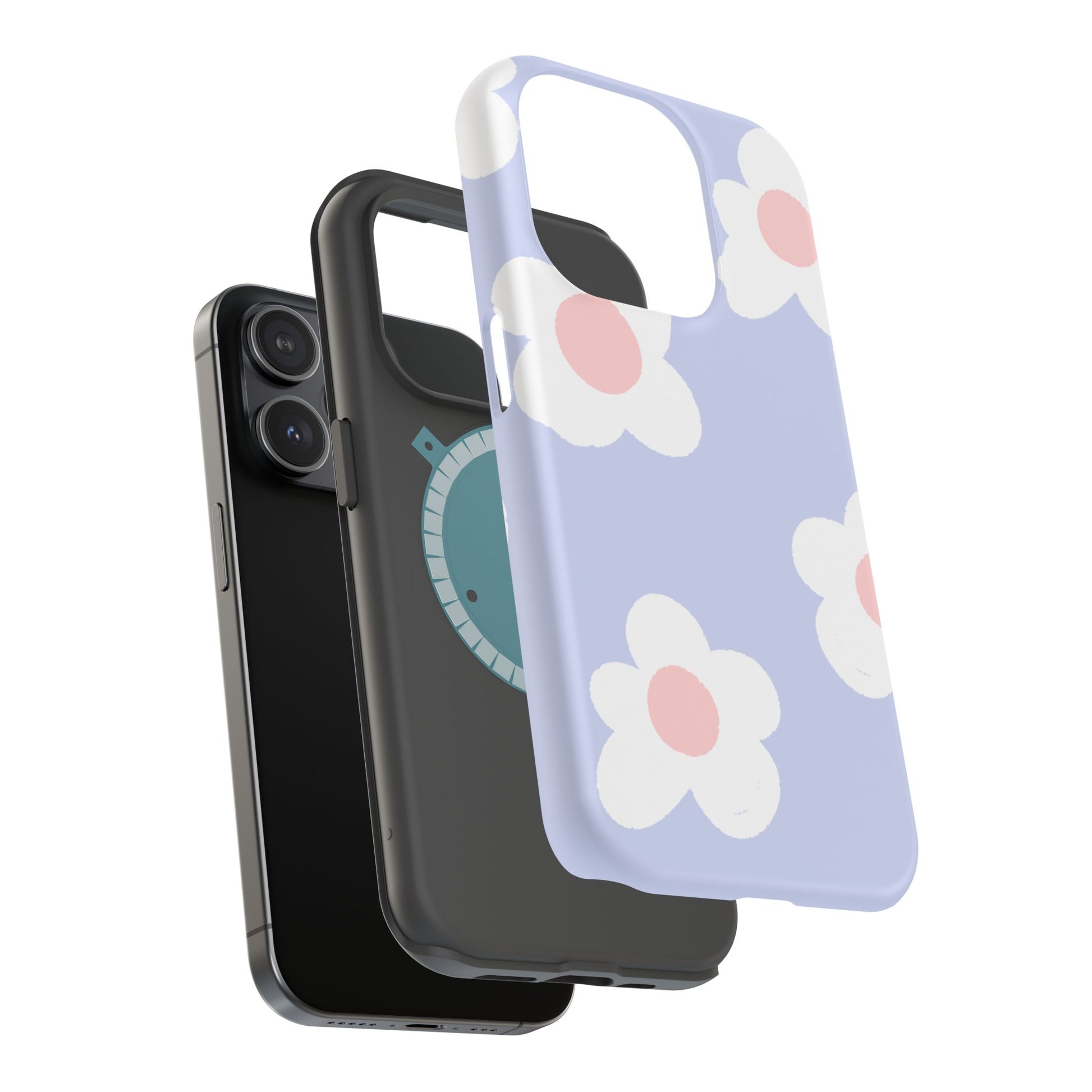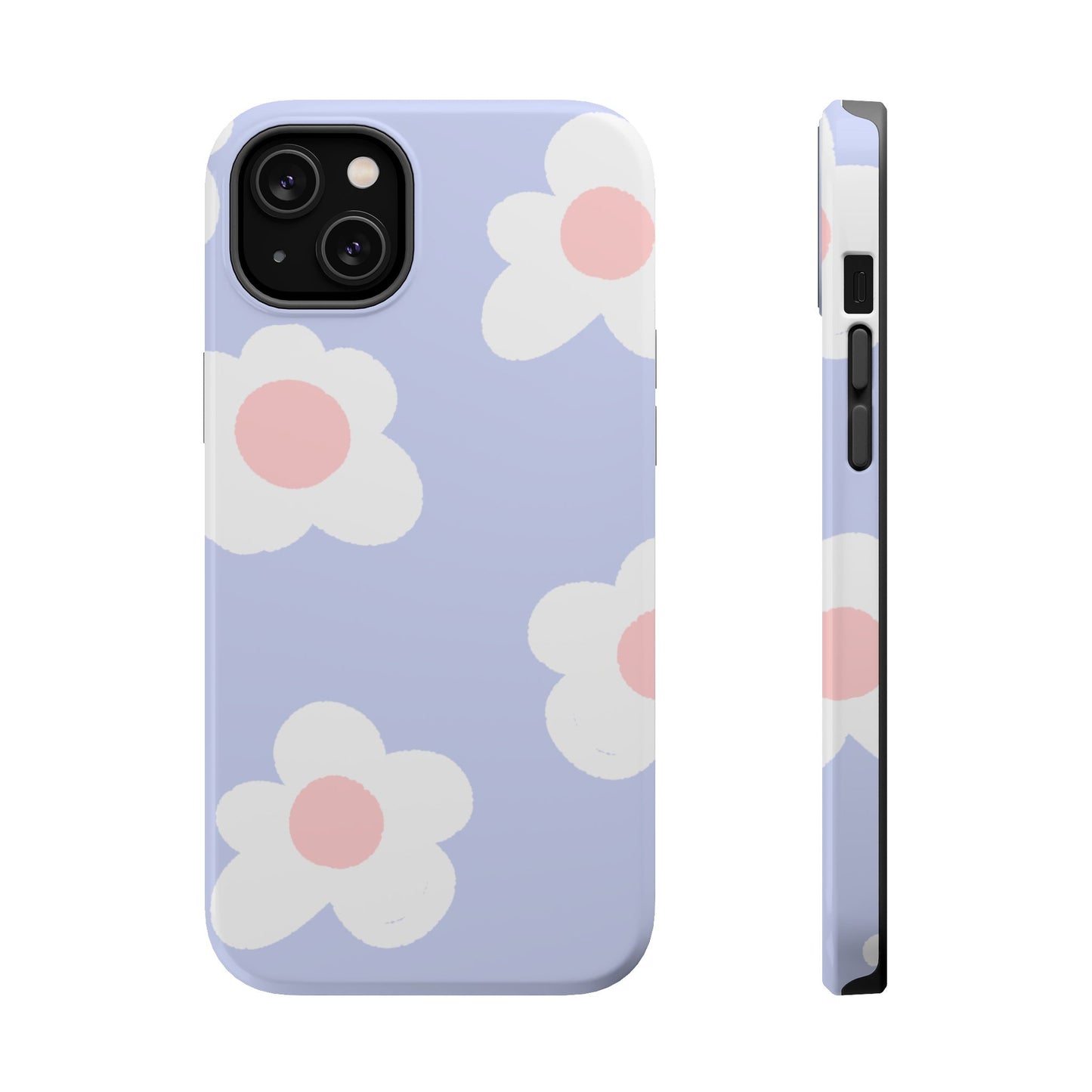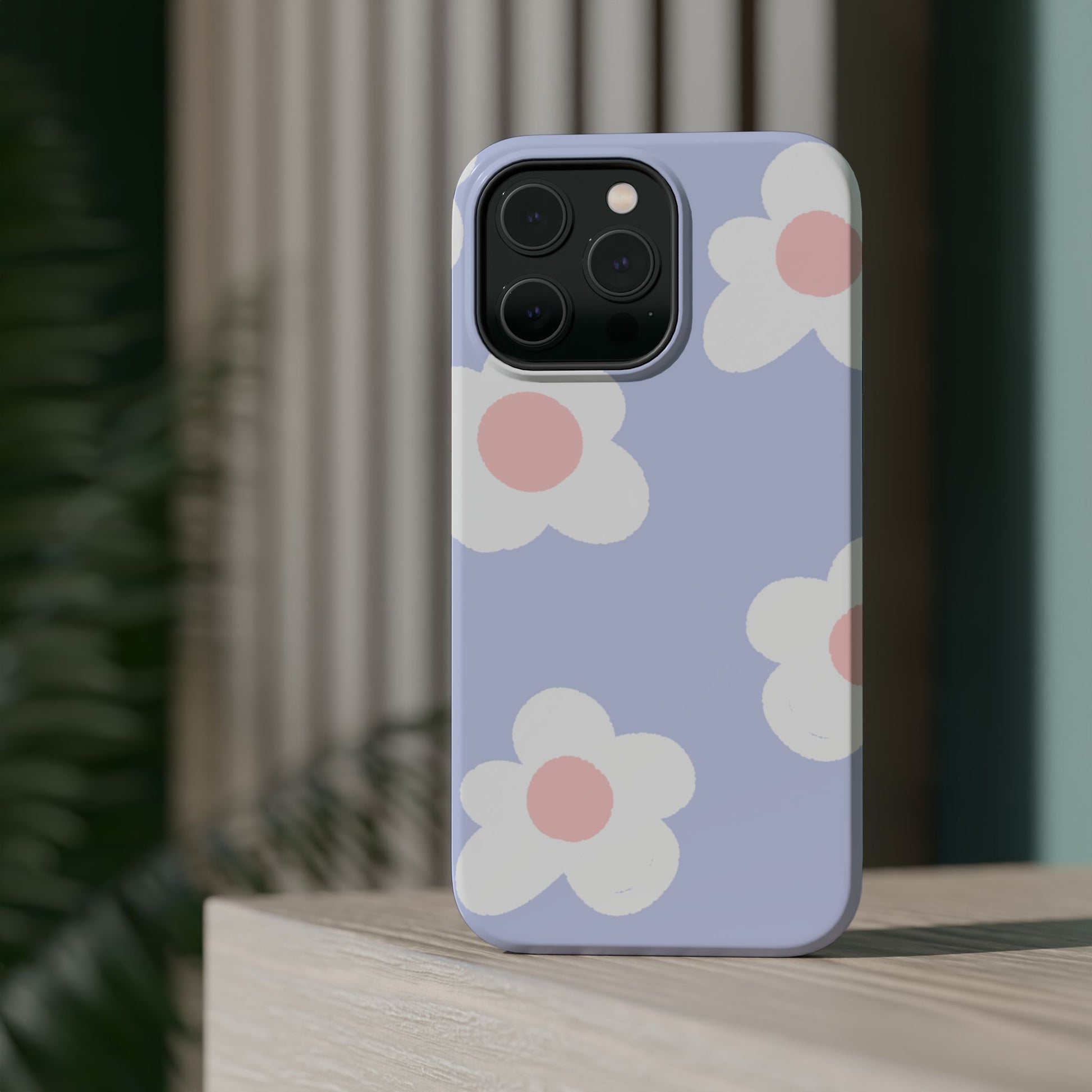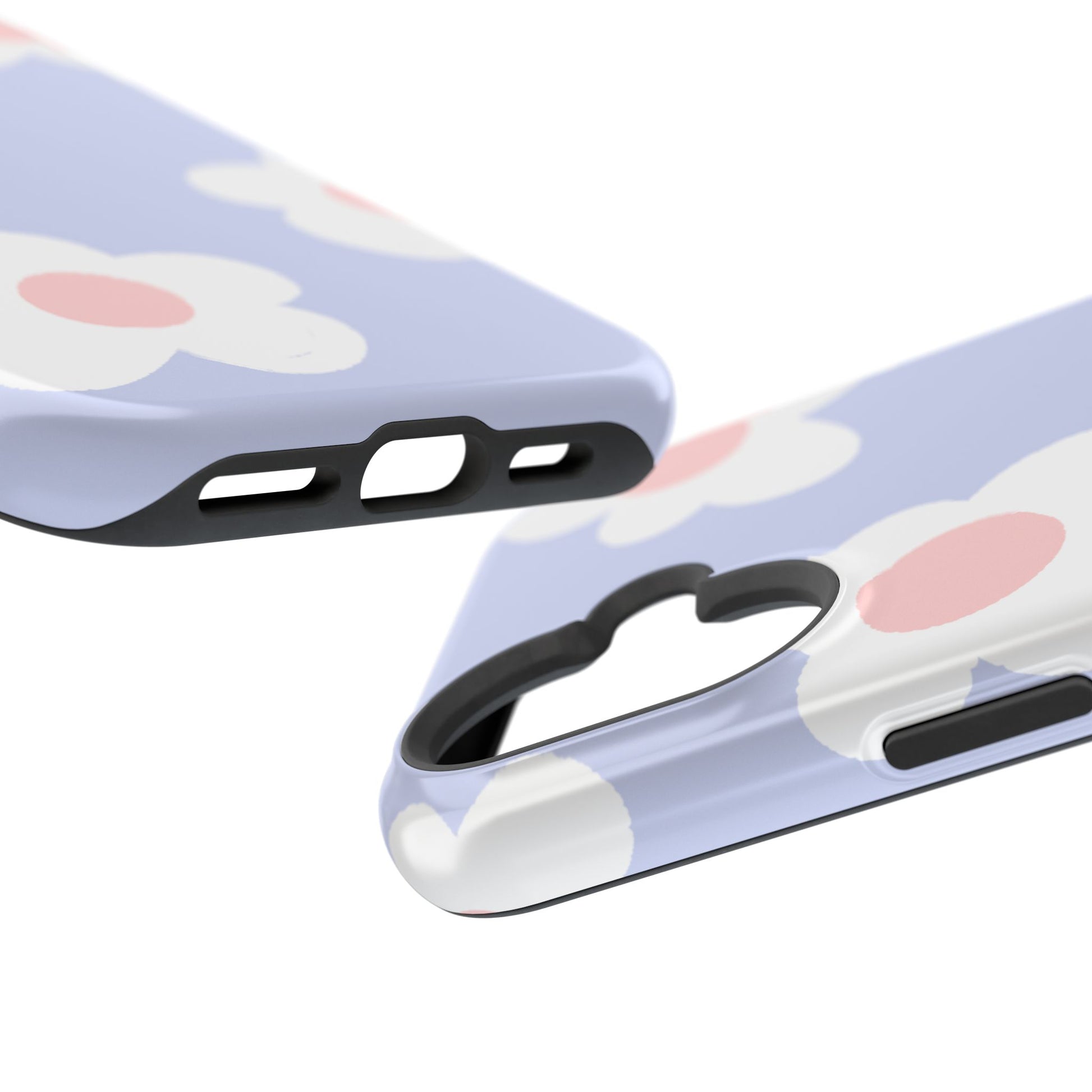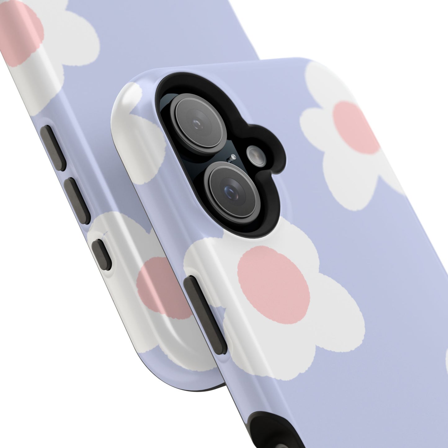 Add a playful retro vibe to your phone with our Retro Daisy Pastel Tough MagSafe iPhone Case. Featuring a charming pattern of hand-drawn white daisies with soft pink centers on a periwinkle blue background, this case evokes a sweet, nostalgic feel. Perfect for lovers of vintage-inspired design, it offers reliable protection with a dual-layer structure that guards against drops and bumps. The smooth matte finish enhances the daisy design while providing a comfortable, non-slip grip.