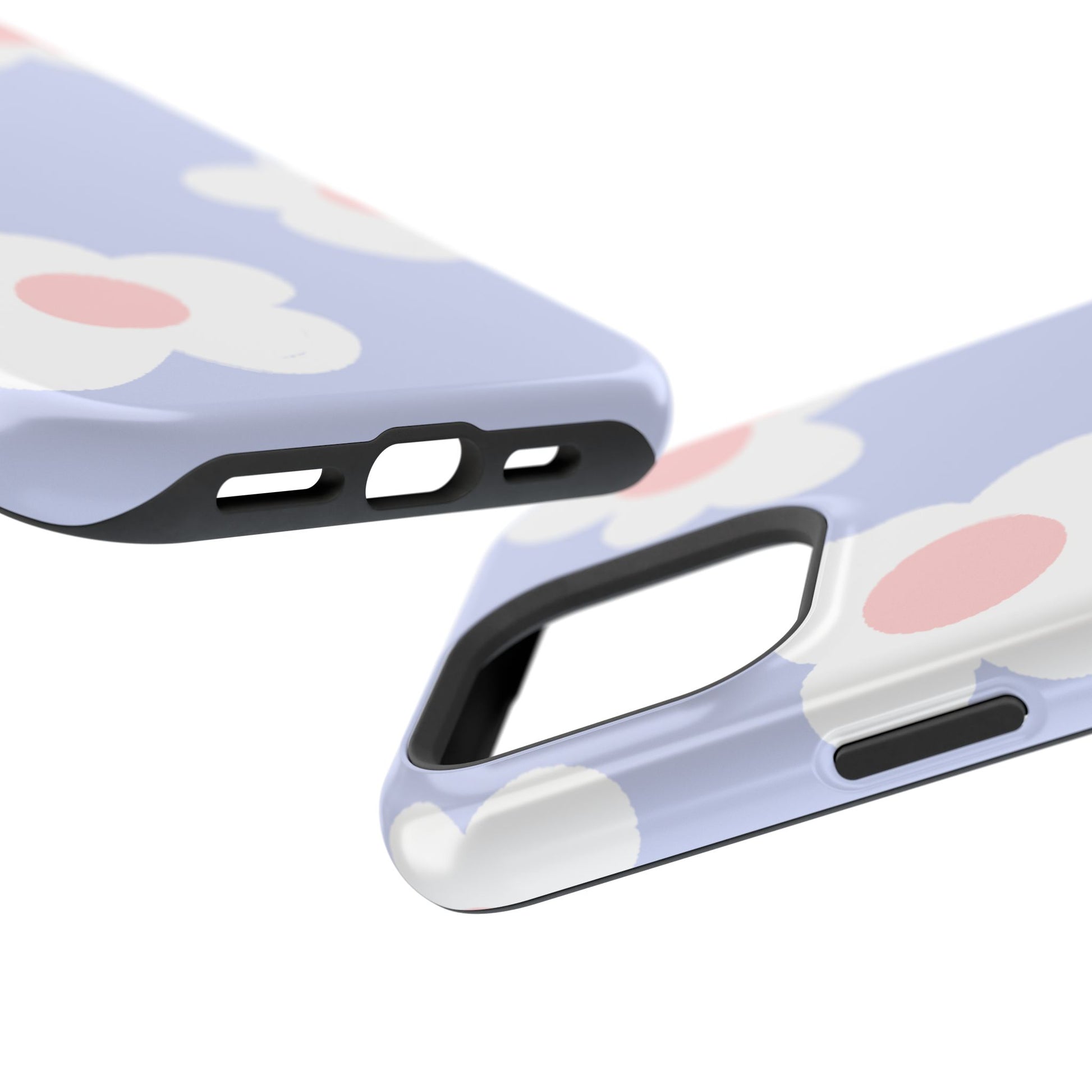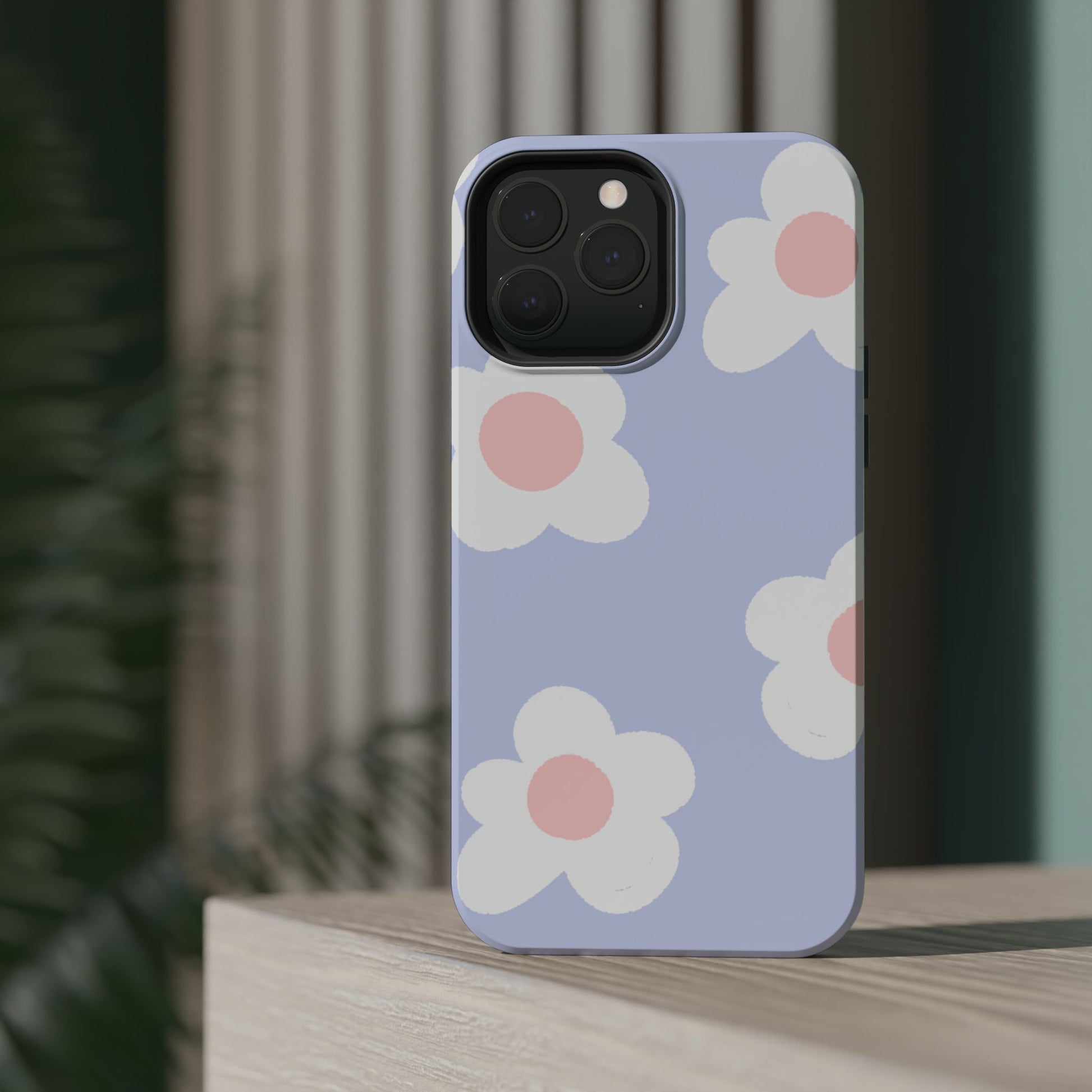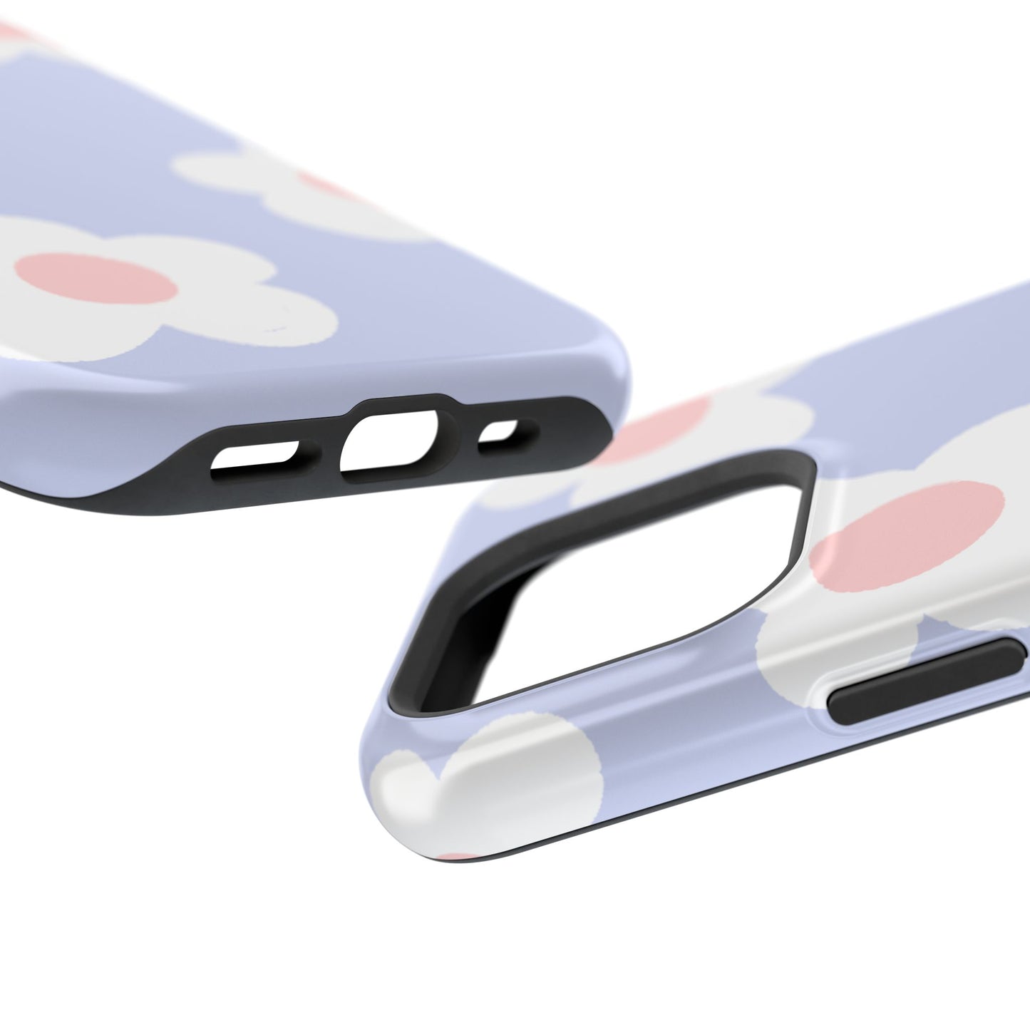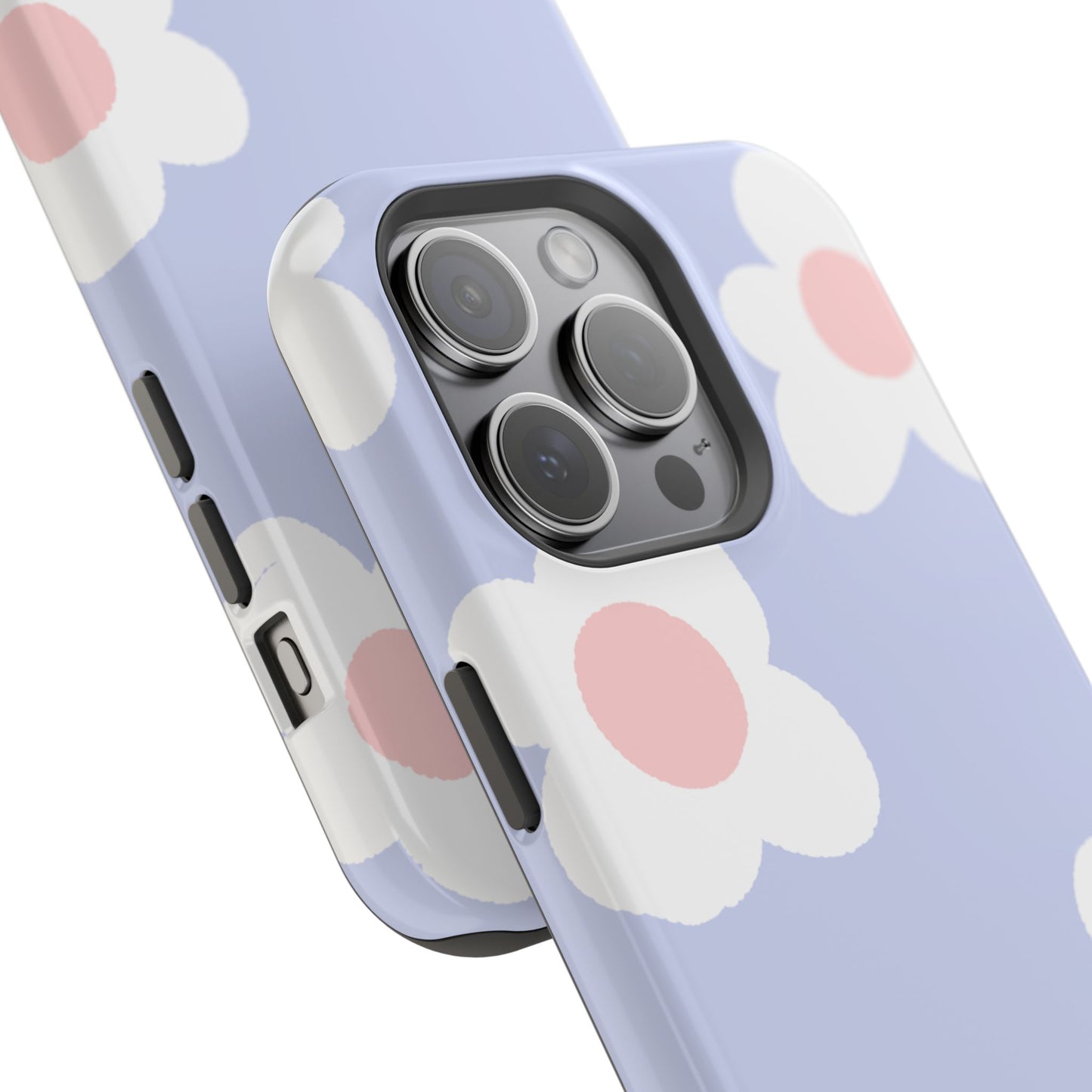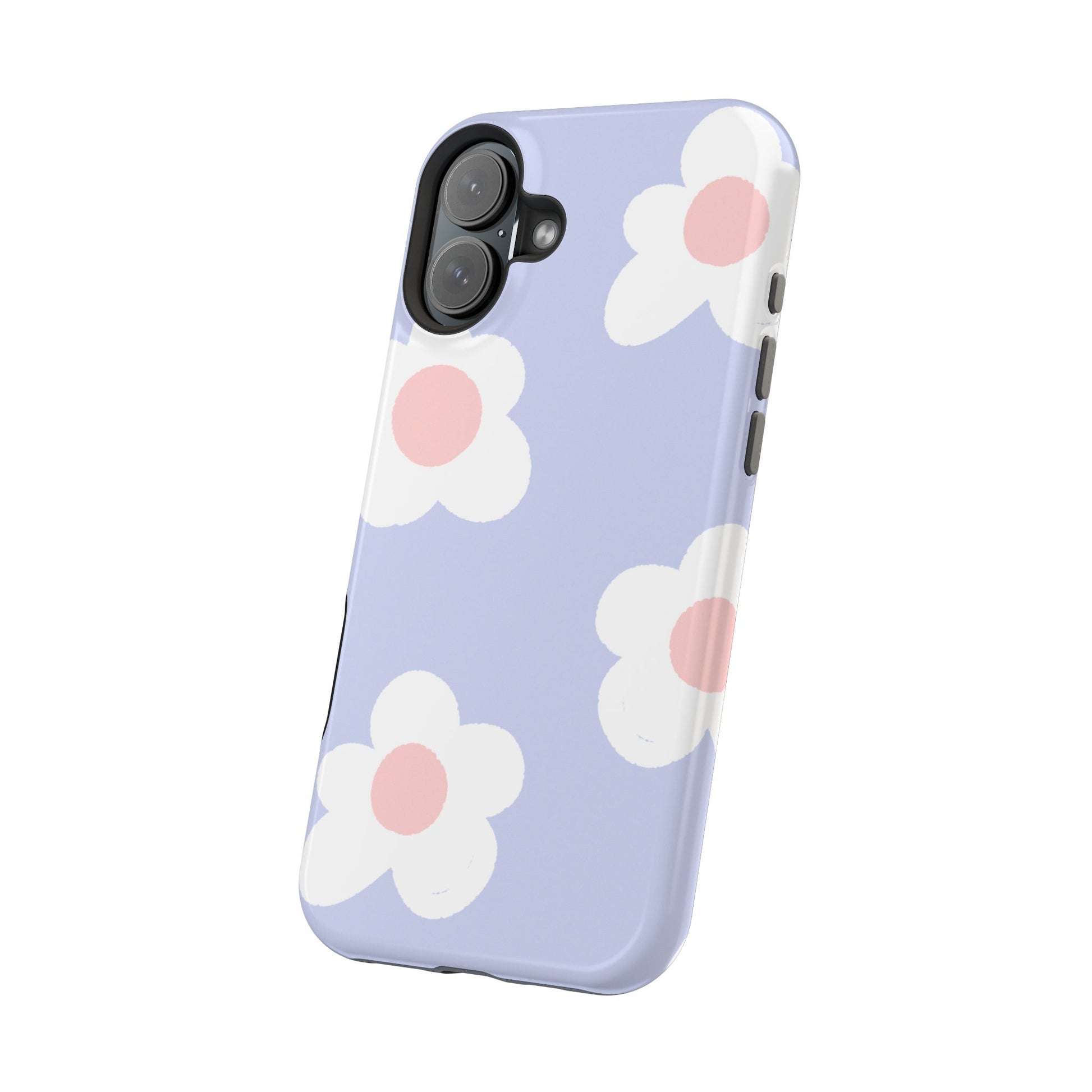 Add a playful retro vibe to your phone with our Retro Daisy Pastel Tough MagSafe iPhone Case. Featuring a charming pattern of hand-drawn white daisies with soft pink centers on a periwinkle blue background, this case evokes a sweet, nostalgic feel. Perfect for lovers of vintage-inspired design, it offers reliable protection with a dual-layer structure that guards against drops and bumps. The smooth matte finish enhances the daisy design while providing a comfortable, non-slip grip.