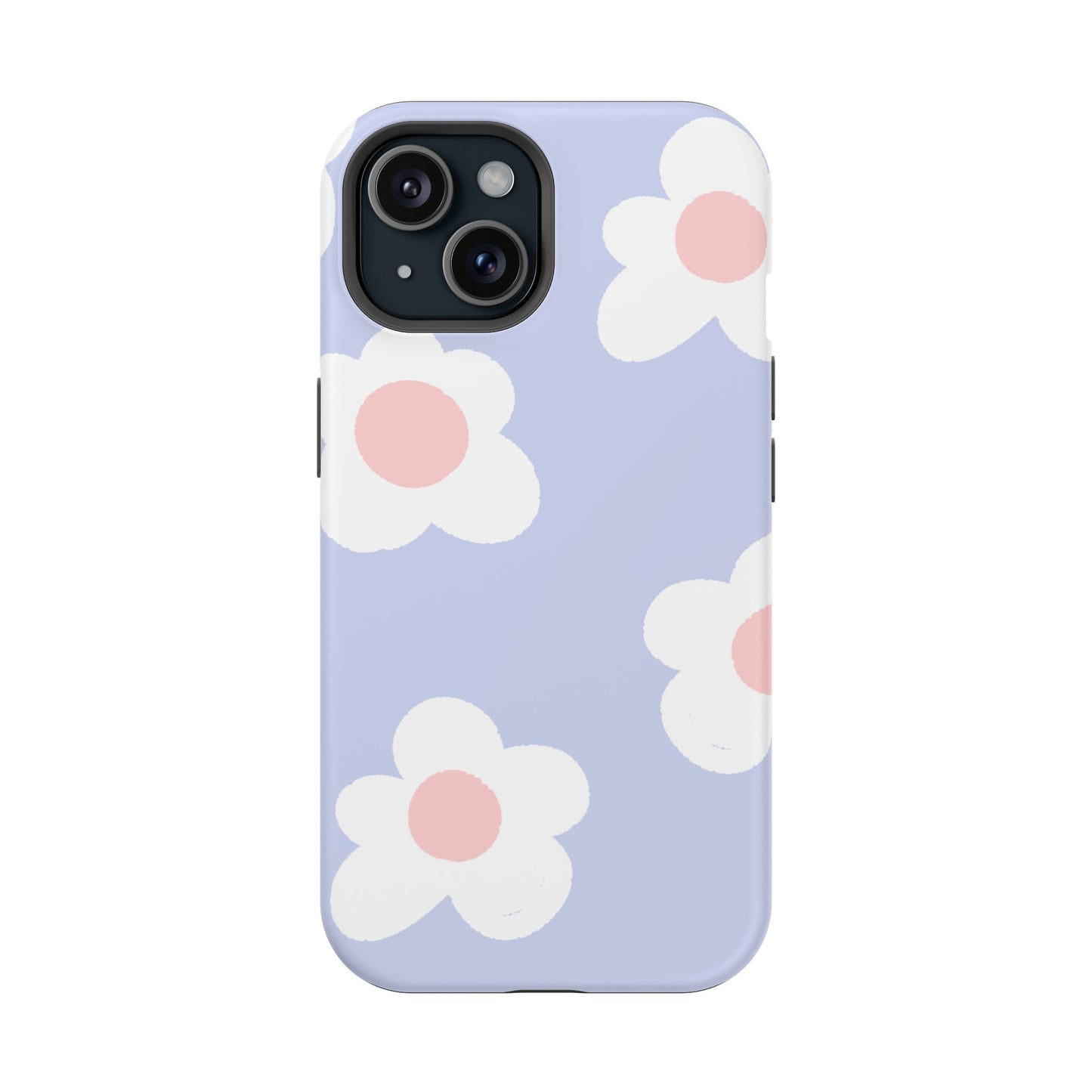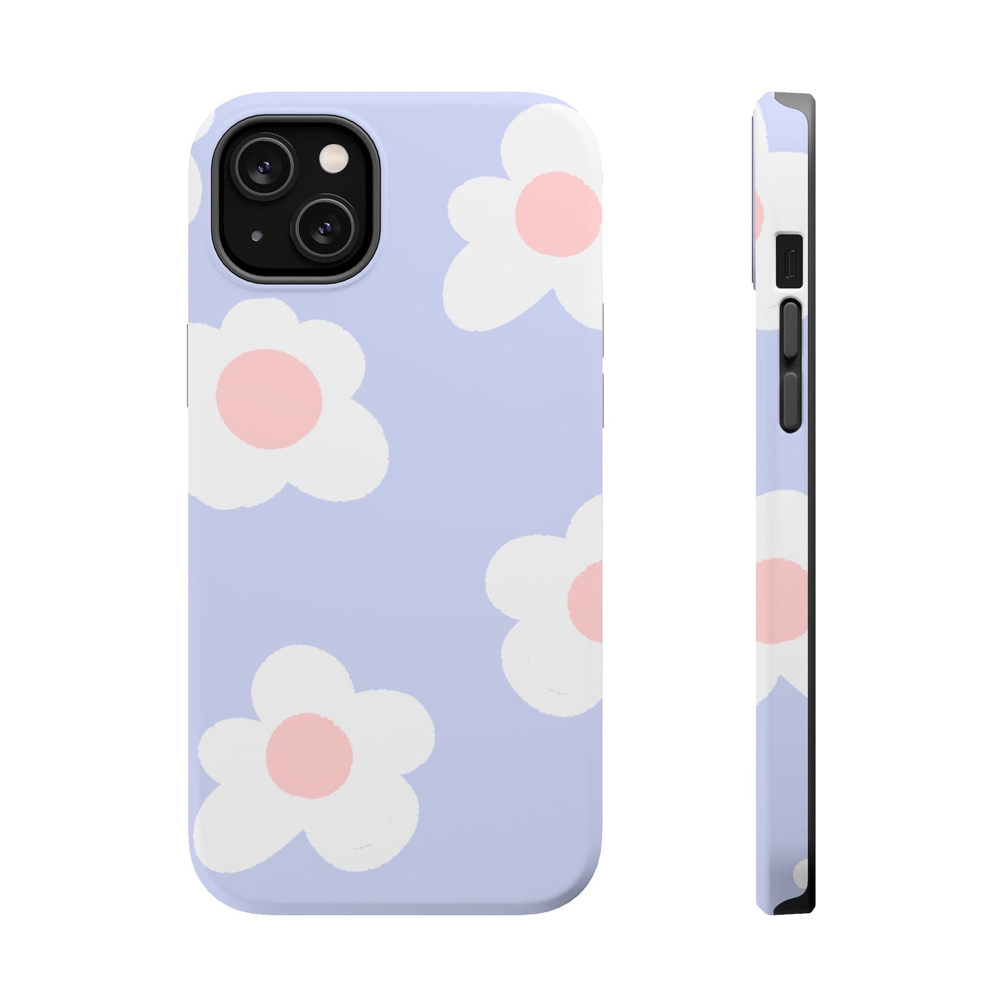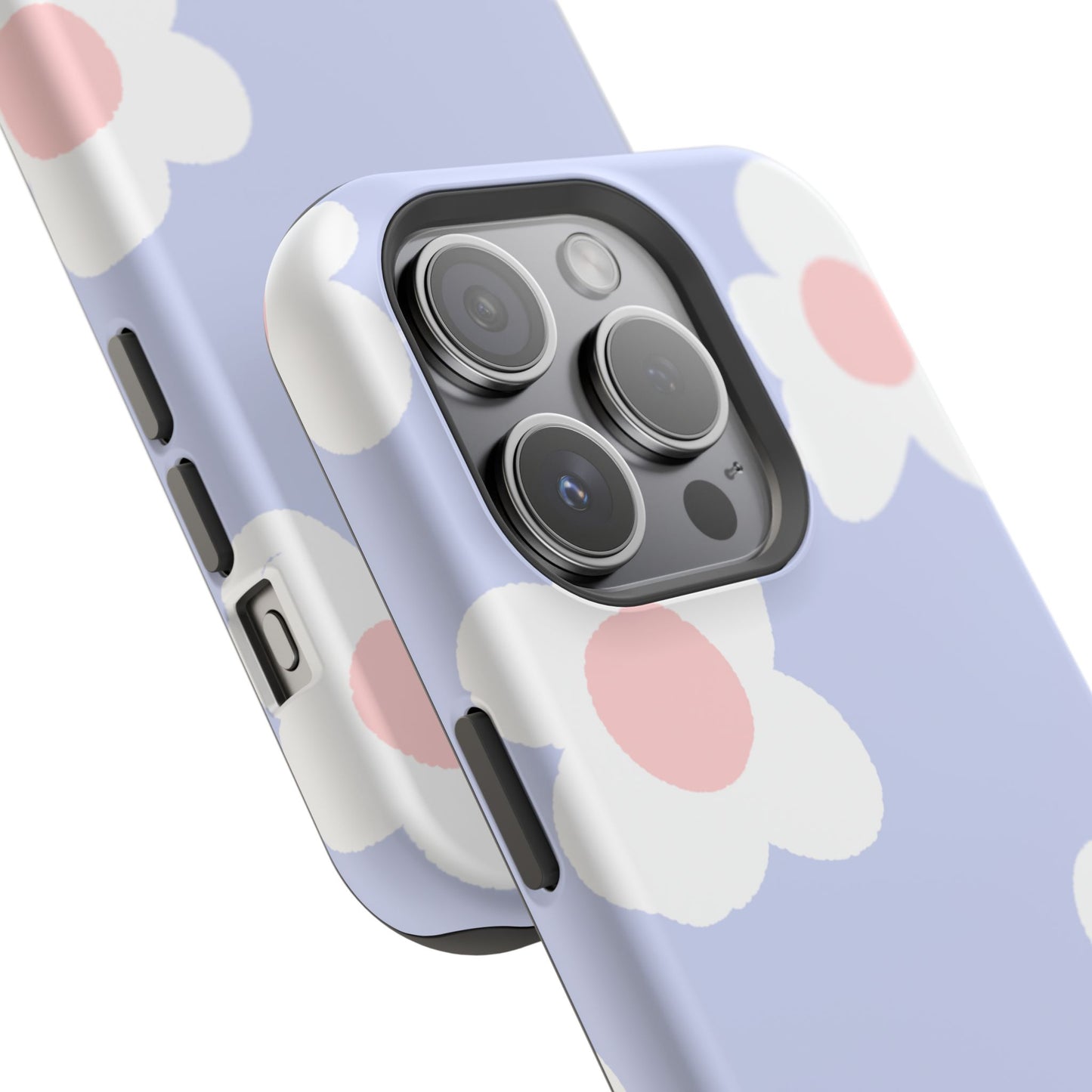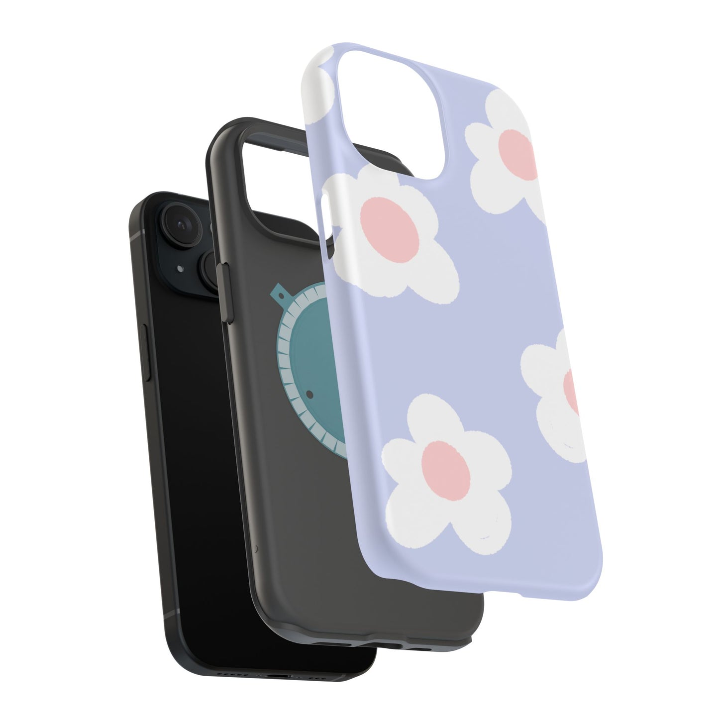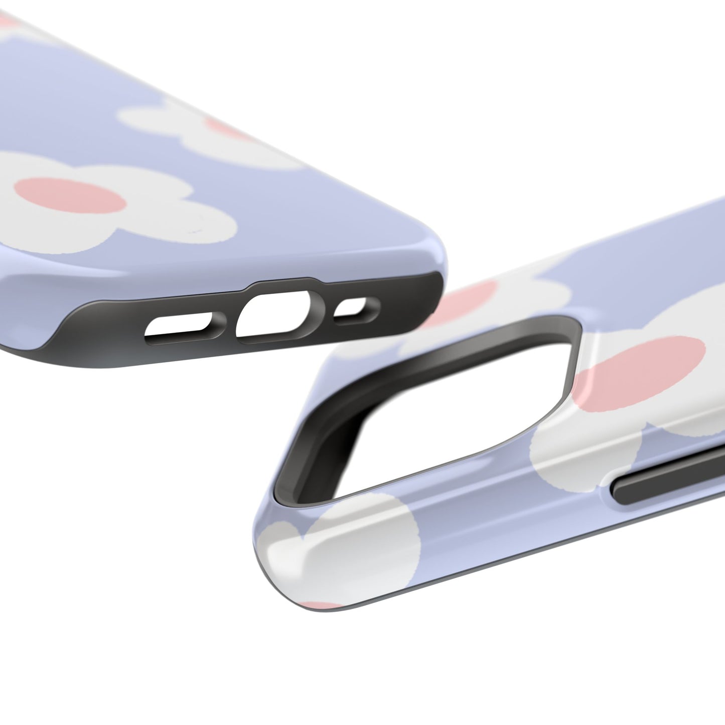 Add a playful retro vibe to your phone with our Retro Daisy Pastel Tough MagSafe iPhone Case. Featuring a charming pattern of hand-drawn white daisies with soft pink centers on a periwinkle blue background, this case evokes a sweet, nostalgic feel. Perfect for lovers of vintage-inspired design, it offers reliable protection with a dual-layer structure that guards against drops and bumps. The smooth matte finish enhances the daisy design while providing a comfortable, non-slip grip.