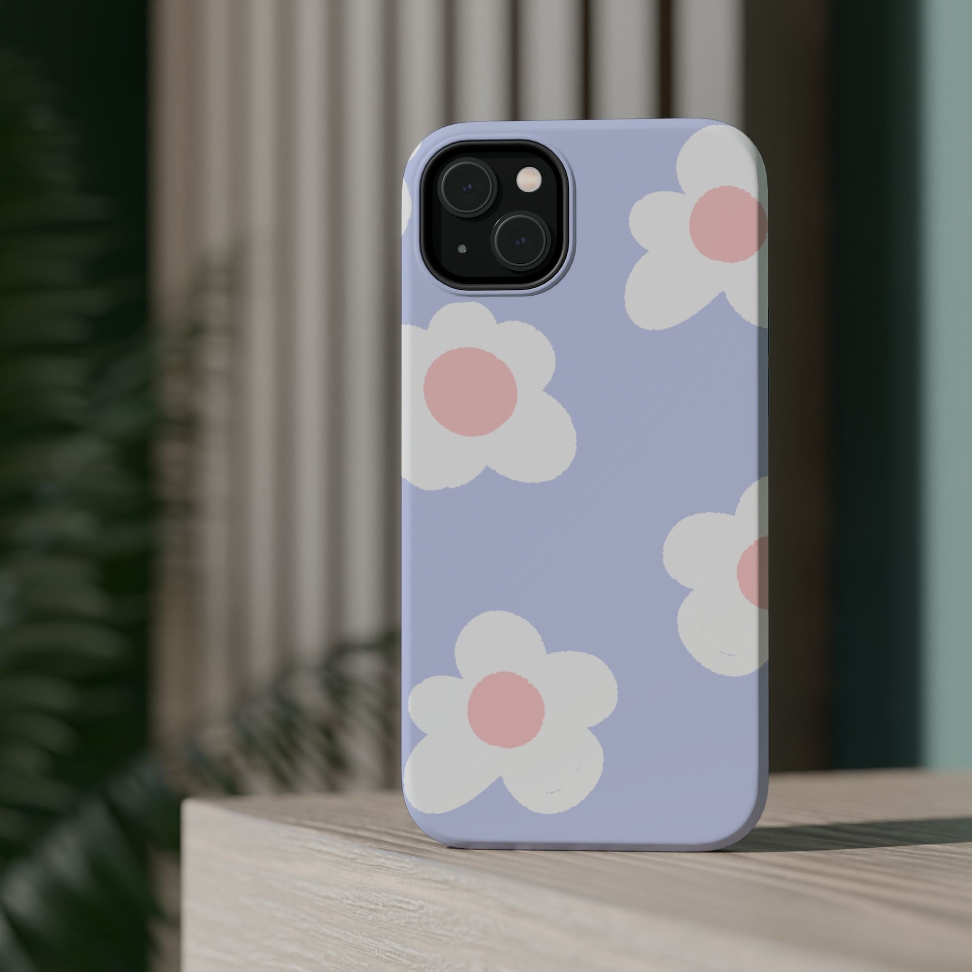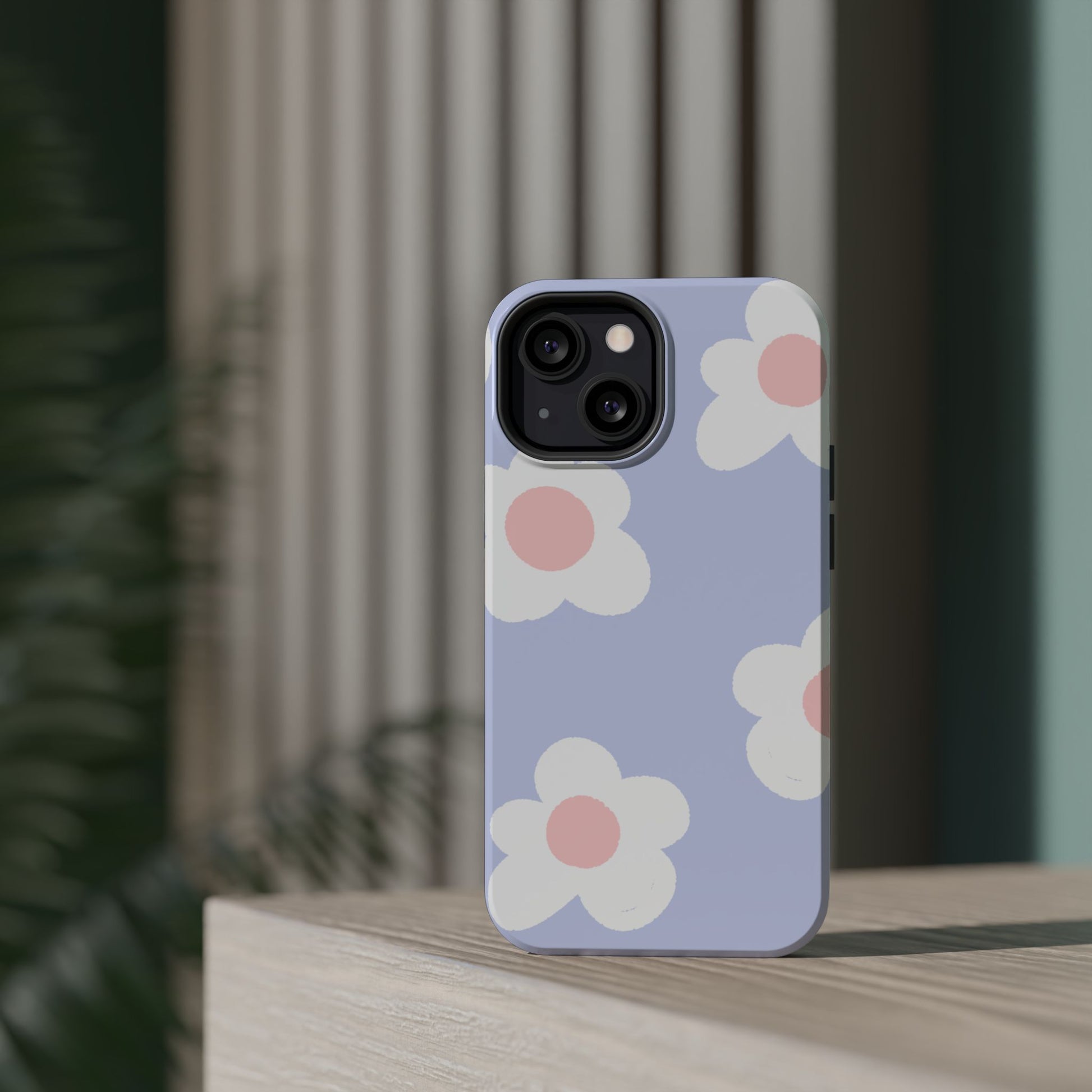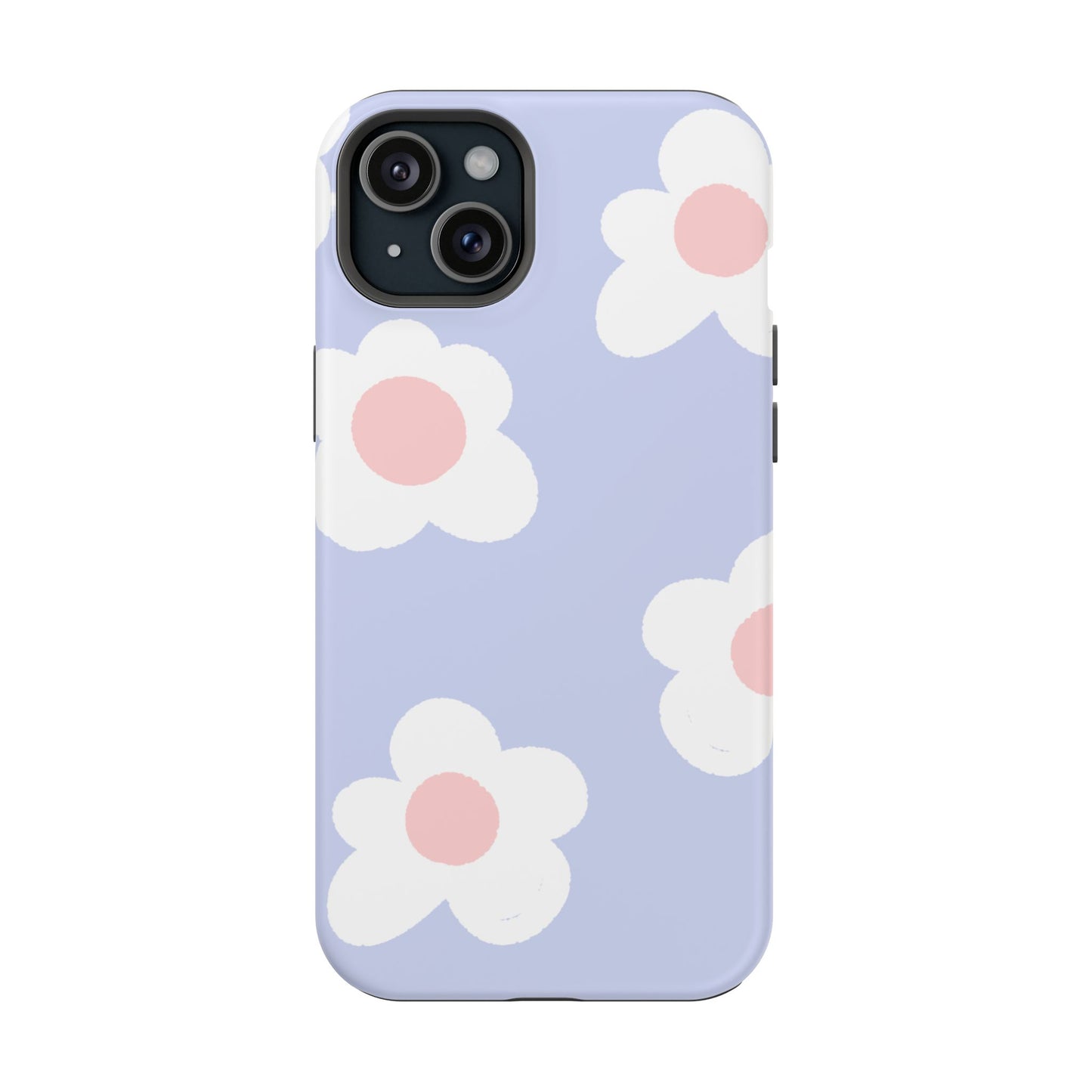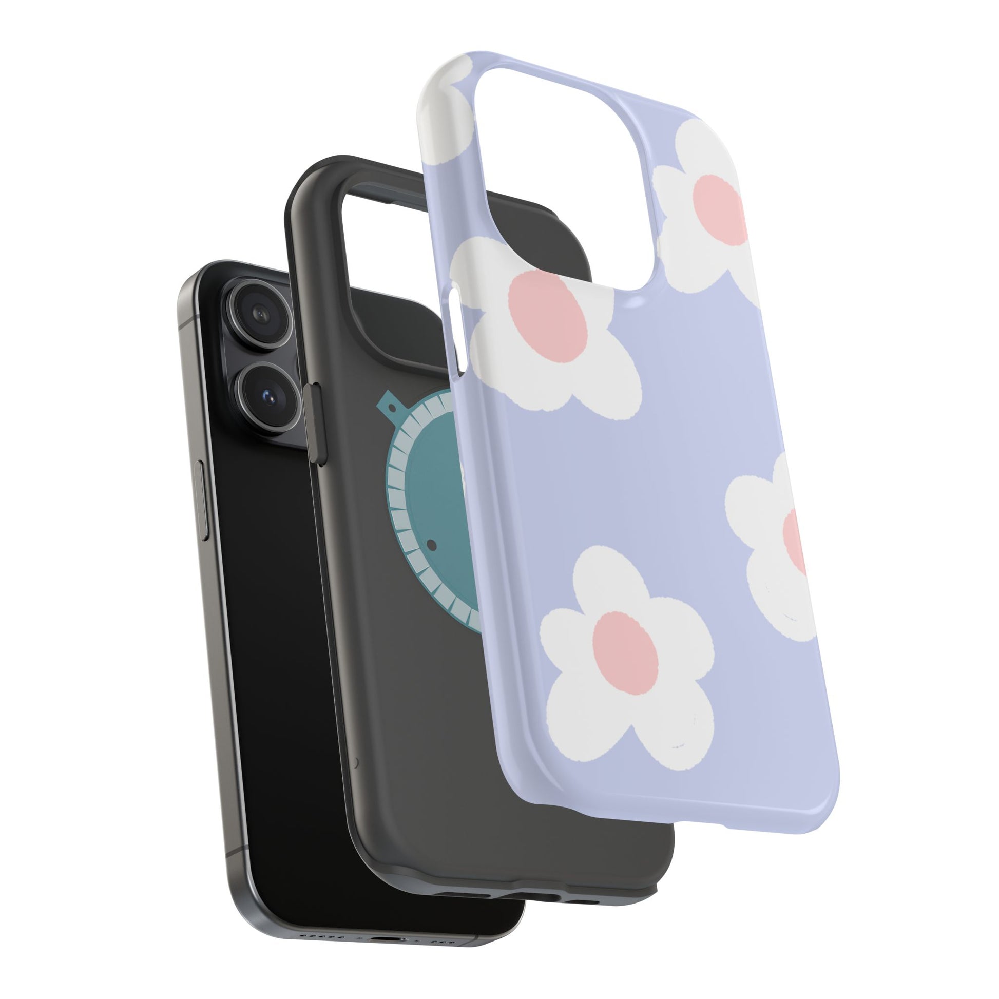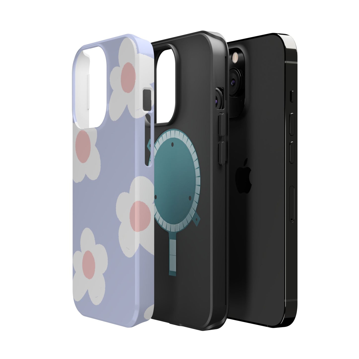 Add a playful retro vibe to your phone with our Retro Daisy Pastel Tough MagSafe iPhone Case. Featuring a charming pattern of hand-drawn white daisies with soft pink centers on a periwinkle blue background, this case evokes a sweet, nostalgic feel. Perfect for lovers of vintage-inspired design, it offers reliable protection with a dual-layer structure that guards against drops and bumps. The smooth matte finish enhances the daisy design while providing a comfortable, non-slip grip.