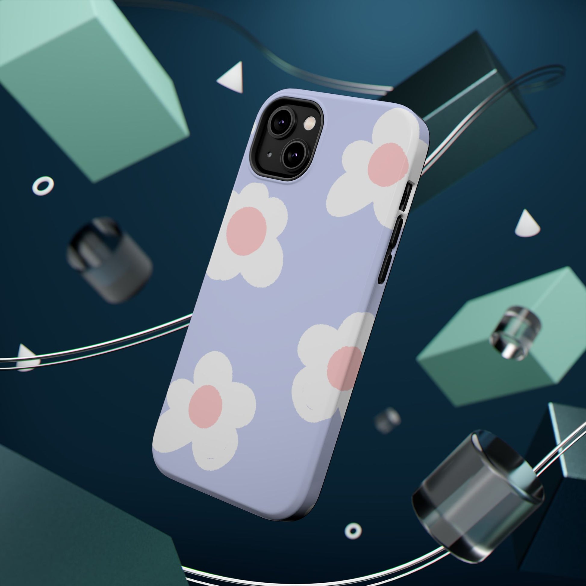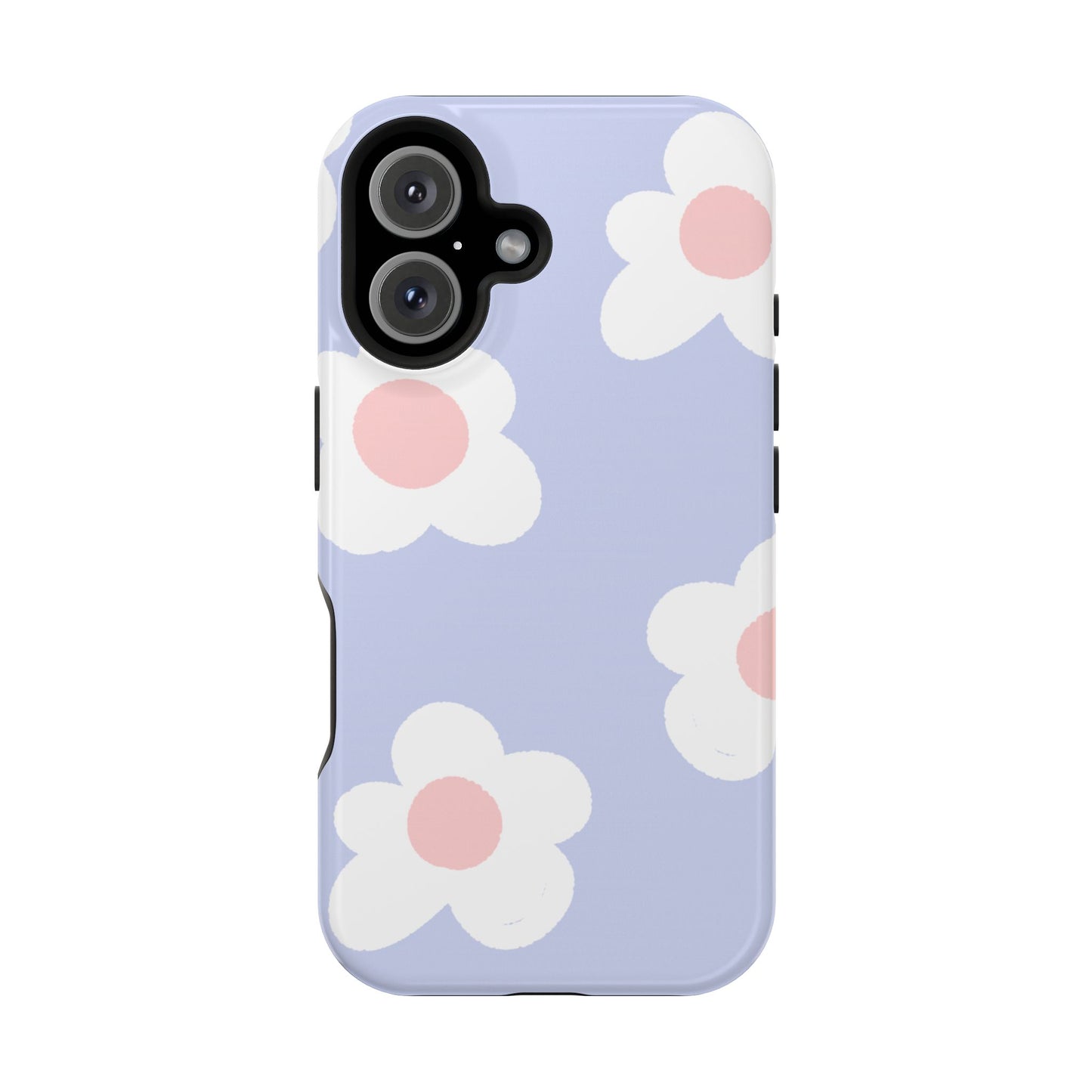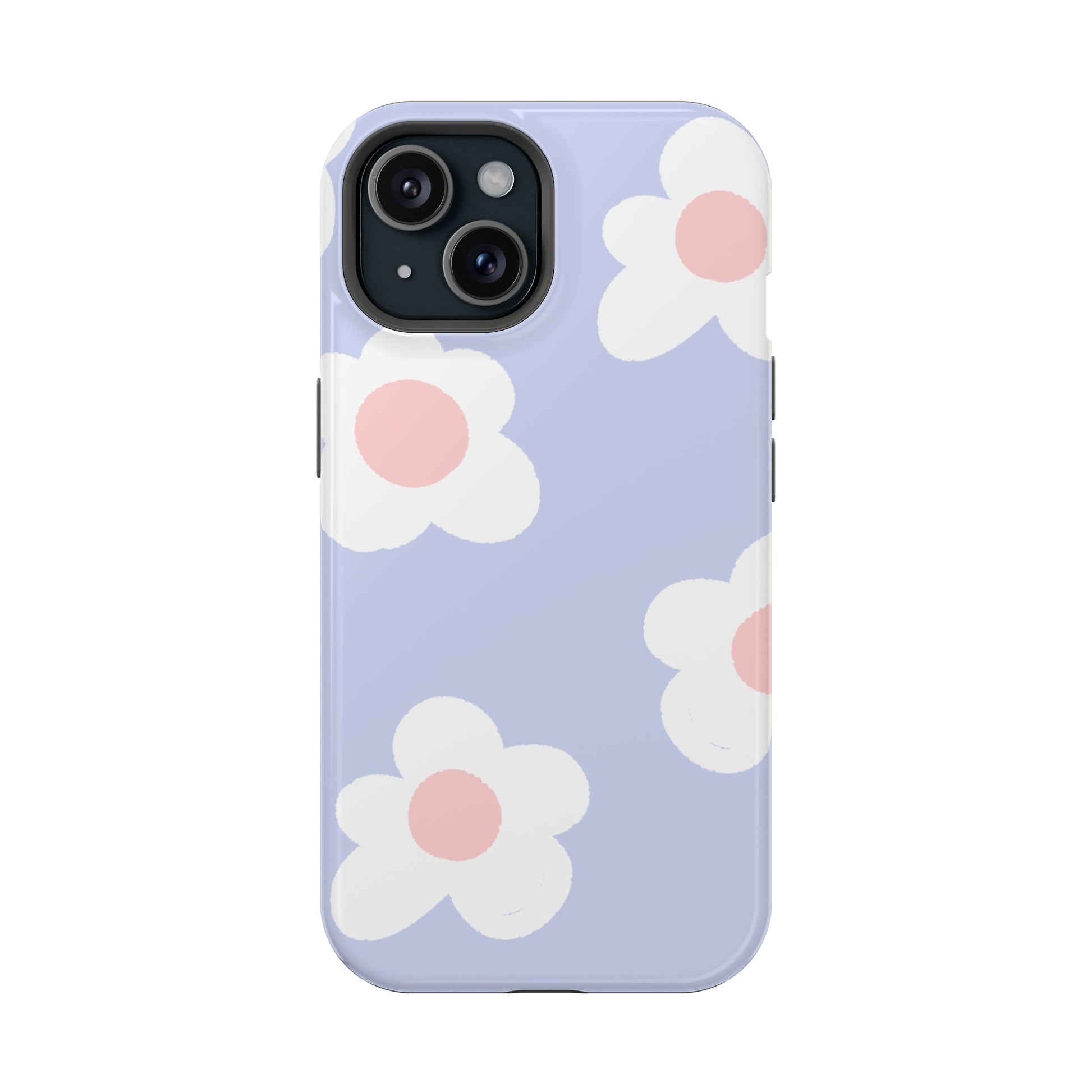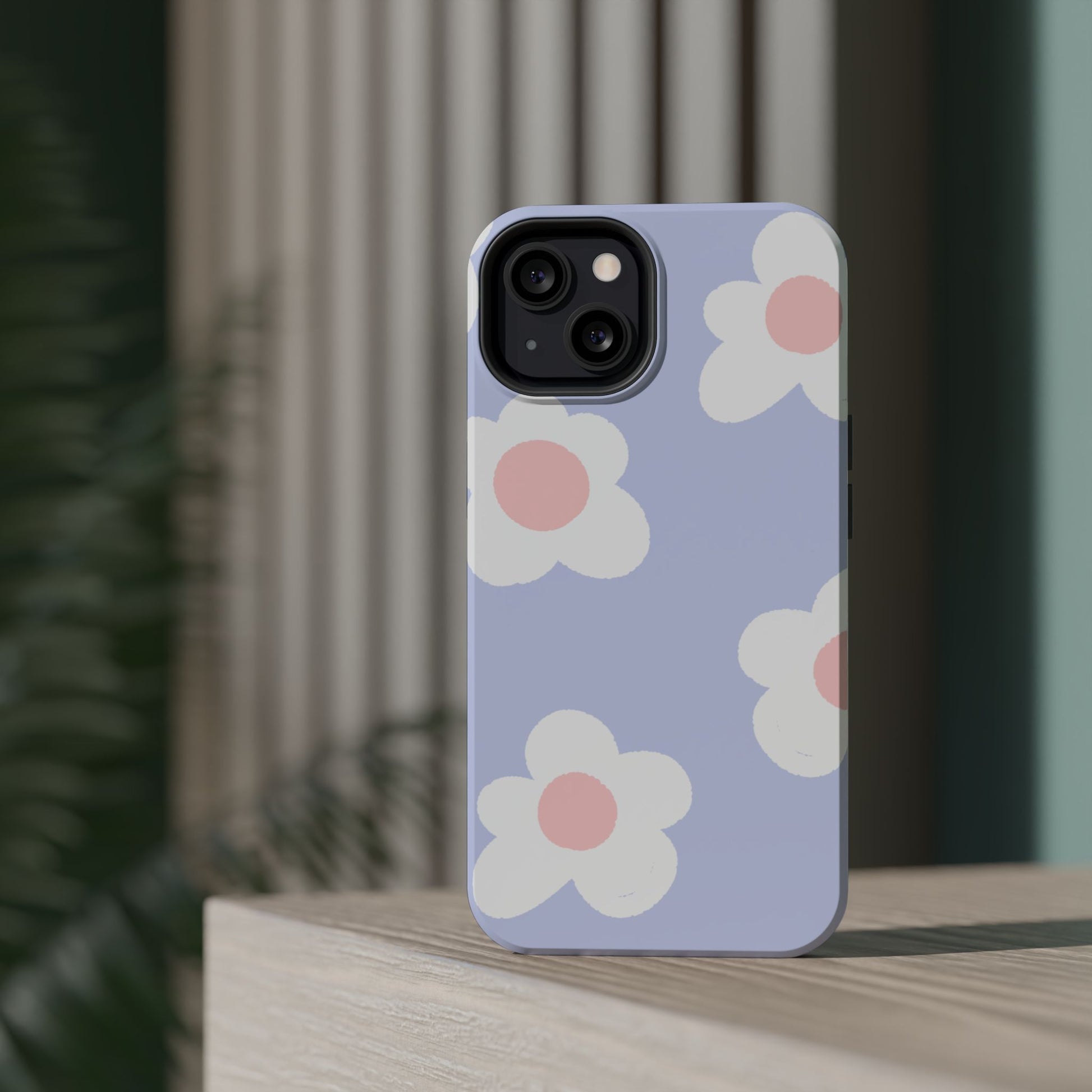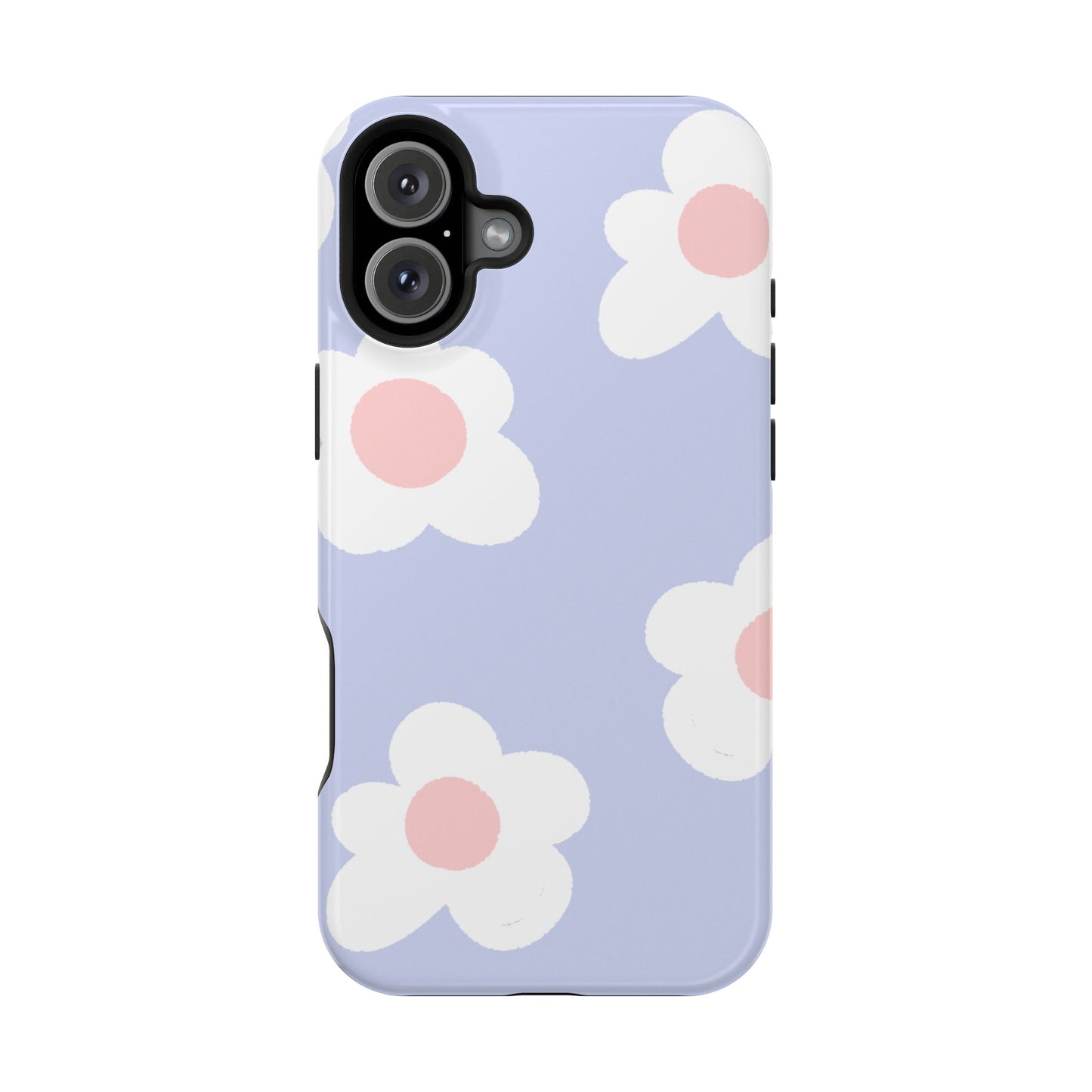 Add a playful retro vibe to your phone with our Retro Daisy Pastel Tough MagSafe iPhone Case. Featuring a charming pattern of hand-drawn white daisies with soft pink centers on a periwinkle blue background, this case evokes a sweet, nostalgic feel. Perfect for lovers of vintage-inspired design, it offers reliable protection with a dual-layer structure that guards against drops and bumps. The smooth matte finish enhances the daisy design while providing a comfortable, non-slip grip.