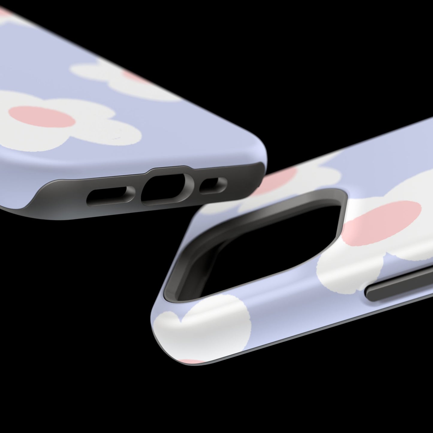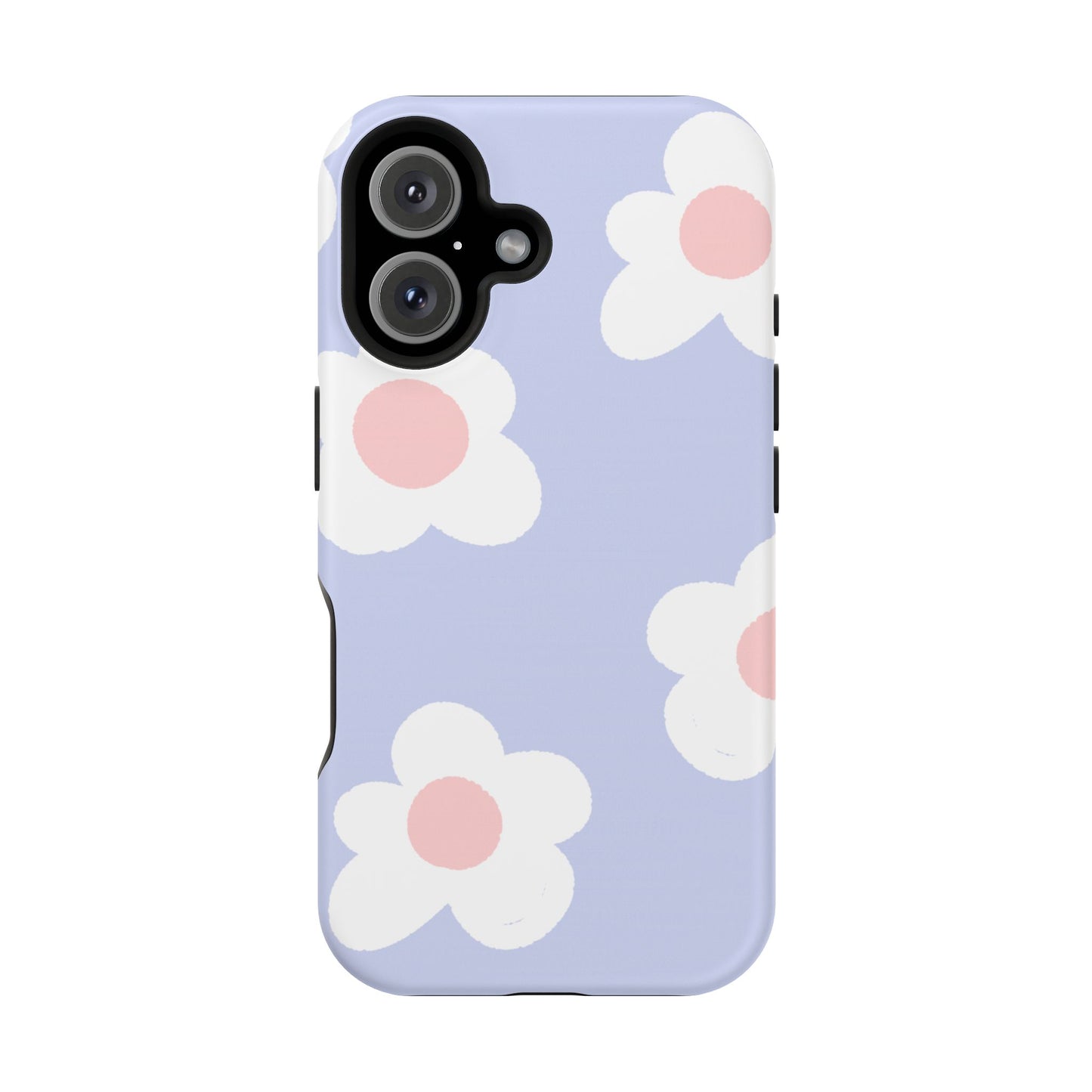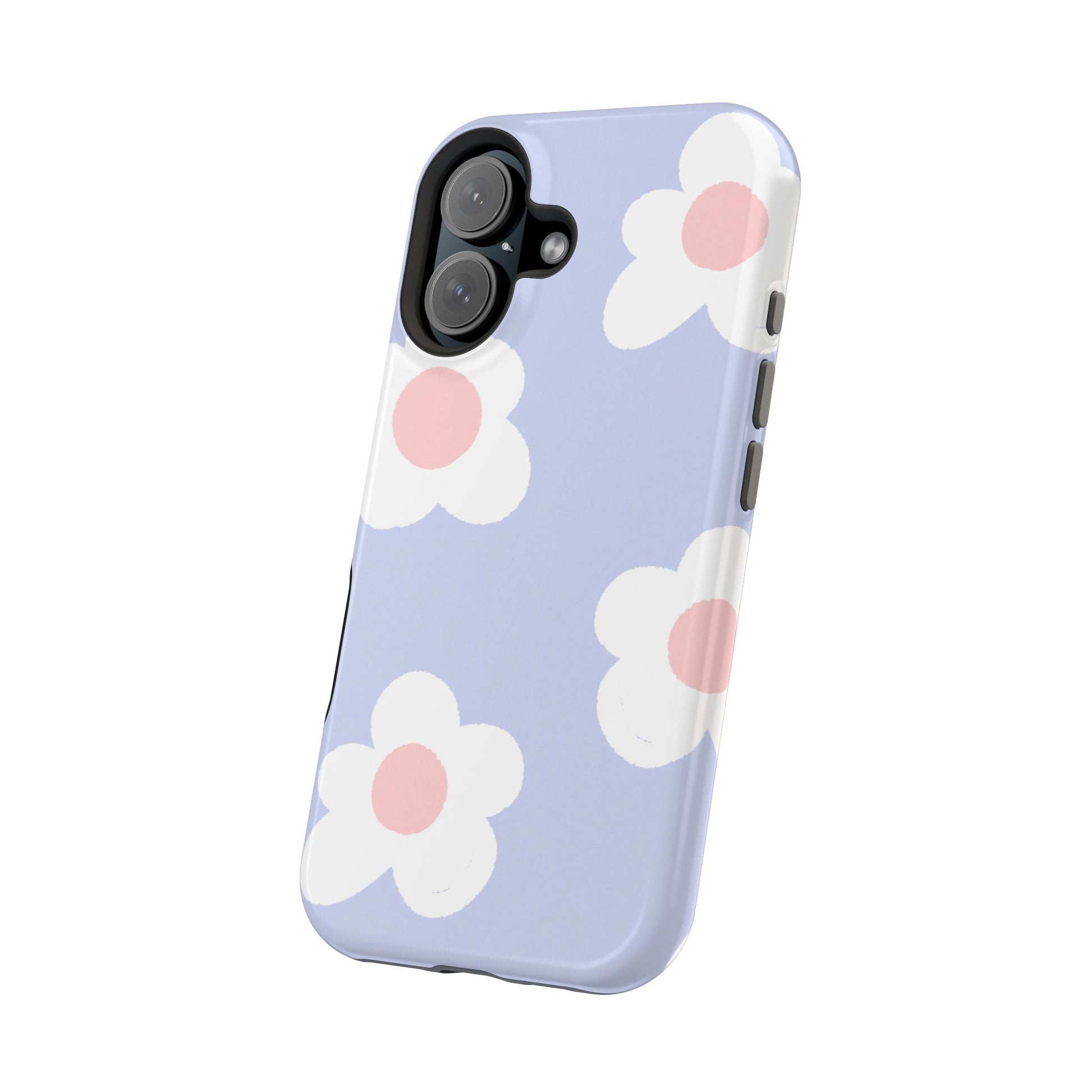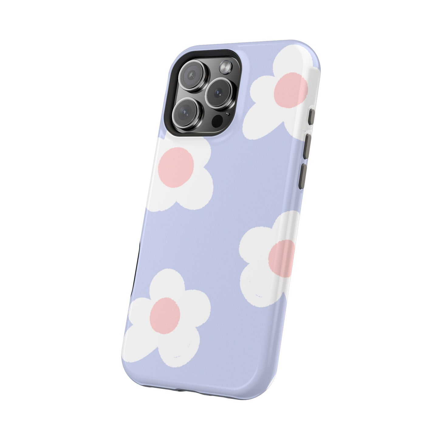 Add a playful retro vibe to your phone with our Retro Daisy Pastel Tough MagSafe iPhone Case. Featuring a charming pattern of hand-drawn white daisies with soft pink centers on a periwinkle blue background, this case evokes a sweet, nostalgic feel. Perfect for lovers of vintage-inspired design, it offers reliable protection with a dual-layer structure that guards against drops and bumps. The smooth matte finish enhances the daisy design while providing a comfortable, non-slip grip.