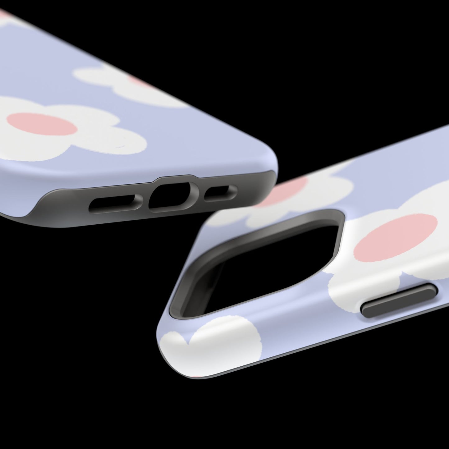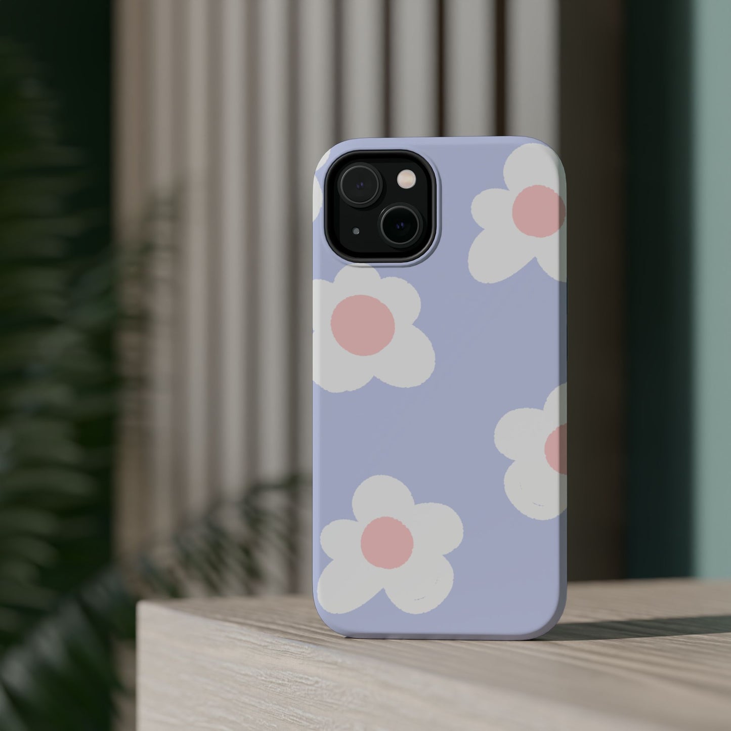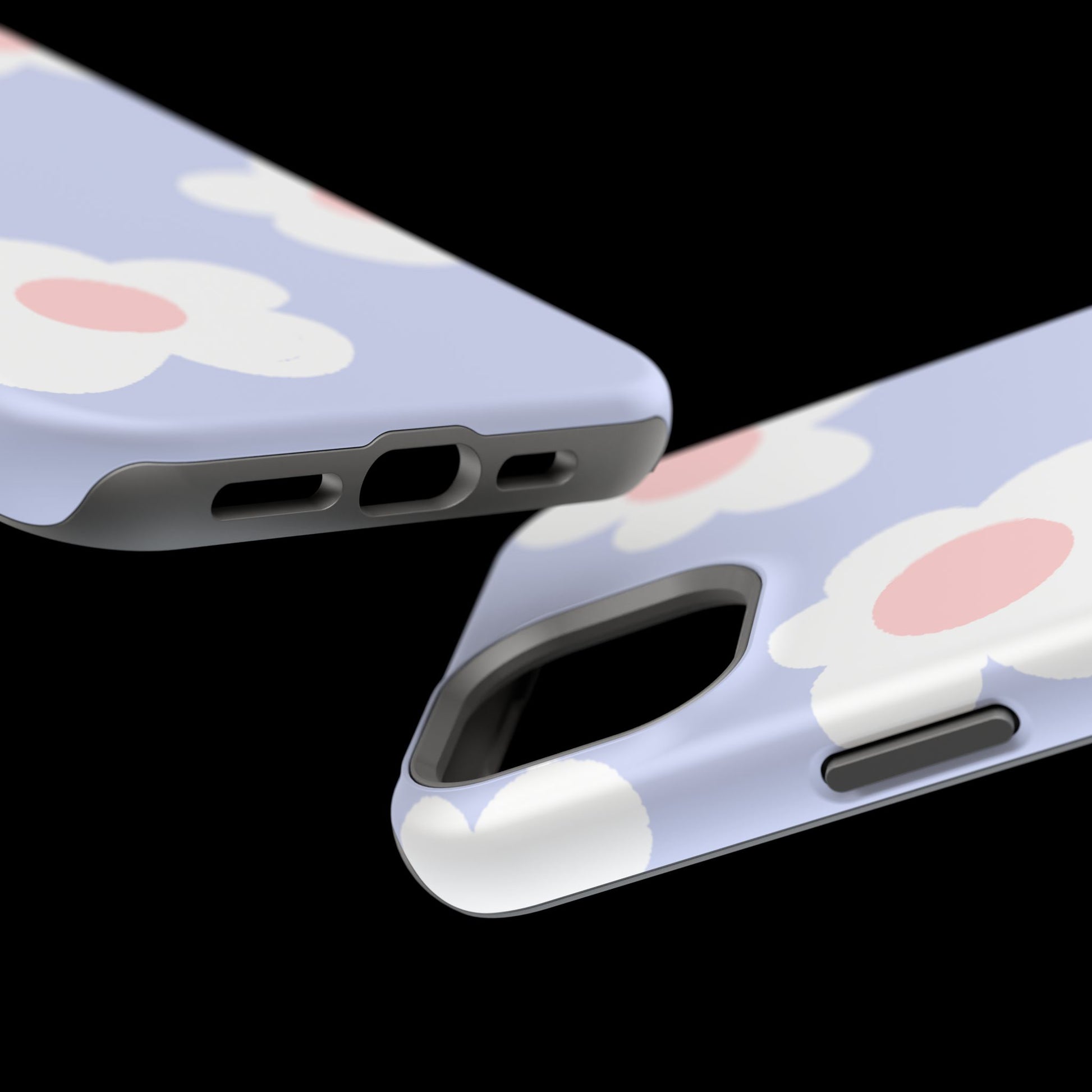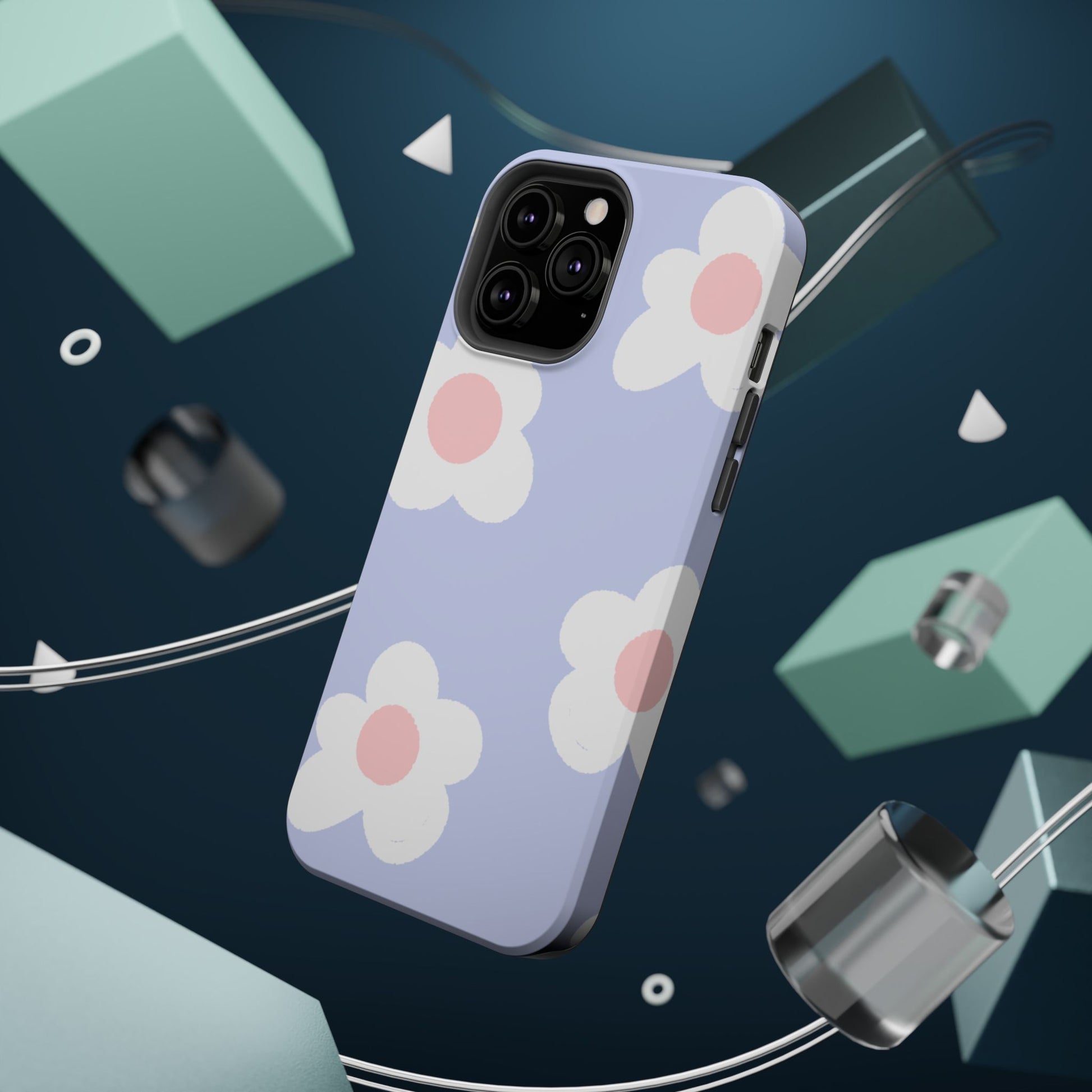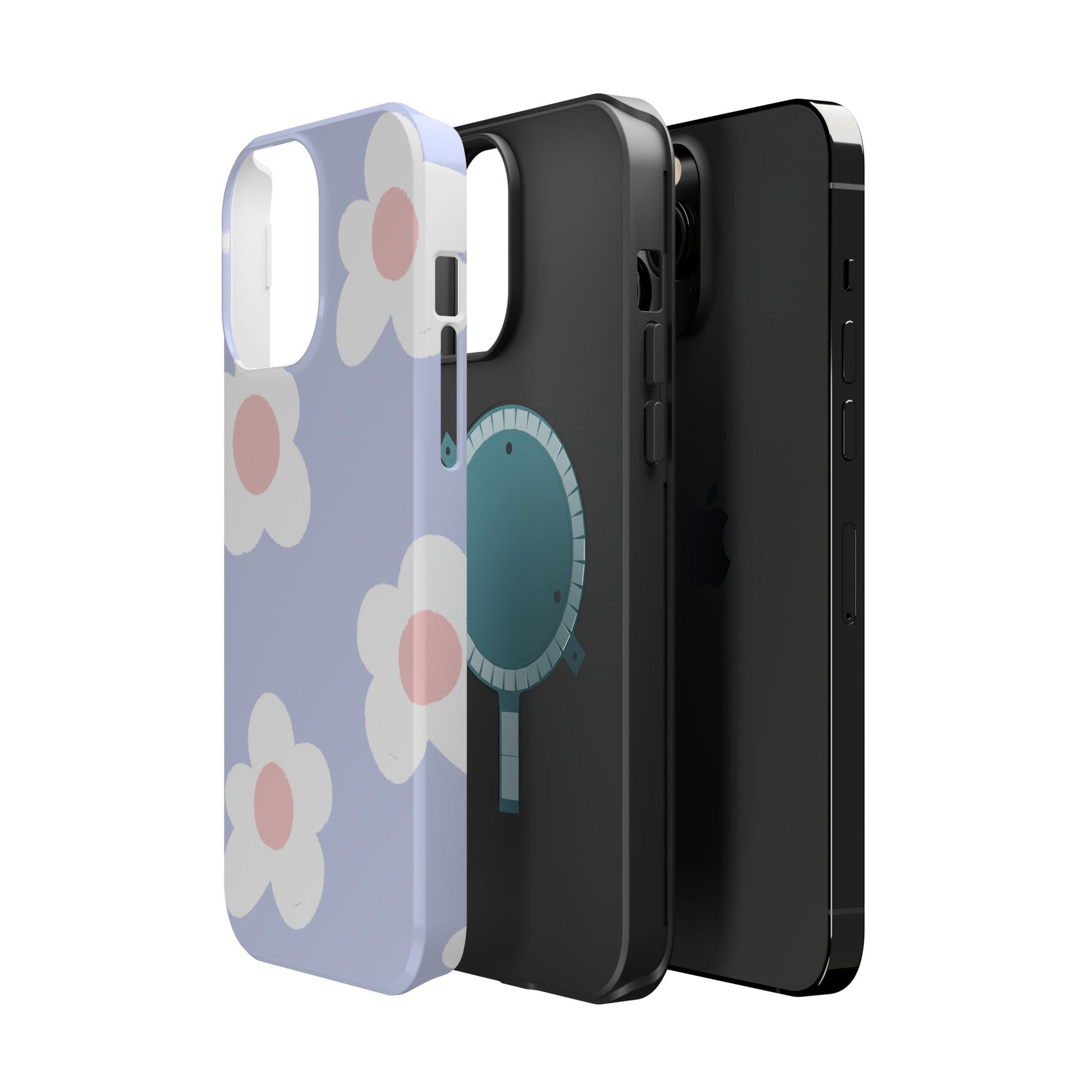 Add a playful retro vibe to your phone with our Retro Daisy Pastel Tough MagSafe iPhone Case. Featuring a charming pattern of hand-drawn white daisies with soft pink centers on a periwinkle blue background, this case evokes a sweet, nostalgic feel. Perfect for lovers of vintage-inspired design, it offers reliable protection with a dual-layer structure that guards against drops and bumps. The smooth matte finish enhances the daisy design while providing a comfortable, non-slip grip.