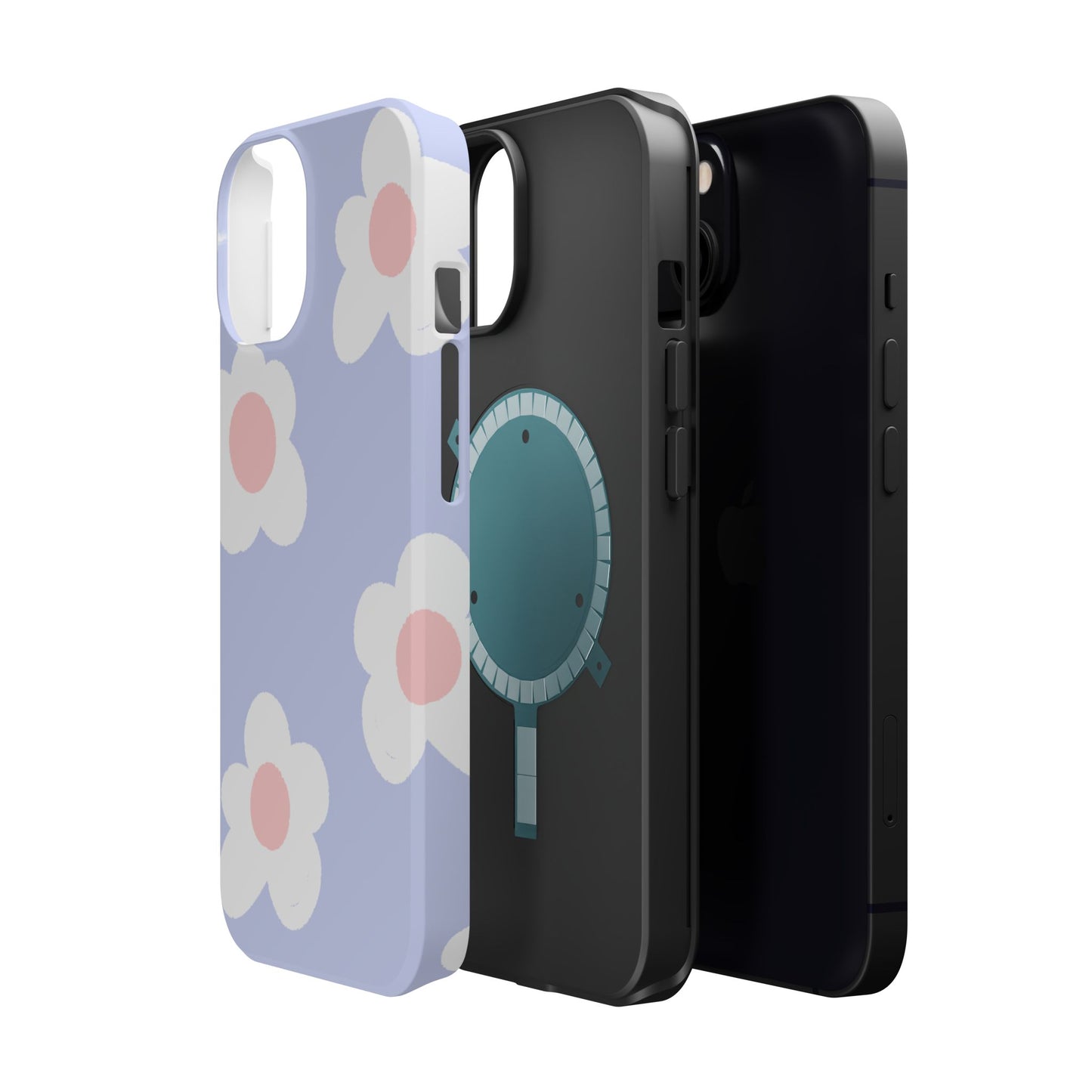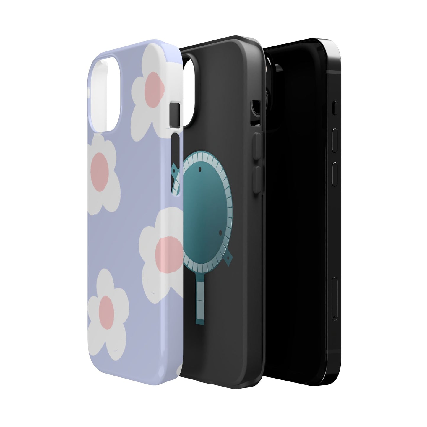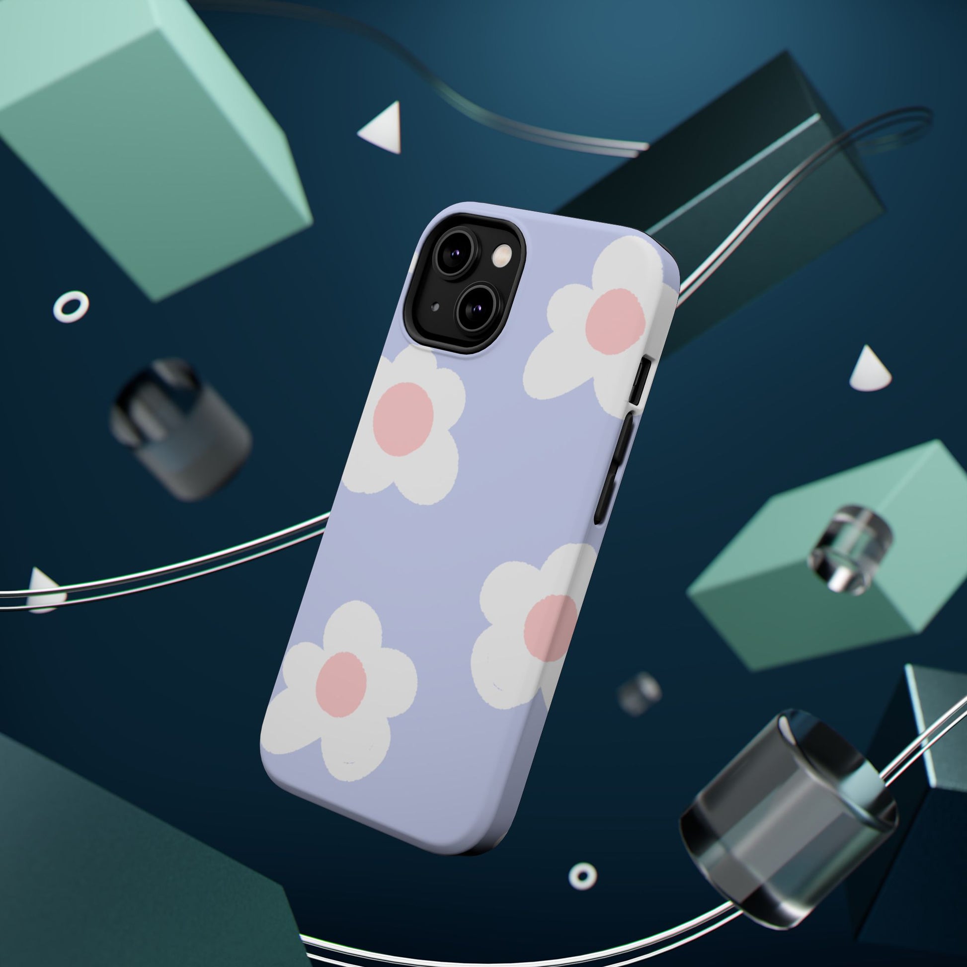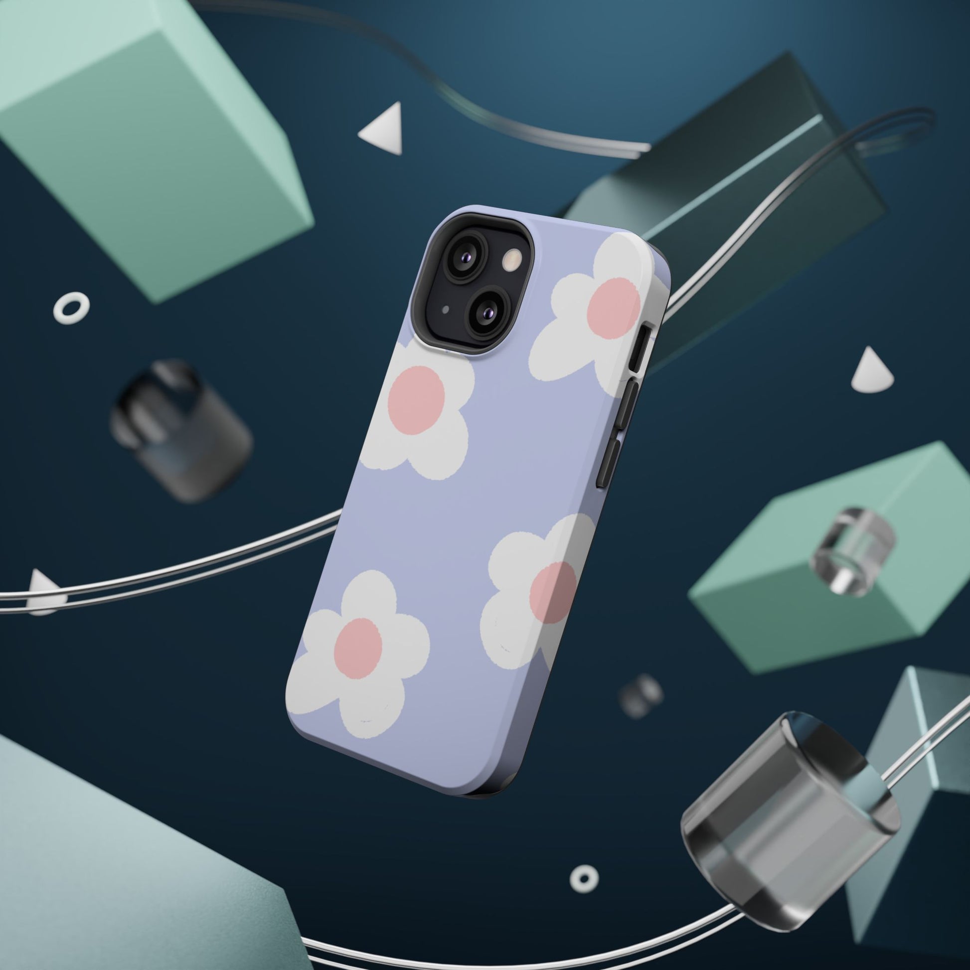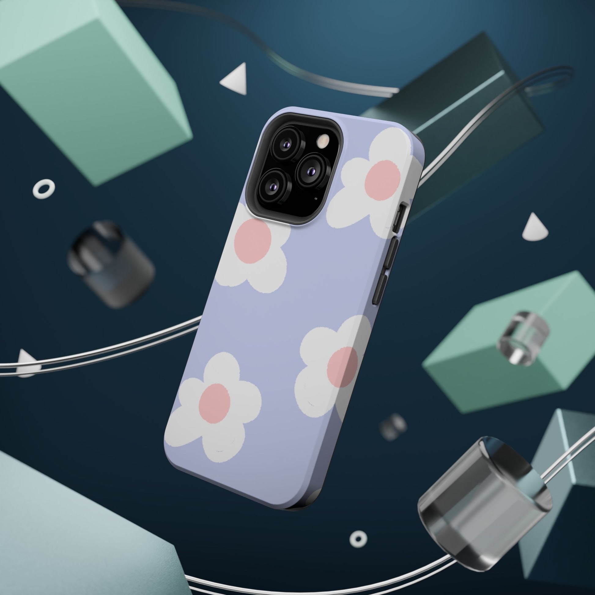 Add a playful retro vibe to your phone with our Retro Daisy Pastel Tough MagSafe iPhone Case. Featuring a charming pattern of hand-drawn white daisies with soft pink centers on a periwinkle blue background, this case evokes a sweet, nostalgic feel. Perfect for lovers of vintage-inspired design, it offers reliable protection with a dual-layer structure that guards against drops and bumps. The smooth matte finish enhances the daisy design while providing a comfortable, non-slip grip.
