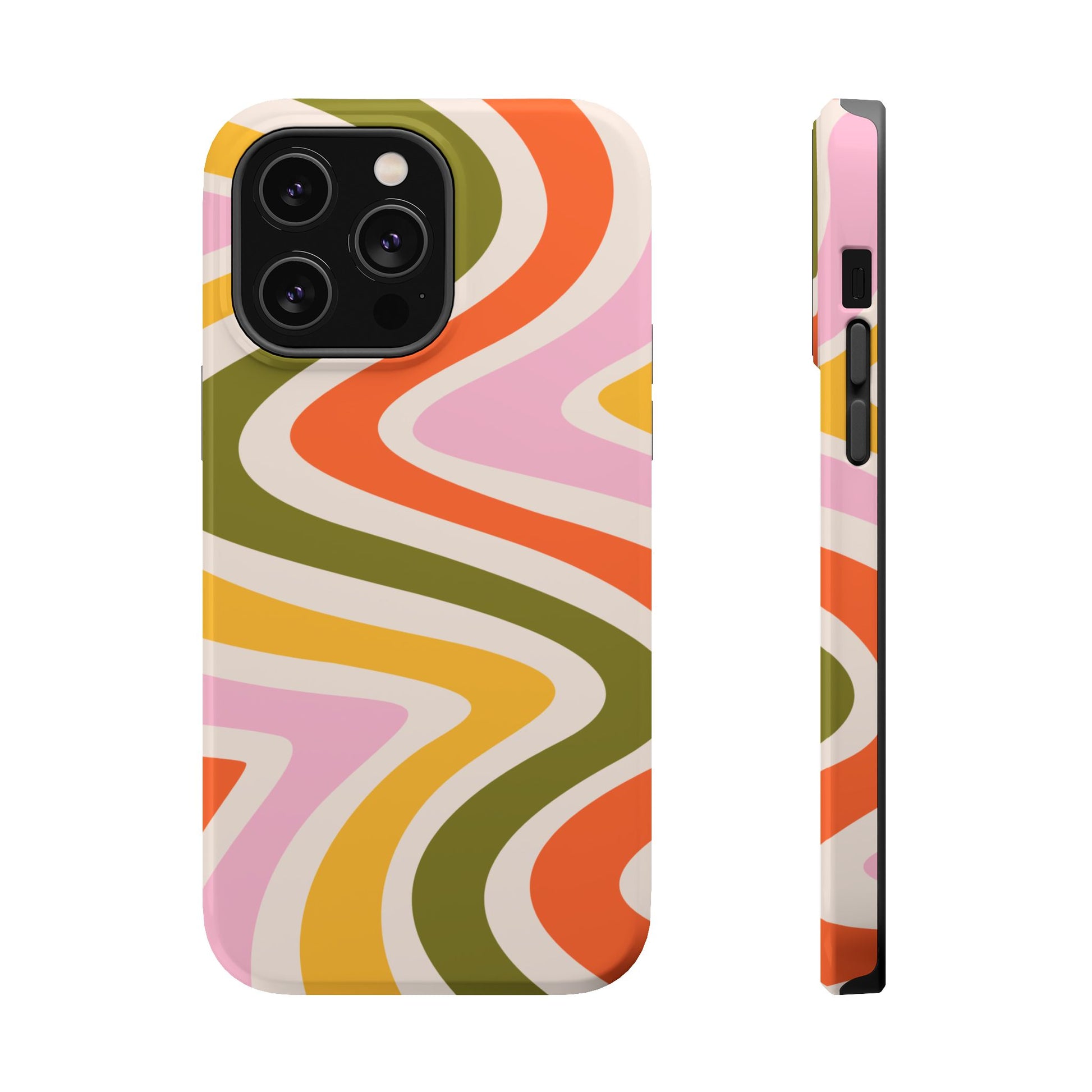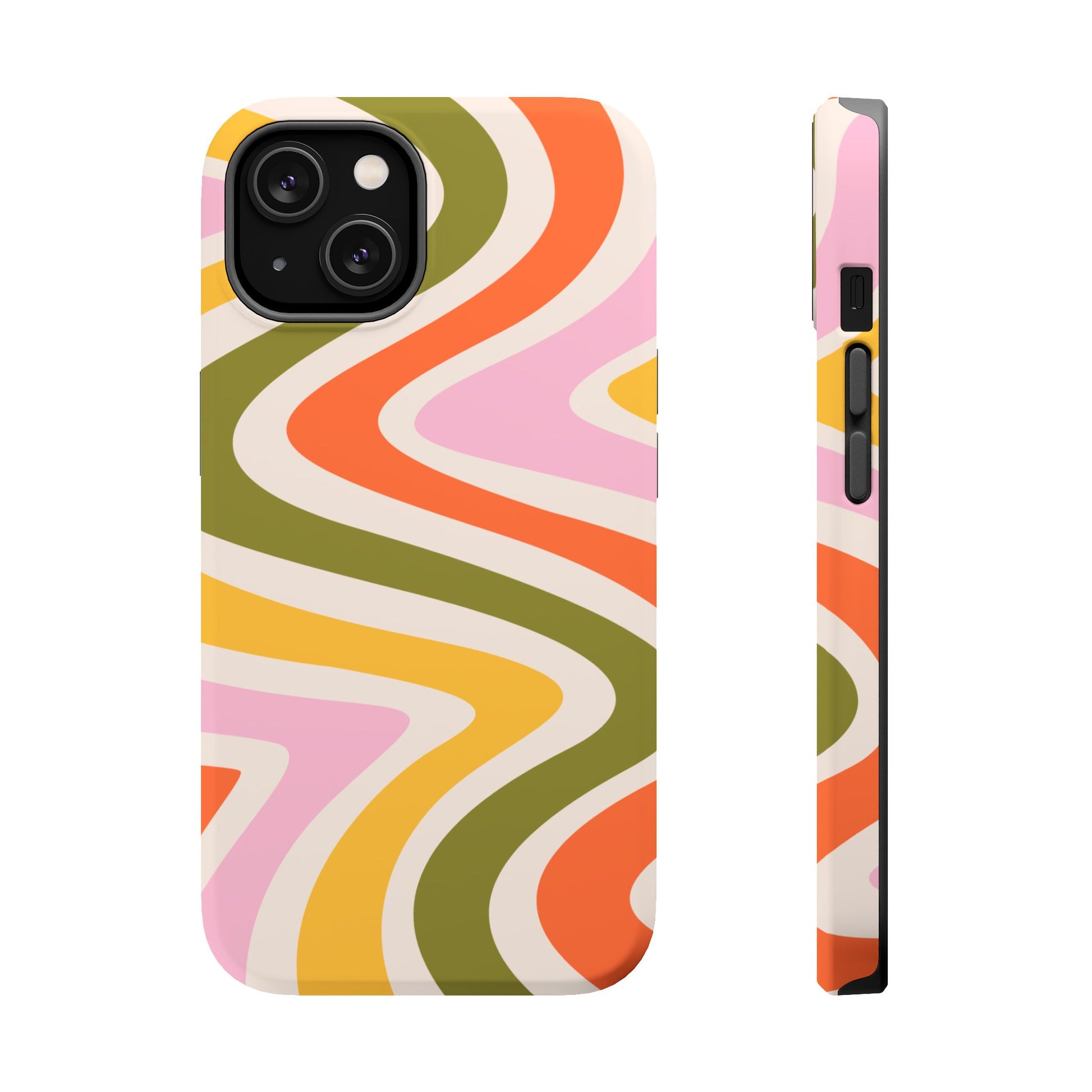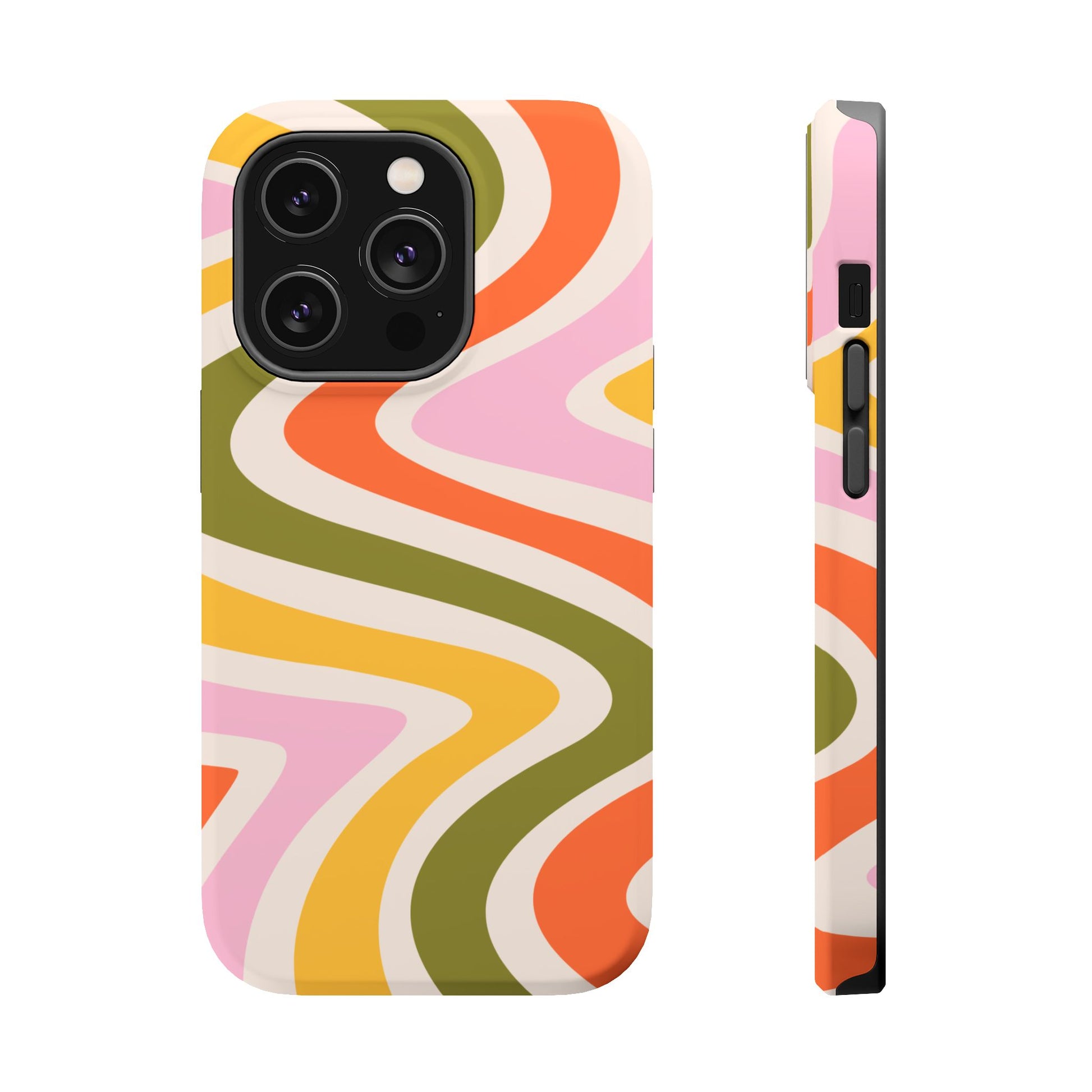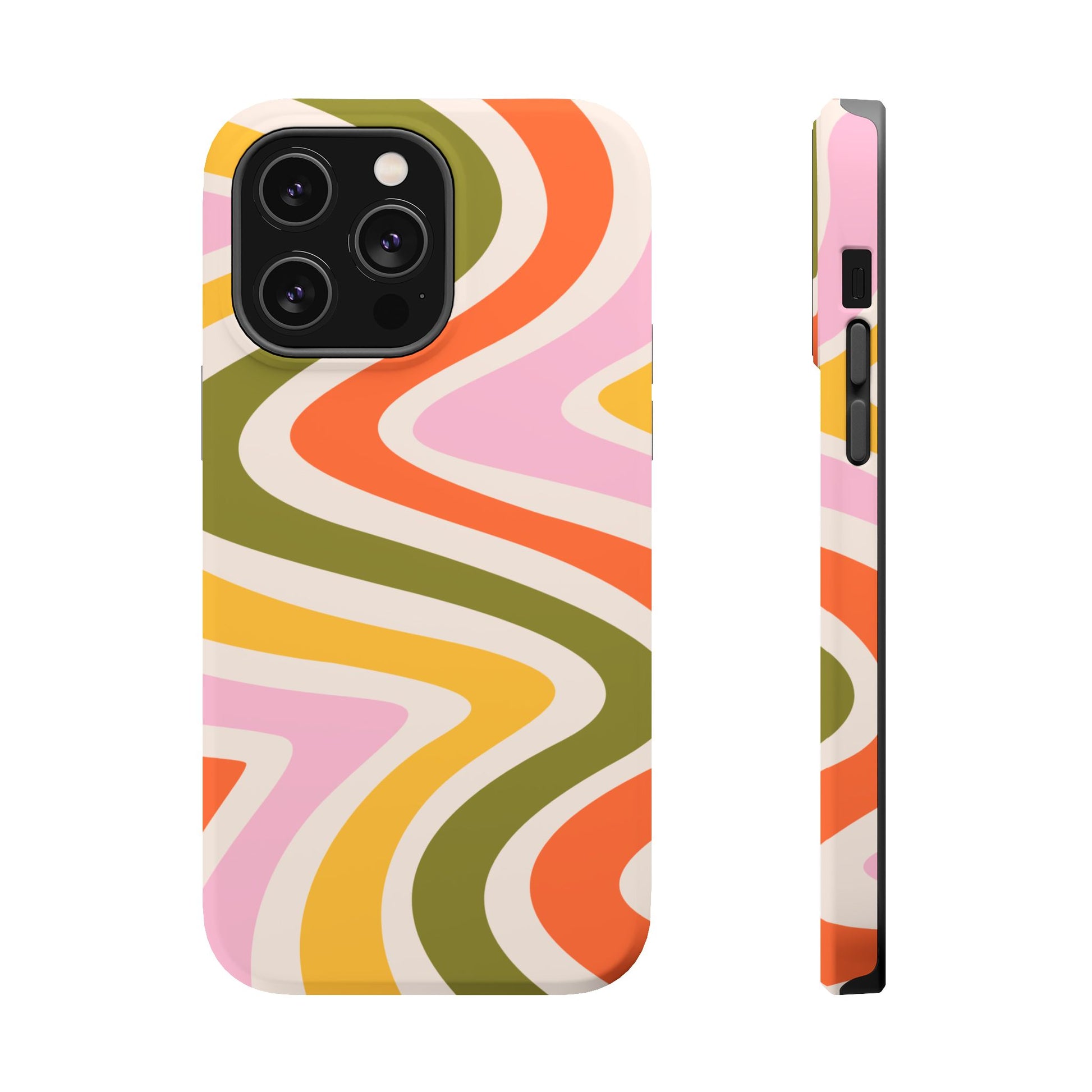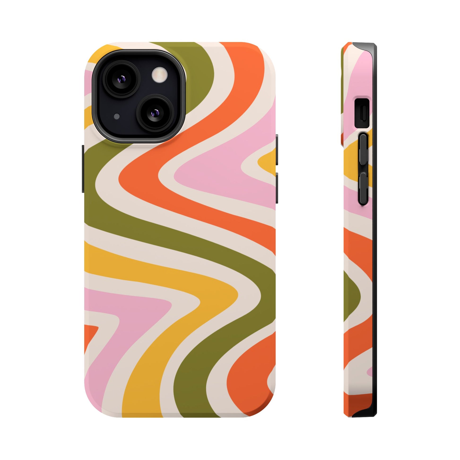 Groove in style with our Retro Groove MagSafe  iPhone Case, featuring a wavy, free-flowing design in warm orange, mustard yellow, olive green, and soft pink tones. This 70s-inspired pattern exudes nostalgic vibes, making it the perfect accessory for those who love vintage style with a modern twist. Built with dual-layer protection, this case combines a sturdy polycarbonate outer shell with a shock-absorbent TPU layer to keep your phone safe from drops and everyday wear.