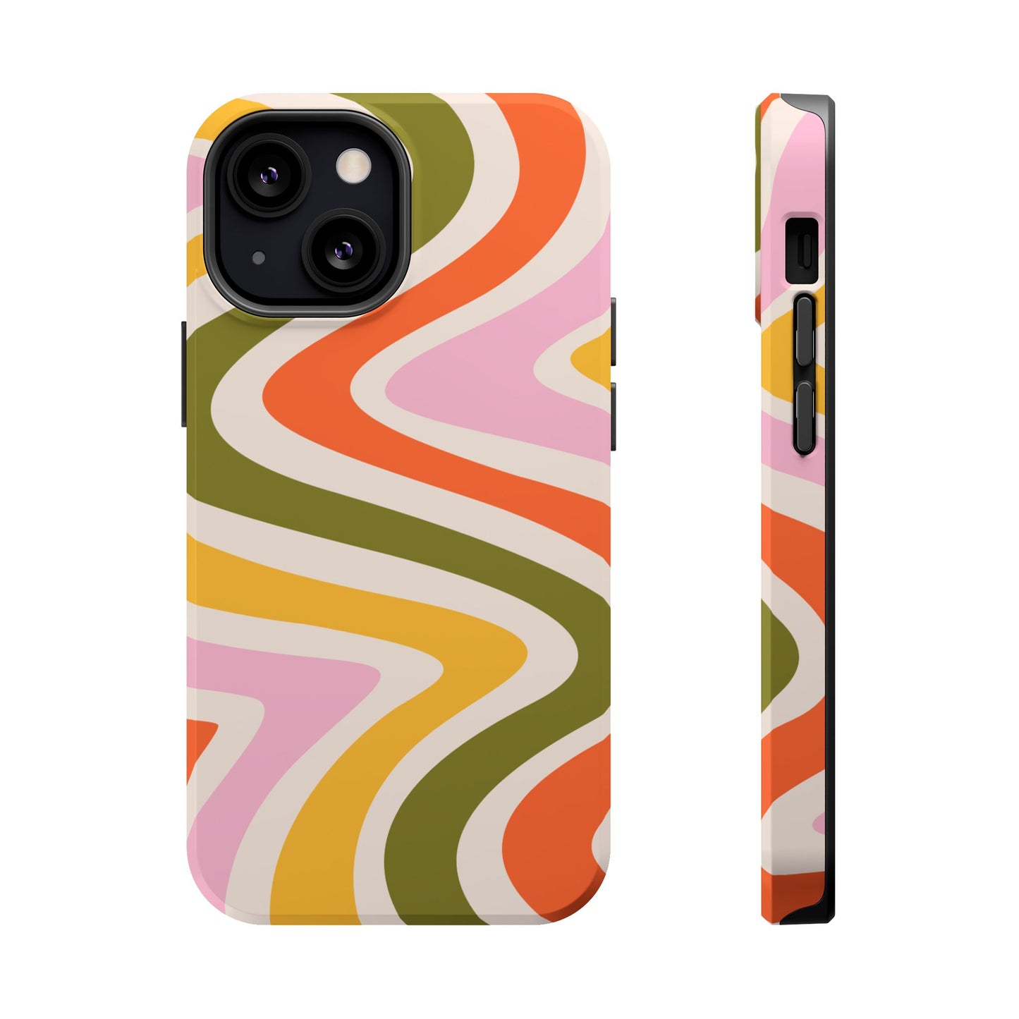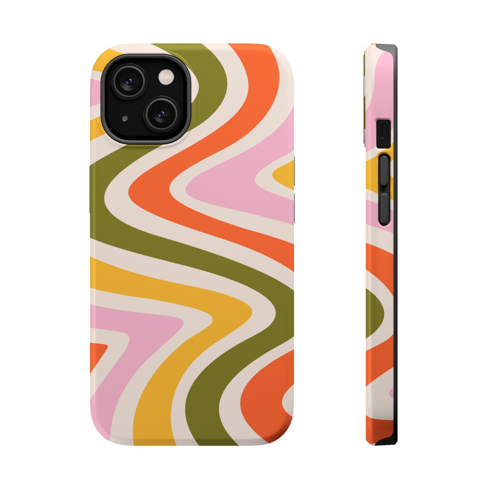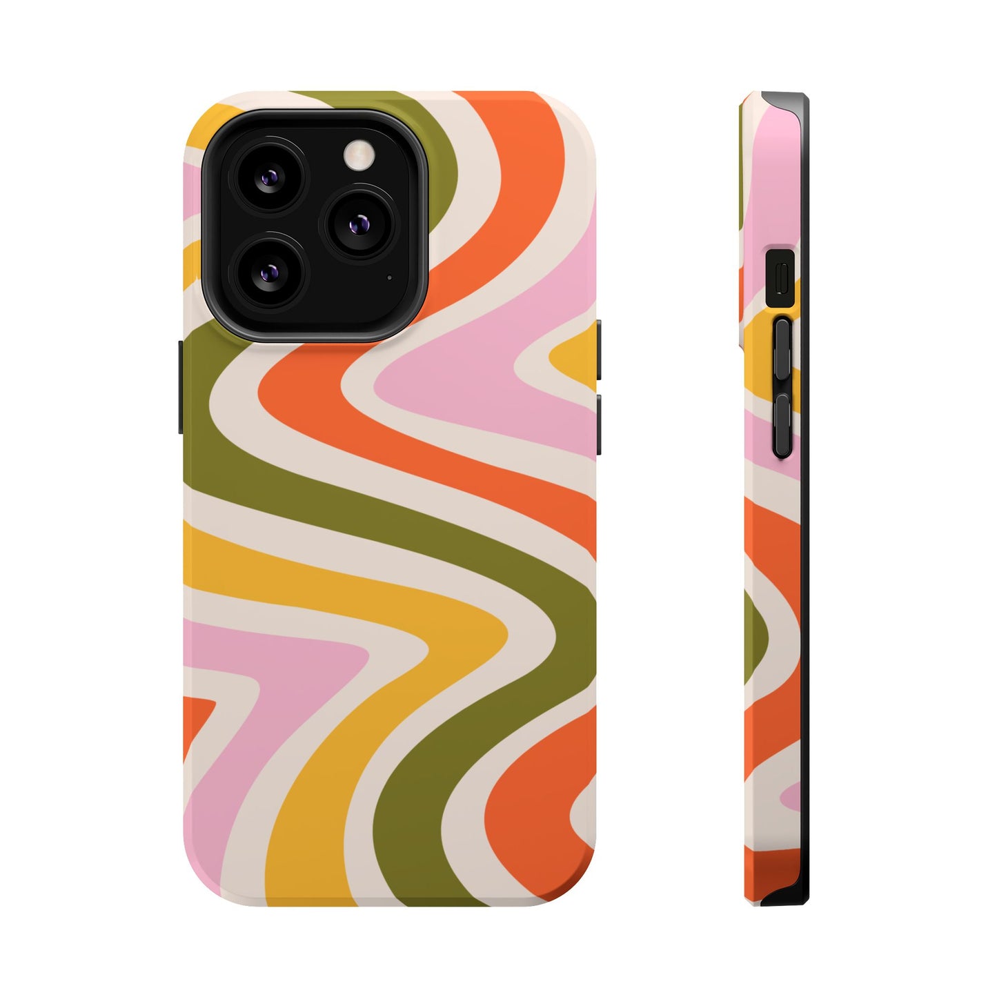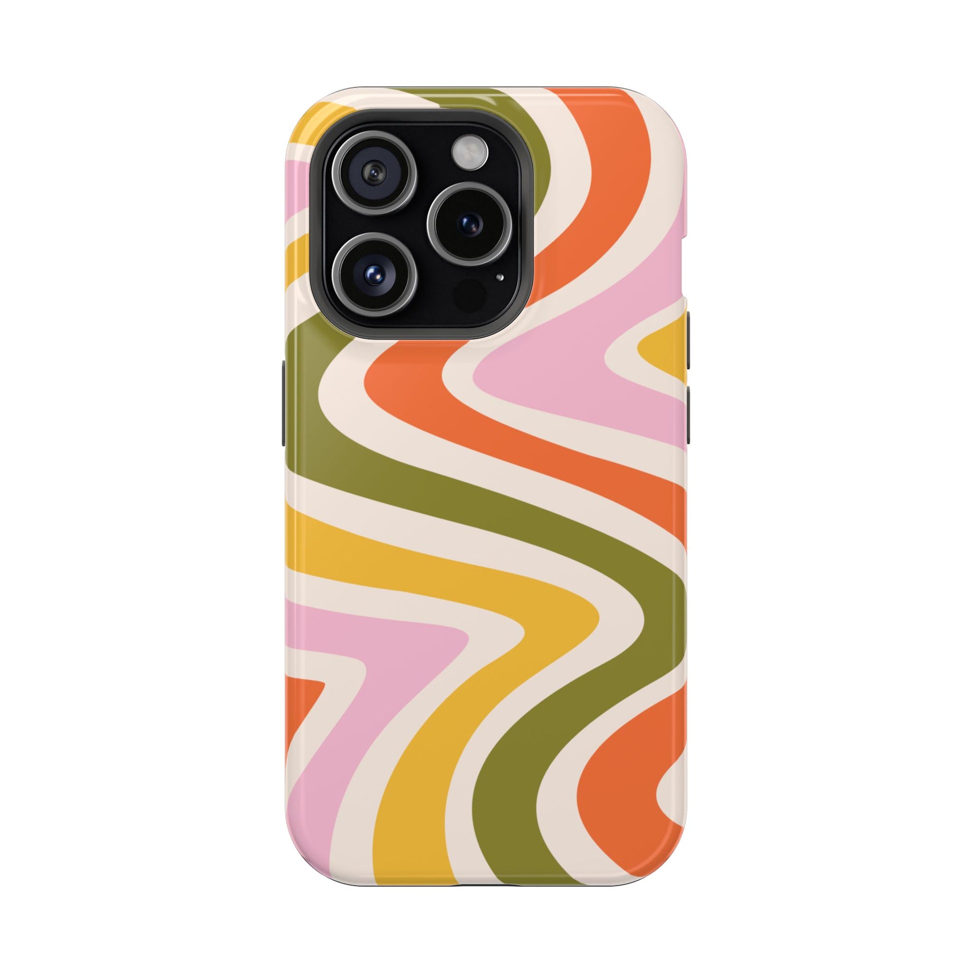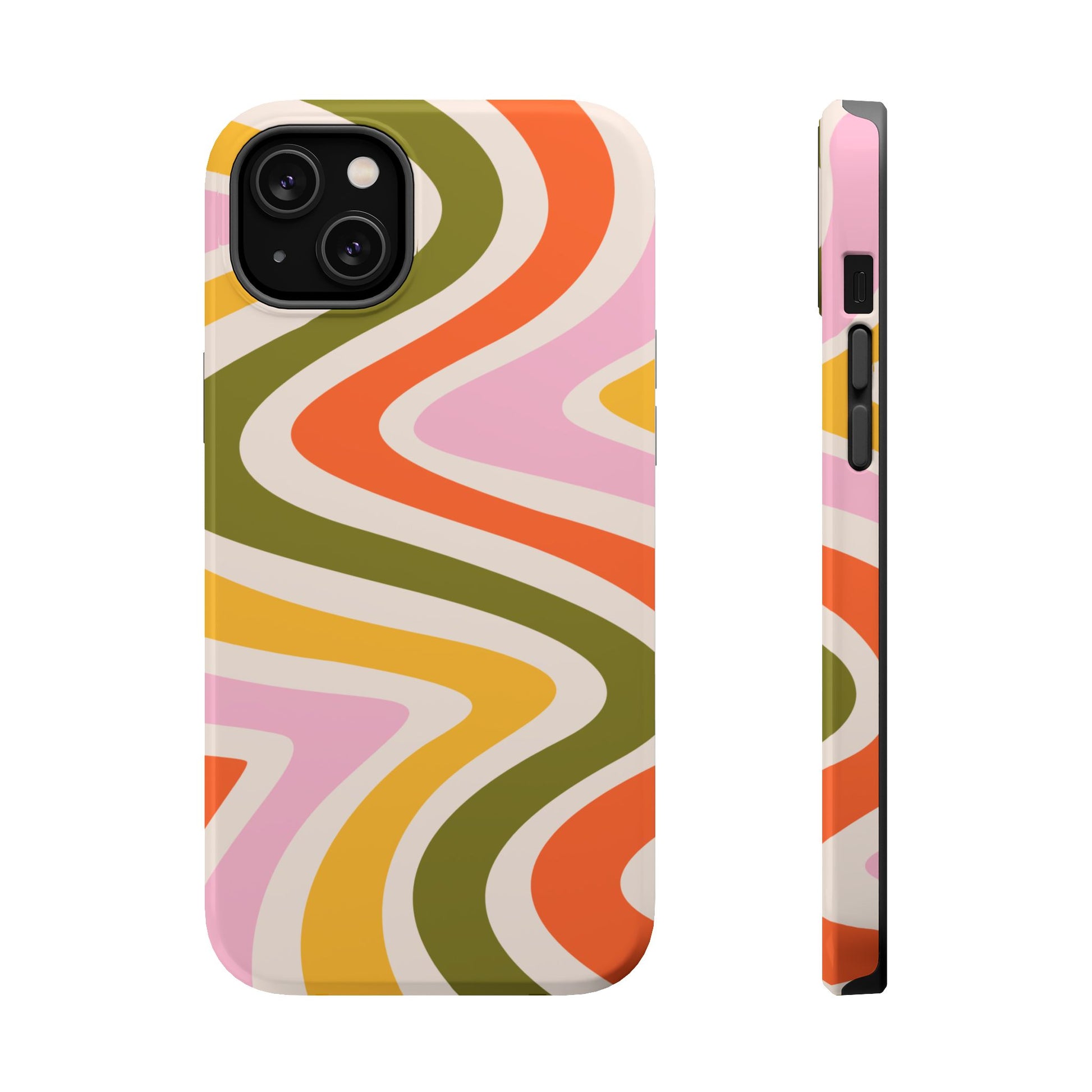 Groove in style with our Retro Groove MagSafe  iPhone Case, featuring a wavy, free-flowing design in warm orange, mustard yellow, olive green, and soft pink tones. This 70s-inspired pattern exudes nostalgic vibes, making it the perfect accessory for those who love vintage style with a modern twist. Built with dual-layer protection, this case combines a sturdy polycarbonate outer shell with a shock-absorbent TPU layer to keep your phone safe from drops and everyday wear.
