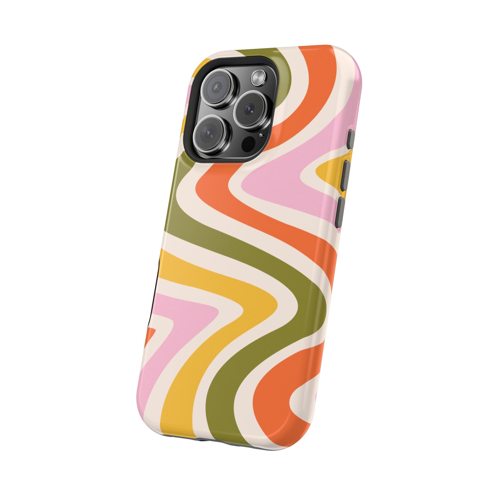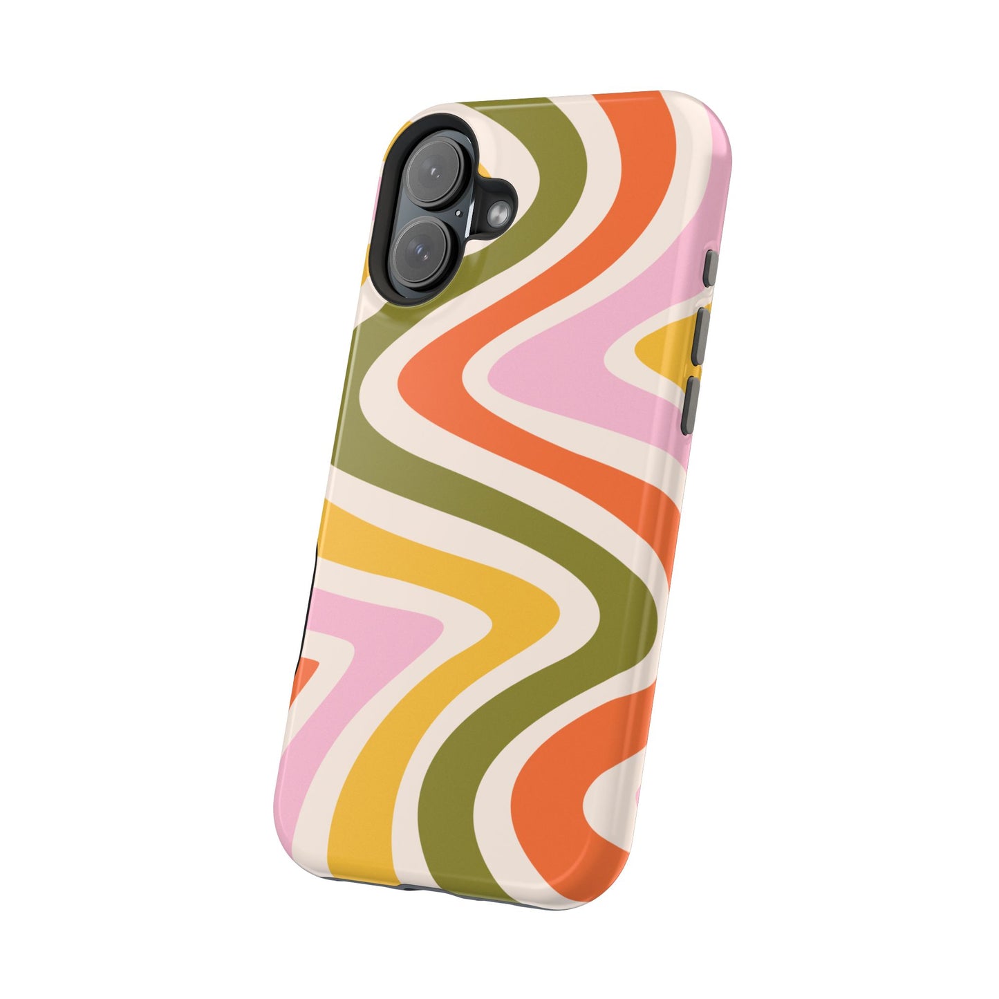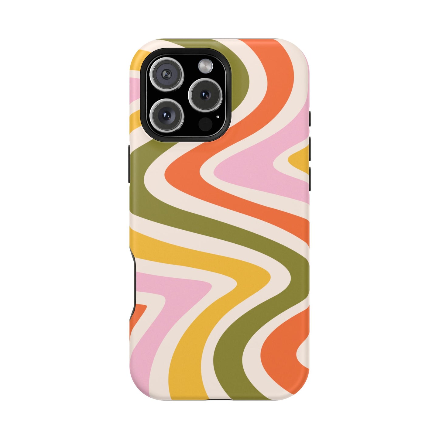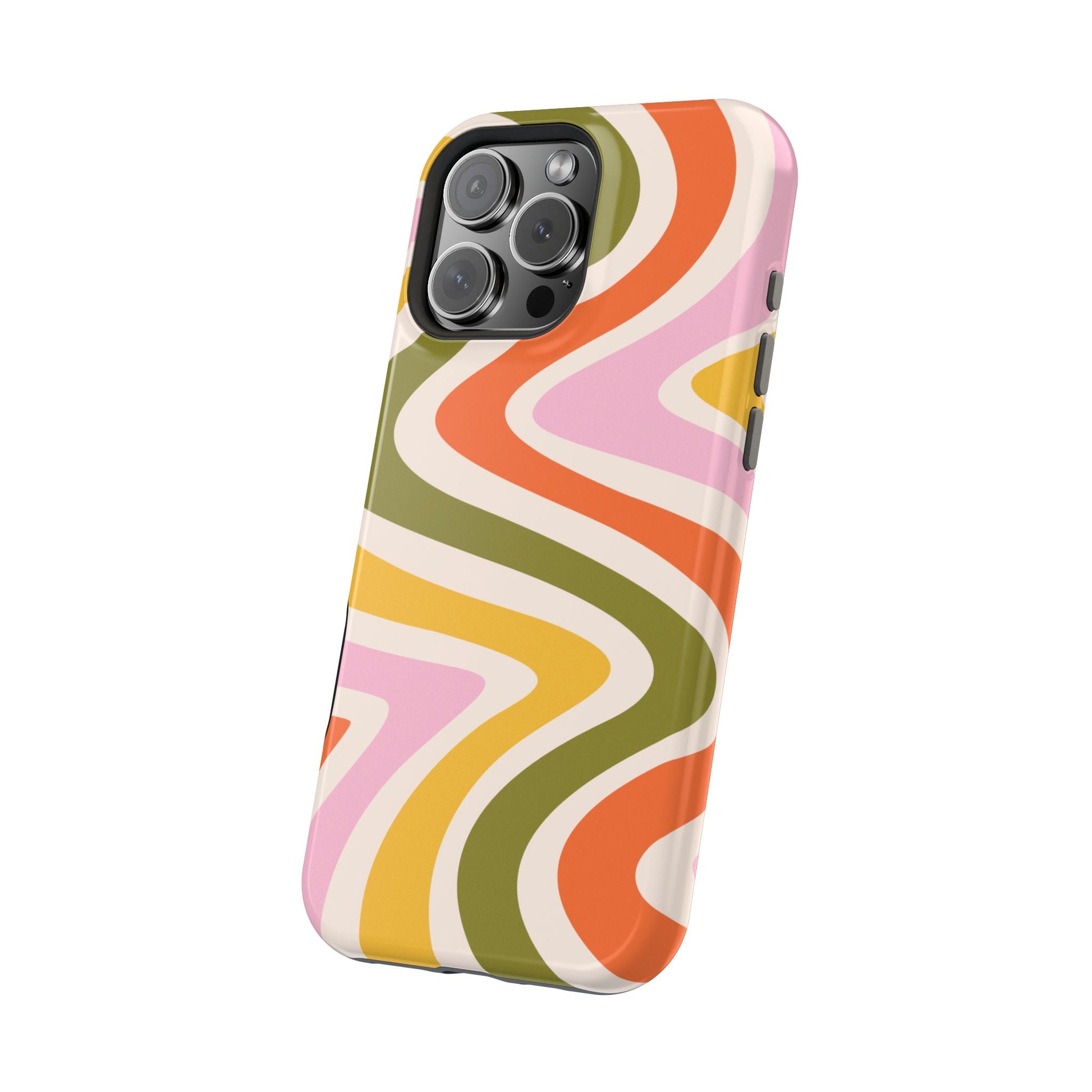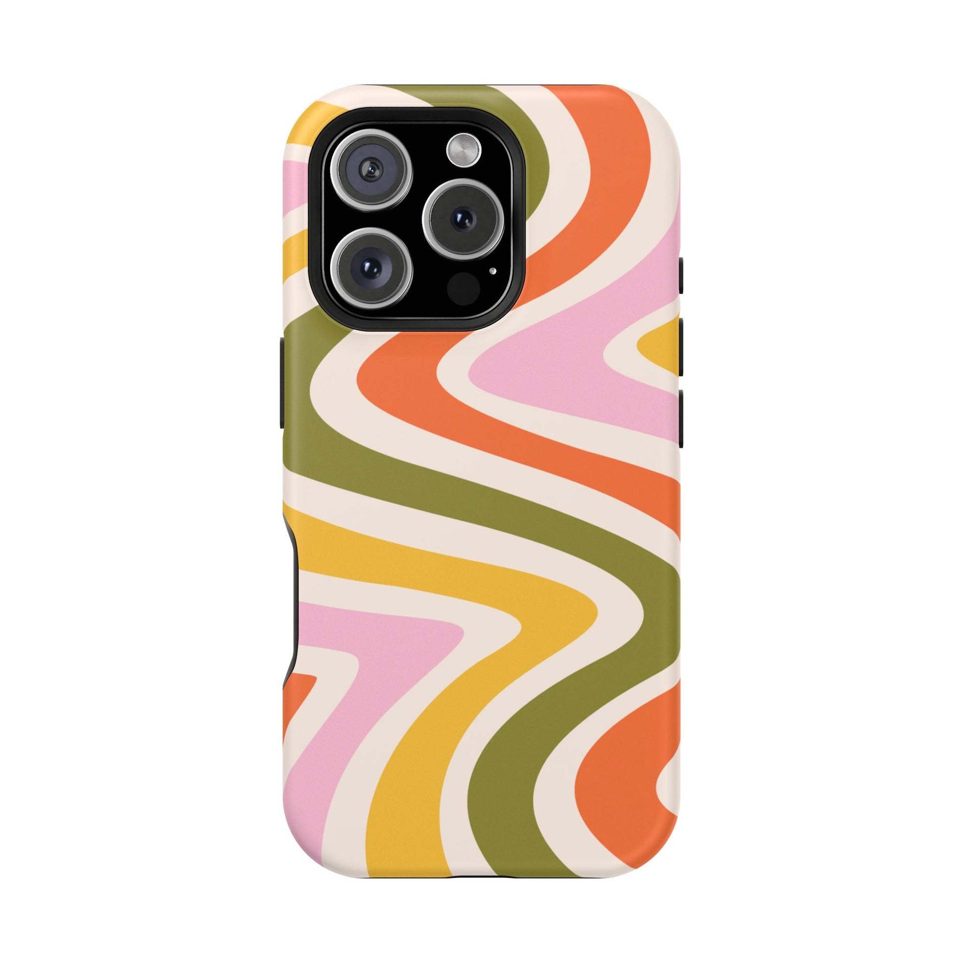 Groove in style with our Retro Groove MagSafe  iPhone Case, featuring a wavy, free-flowing design in warm orange, mustard yellow, olive green, and soft pink tones. This 70s-inspired pattern exudes nostalgic vibes, making it the perfect accessory for those who love vintage style with a modern twist. Built with dual-layer protection, this case combines a sturdy polycarbonate outer shell with a shock-absorbent TPU layer to keep your phone safe from drops and everyday wear.