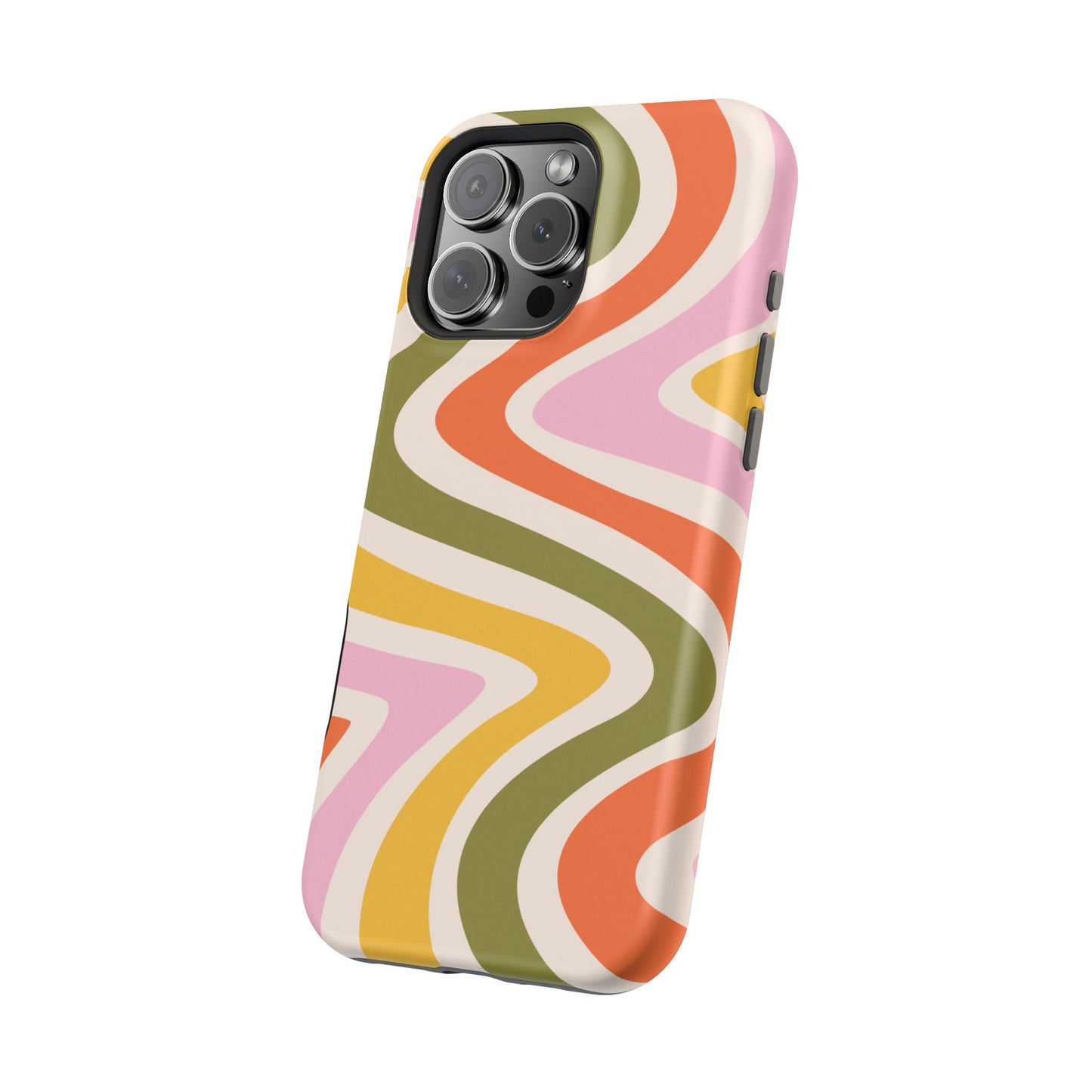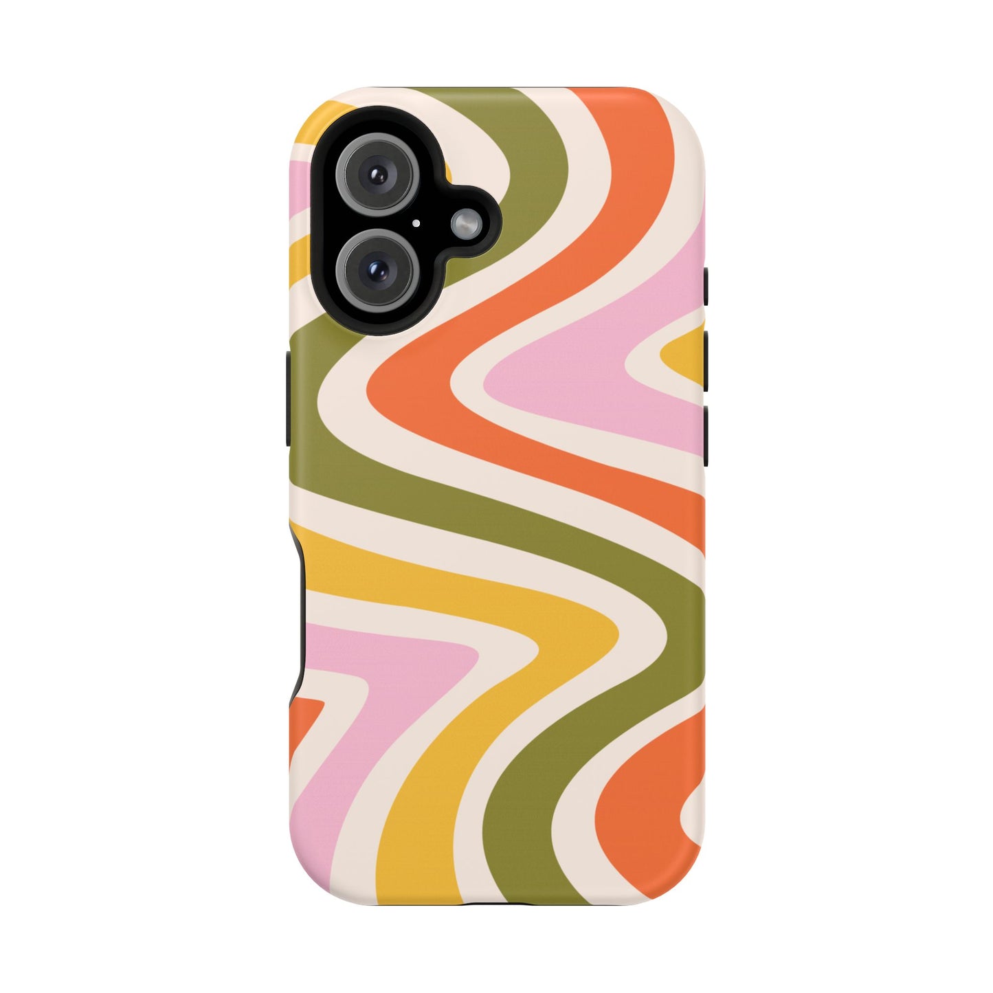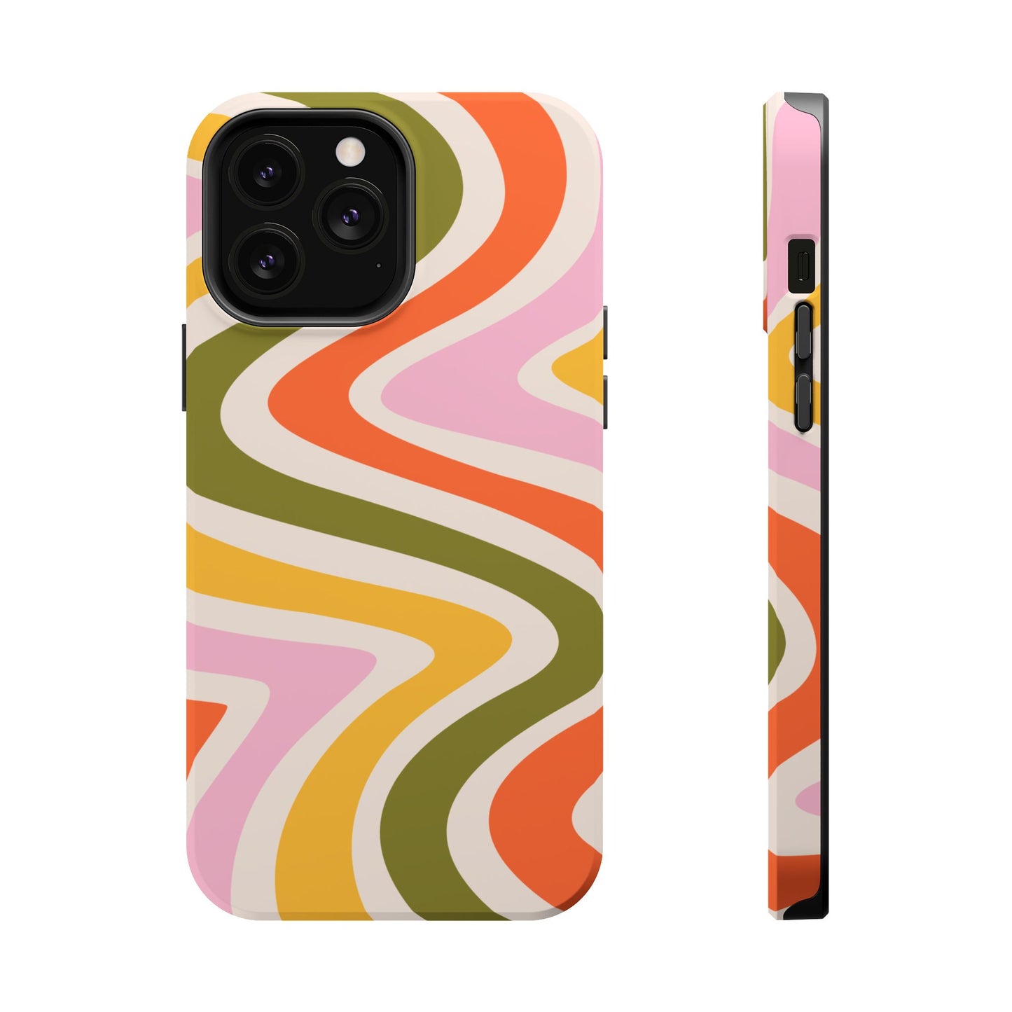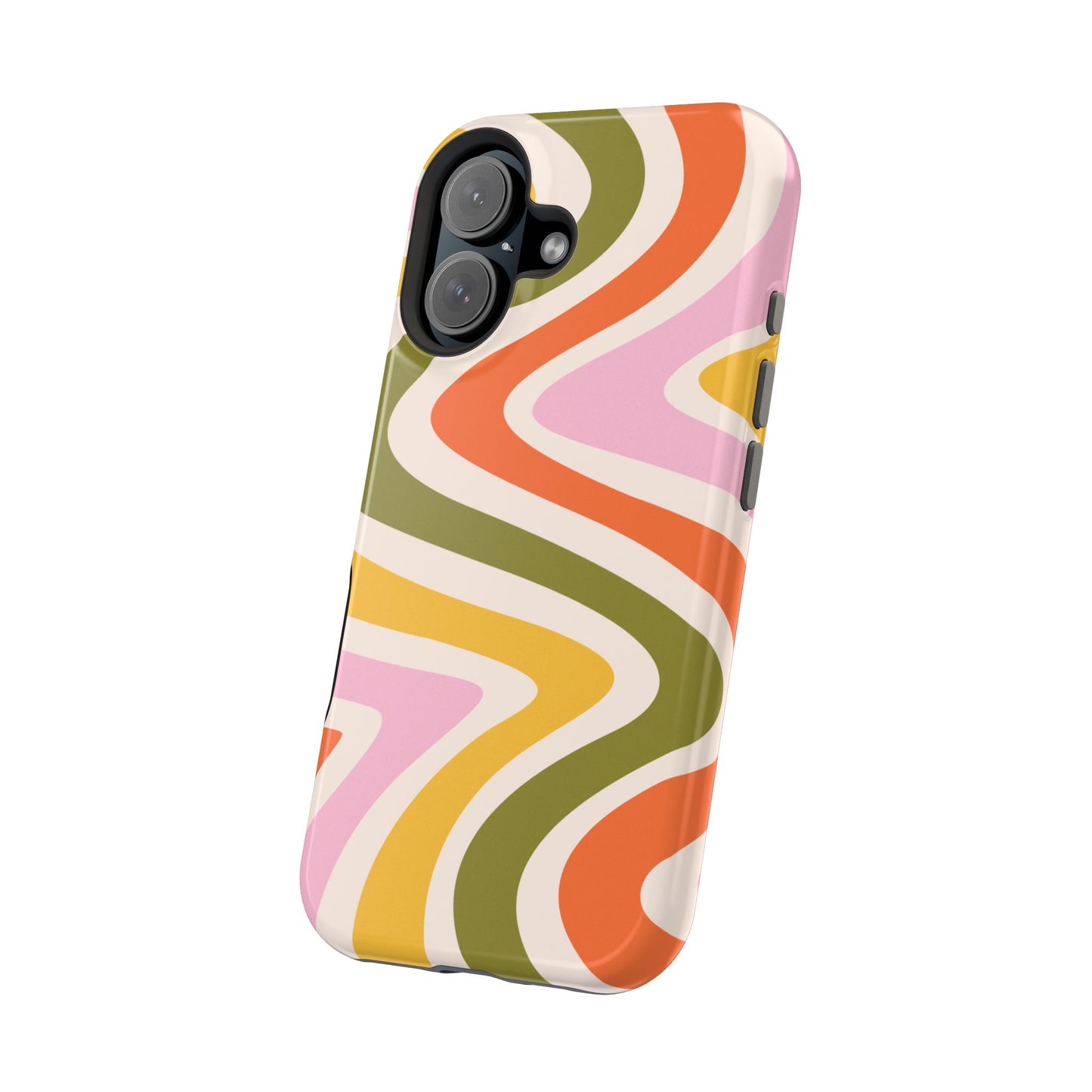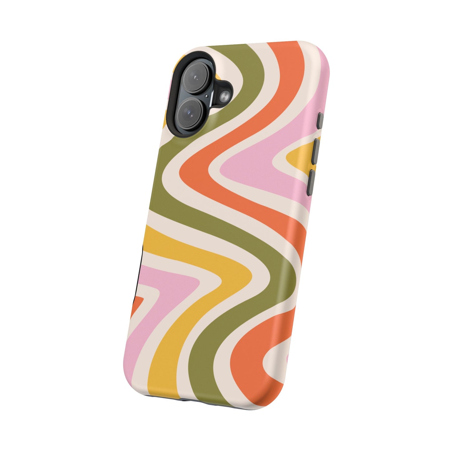 Groove in style with our Retro Groove MagSafe  iPhone Case, featuring a wavy, free-flowing design in warm orange, mustard yellow, olive green, and soft pink tones. This 70s-inspired pattern exudes nostalgic vibes, making it the perfect accessory for those who love vintage style with a modern twist. Built with dual-layer protection, this case combines a sturdy polycarbonate outer shell with a shock-absorbent TPU layer to keep your phone safe from drops and everyday wear.