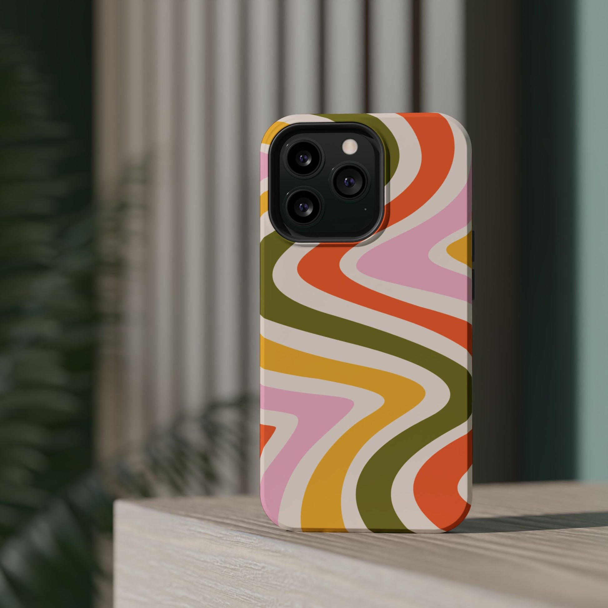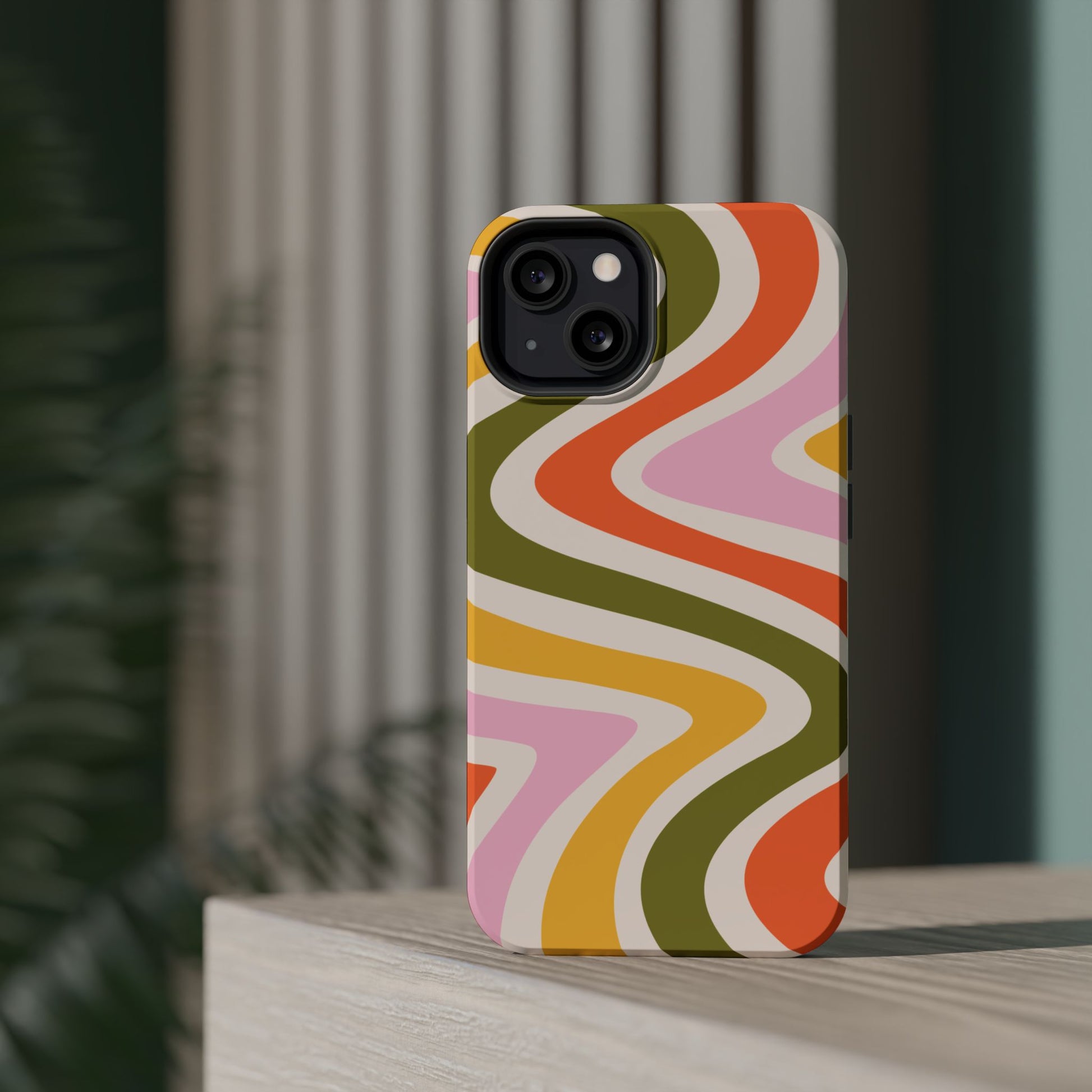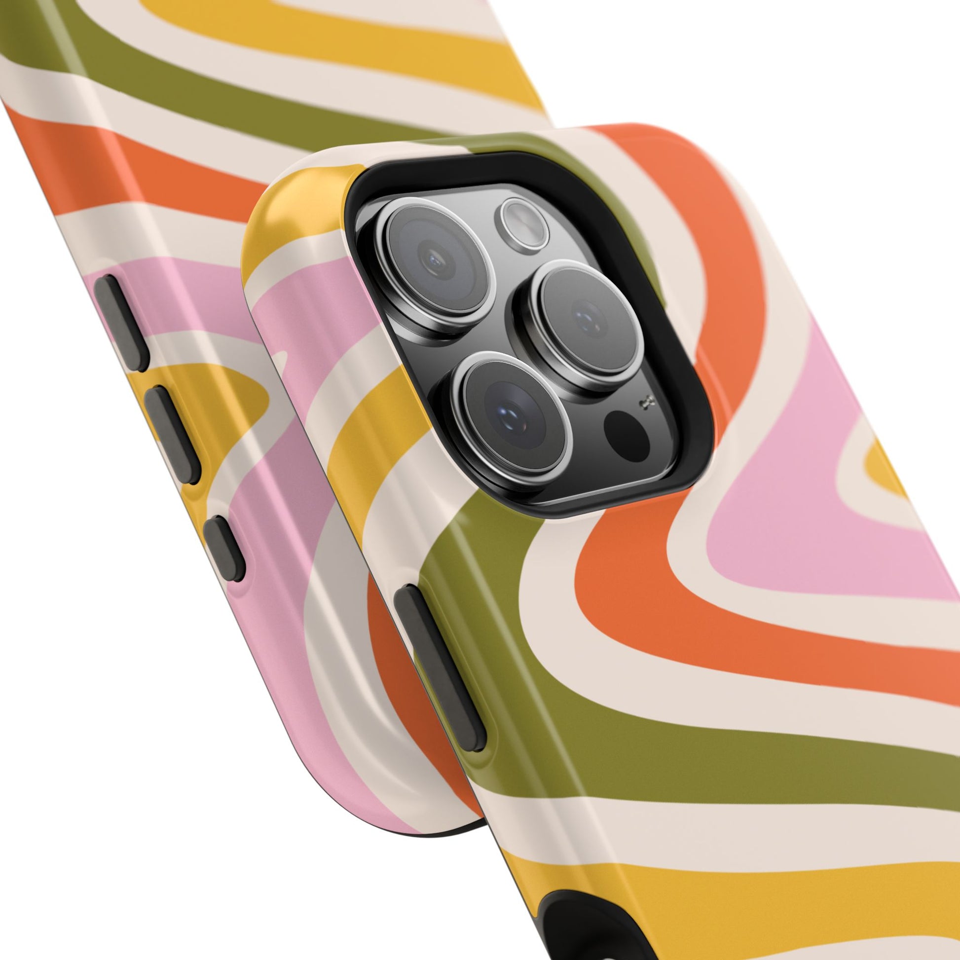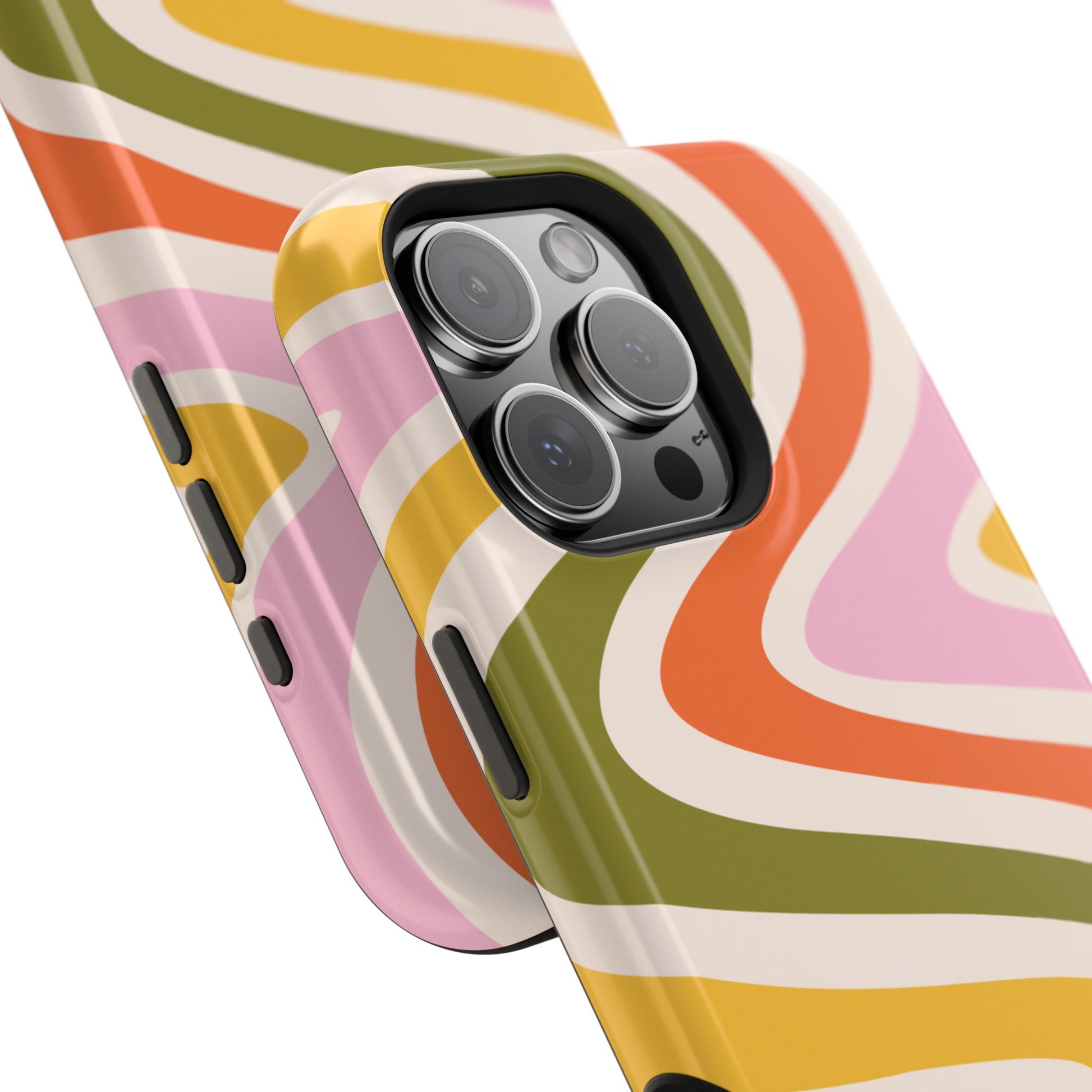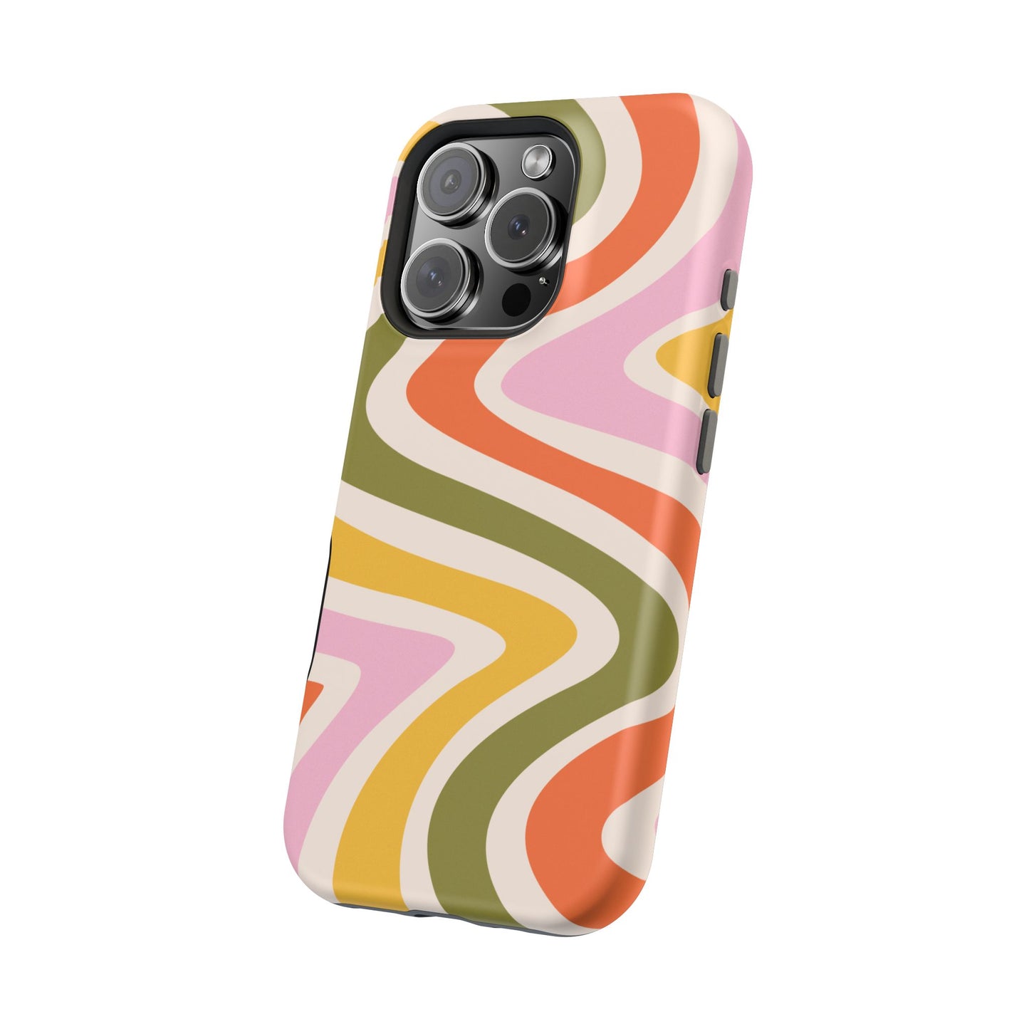 Groove in style with our Retro Groove MagSafe  iPhone Case, featuring a wavy, free-flowing design in warm orange, mustard yellow, olive green, and soft pink tones. This 70s-inspired pattern exudes nostalgic vibes, making it the perfect accessory for those who love vintage style with a modern twist. Built with dual-layer protection, this case combines a sturdy polycarbonate outer shell with a shock-absorbent TPU layer to keep your phone safe from drops and everyday wear.