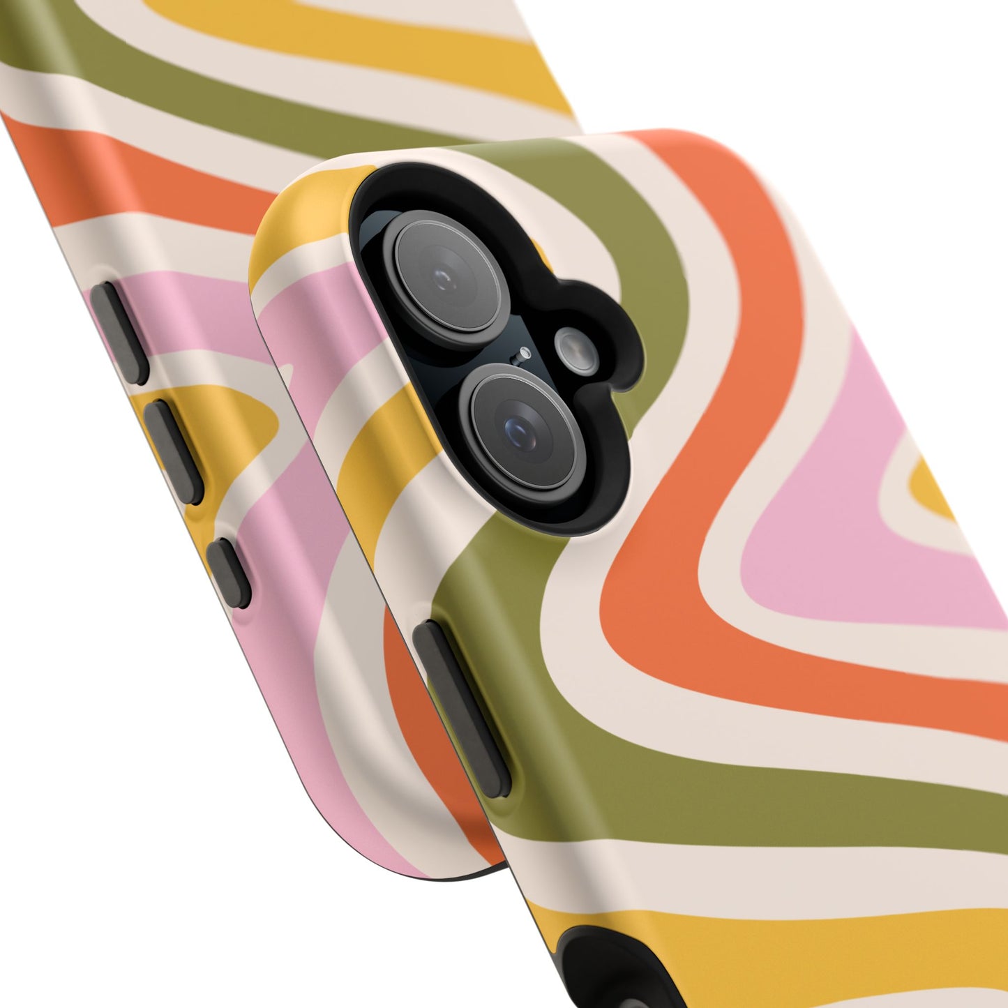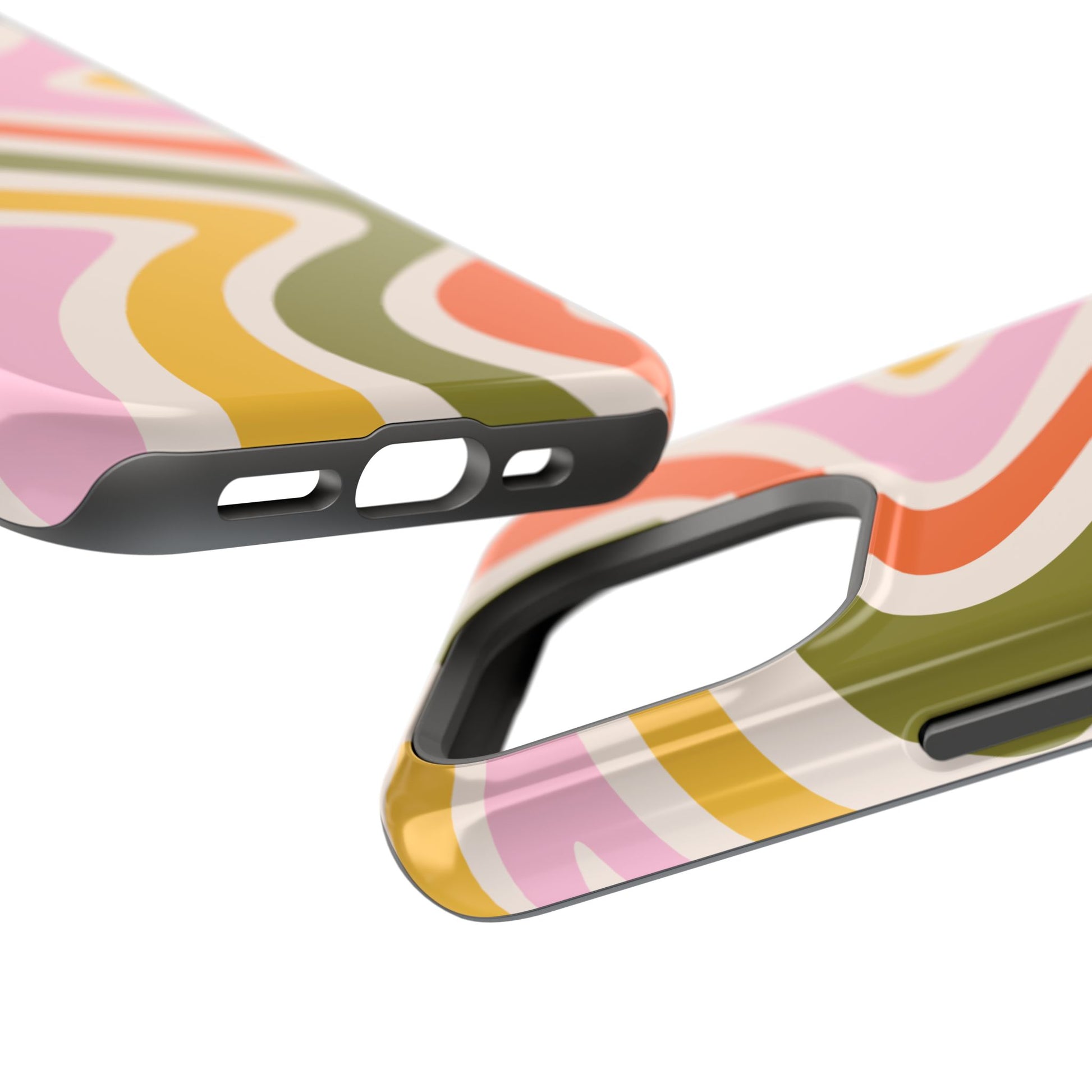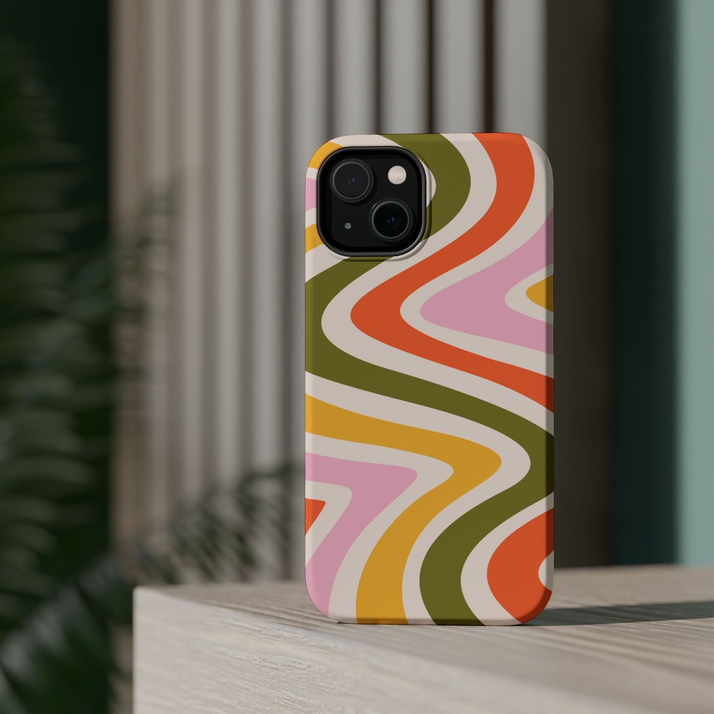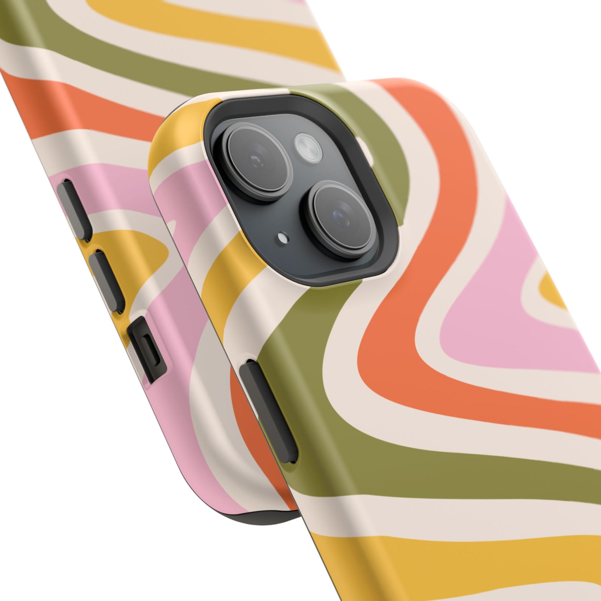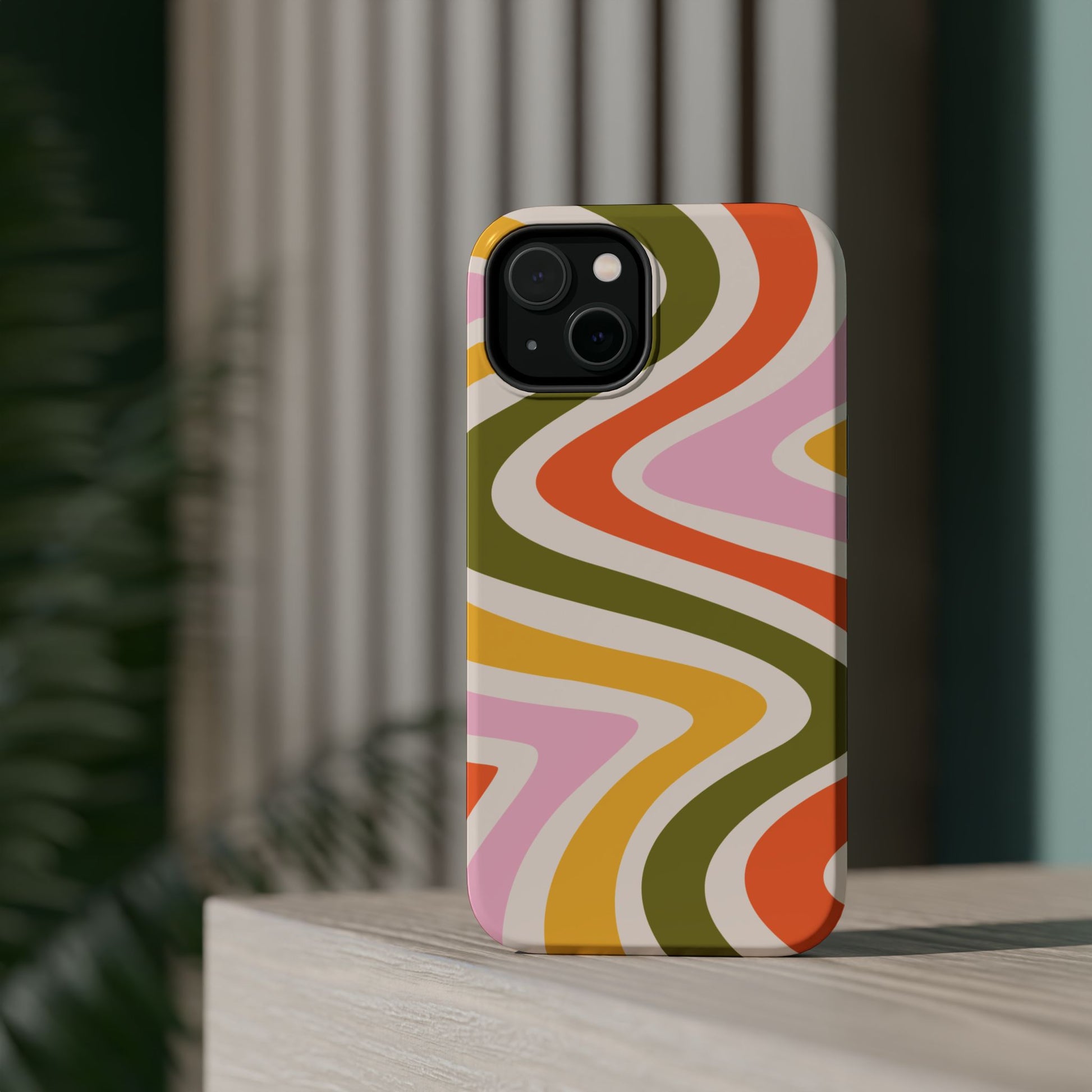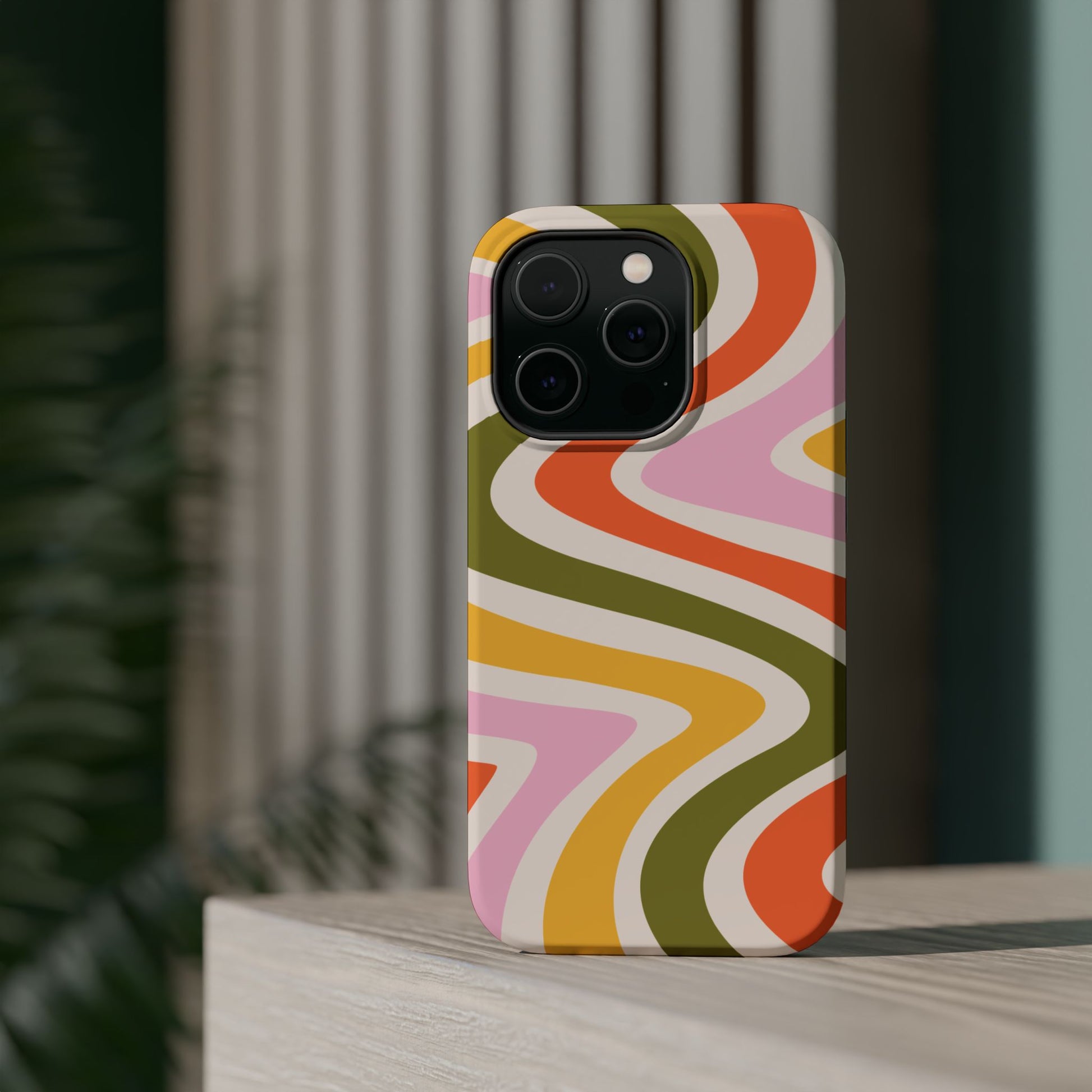 Groove in style with our Retro Groove MagSafe  iPhone Case, featuring a wavy, free-flowing design in warm orange, mustard yellow, olive green, and soft pink tones. This 70s-inspired pattern exudes nostalgic vibes, making it the perfect accessory for those who love vintage style with a modern twist. Built with dual-layer protection, this case combines a sturdy polycarbonate outer shell with a shock-absorbent TPU layer to keep your phone safe from drops and everyday wear.
