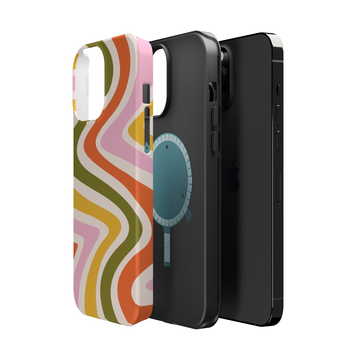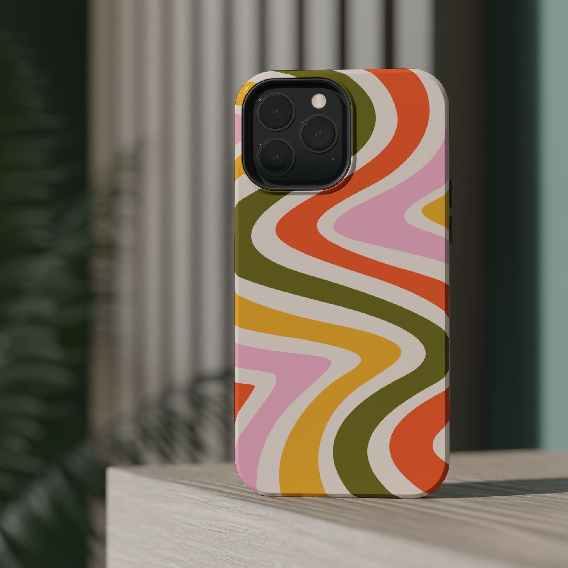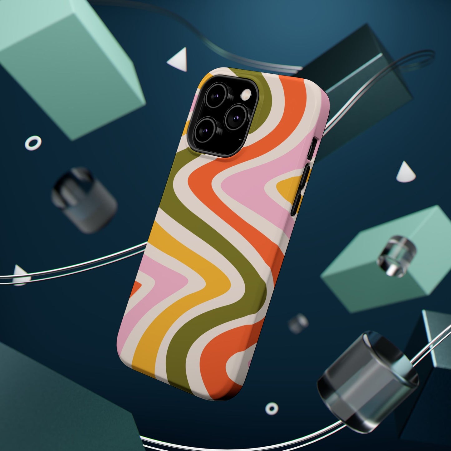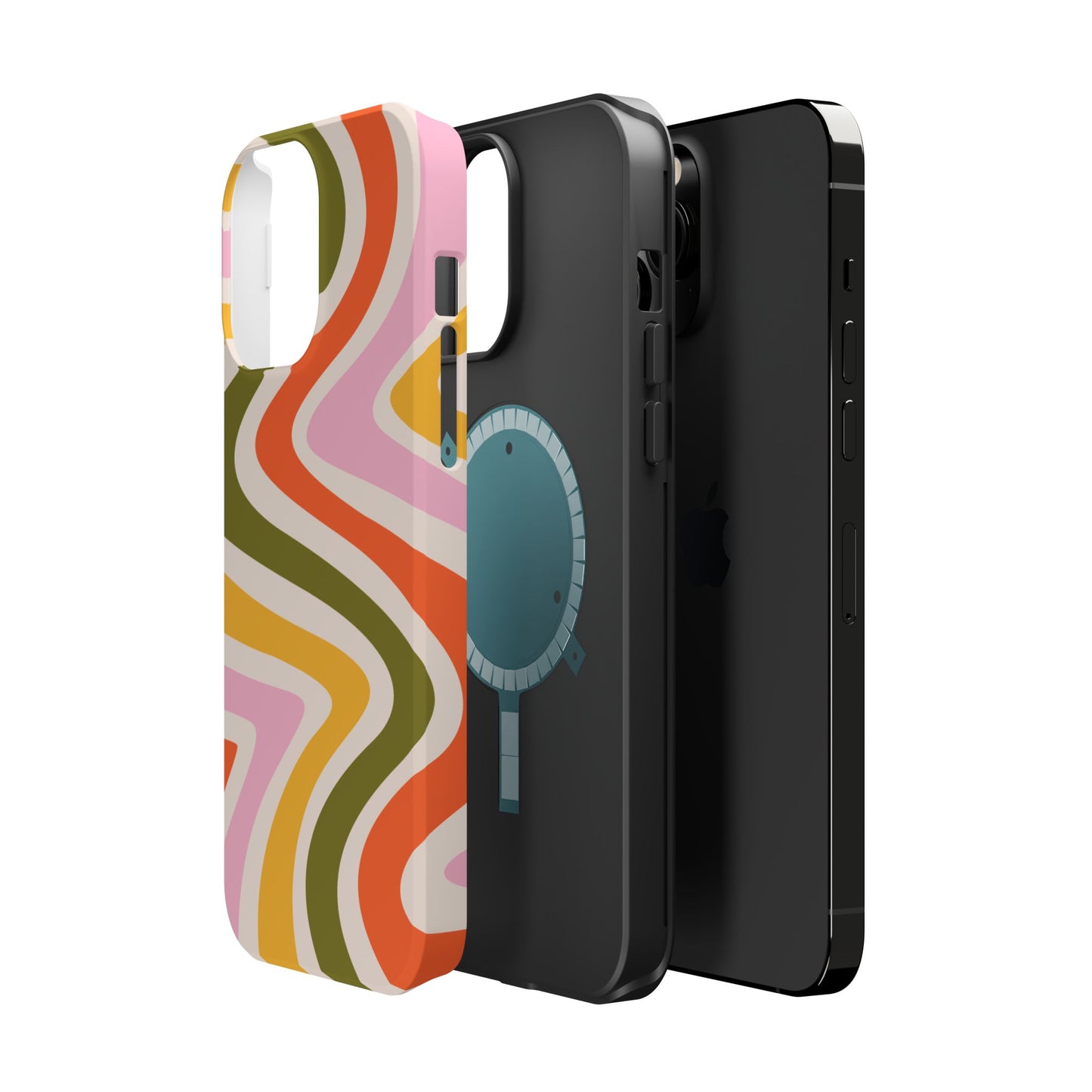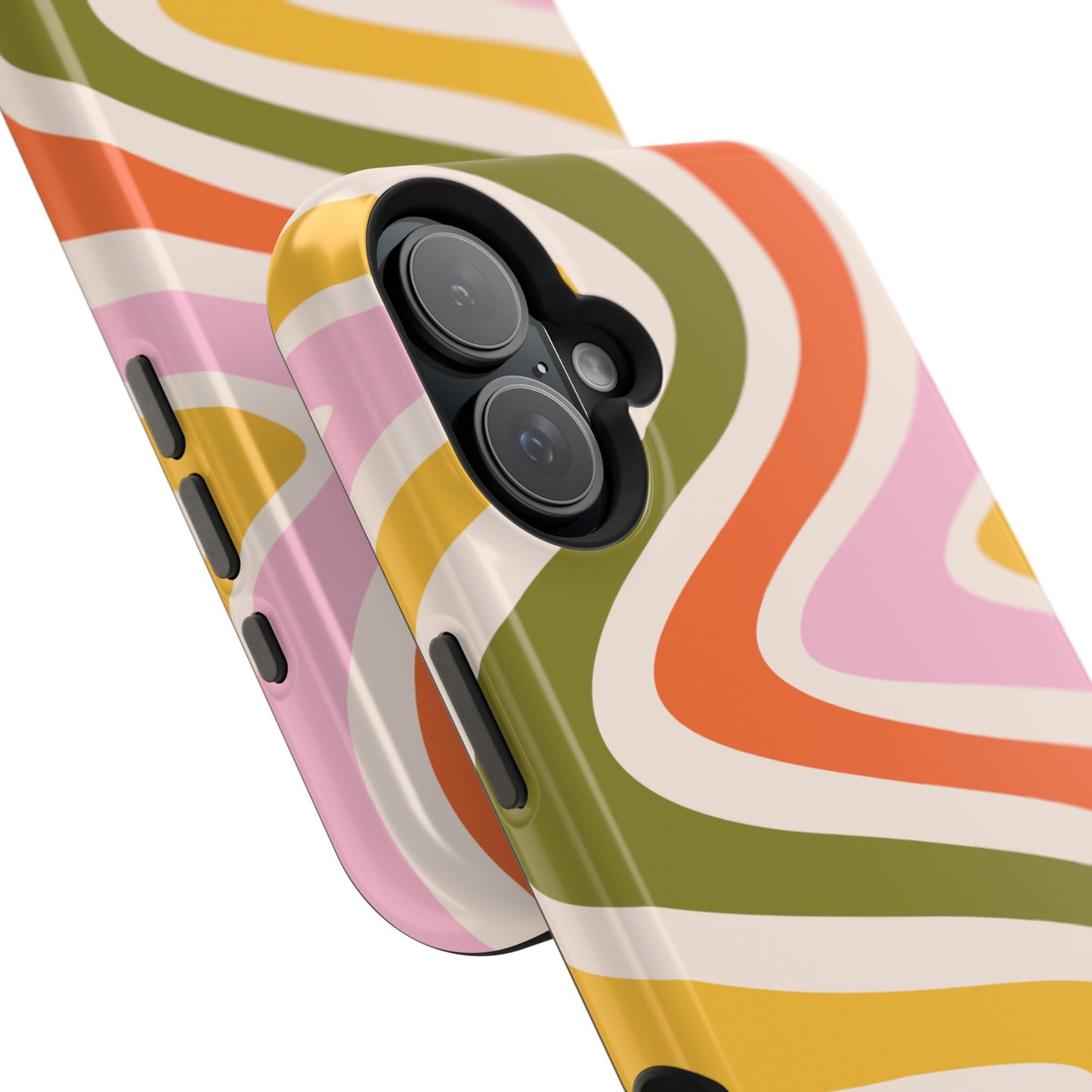 Groove in style with our Retro Groove MagSafe  iPhone Case, featuring a wavy, free-flowing design in warm orange, mustard yellow, olive green, and soft pink tones. This 70s-inspired pattern exudes nostalgic vibes, making it the perfect accessory for those who love vintage style with a modern twist. Built with dual-layer protection, this case combines a sturdy polycarbonate outer shell with a shock-absorbent TPU layer to keep your phone safe from drops and everyday wear.