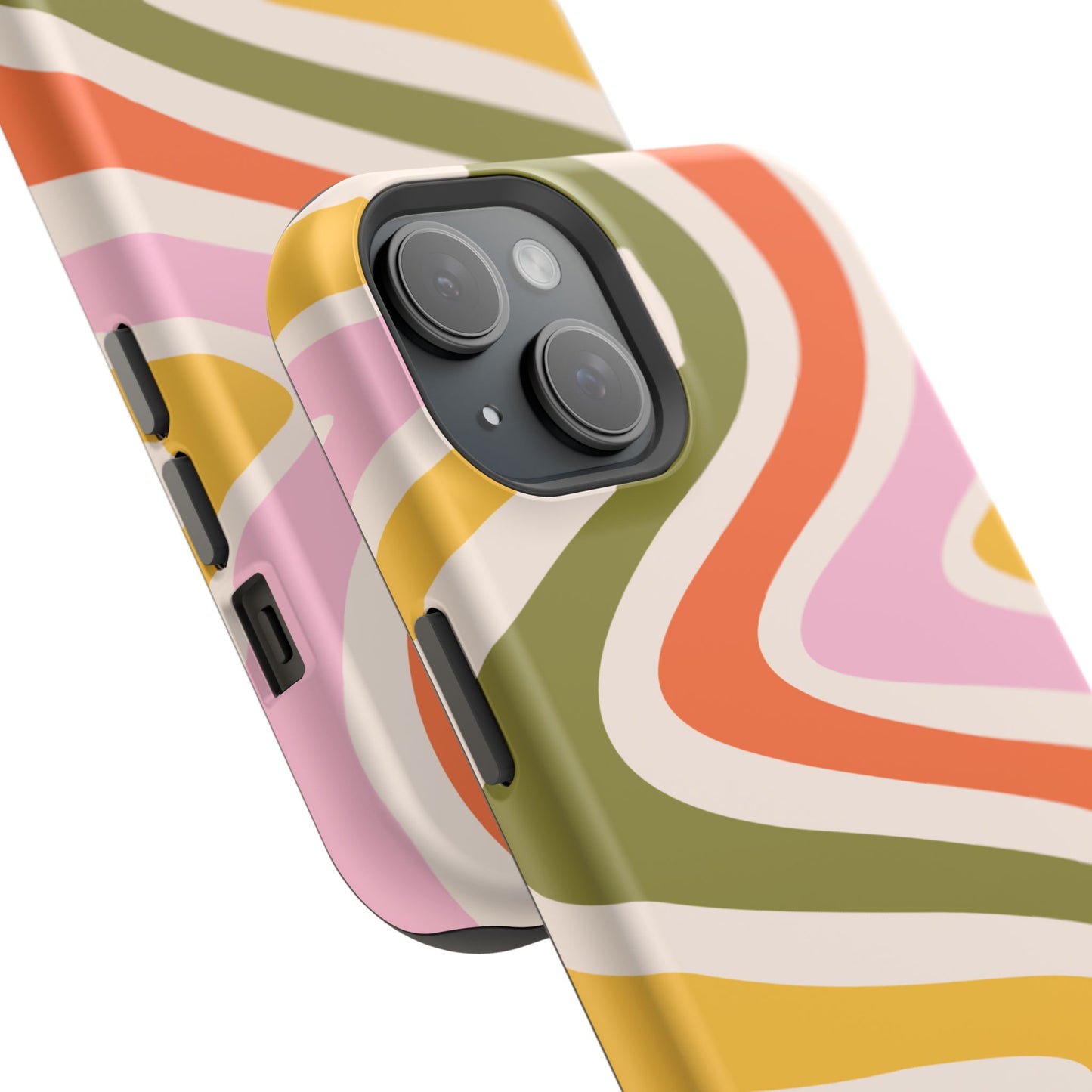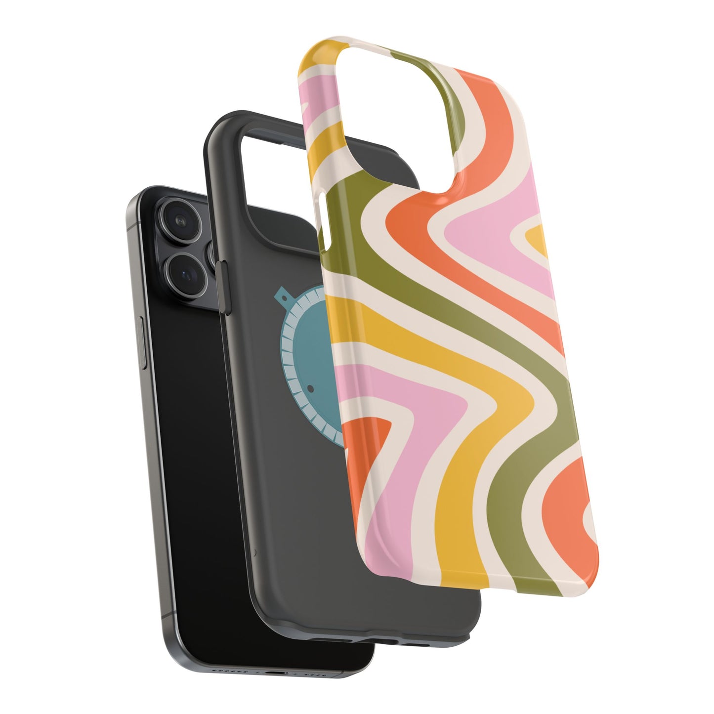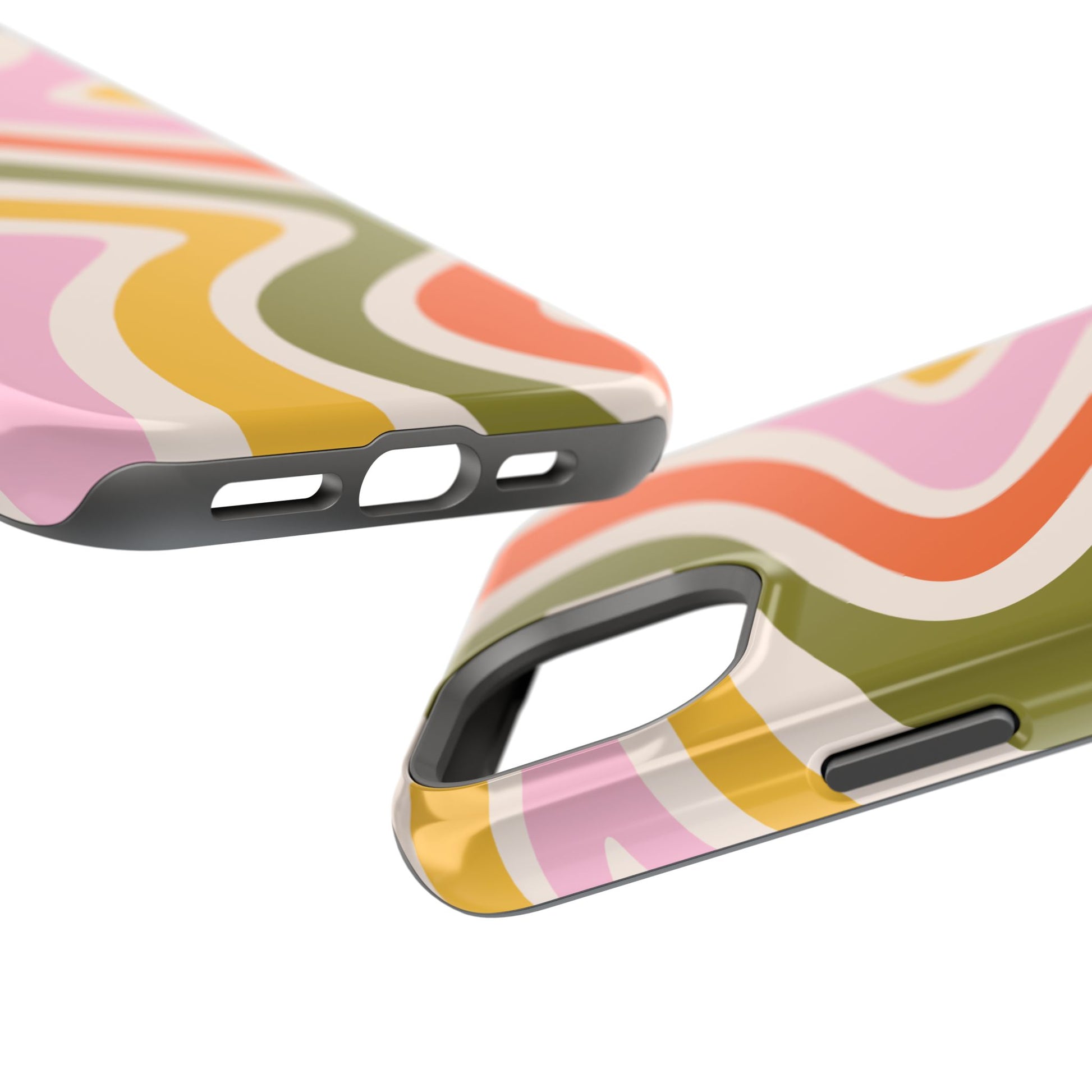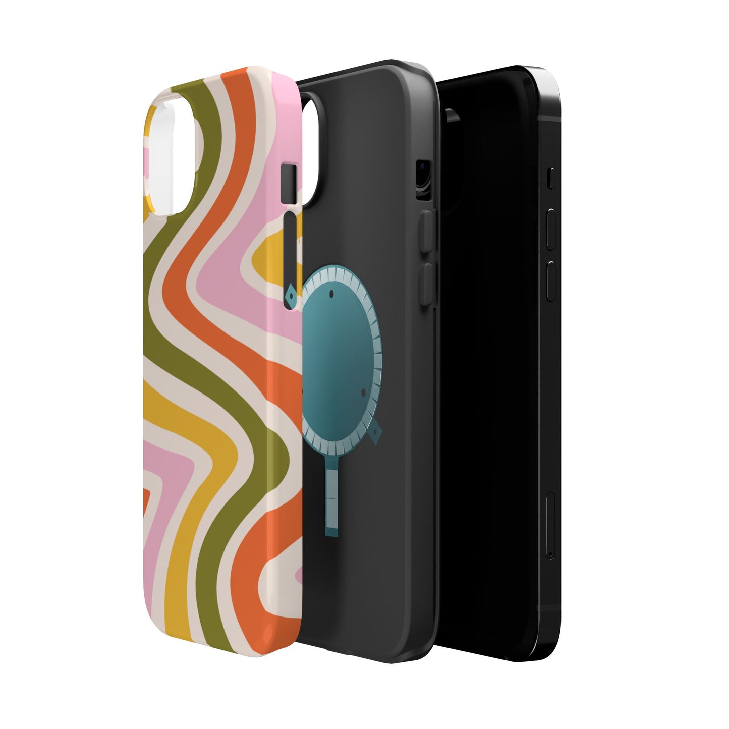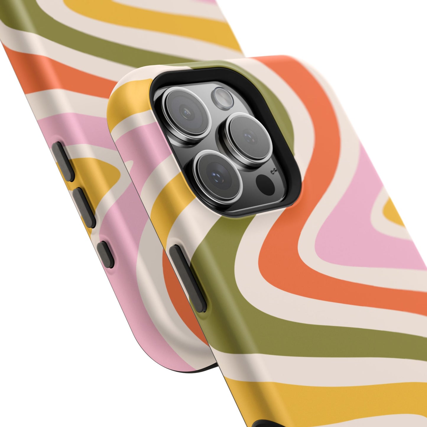 Groove in style with our Retro Groove MagSafe  iPhone Case, featuring a wavy, free-flowing design in warm orange, mustard yellow, olive green, and soft pink tones. This 70s-inspired pattern exudes nostalgic vibes, making it the perfect accessory for those who love vintage style with a modern twist. Built with dual-layer protection, this case combines a sturdy polycarbonate outer shell with a shock-absorbent TPU layer to keep your phone safe from drops and everyday wear.