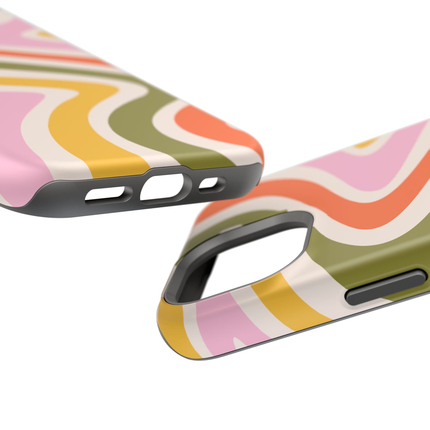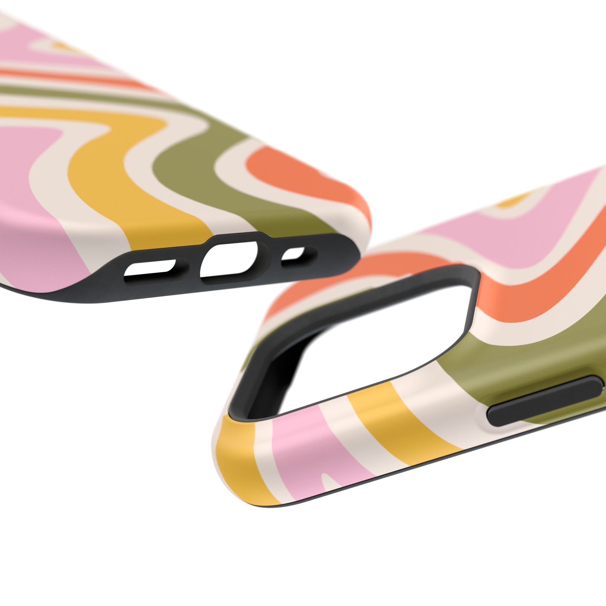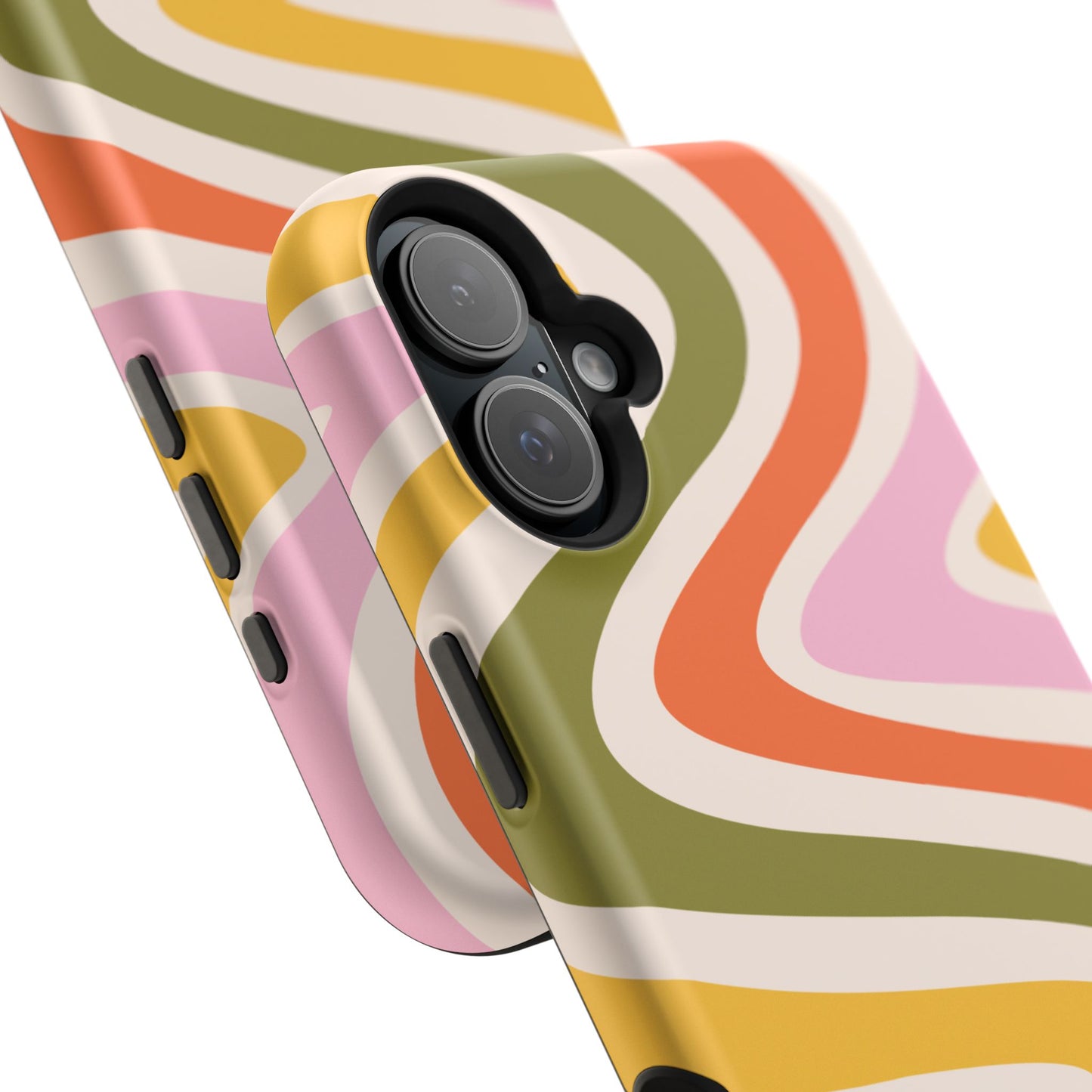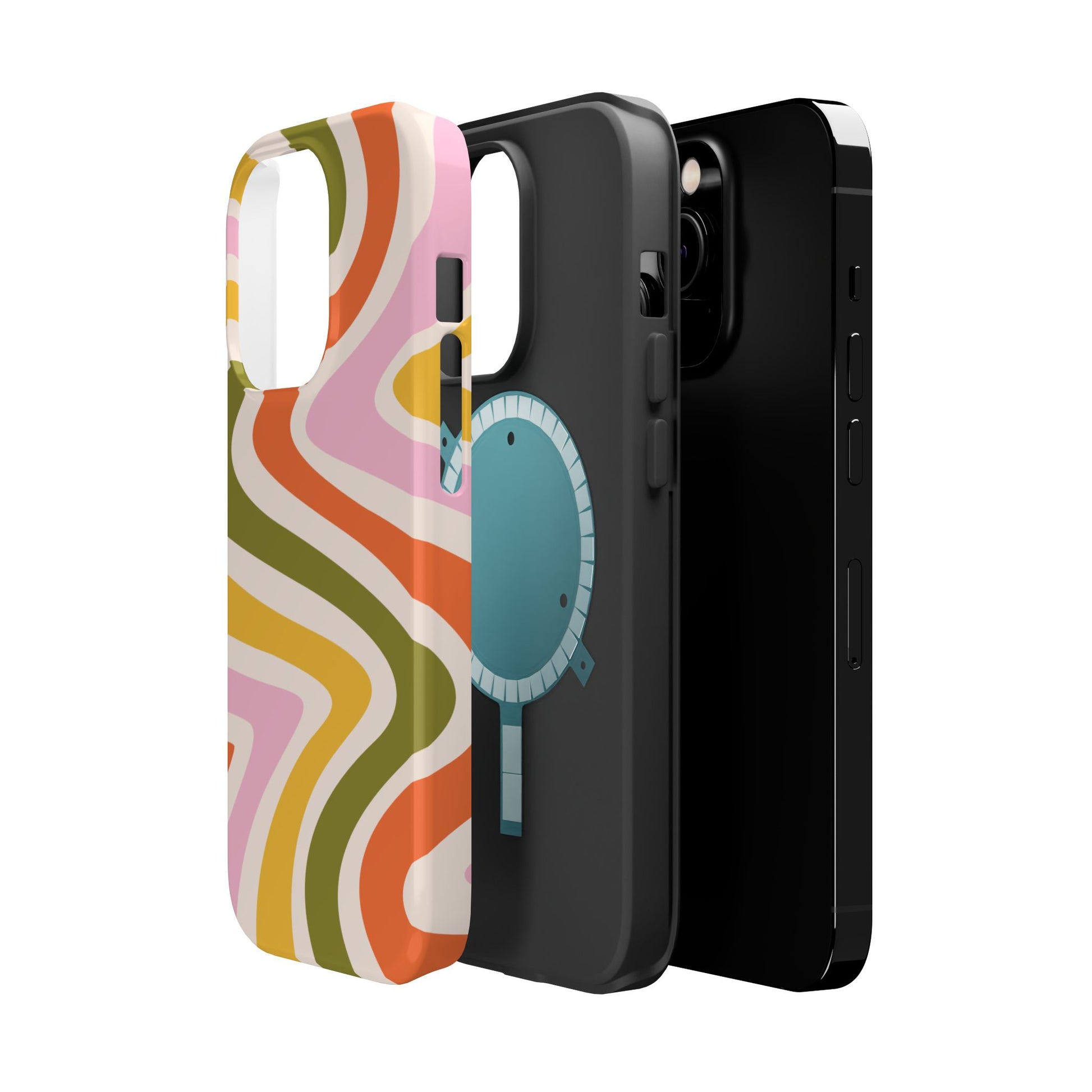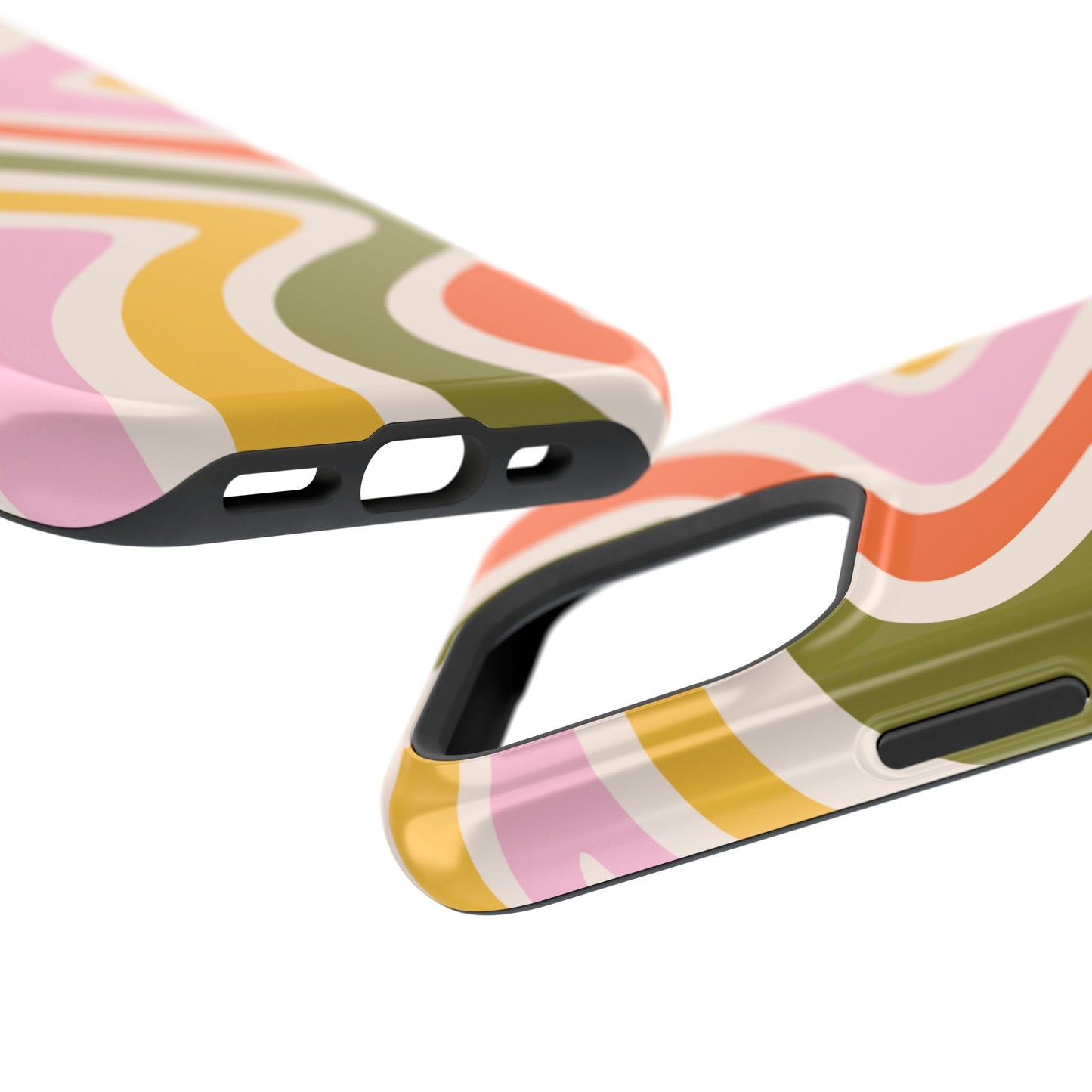 Groove in style with our Retro Groove MagSafe  iPhone Case, featuring a wavy, free-flowing design in warm orange, mustard yellow, olive green, and soft pink tones. This 70s-inspired pattern exudes nostalgic vibes, making it the perfect accessory for those who love vintage style with a modern twist. Built with dual-layer protection, this case combines a sturdy polycarbonate outer shell with a shock-absorbent TPU layer to keep your phone safe from drops and everyday wear.