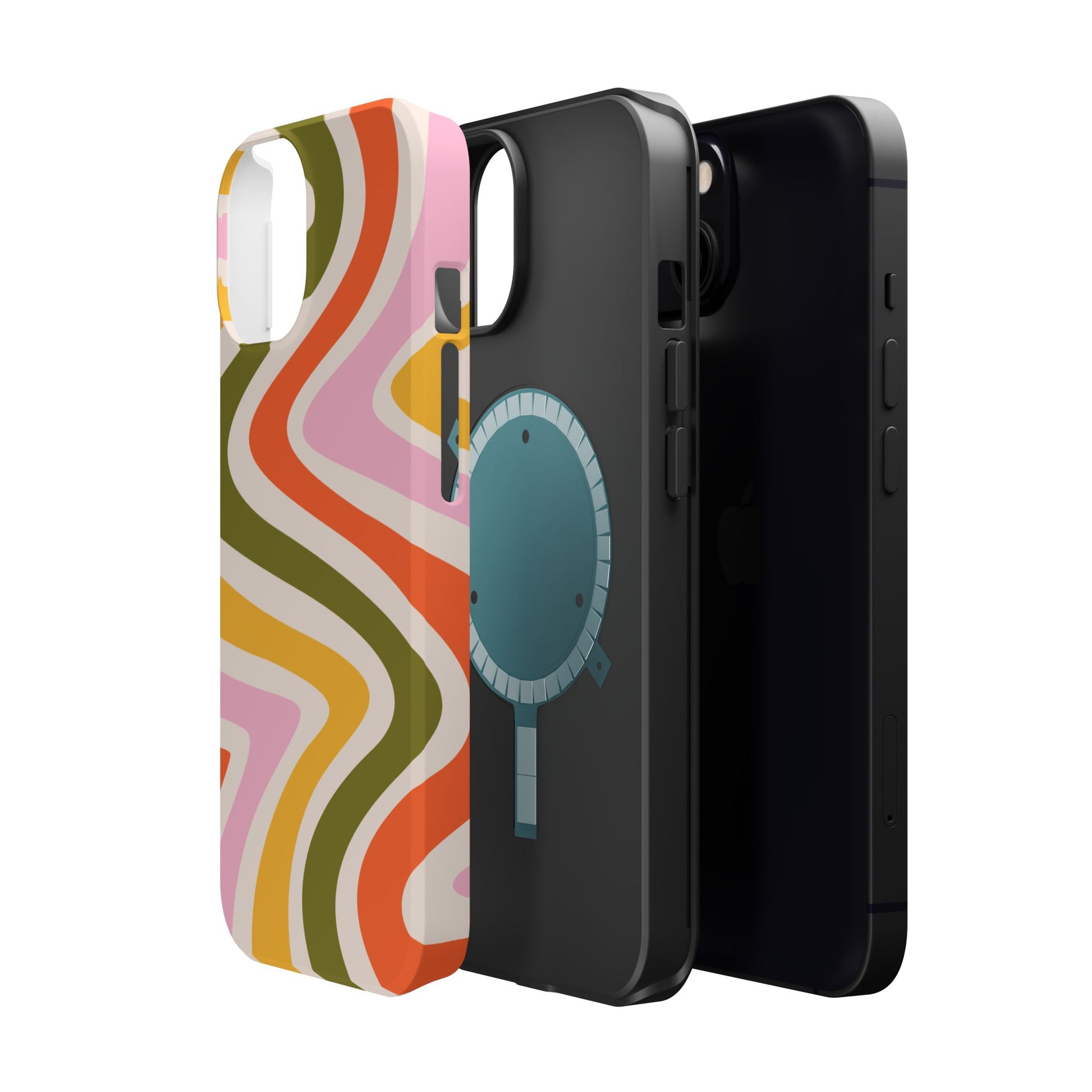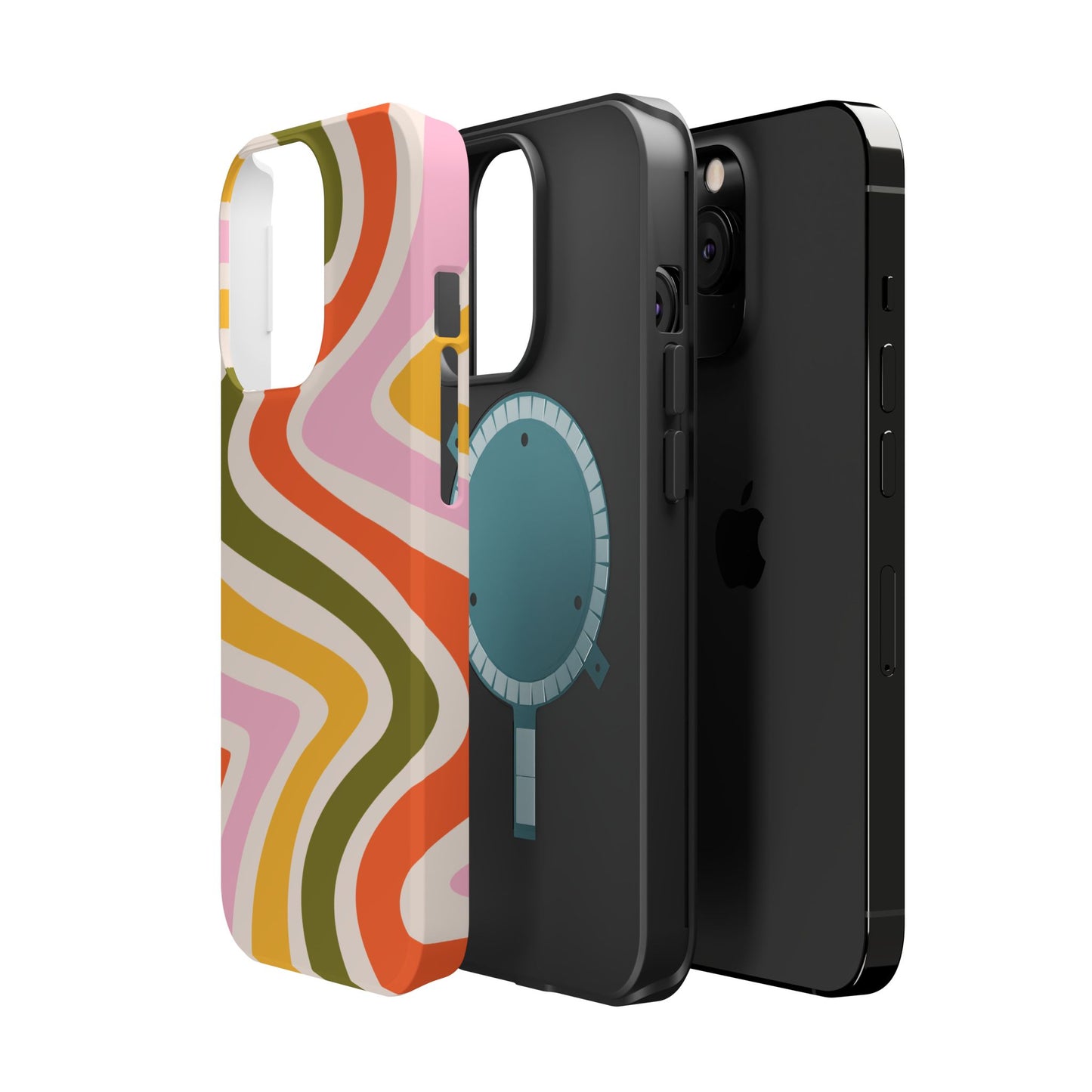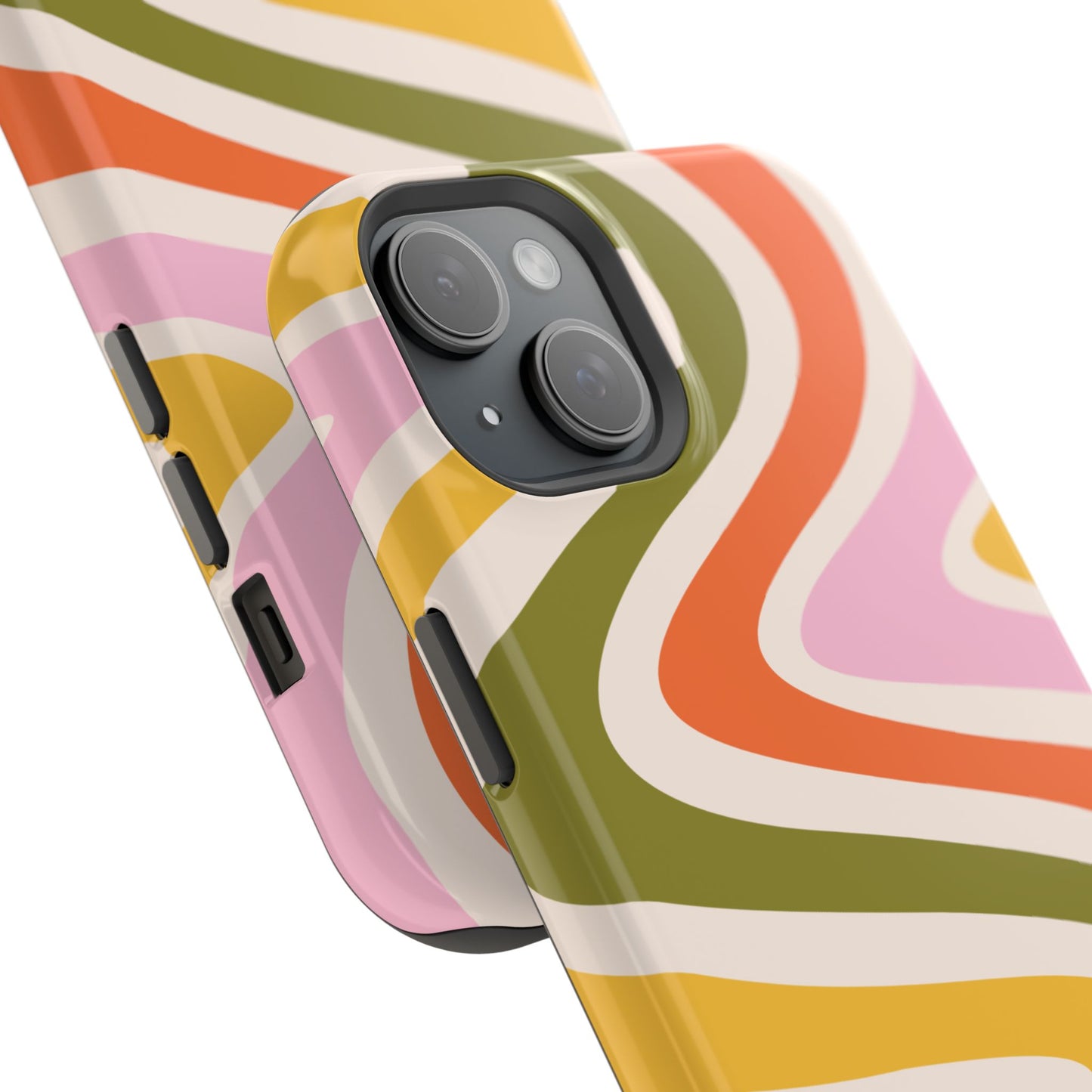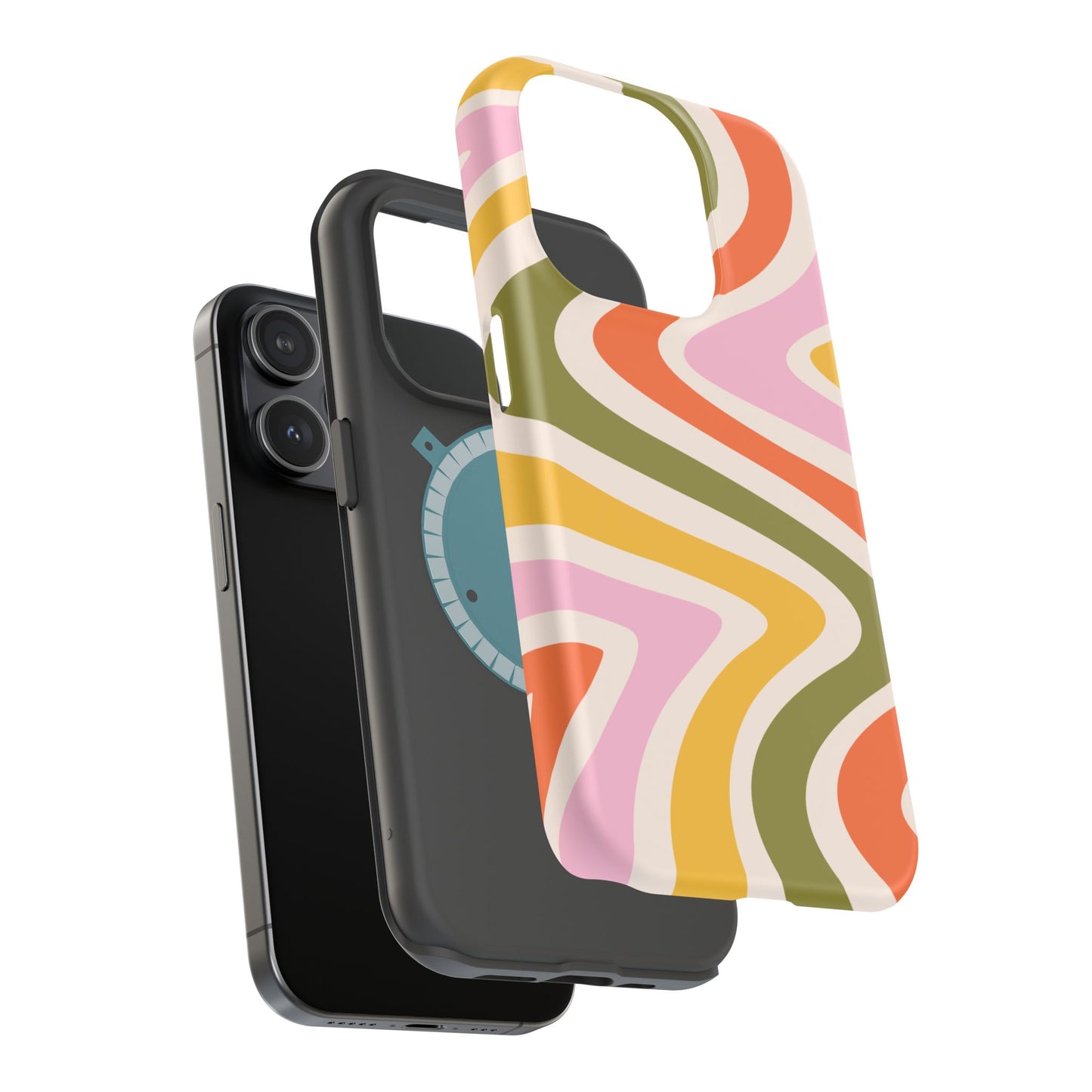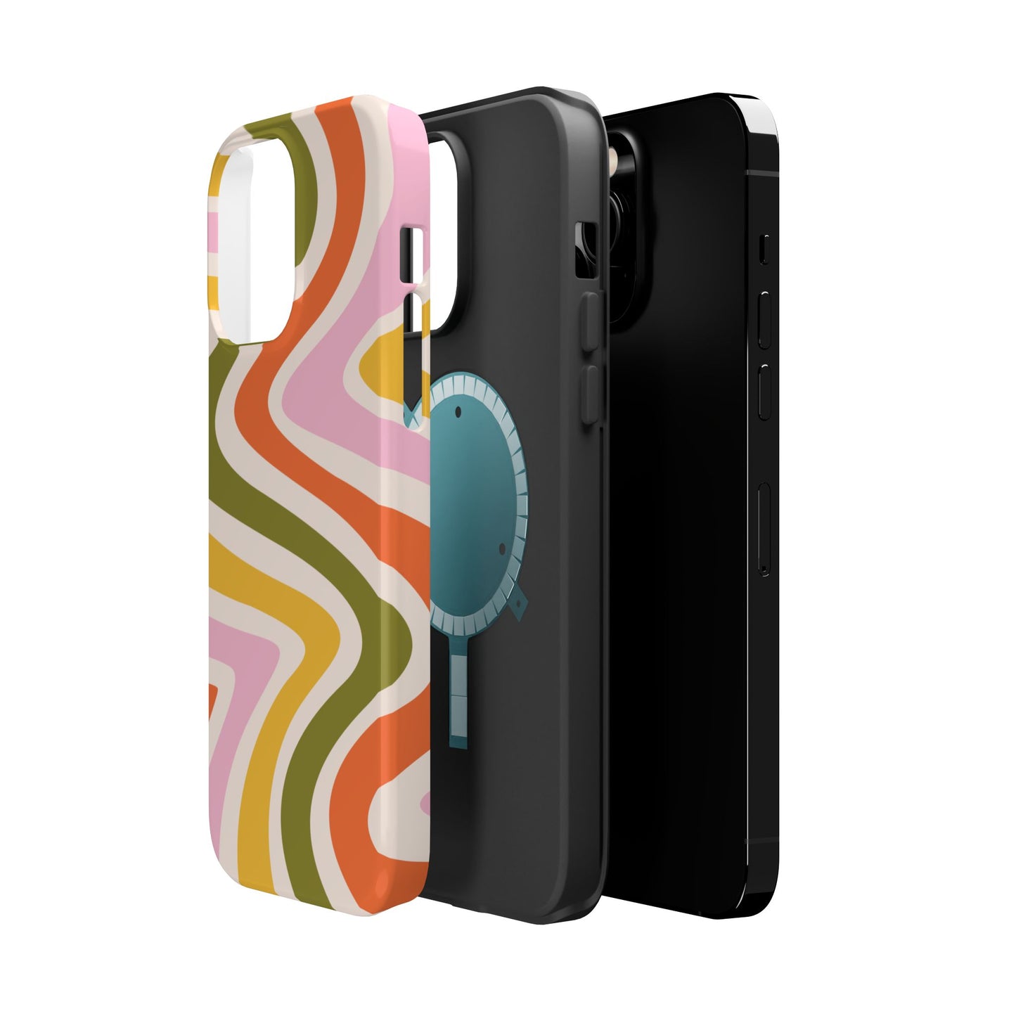 Groove in style with our Retro Groove MagSafe  iPhone Case, featuring a wavy, free-flowing design in warm orange, mustard yellow, olive green, and soft pink tones. This 70s-inspired pattern exudes nostalgic vibes, making it the perfect accessory for those who love vintage style with a modern twist. Built with dual-layer protection, this case combines a sturdy polycarbonate outer shell with a shock-absorbent TPU layer to keep your phone safe from drops and everyday wear.