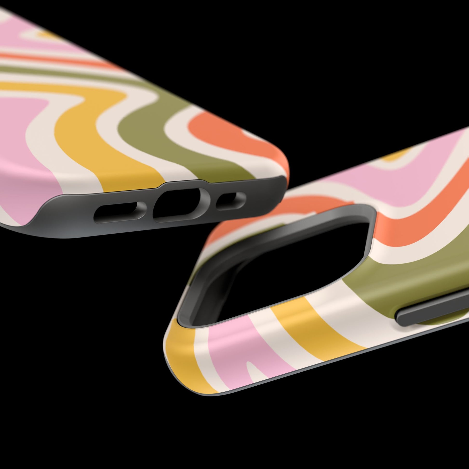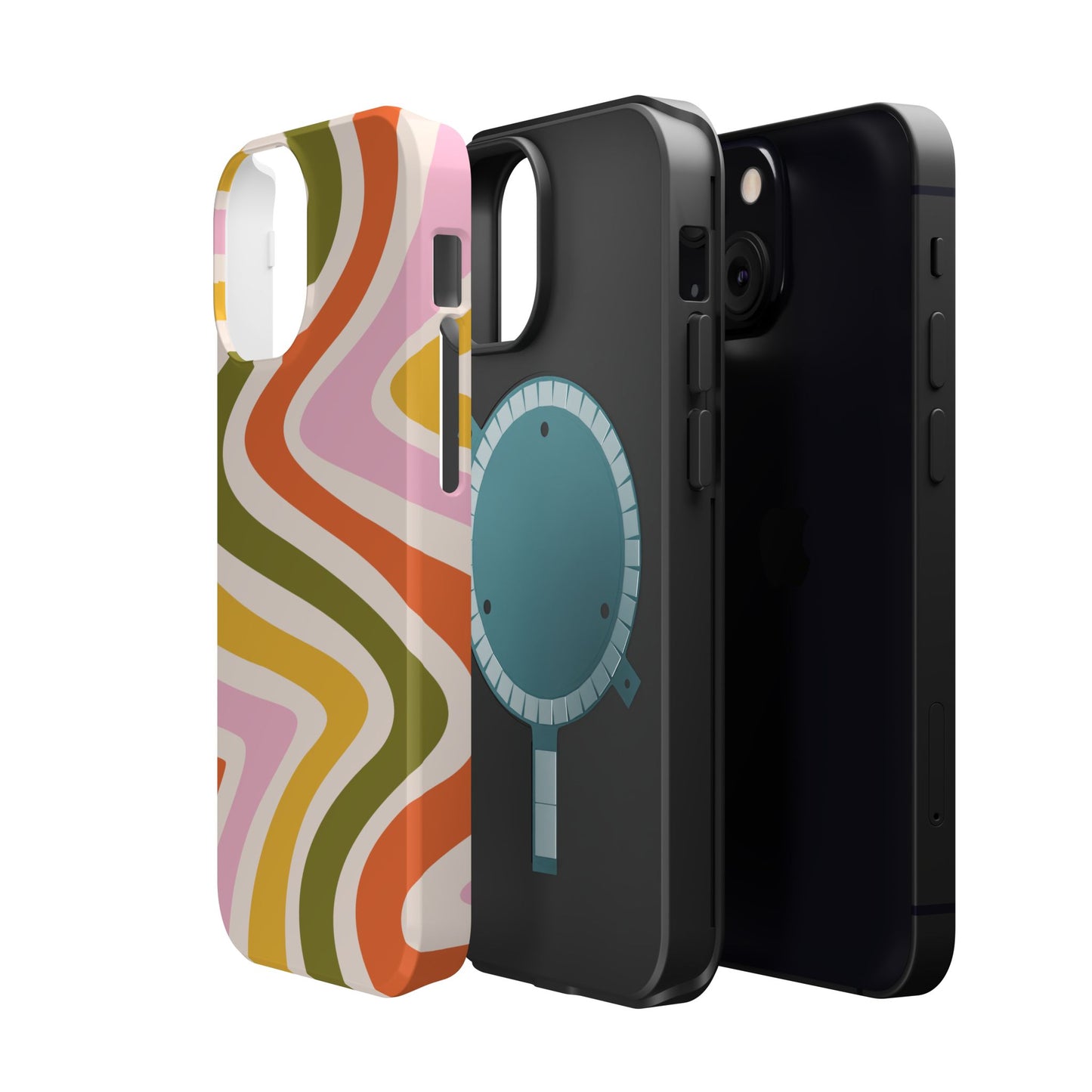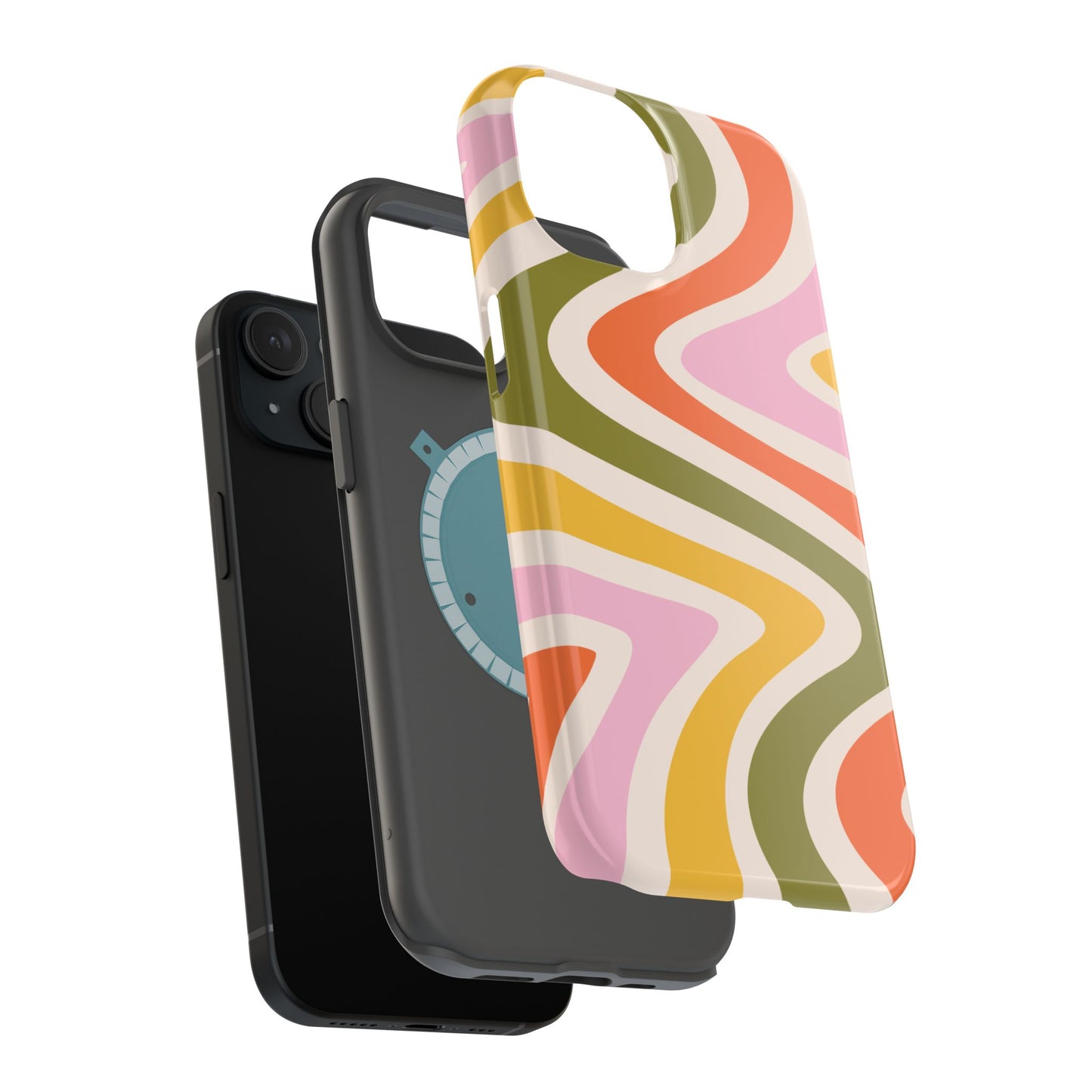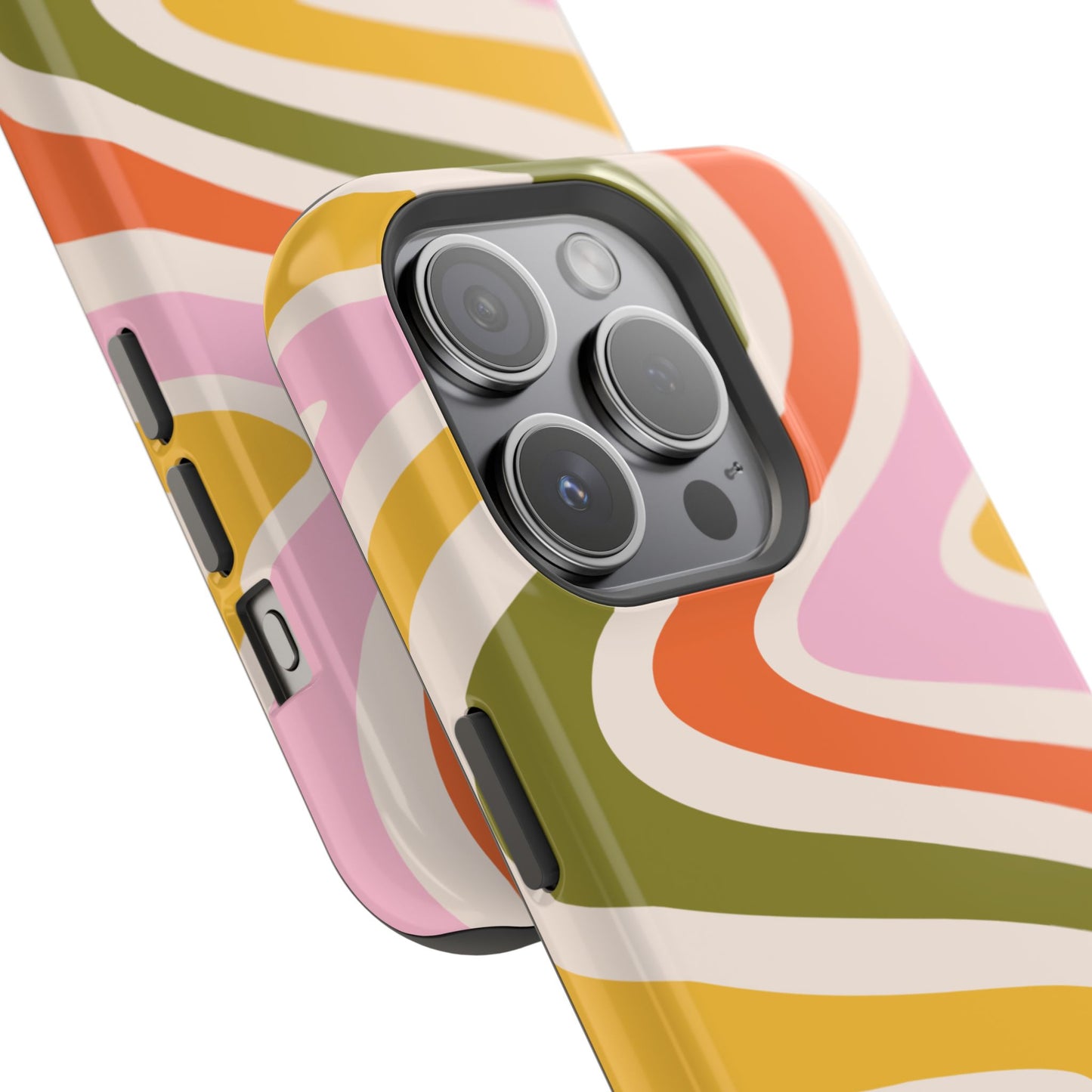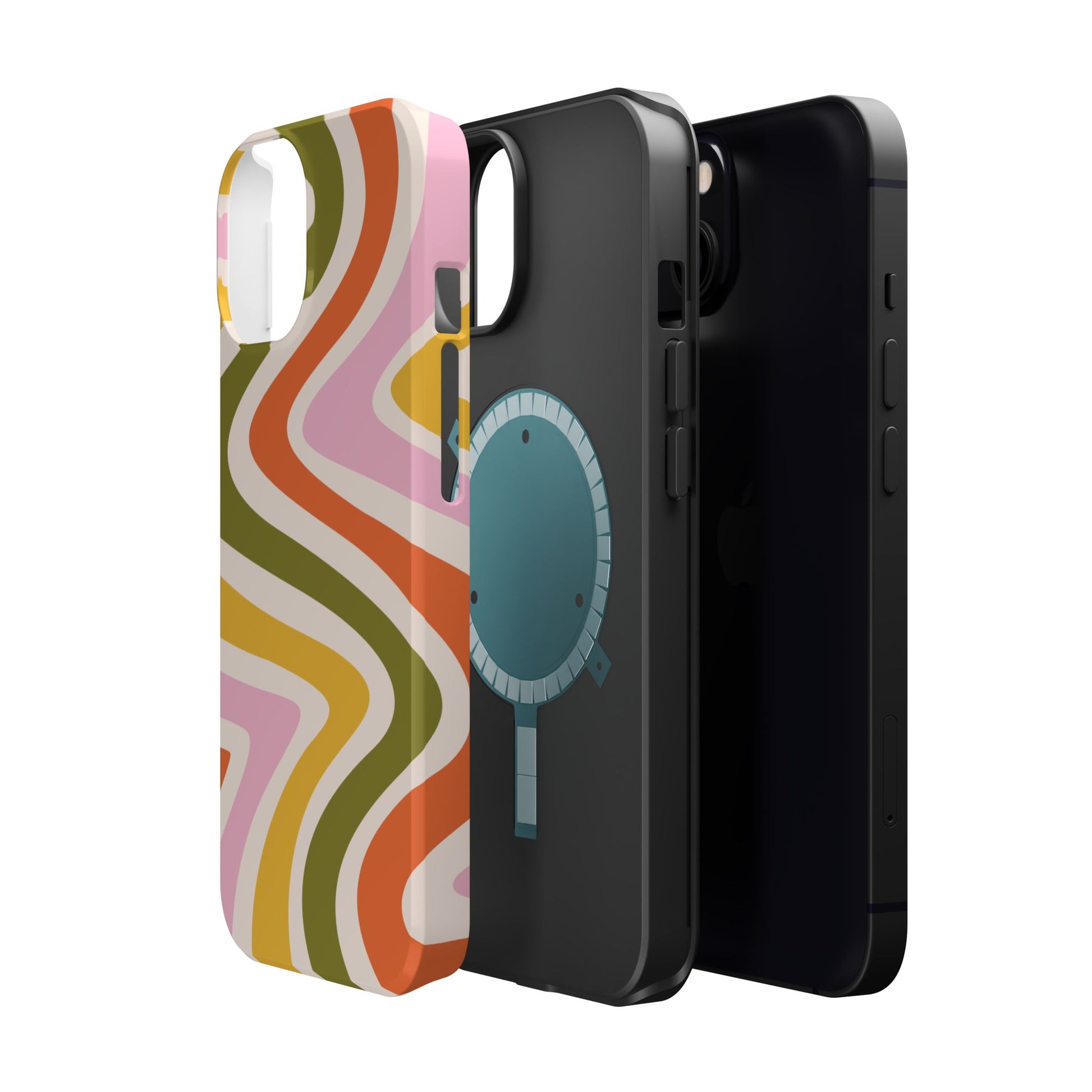 Groove in style with our Retro Groove MagSafe  iPhone Case, featuring a wavy, free-flowing design in warm orange, mustard yellow, olive green, and soft pink tones. This 70s-inspired pattern exudes nostalgic vibes, making it the perfect accessory for those who love vintage style with a modern twist. Built with dual-layer protection, this case combines a sturdy polycarbonate outer shell with a shock-absorbent TPU layer to keep your phone safe from drops and everyday wear.
