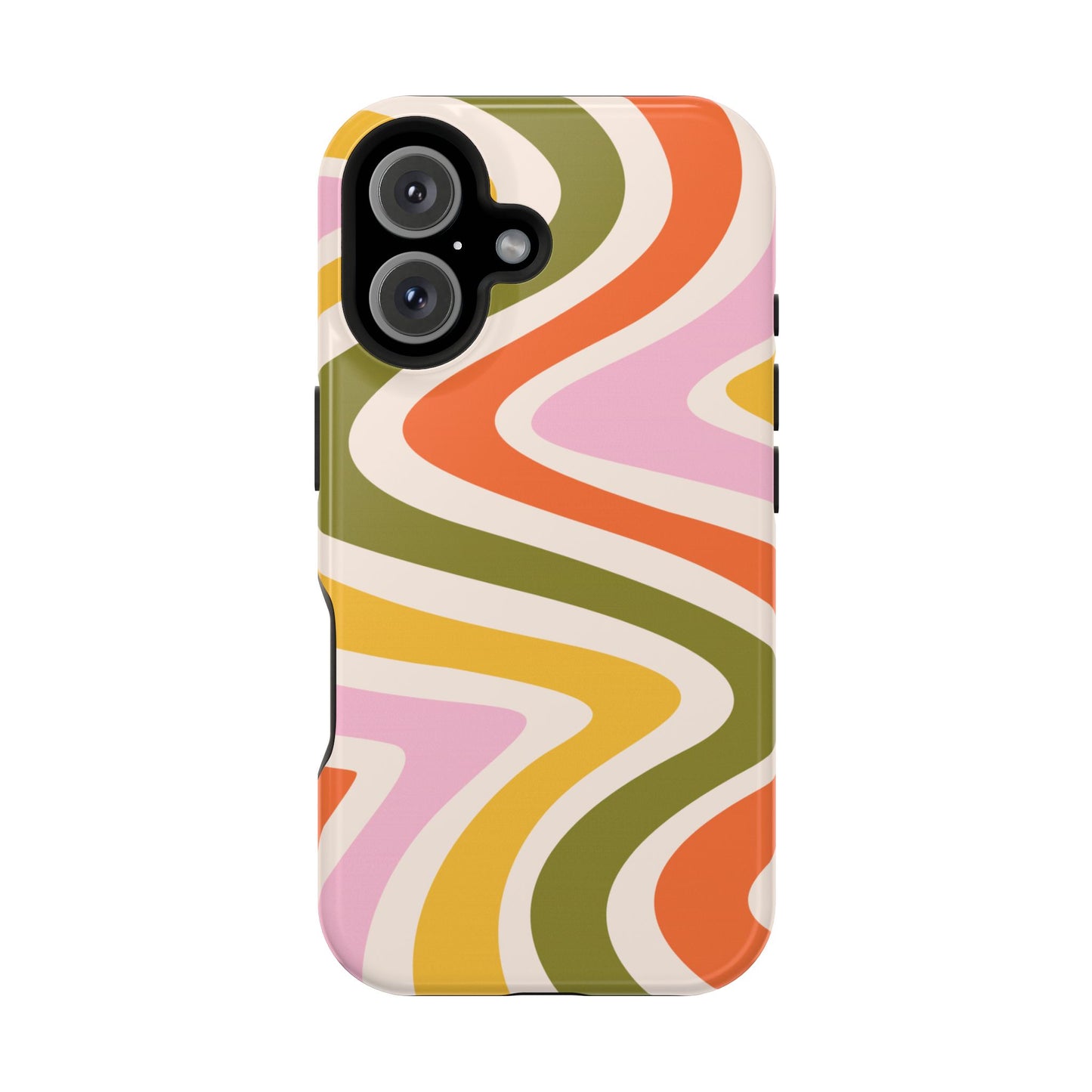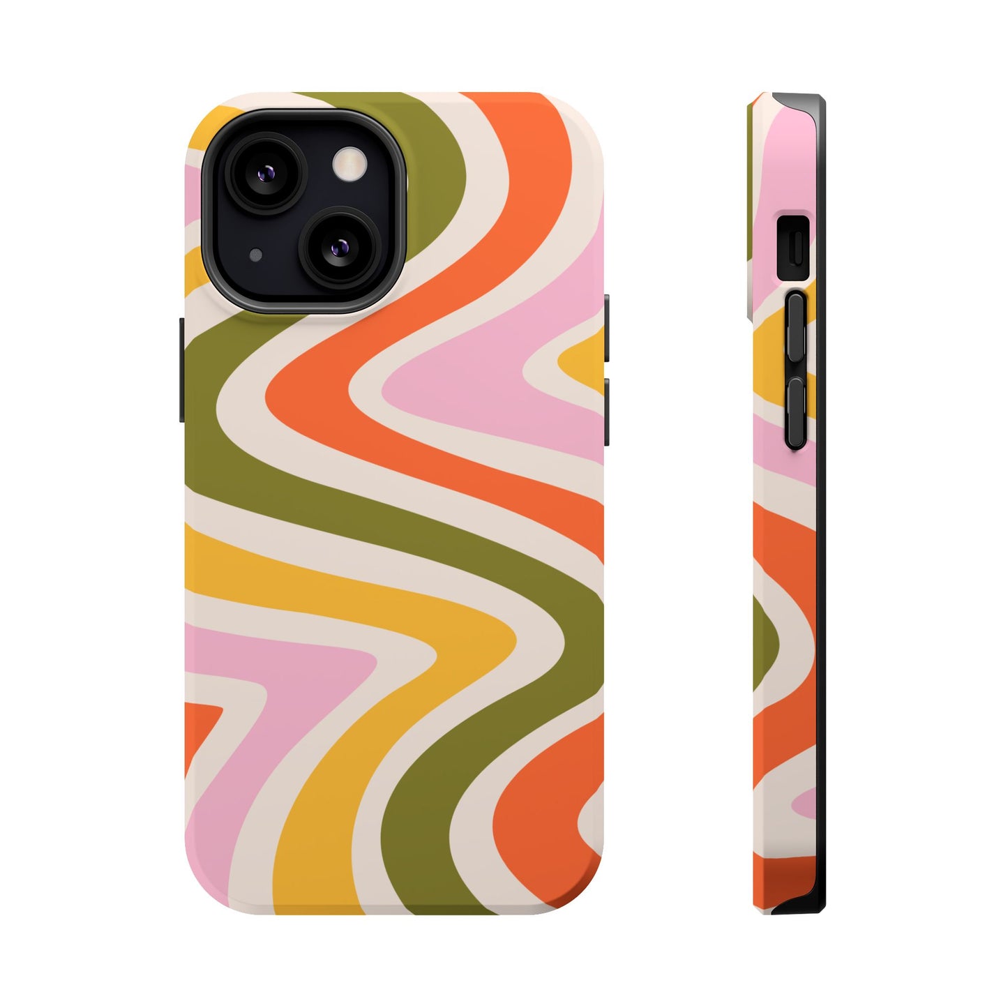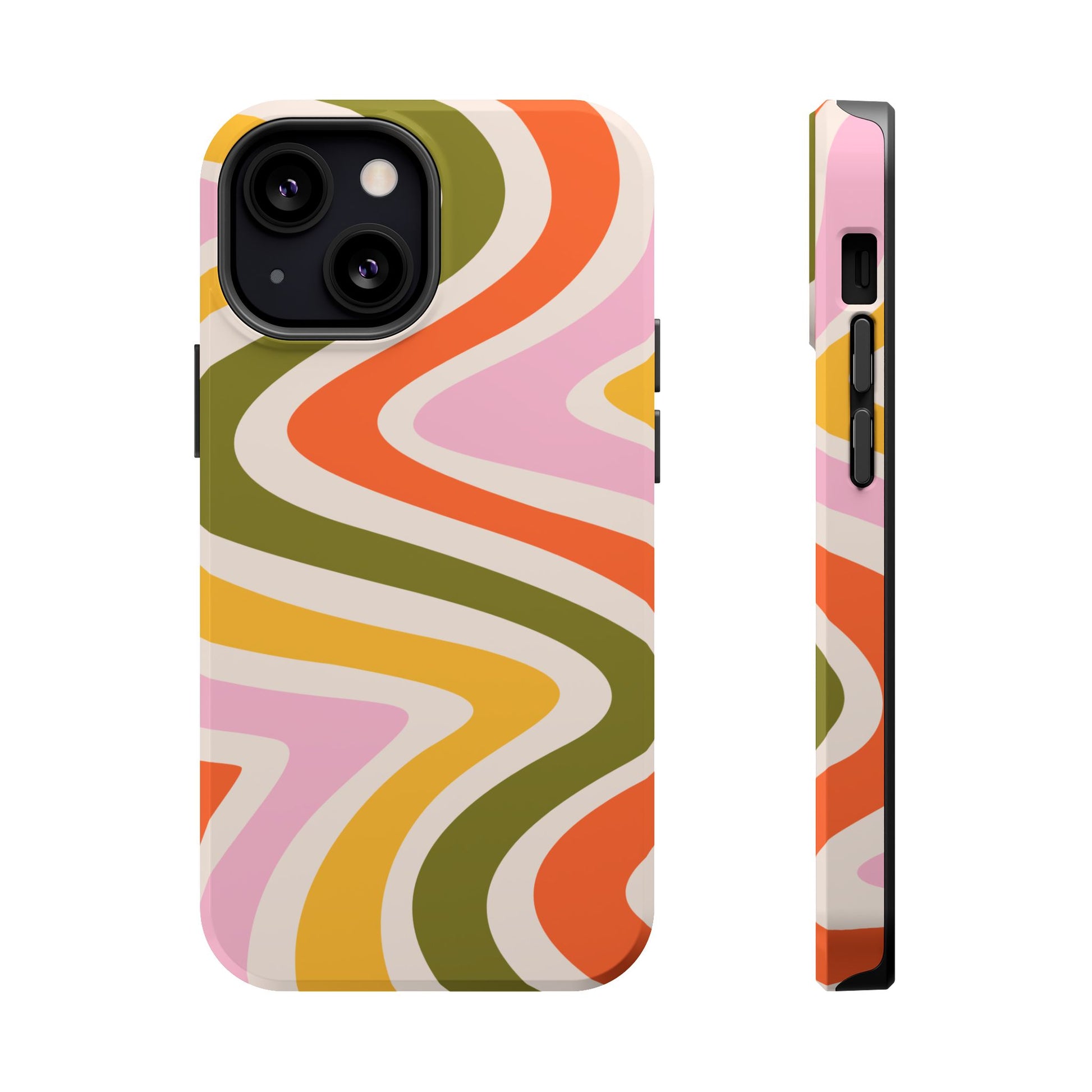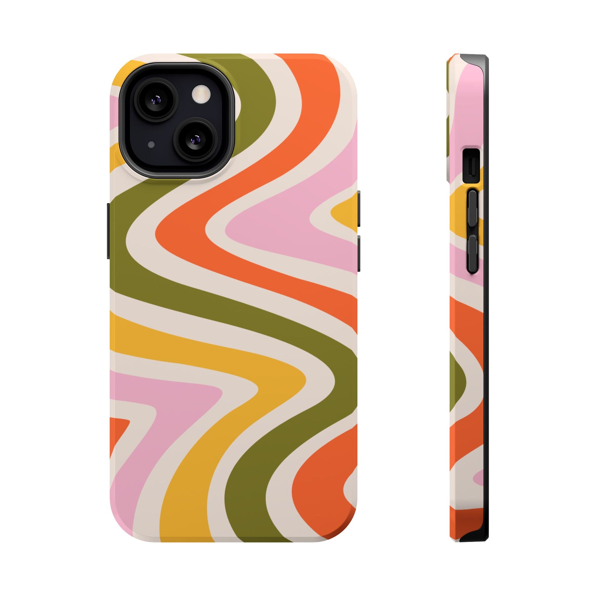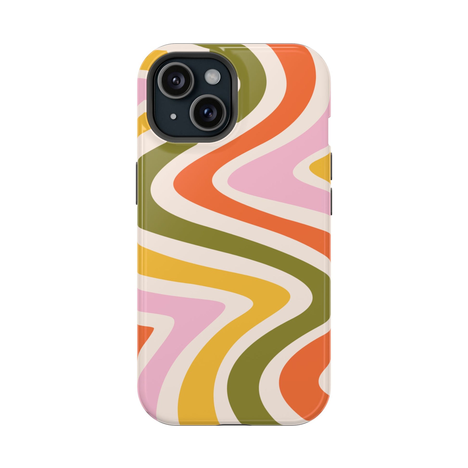 Groove in style with our Retro Groove MagSafe iPhone Case, featuring a wavy, free-flowing design in warm orange, mustard yellow, olive green, and soft pink tones. This 70s-inspired pattern exudes nostalgic vibes, making it the perfect accessory for those who love vintage style with a modern twist. Built with dual-layer protection, this case combines a sturdy polycarbonate outer shell with a shock-absorbent TPU layer to keep your phone safe from drops and everyday wear.