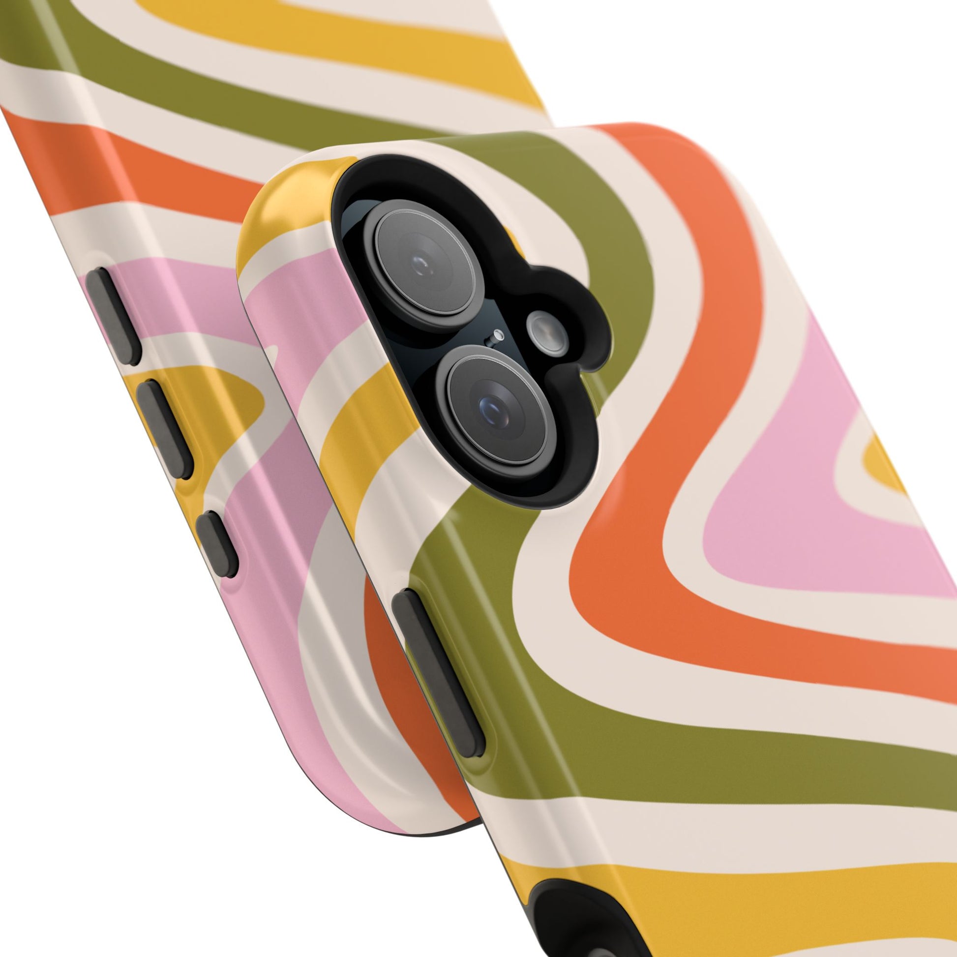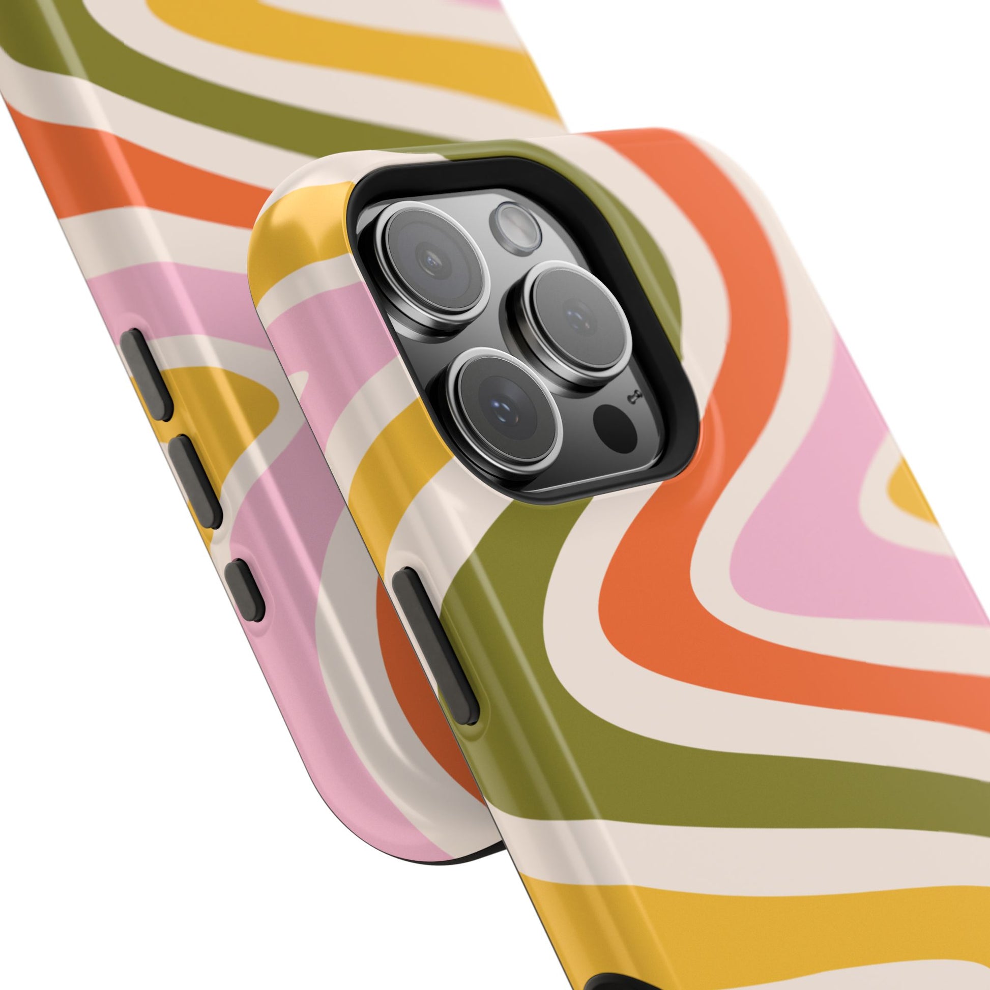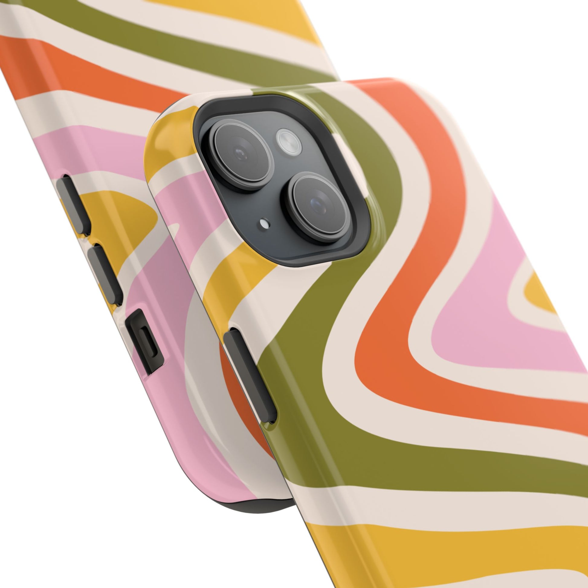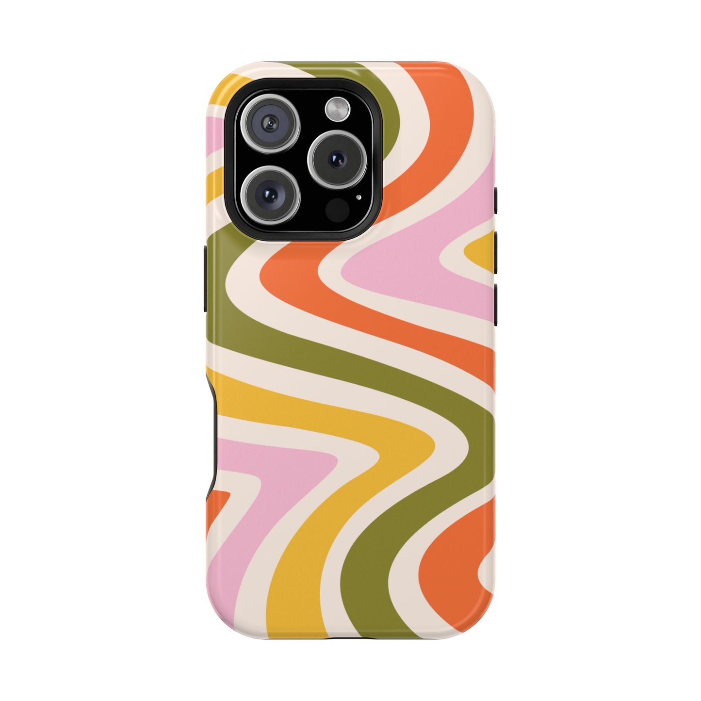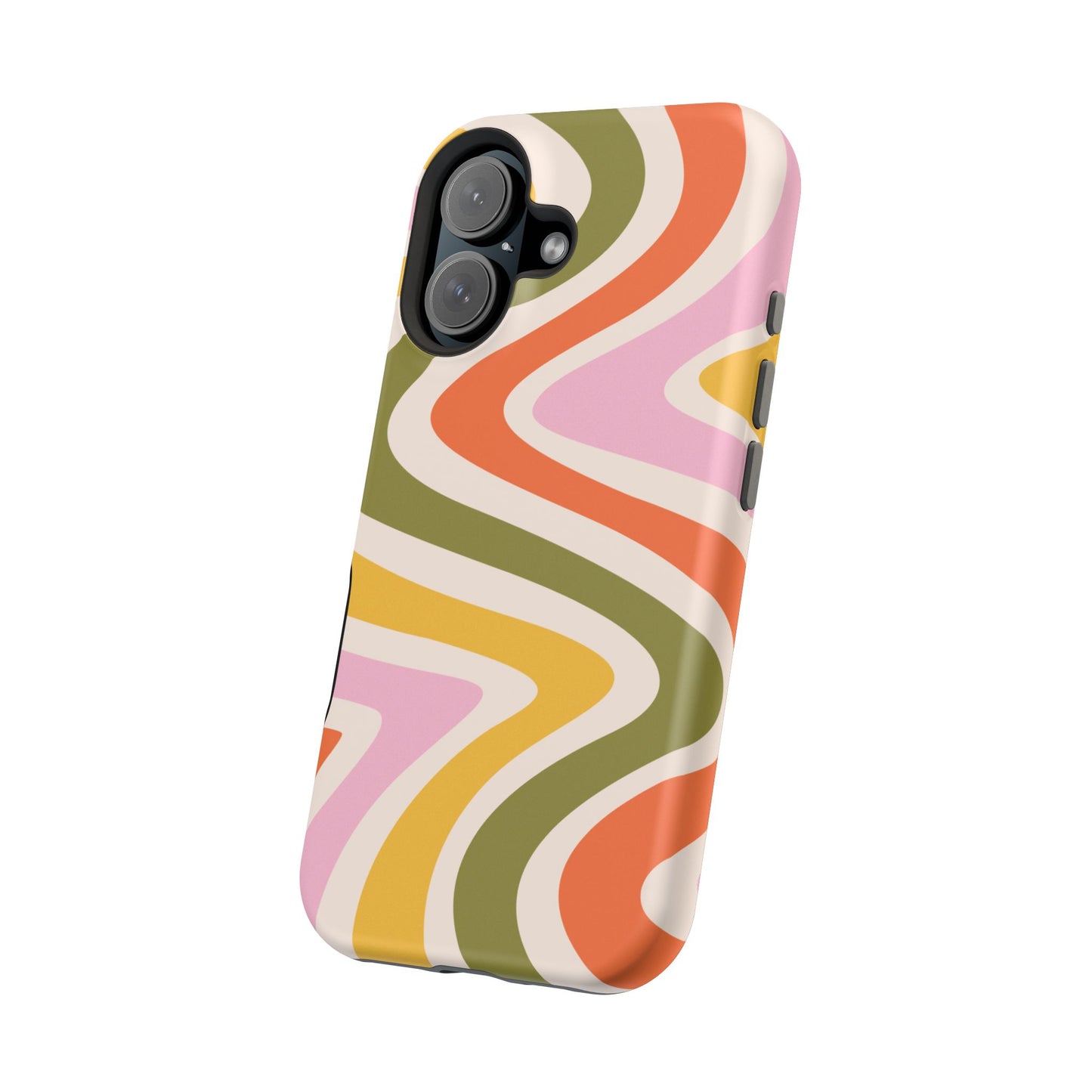 Groove in style with our Retro Groove MagSafe iPhone Case, featuring a wavy, free-flowing design in warm orange, mustard yellow, olive green, and soft pink tones. This 70s-inspired pattern exudes nostalgic vibes, making it the perfect accessory for those who love vintage style with a modern twist. Built with dual-layer protection, this case combines a sturdy polycarbonate outer shell with a shock-absorbent TPU layer to keep your phone safe from drops and everyday wear.
