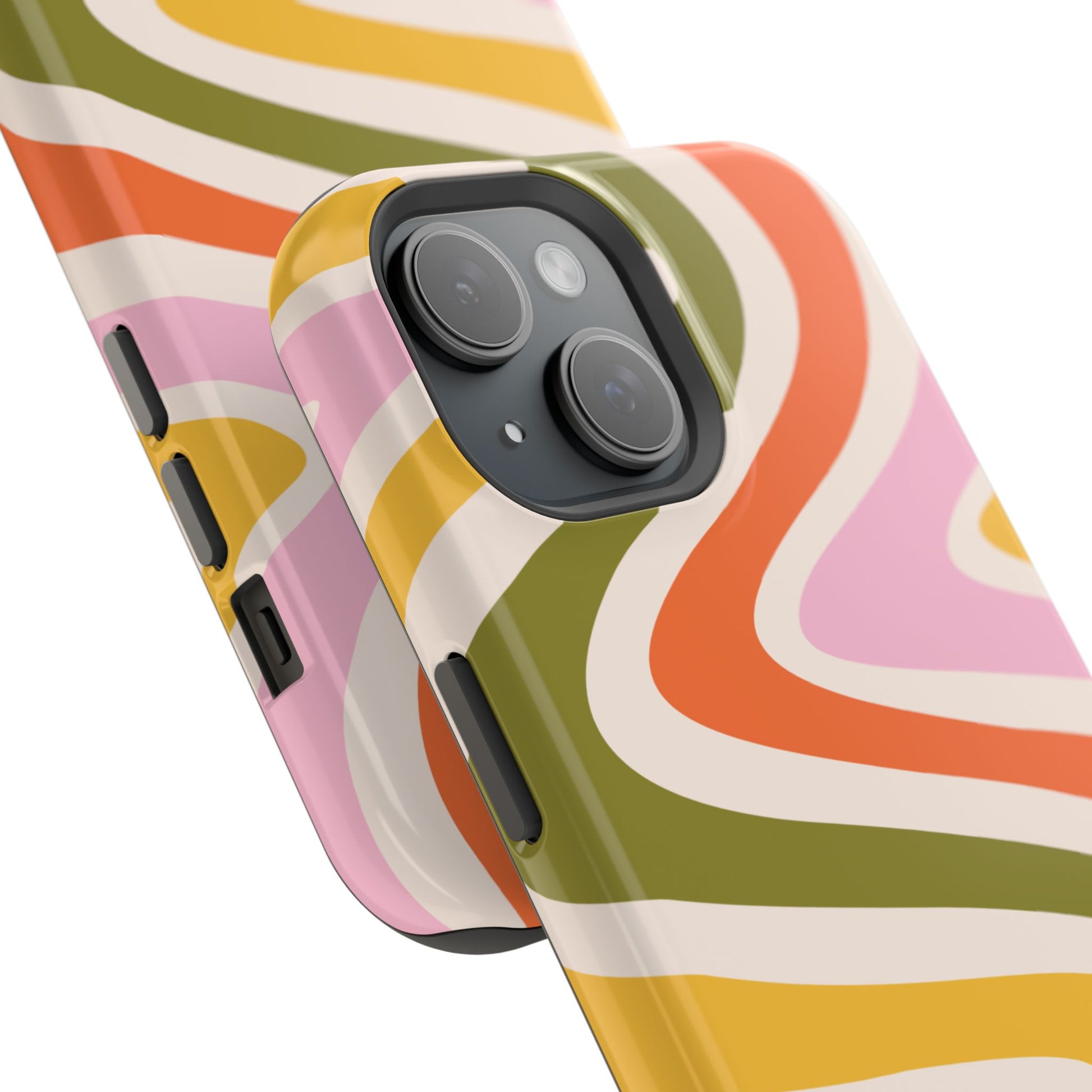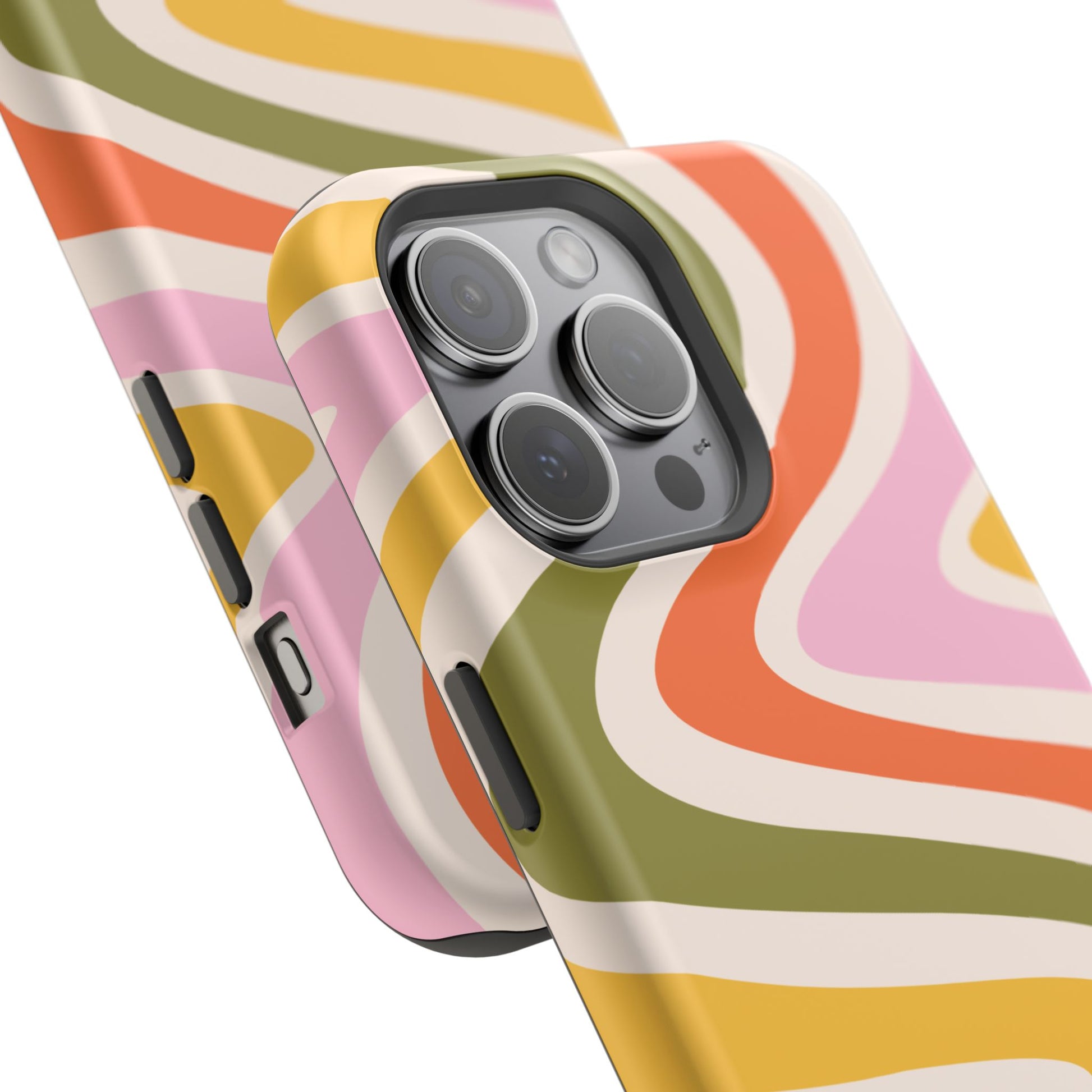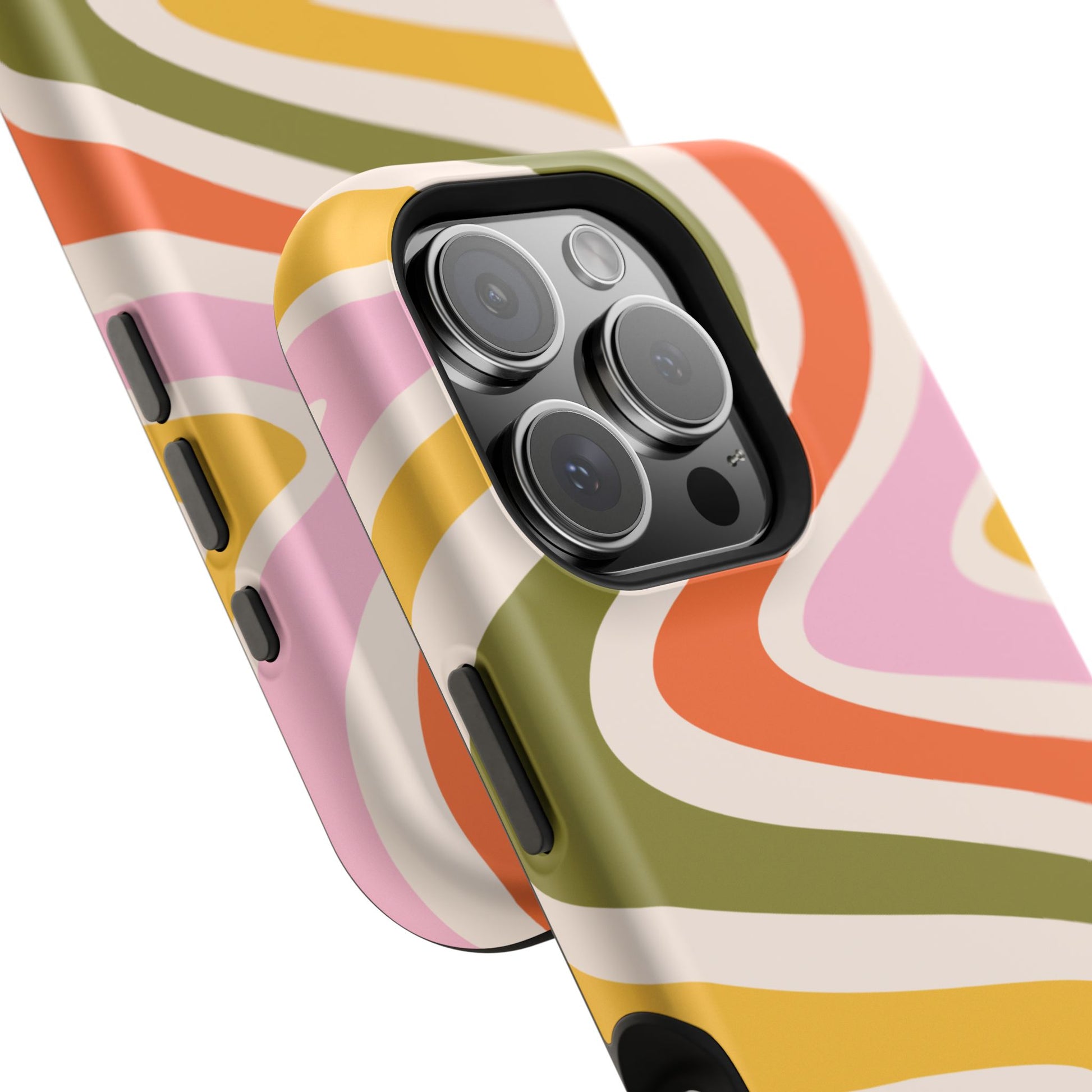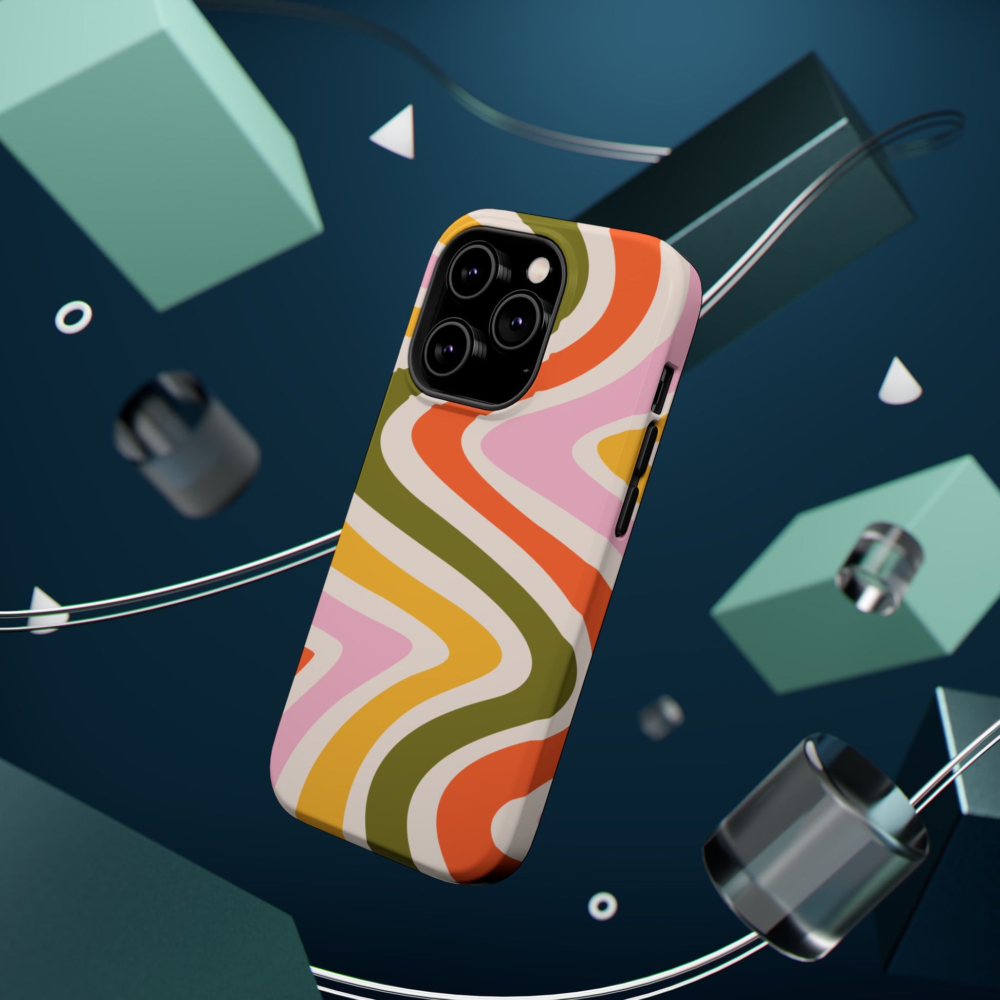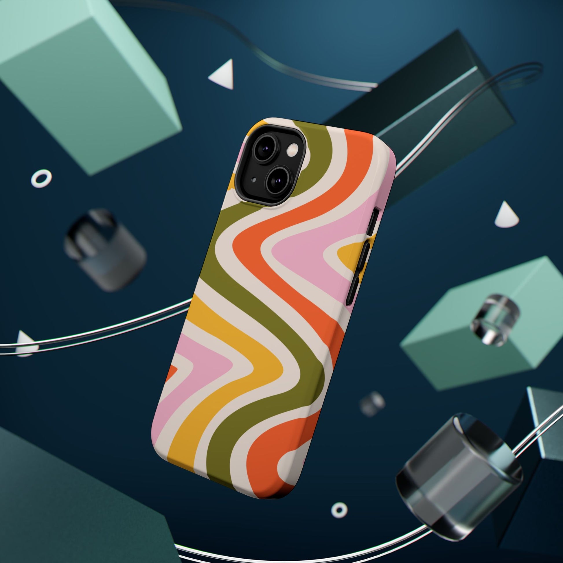 Groove in style with our Retro Groove MagSafe iPhone Case, featuring a wavy, free-flowing design in warm orange, mustard yellow, olive green, and soft pink tones. This 70s-inspired pattern exudes nostalgic vibes, making it the perfect accessory for those who love vintage style with a modern twist. Built with dual-layer protection, this case combines a sturdy polycarbonate outer shell with a shock-absorbent TPU layer to keep your phone safe from drops and everyday wear.