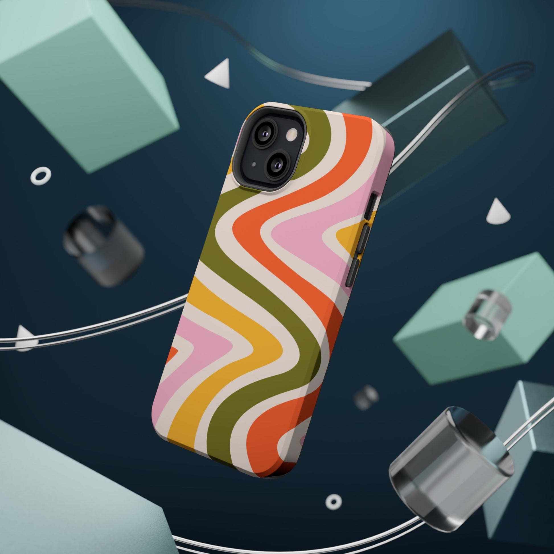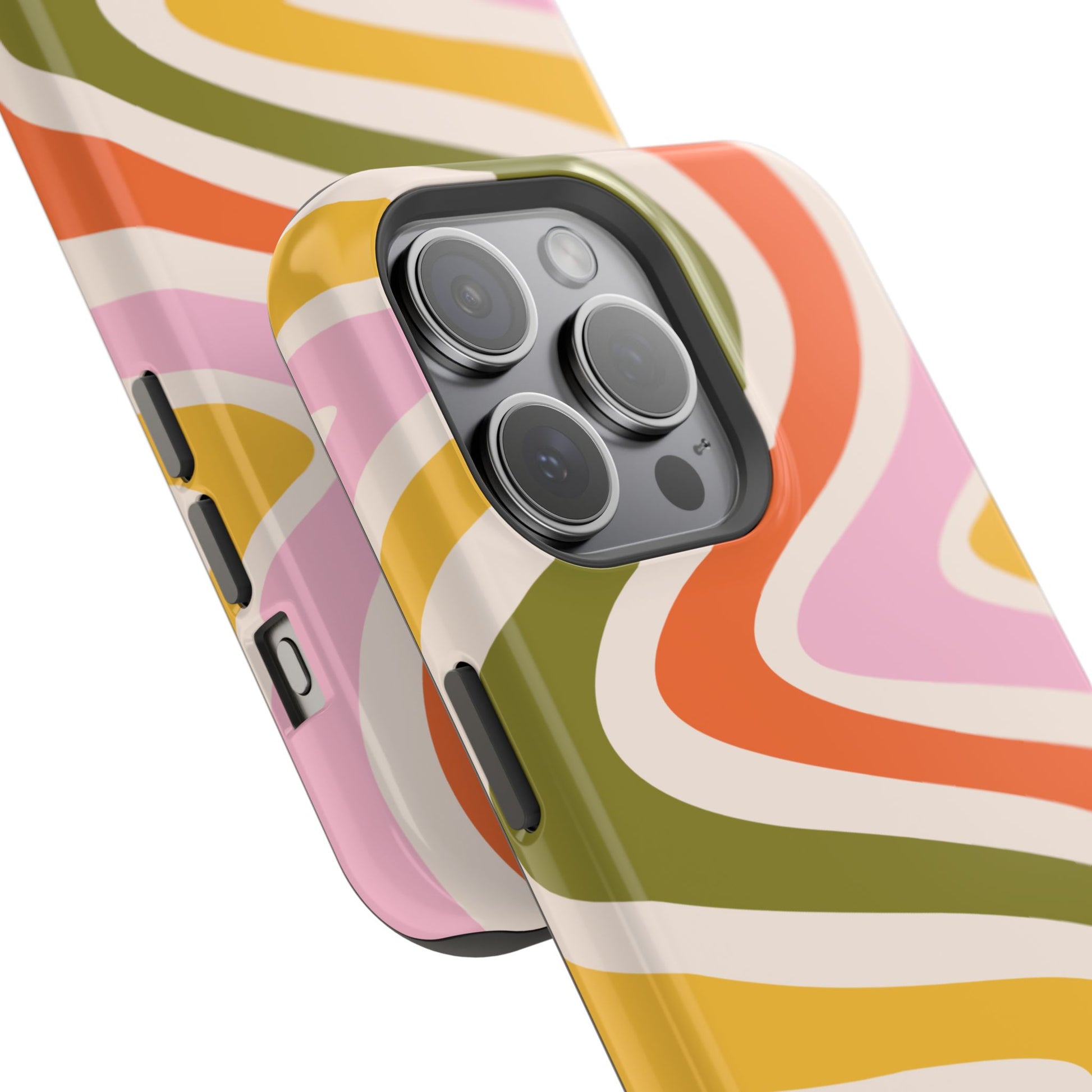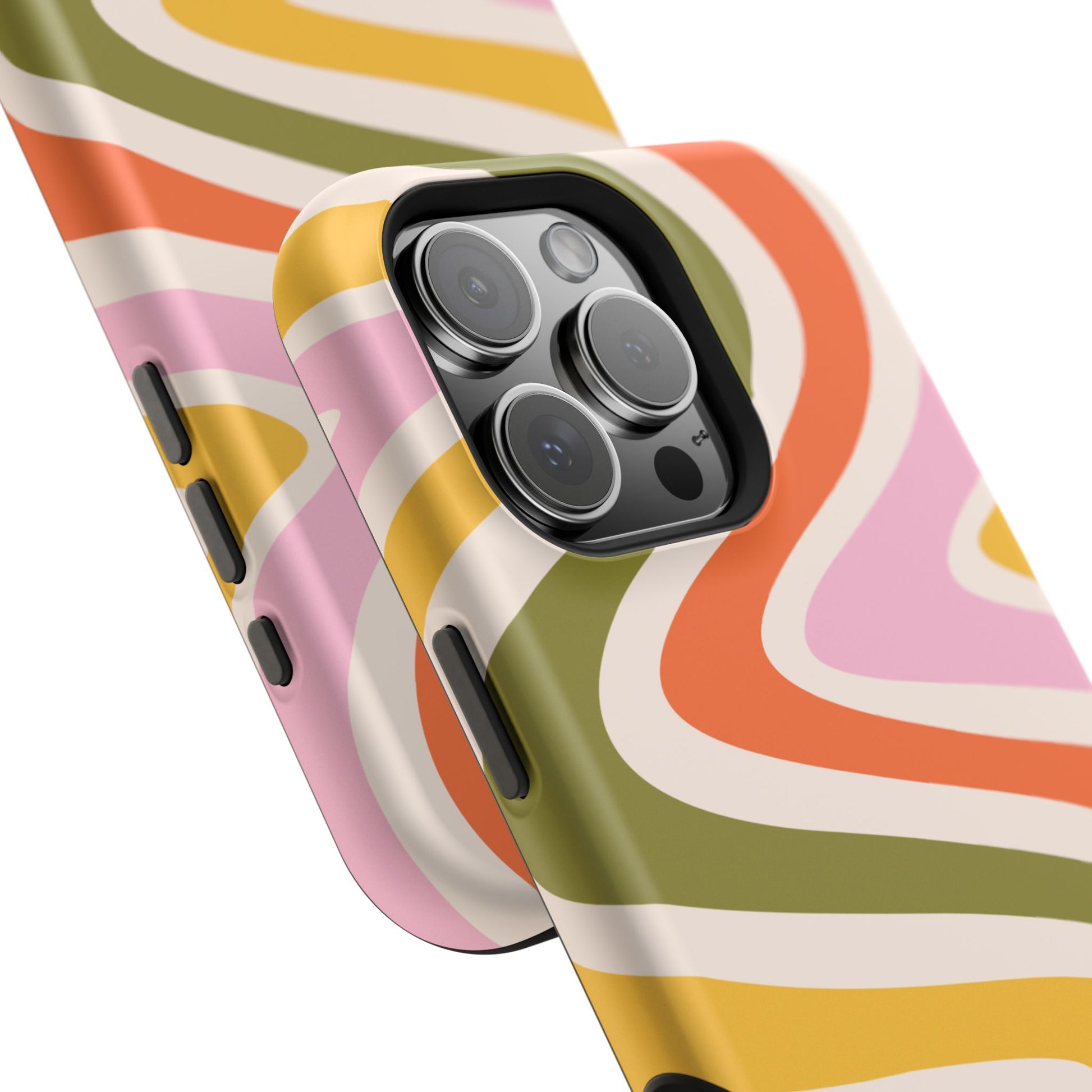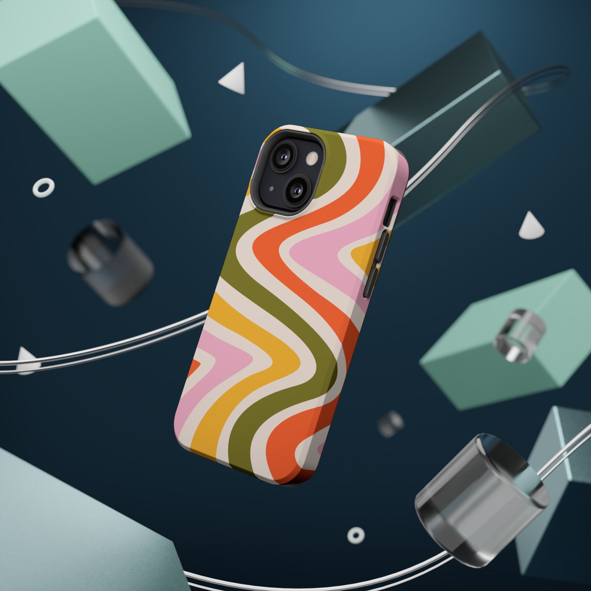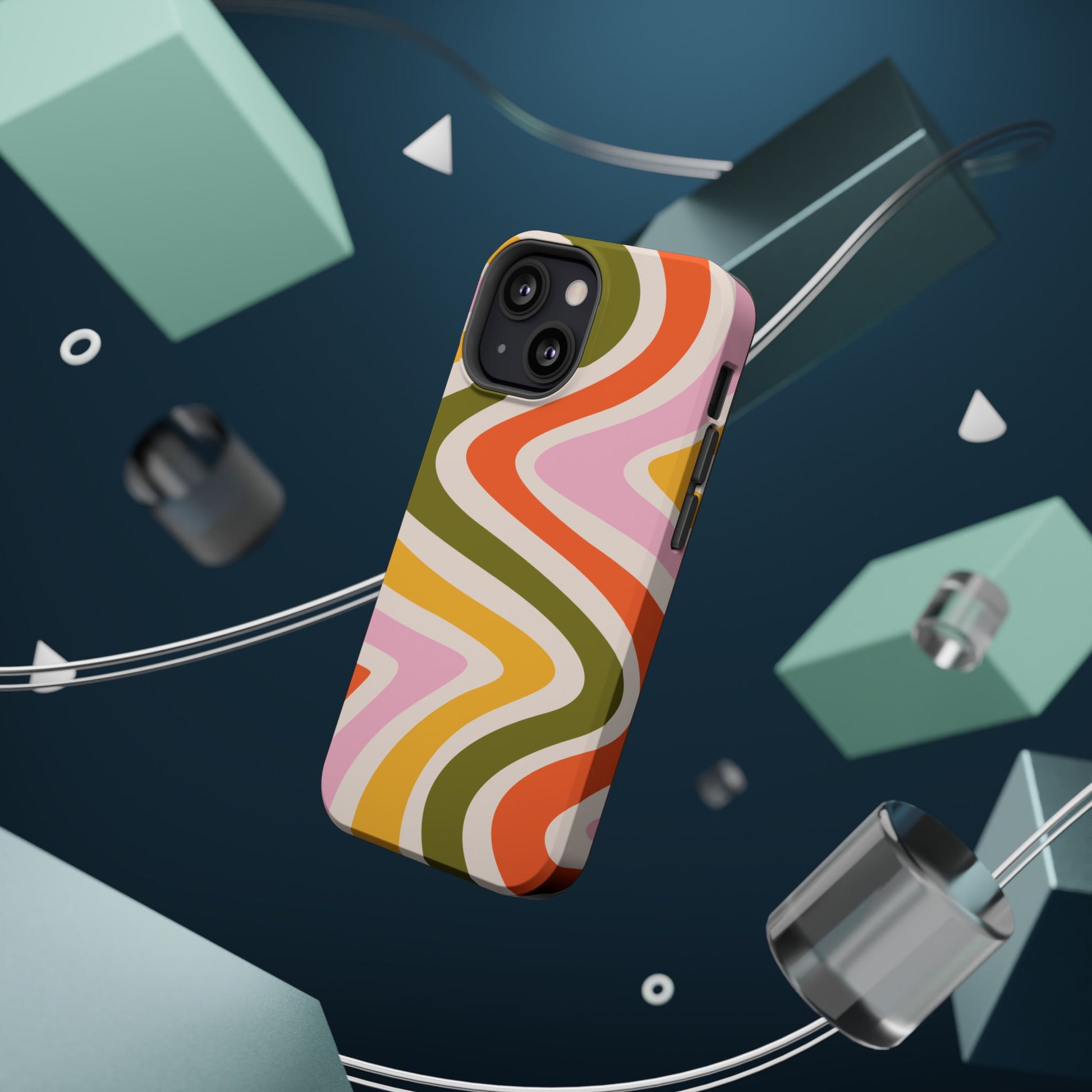 Groove in style with our Retro Groove MagSafe iPhone Case, featuring a wavy, free-flowing design in warm orange, mustard yellow, olive green, and soft pink tones. This 70s-inspired pattern exudes nostalgic vibes, making it the perfect accessory for those who love vintage style with a modern twist. Built with dual-layer protection, this case combines a sturdy polycarbonate outer shell with a shock-absorbent TPU layer to keep your phone safe from drops and everyday wear.