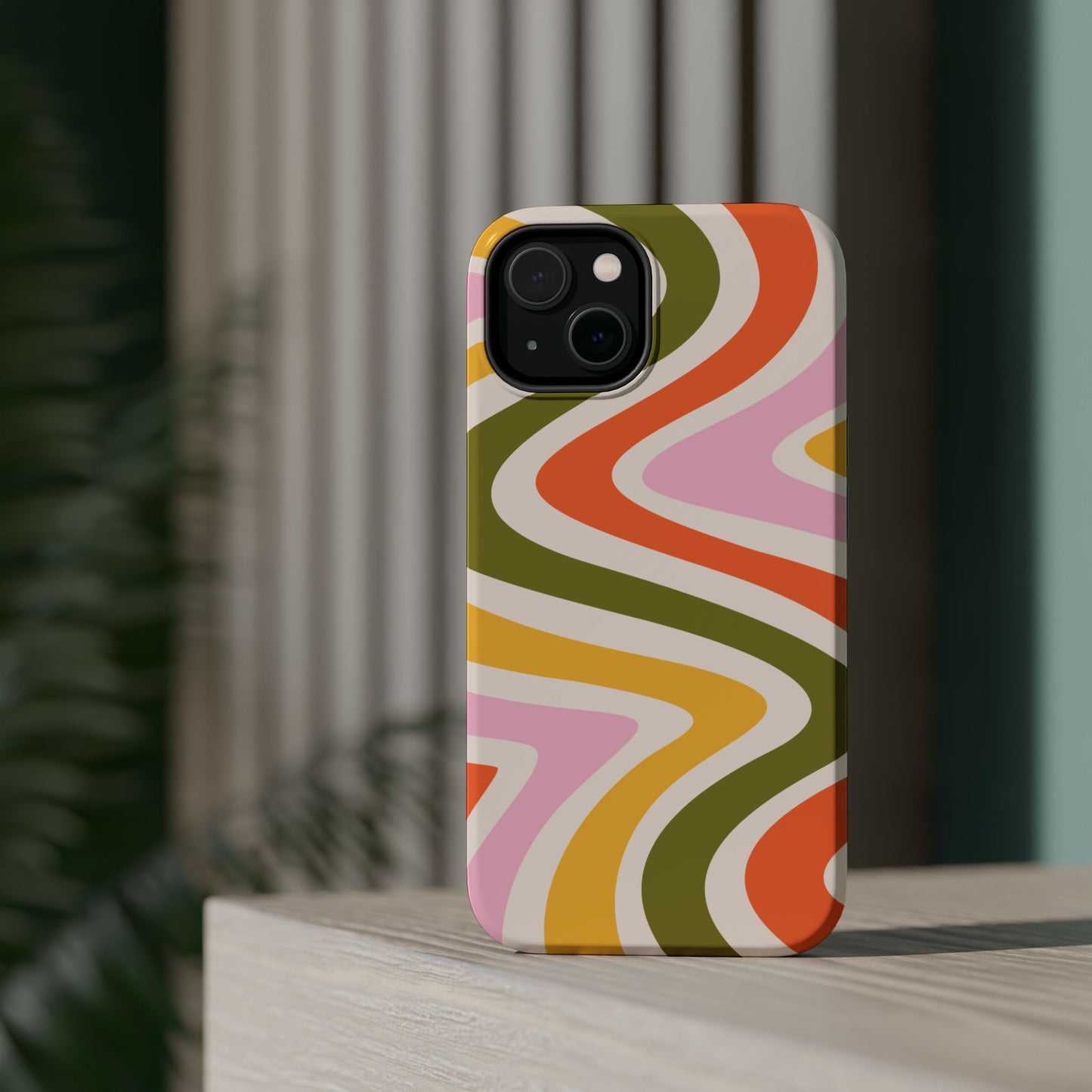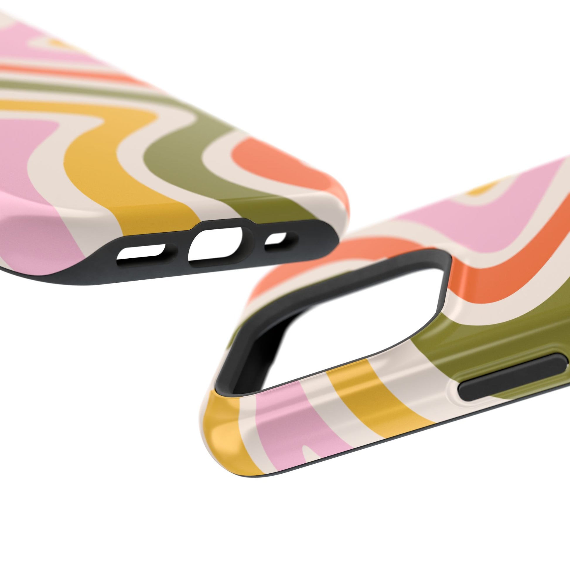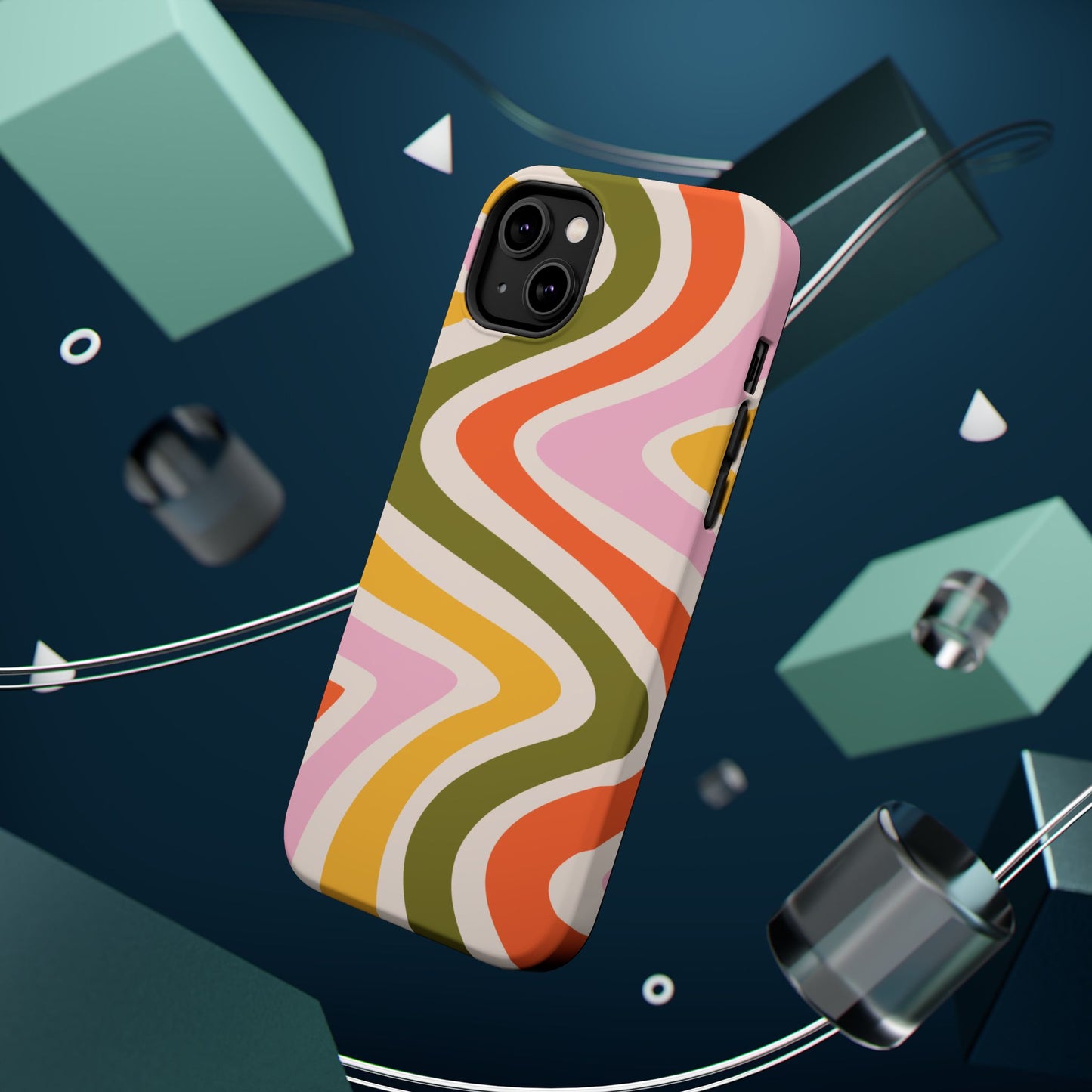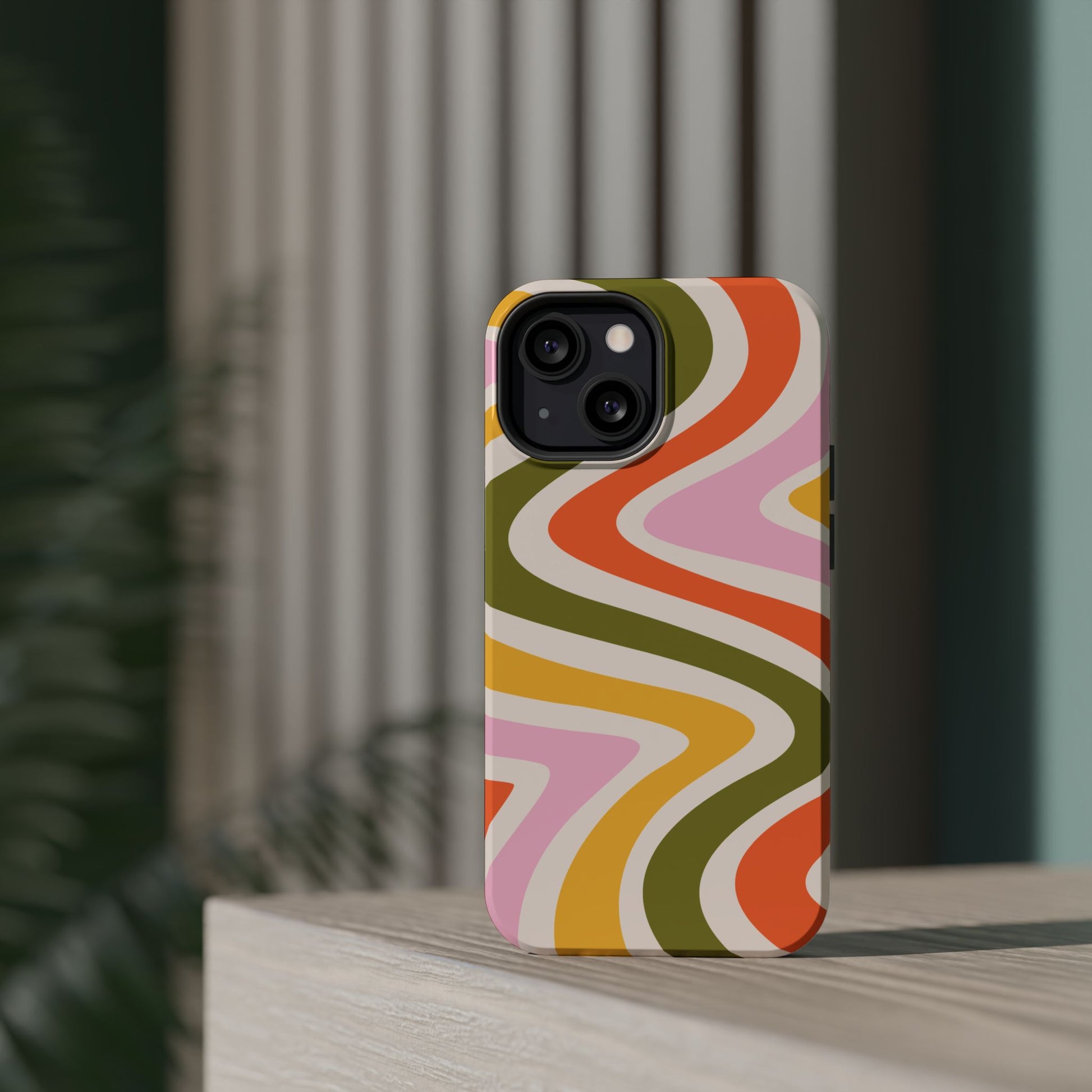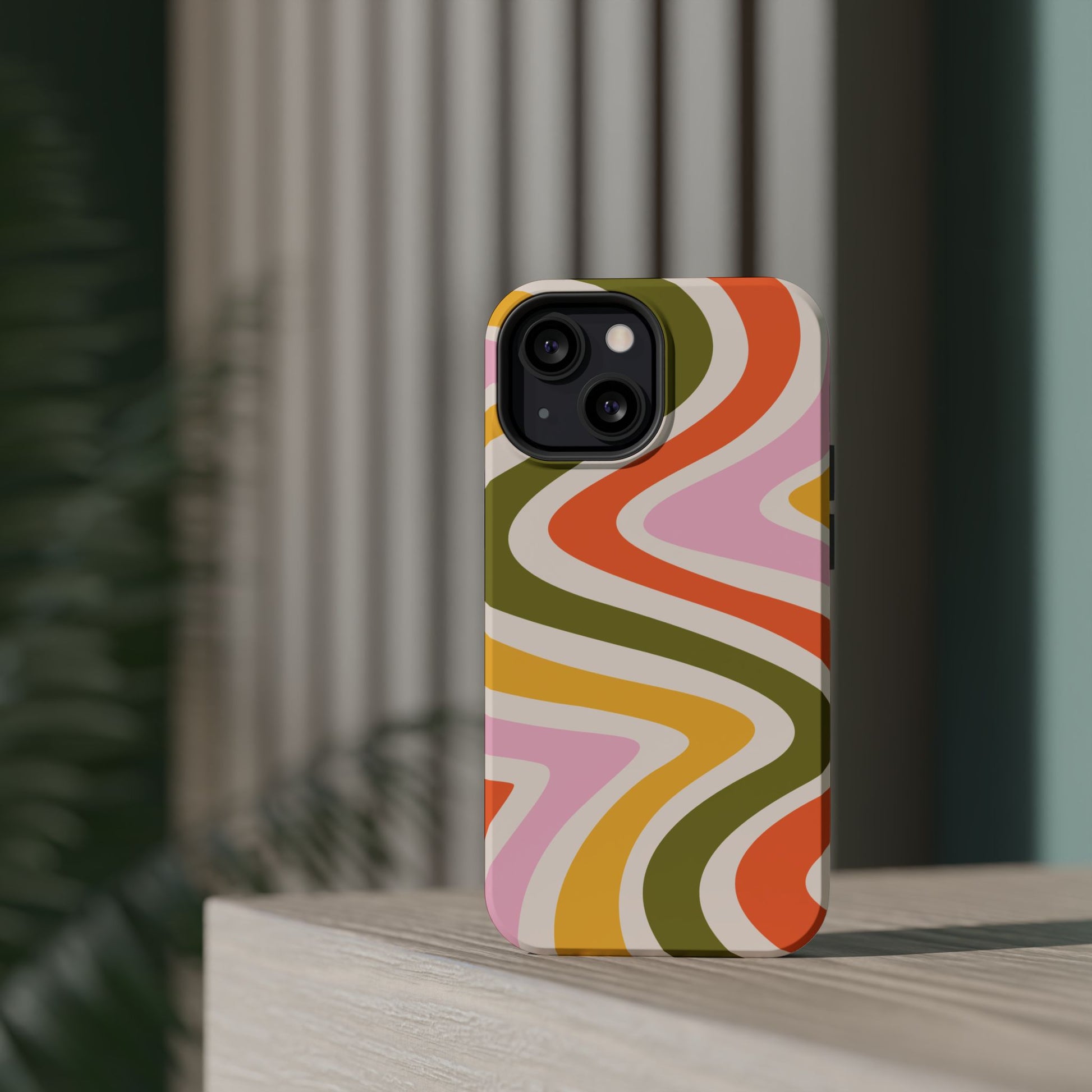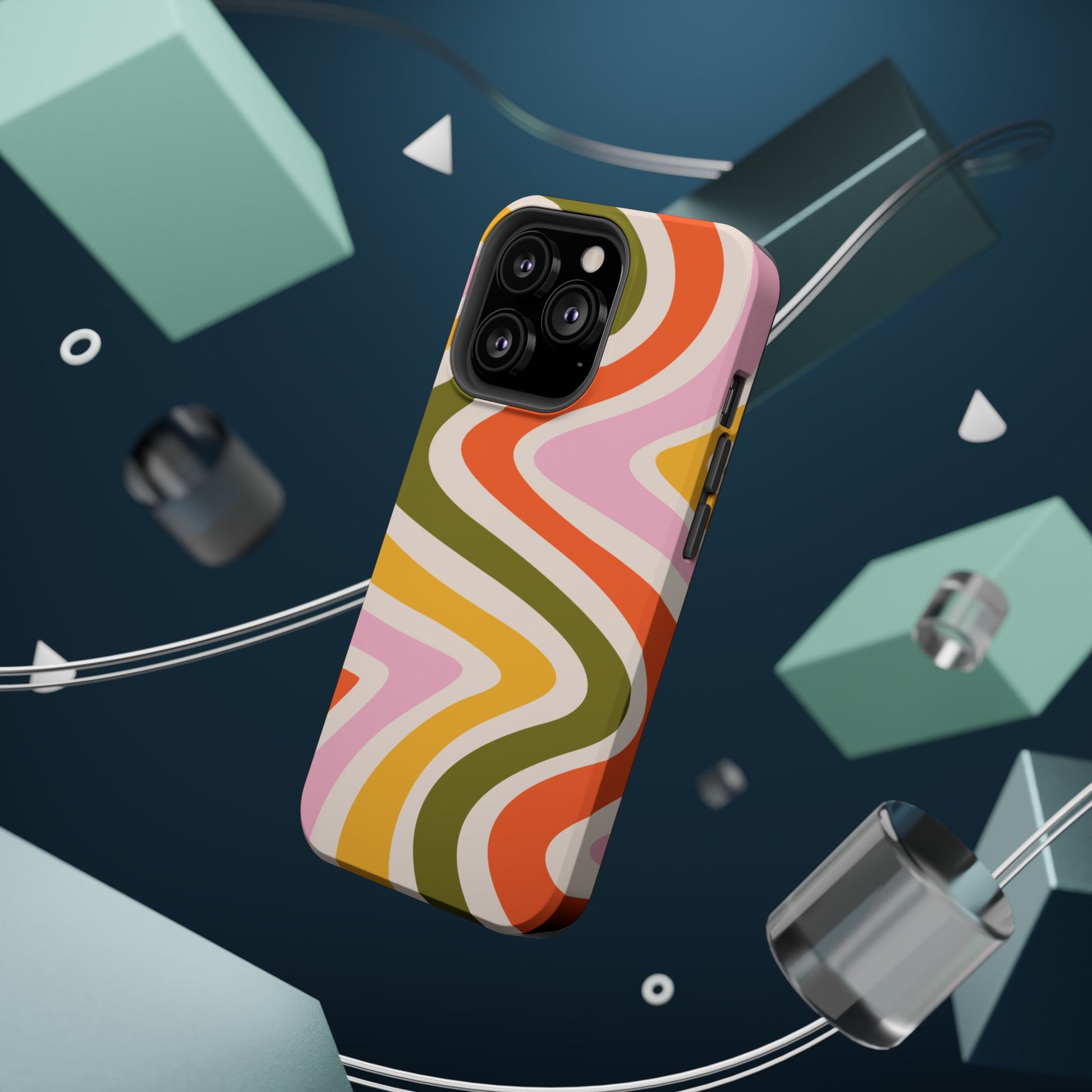Groove in style with our Retro Groove MagSafe iPhone Case, featuring a wavy, free-flowing design in warm orange, mustard yellow, olive green, and soft pink tones. This 70s-inspired pattern exudes nostalgic vibes, making it the perfect accessory for those who love vintage style with a modern twist. Built with dual-layer protection, this case combines a sturdy polycarbonate outer shell with a shock-absorbent TPU layer to keep your phone safe from drops and everyday wear.