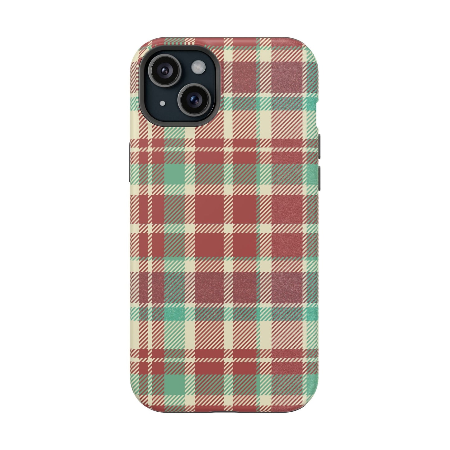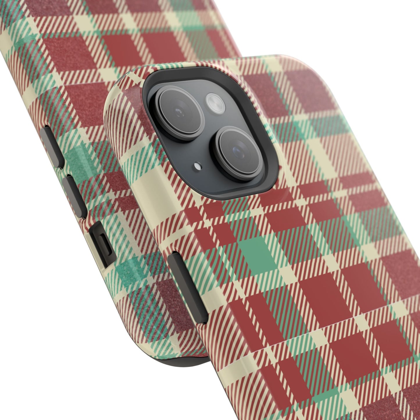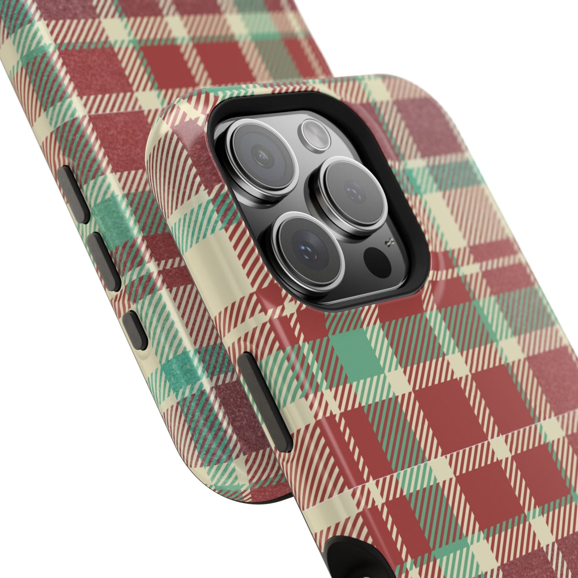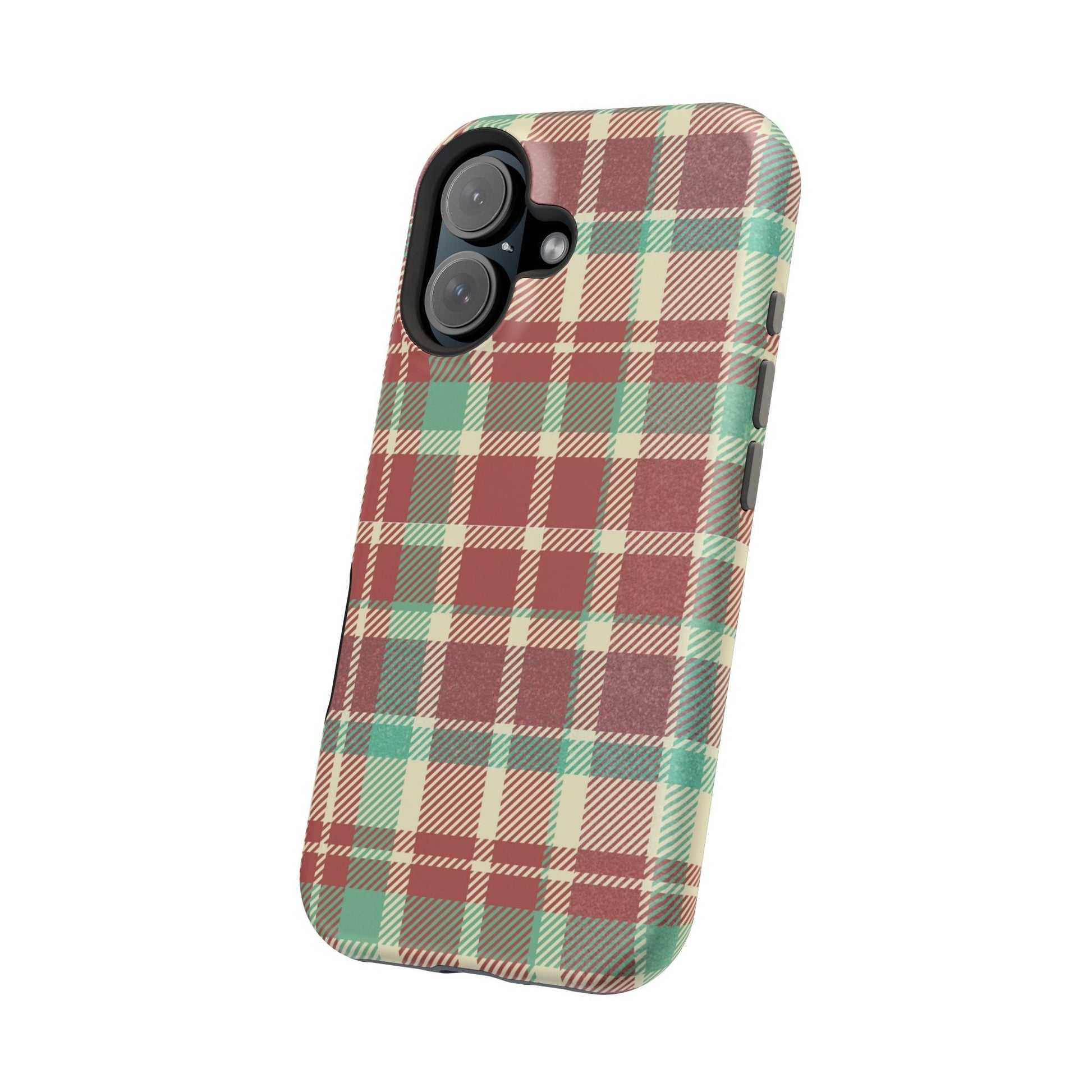 Enhance your MagSafe iPhone with the Retro Red & Cream Plaid Case. This charming case features a cozy plaid design in red, cream, and teal tones, exuding vintage appeal. MagSafe-compatible and drop-tested, it combines elegant style with effortless functionality for everyday use.