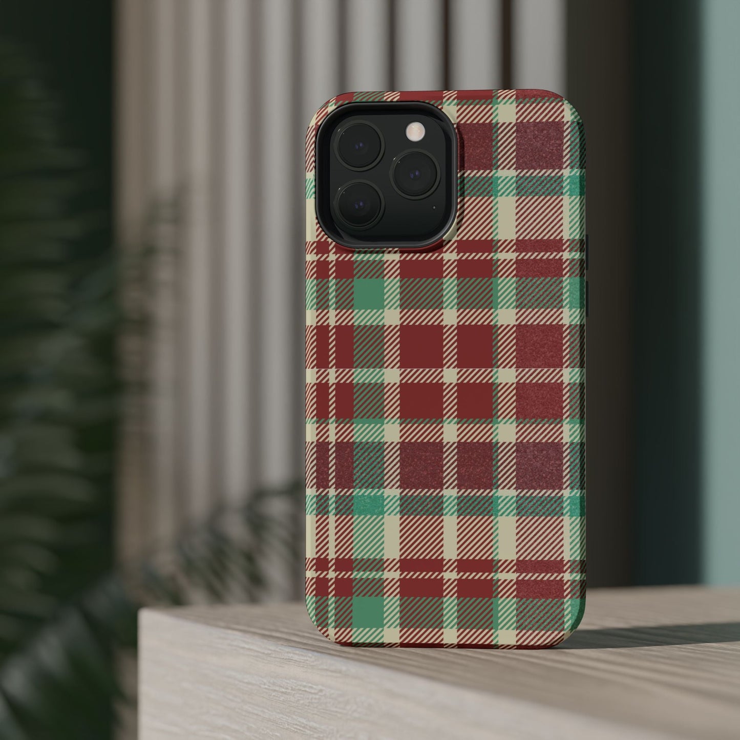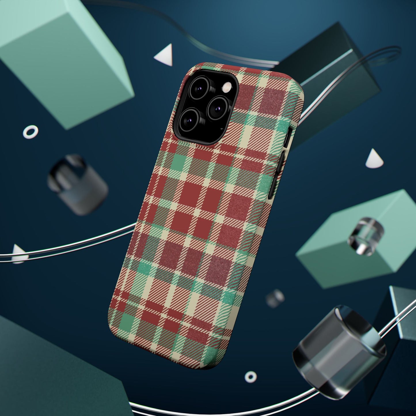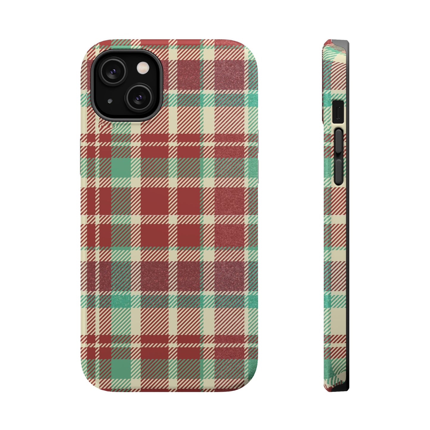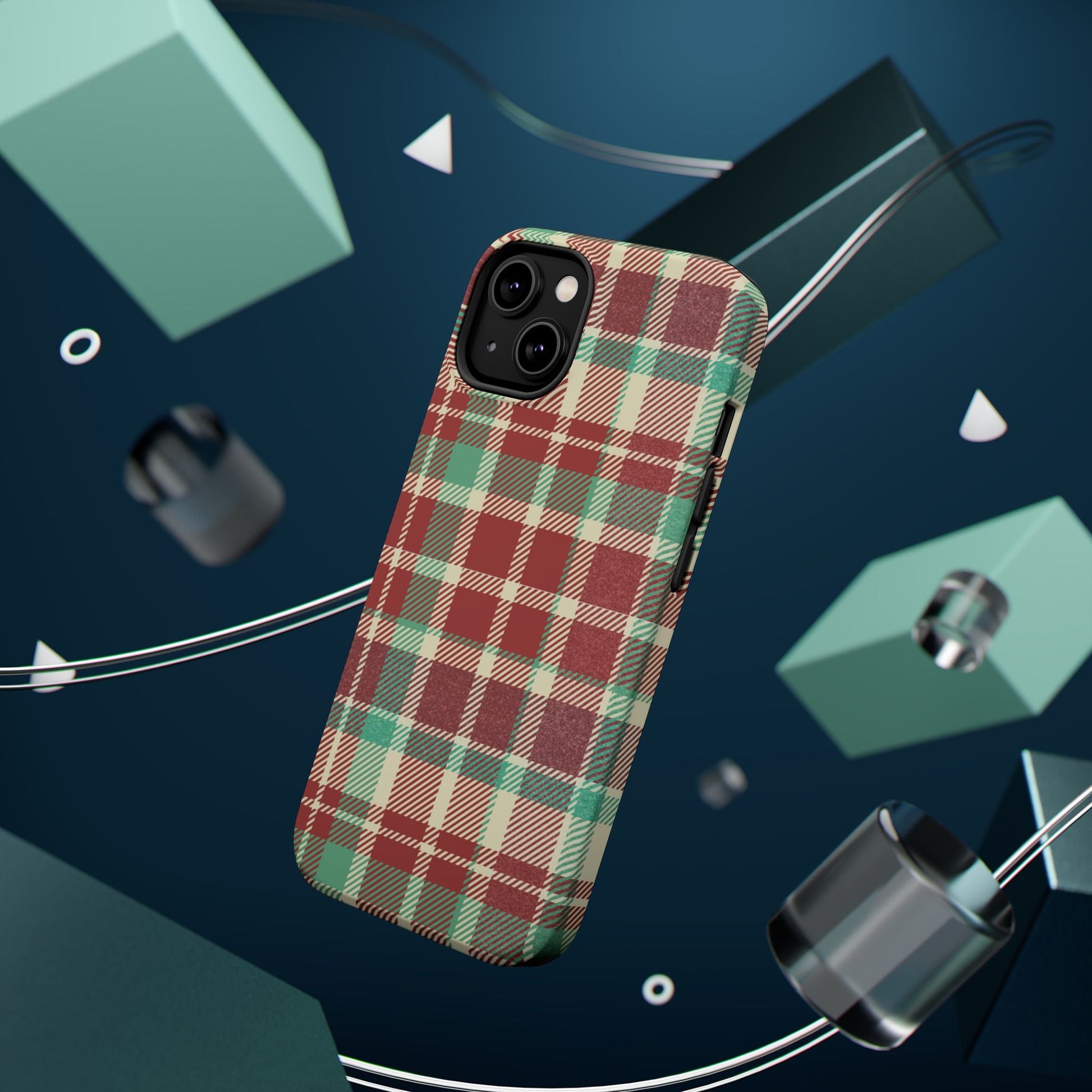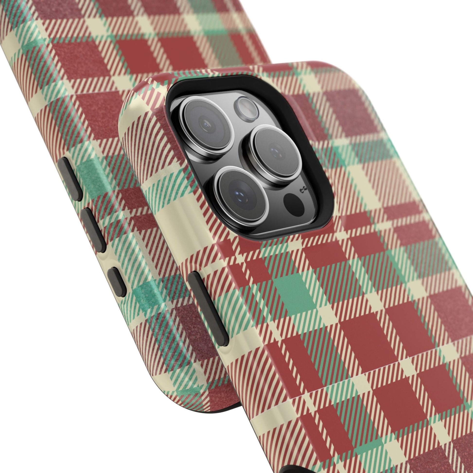 Enhance your MagSafe iPhone with the Retro Red & Cream Plaid Case. This charming case features a cozy plaid design in red, cream, and teal tones, exuding vintage appeal. MagSafe-compatible and drop-tested, it combines elegant style with effortless functionality for everyday use.