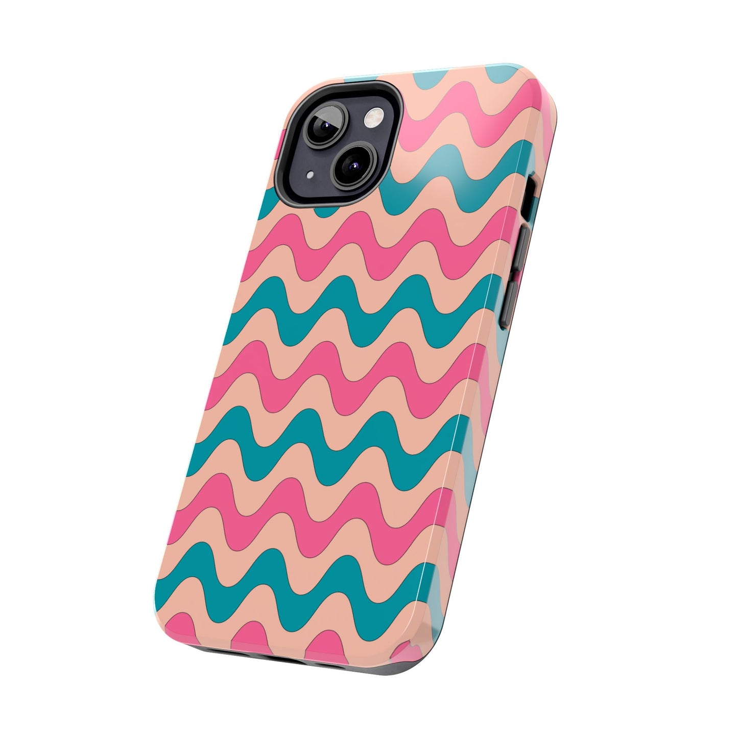 Elevate your iPhone style with our Retro Waves Pattern iPhone Case, featuring a nostalgic wavy design in playful pink, teal, and peach tones. This eye-catching case captures the carefree vibe of retro aesthetics with a modern twist, making it the perfect accessory for adding a touch of vintage flair to your everyday look. Crafted with a tough dual-layer construction, it offers durable protection against drops and scratches, while still being sleek and lightweight for easy handling.