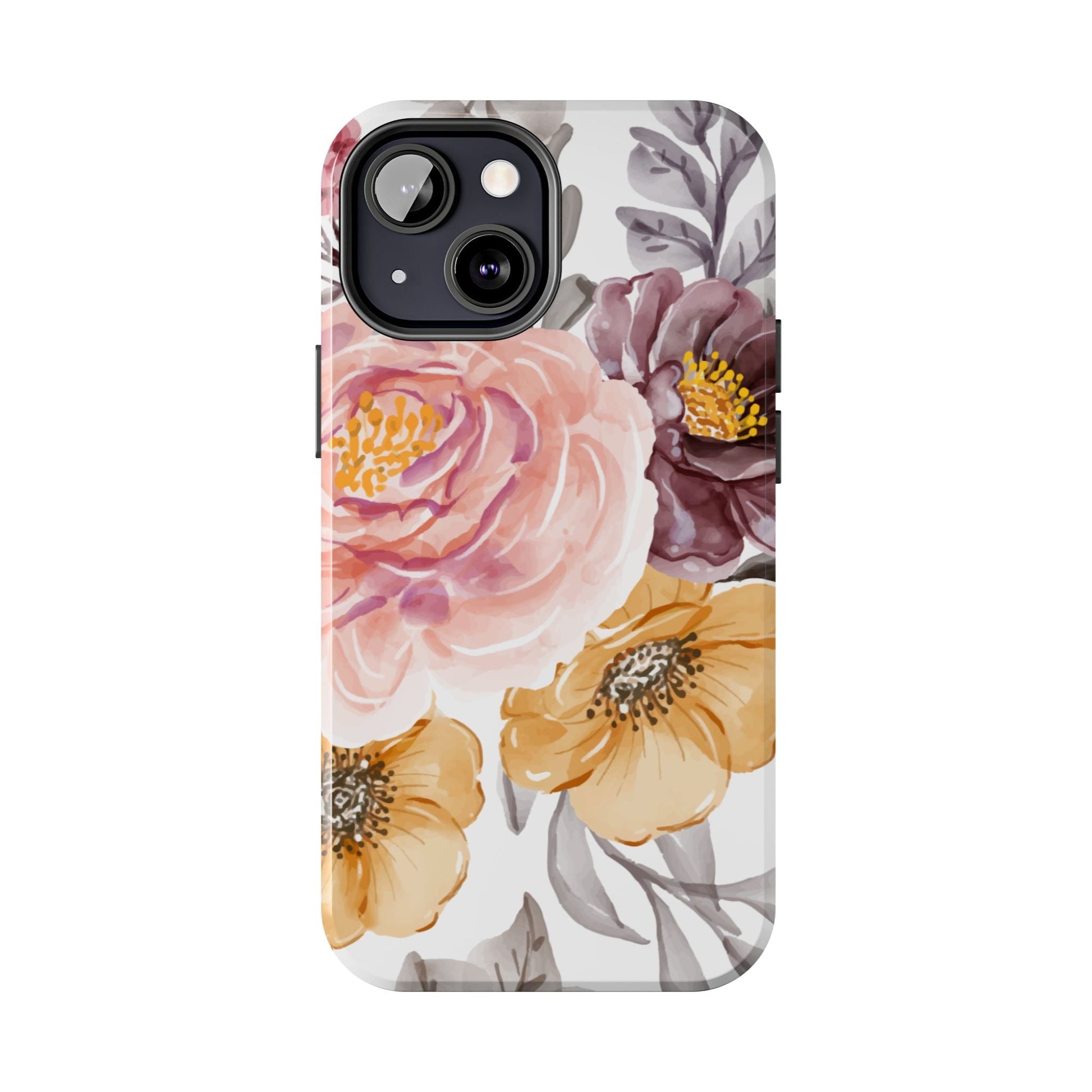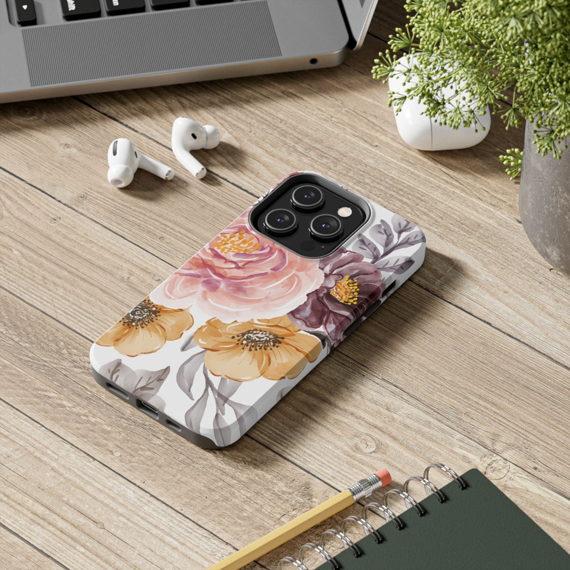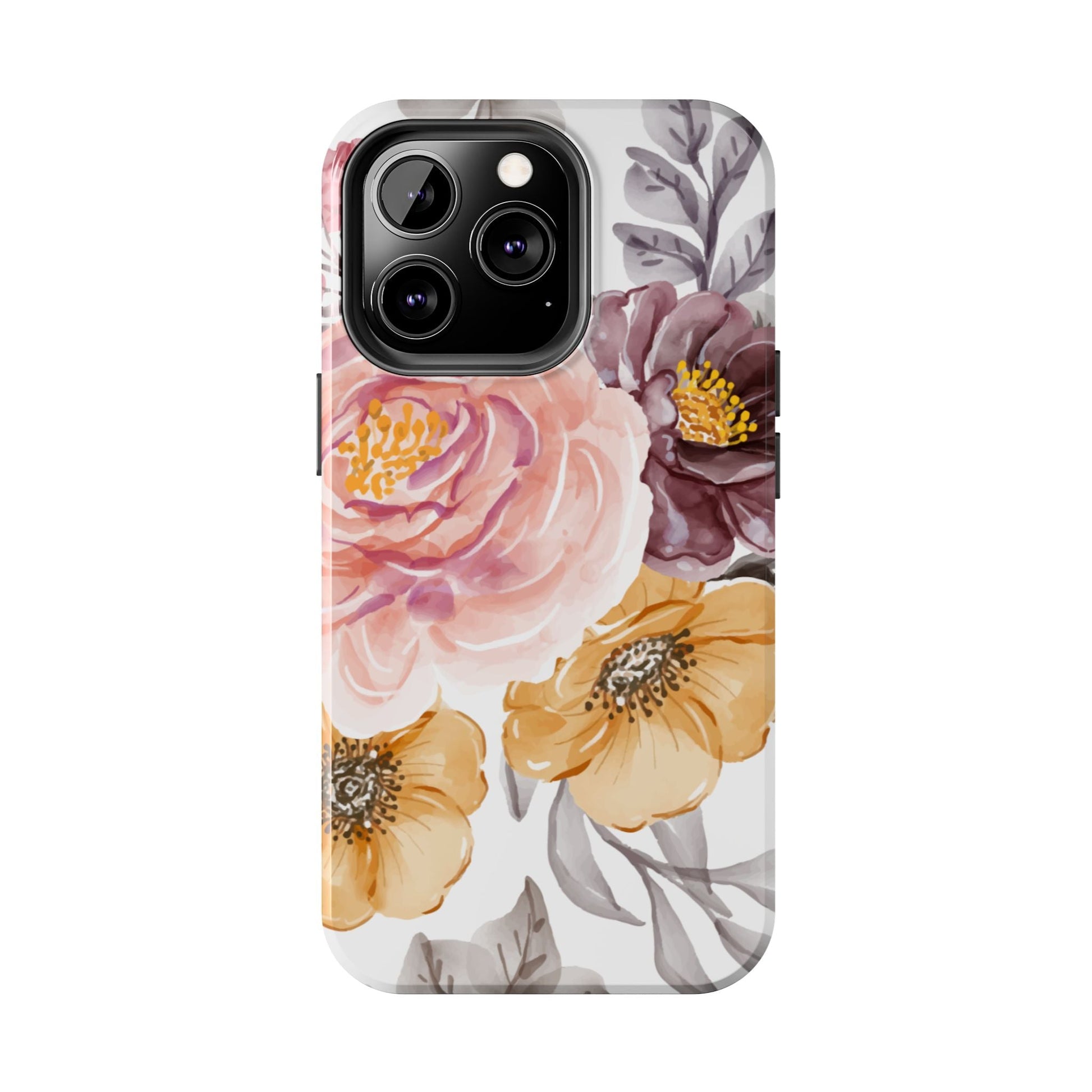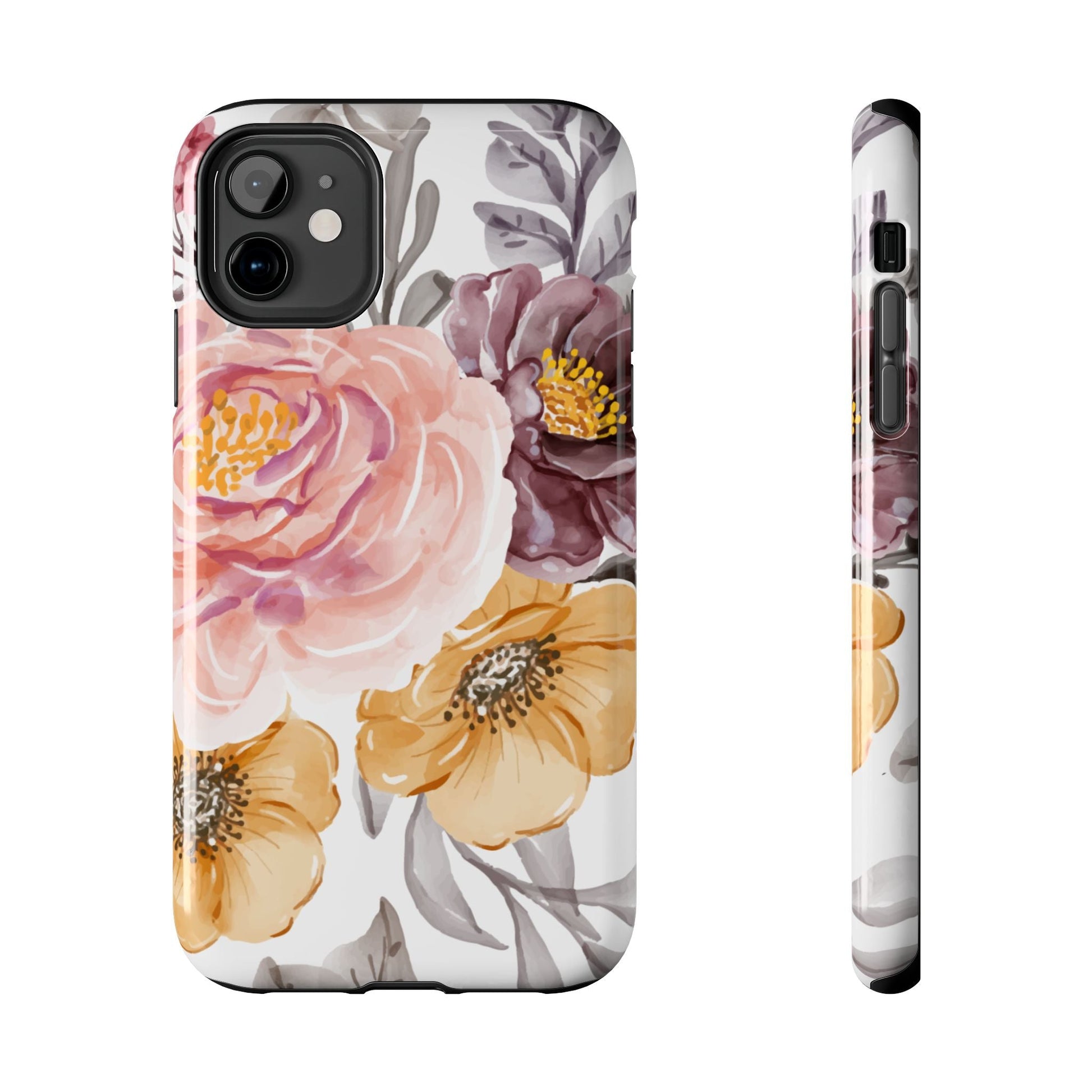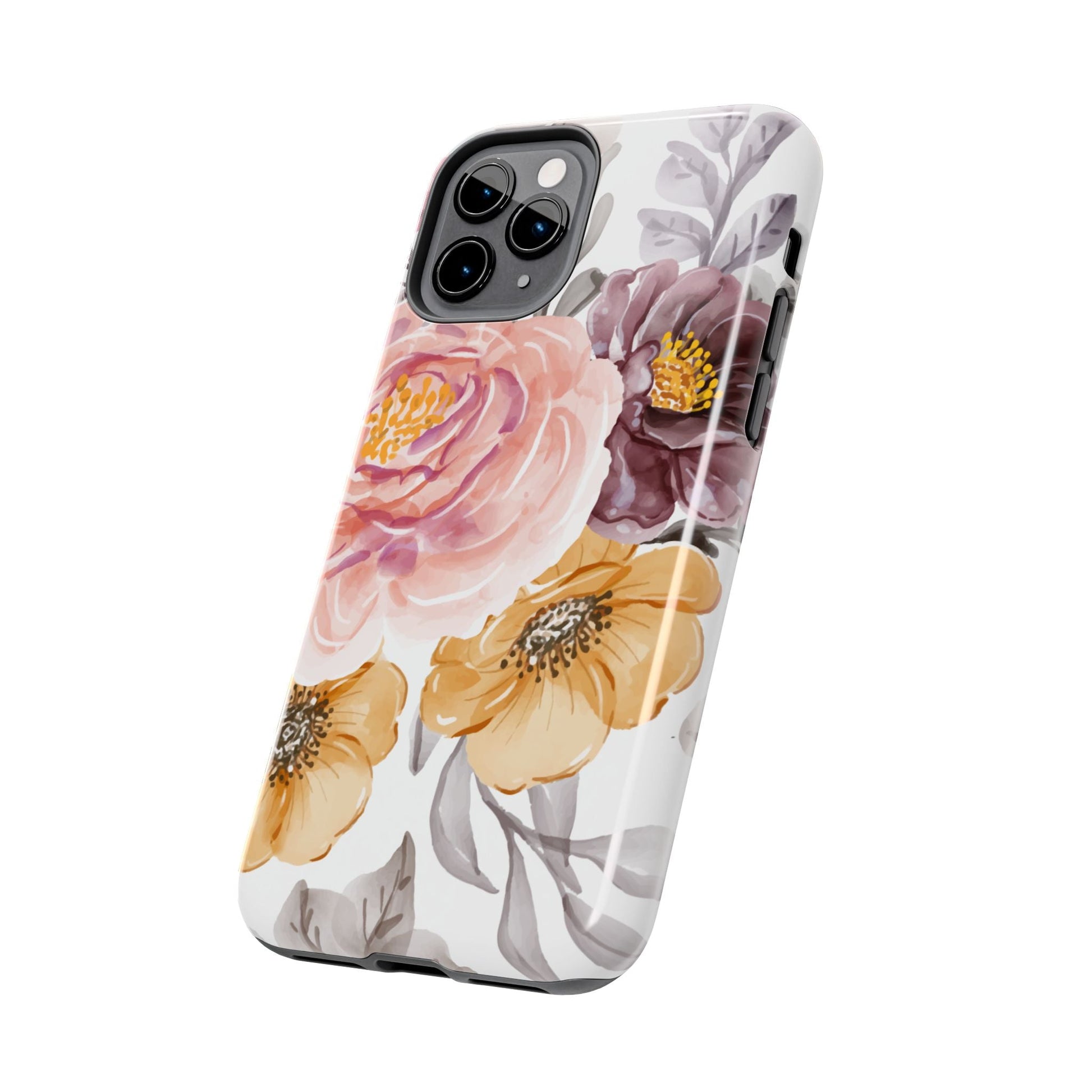 Fall in love with florals! This romantic watercolor iPhone case features soft peach, golden yellow, and deep plum fl...