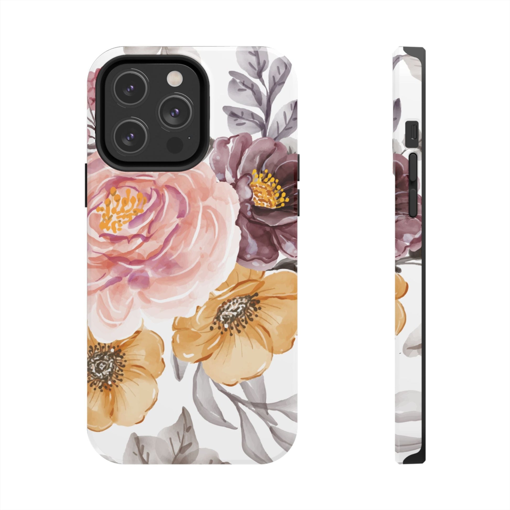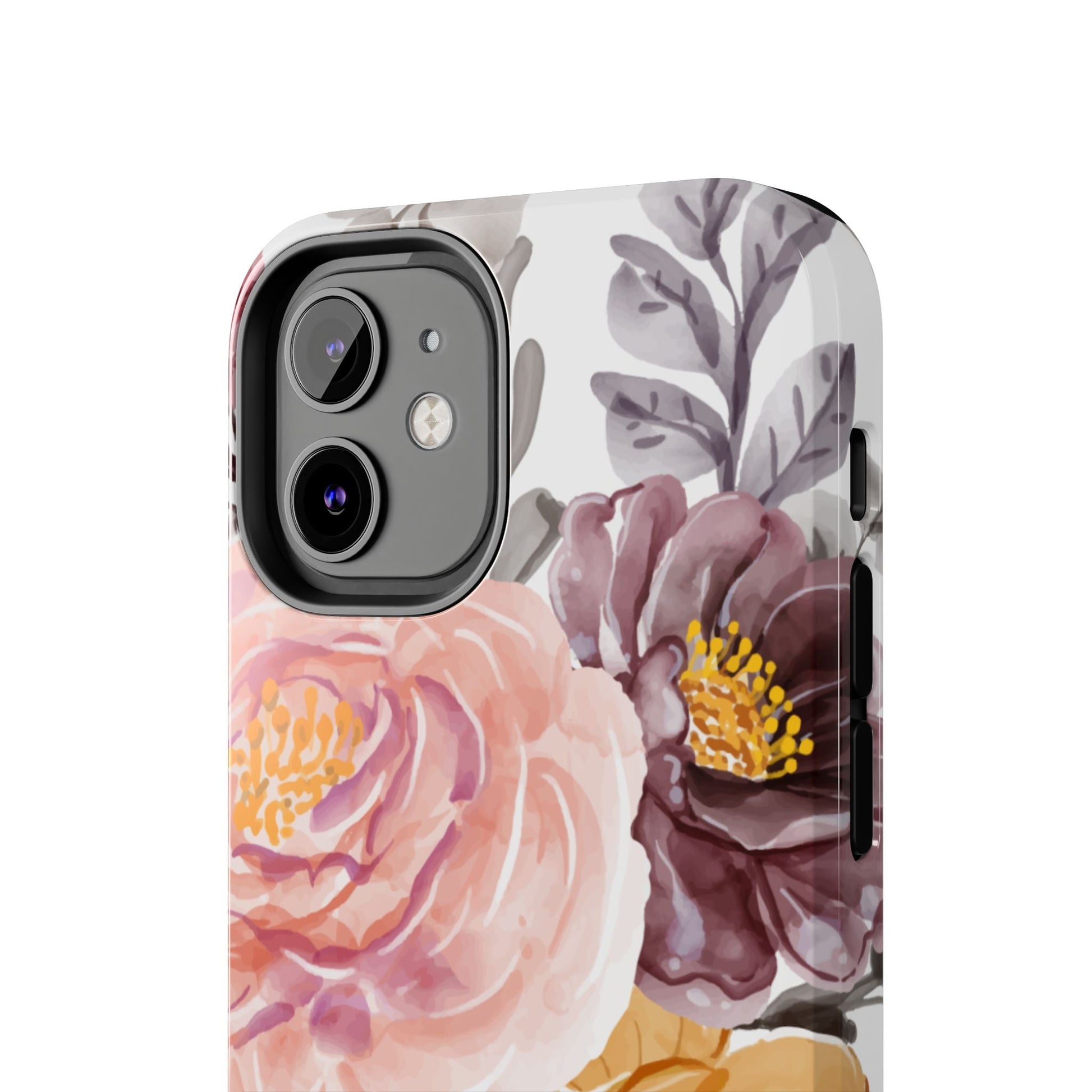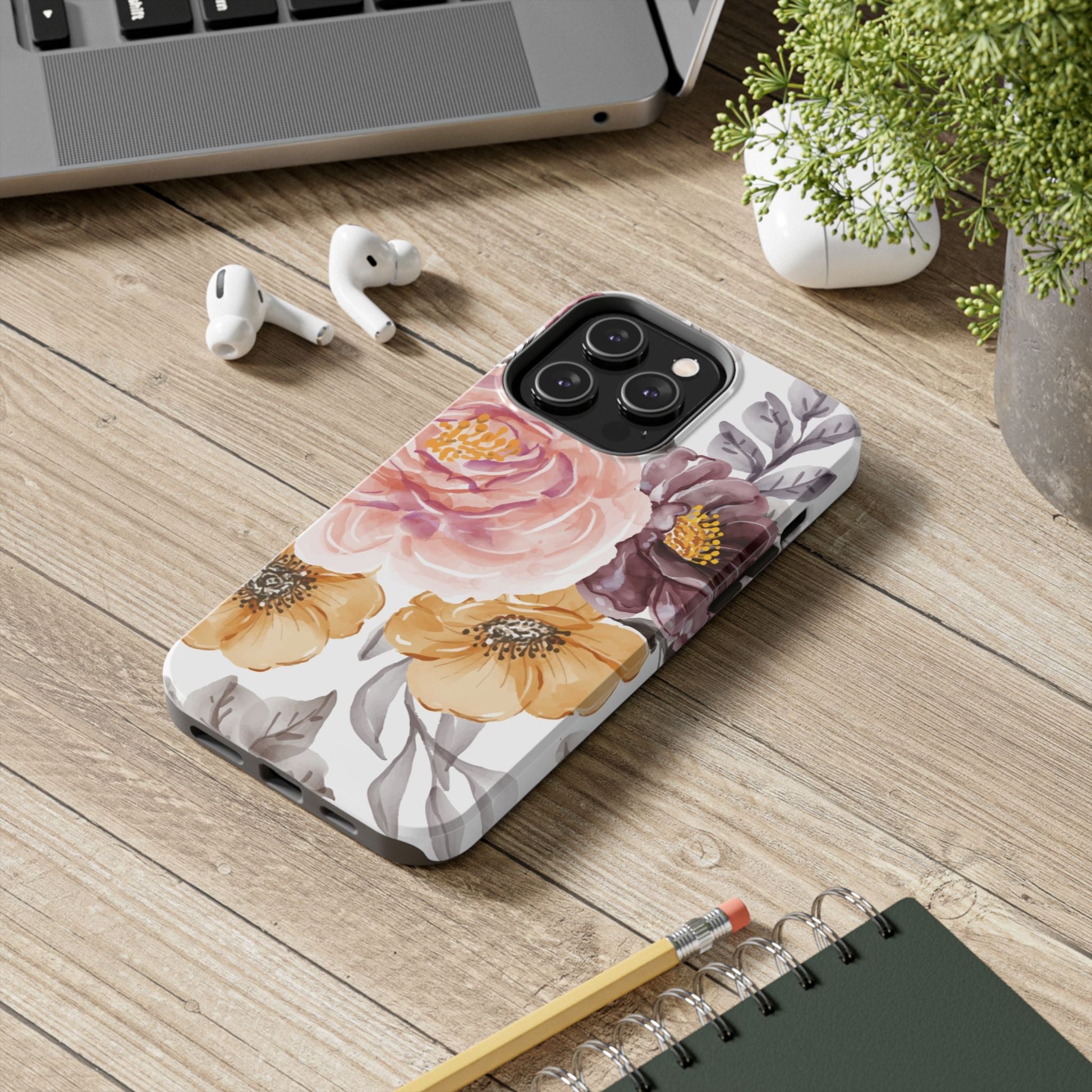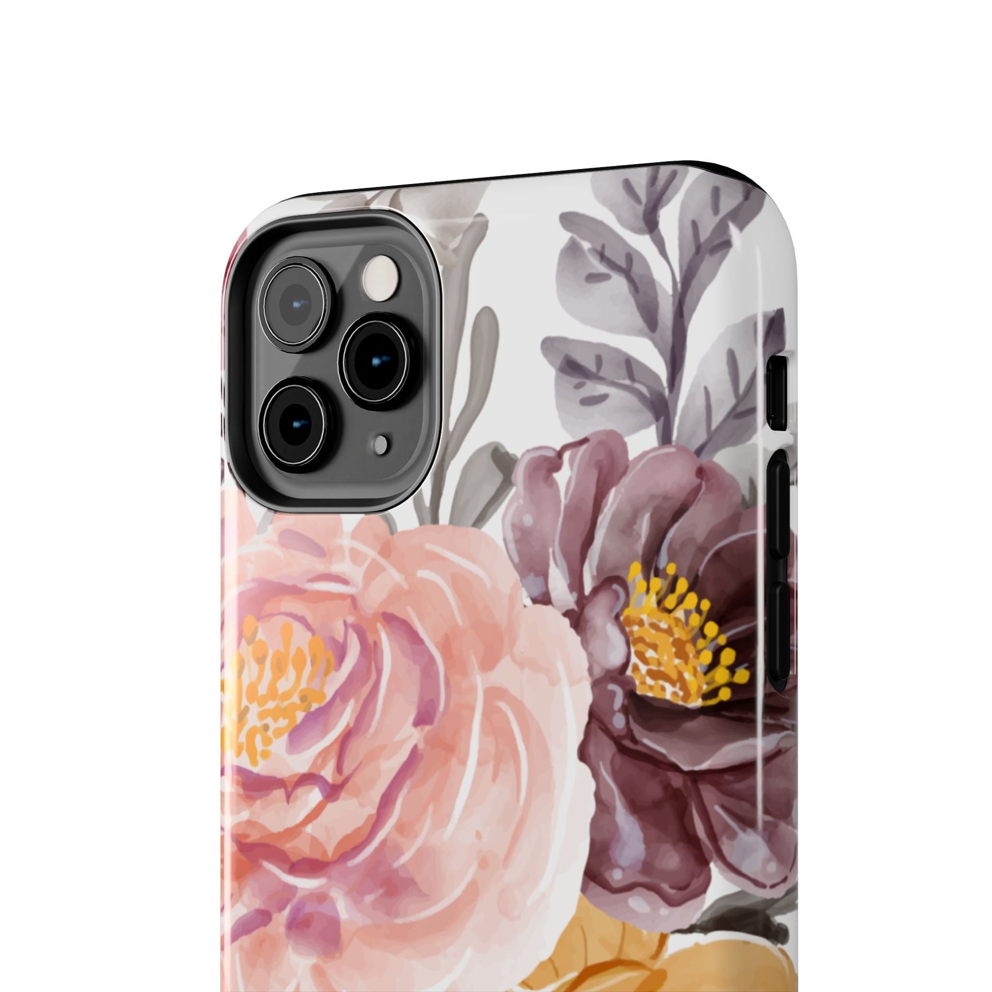Fall in love with florals! This romantic watercolor iPhone case features soft peach, golden yellow, and deep plum fl...