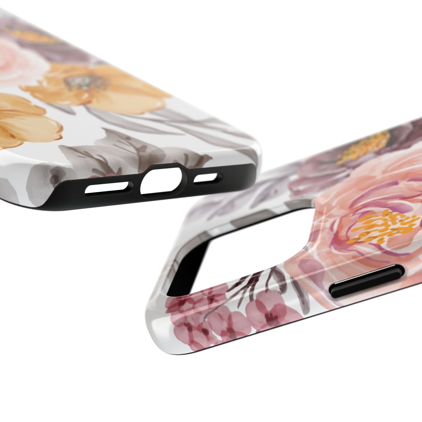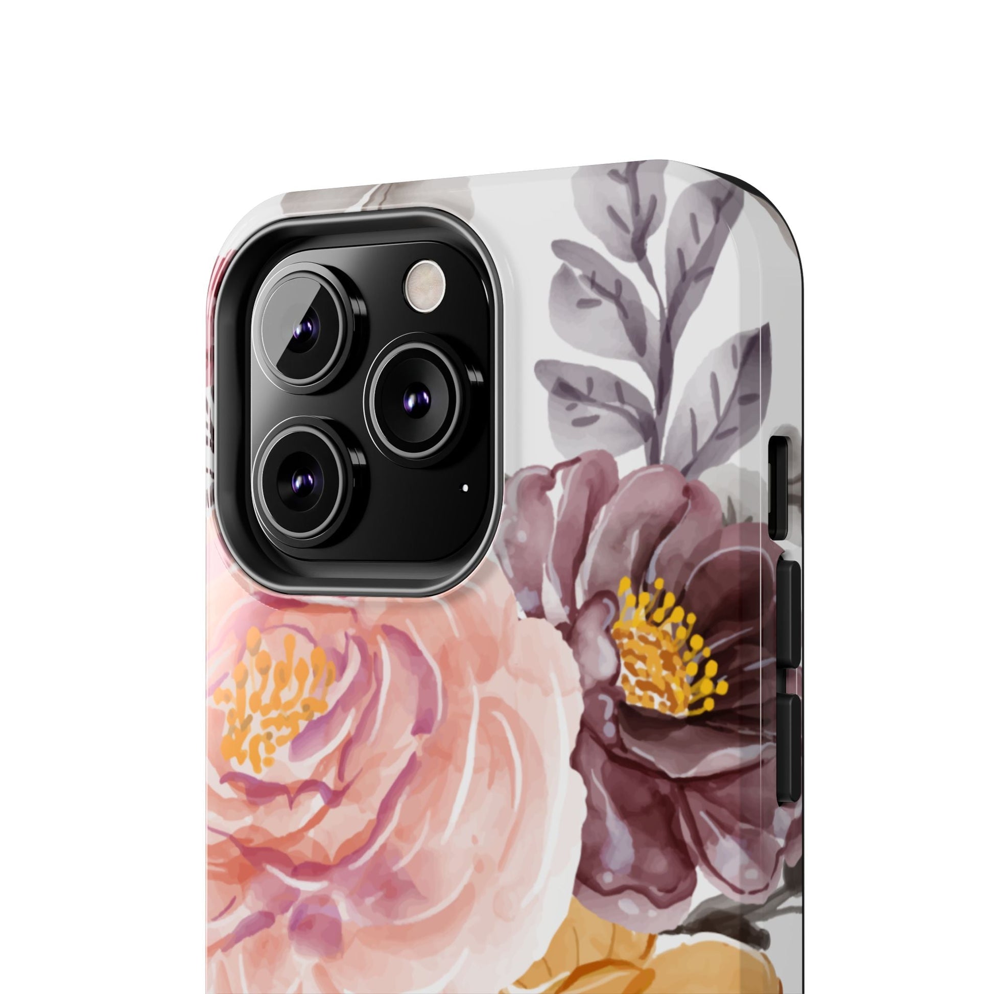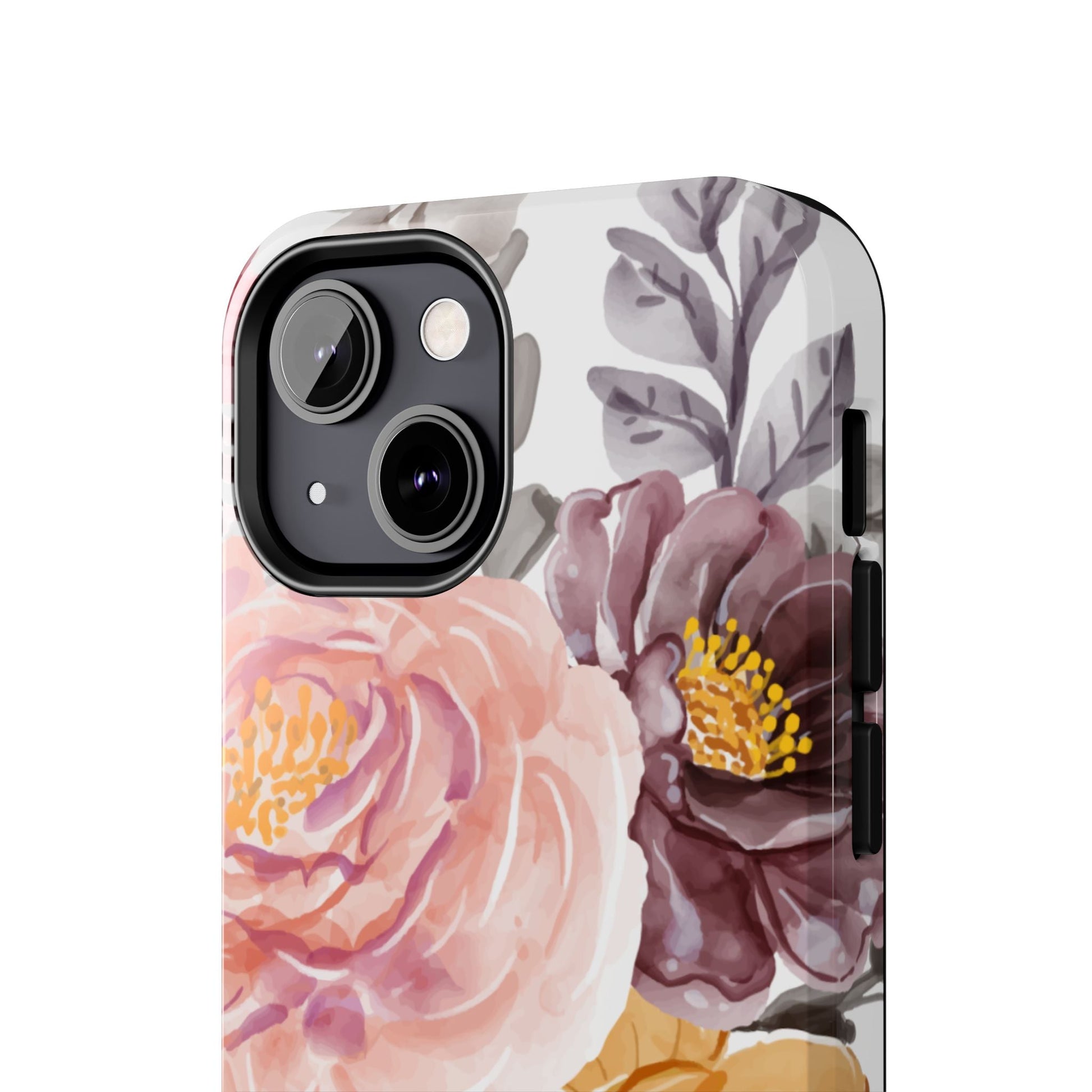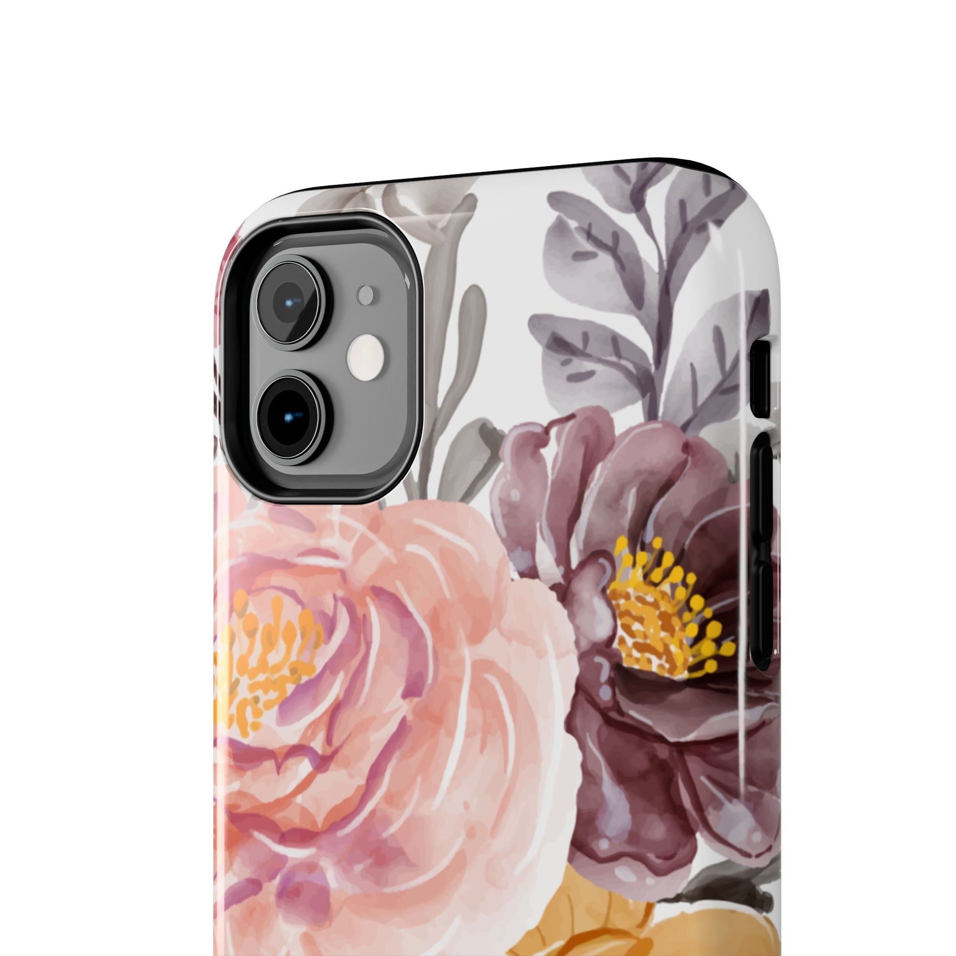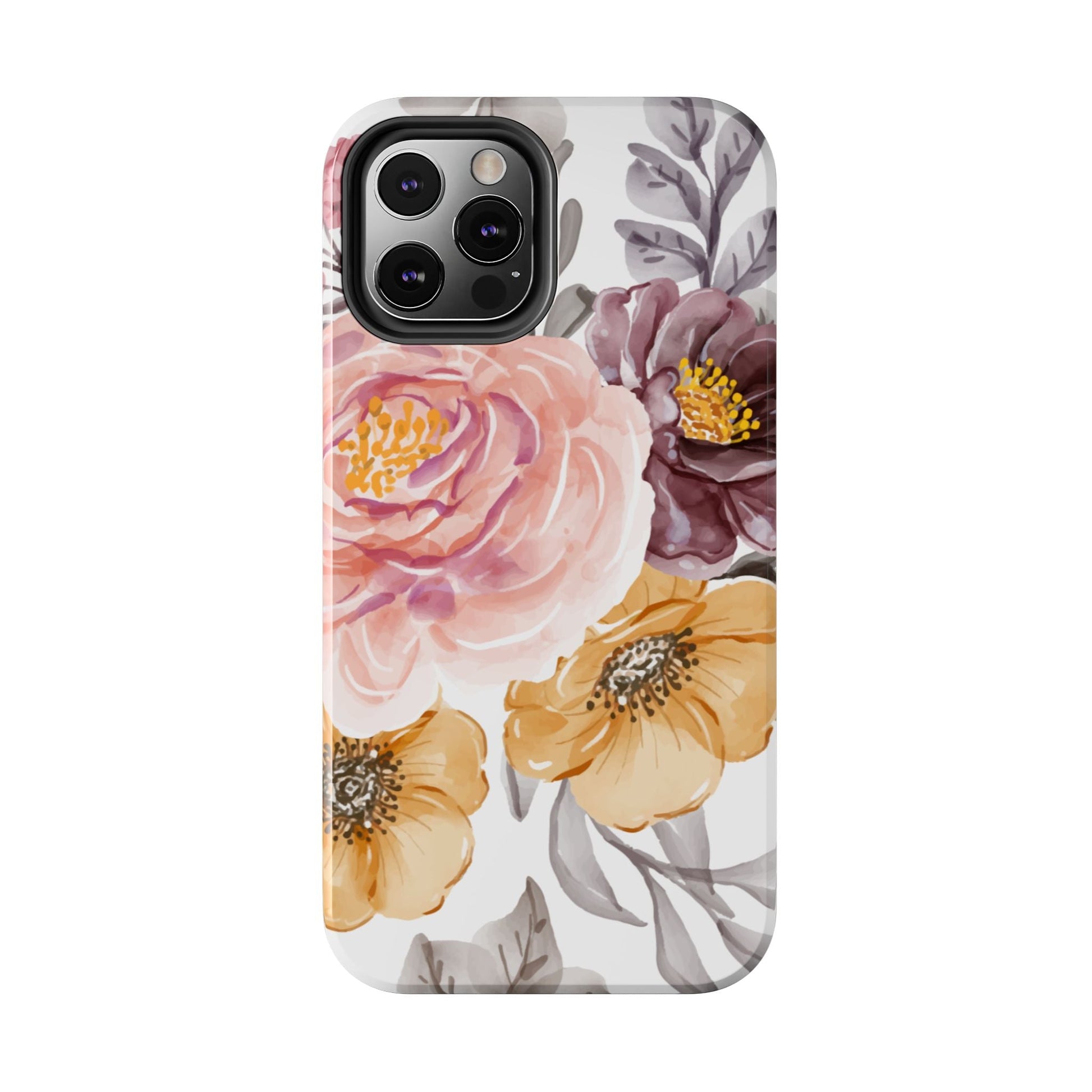 Fall in love with florals! This romantic watercolor iPhone case features soft peach, golden yellow, and deep plum fl...