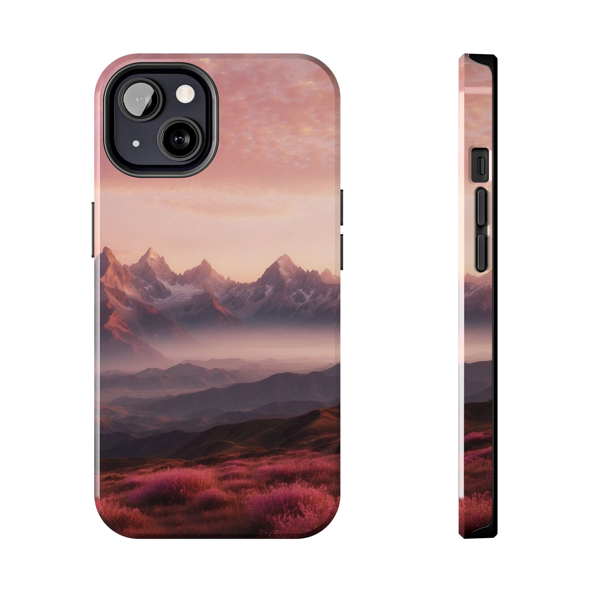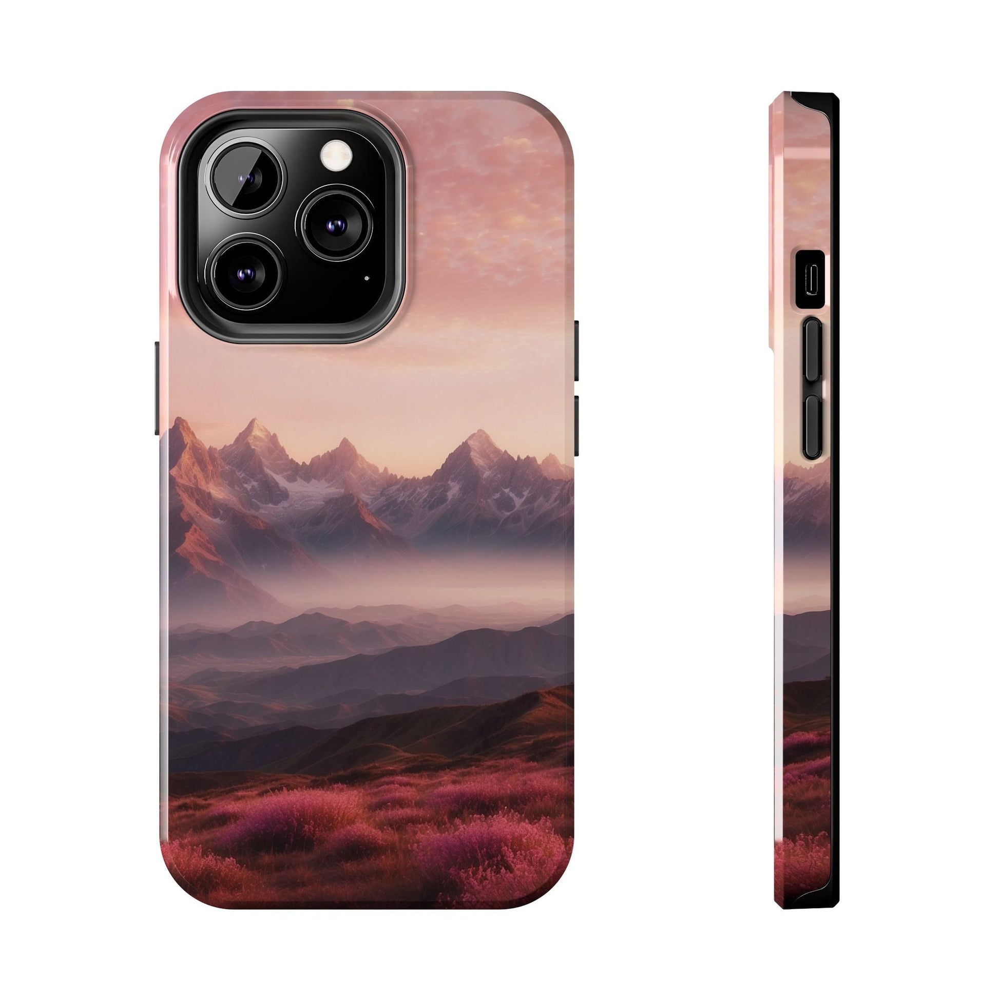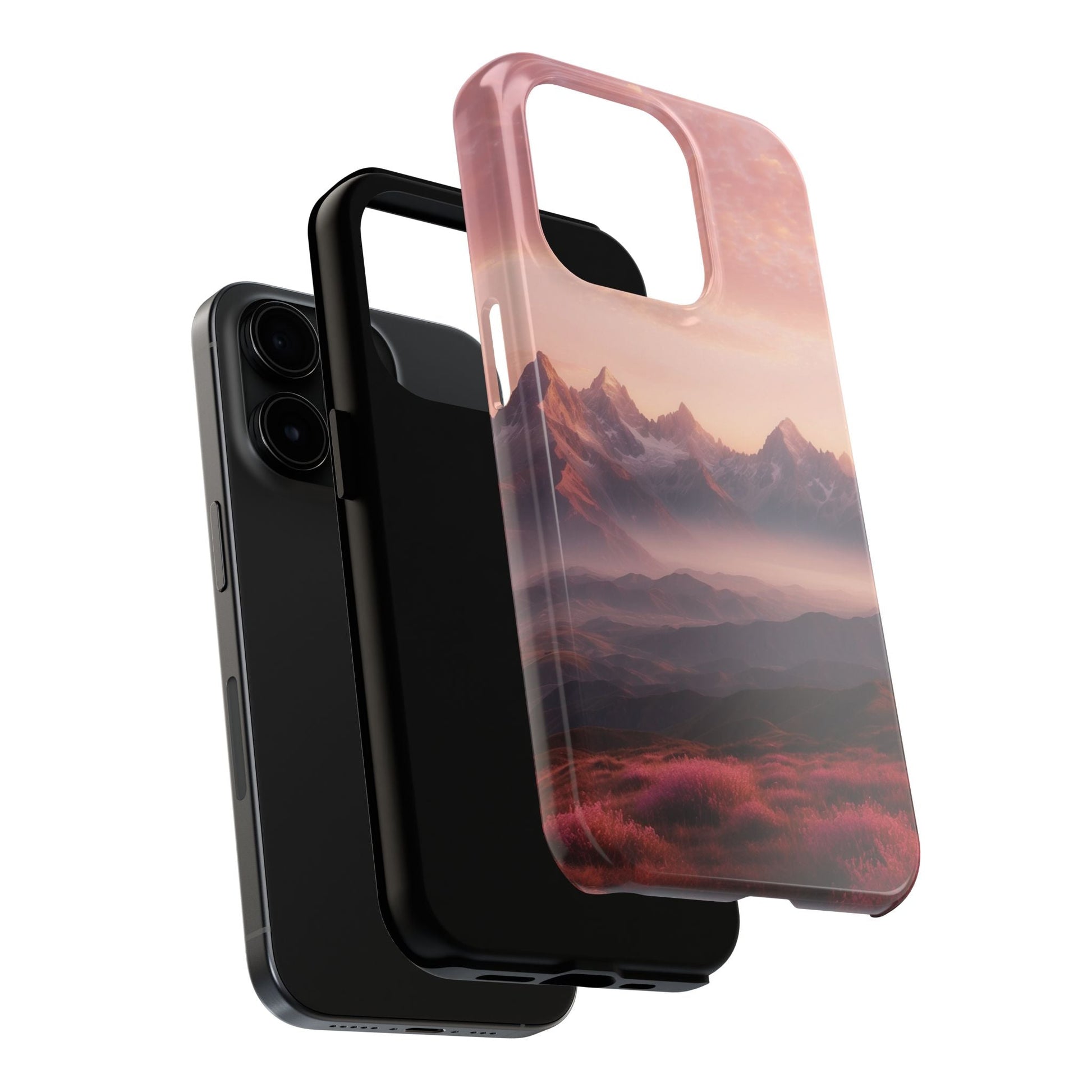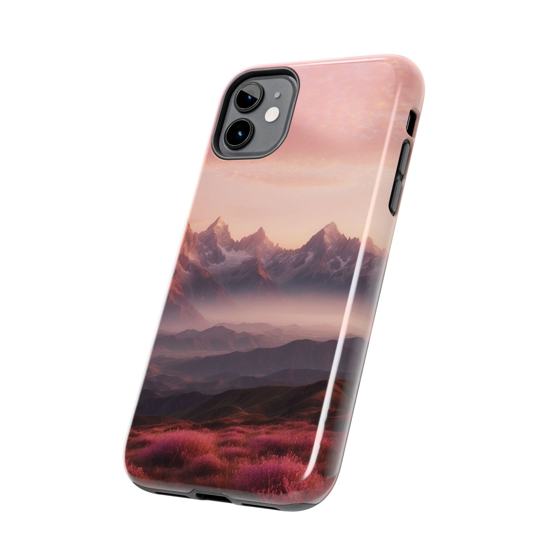 Embrace the serenity of sunrise with our Rosy Dawn iPhone Case! This breathtaking design captures the magic of a dawn sky painting the mountains in hues of pink and purple, while a field of wildflowers blooms below. It's a captivating scene that brings the tranquility of nature to your phone. Crafted with a dual-layer design, combining a shock-absorbing TPU inner layer and a sturdy polycarbonate outer shell, this case provides reliable protection against everyday bumps and drops. With its slim and lightweight design, it's easy to slip in and out of your pocket, while still offering robust protection.
