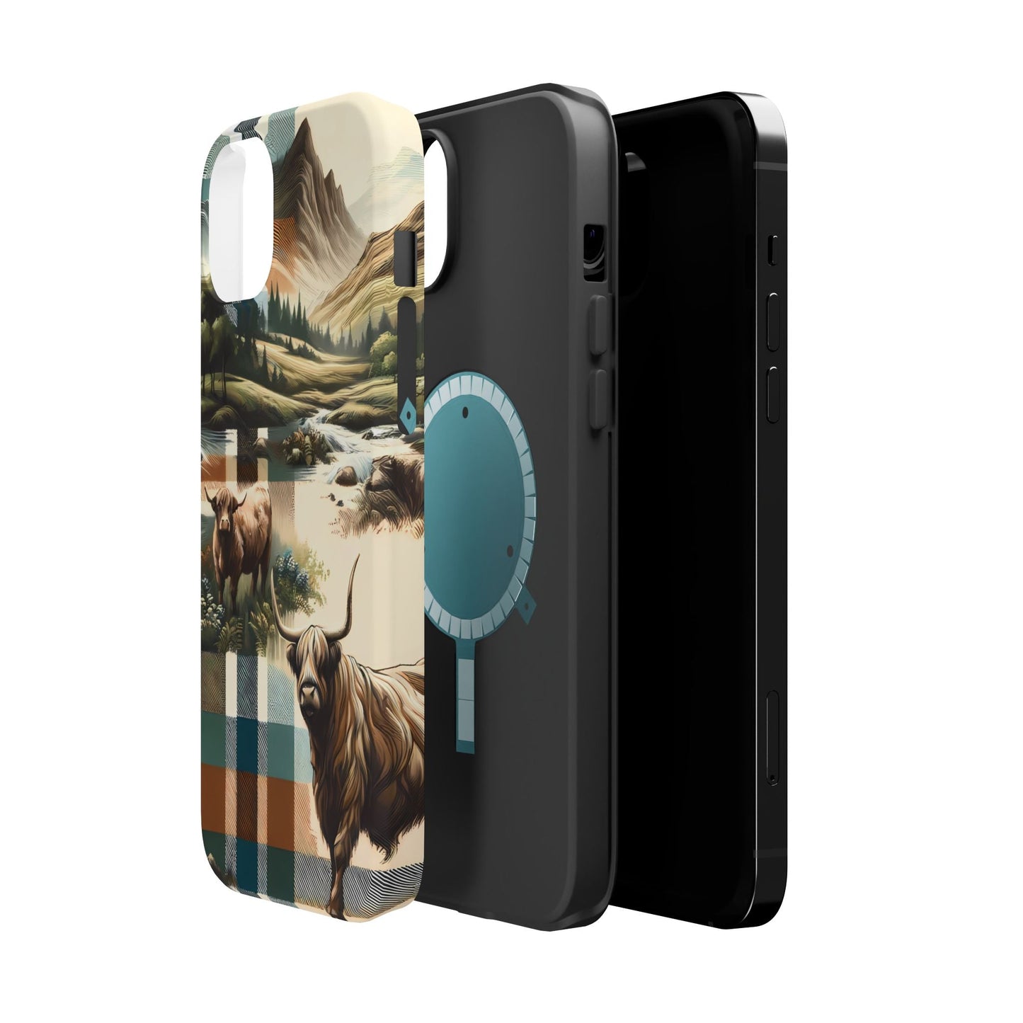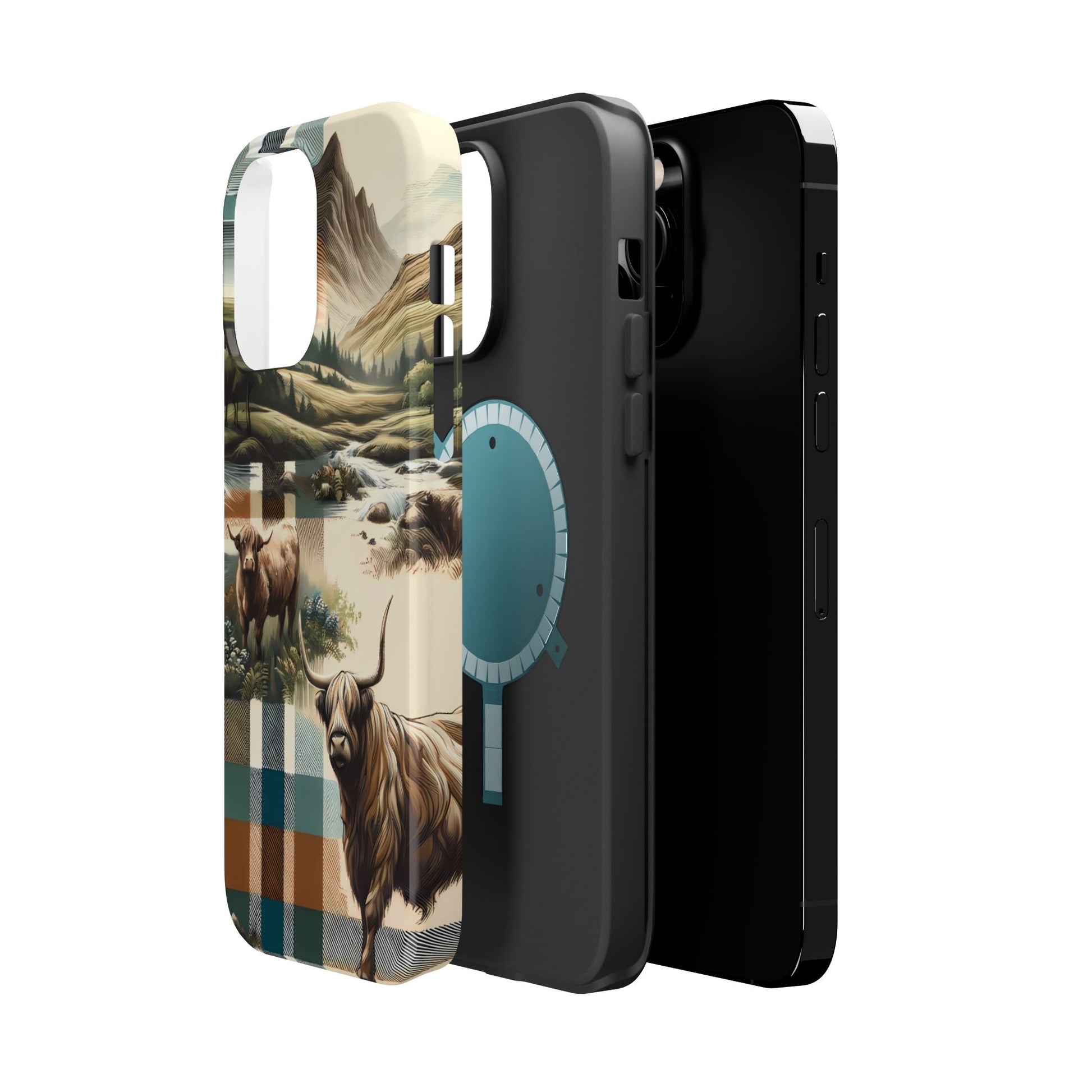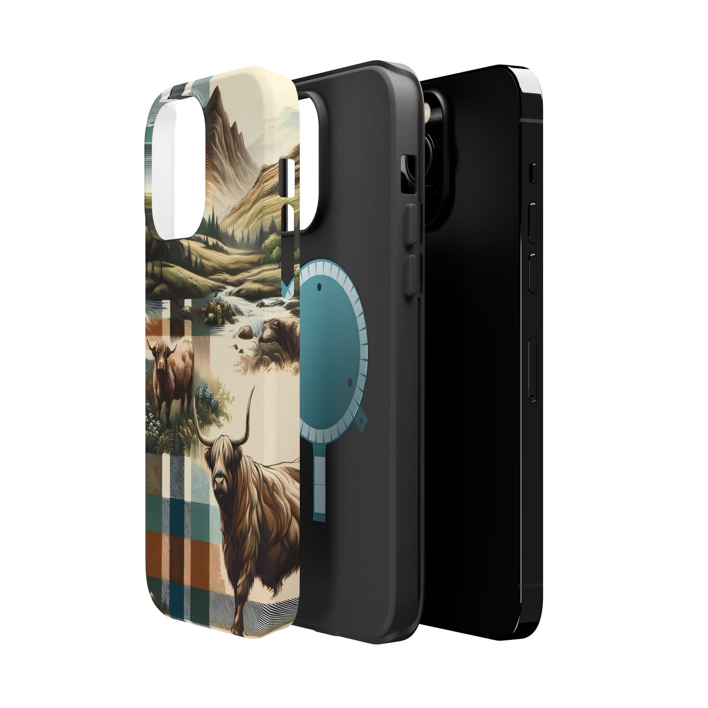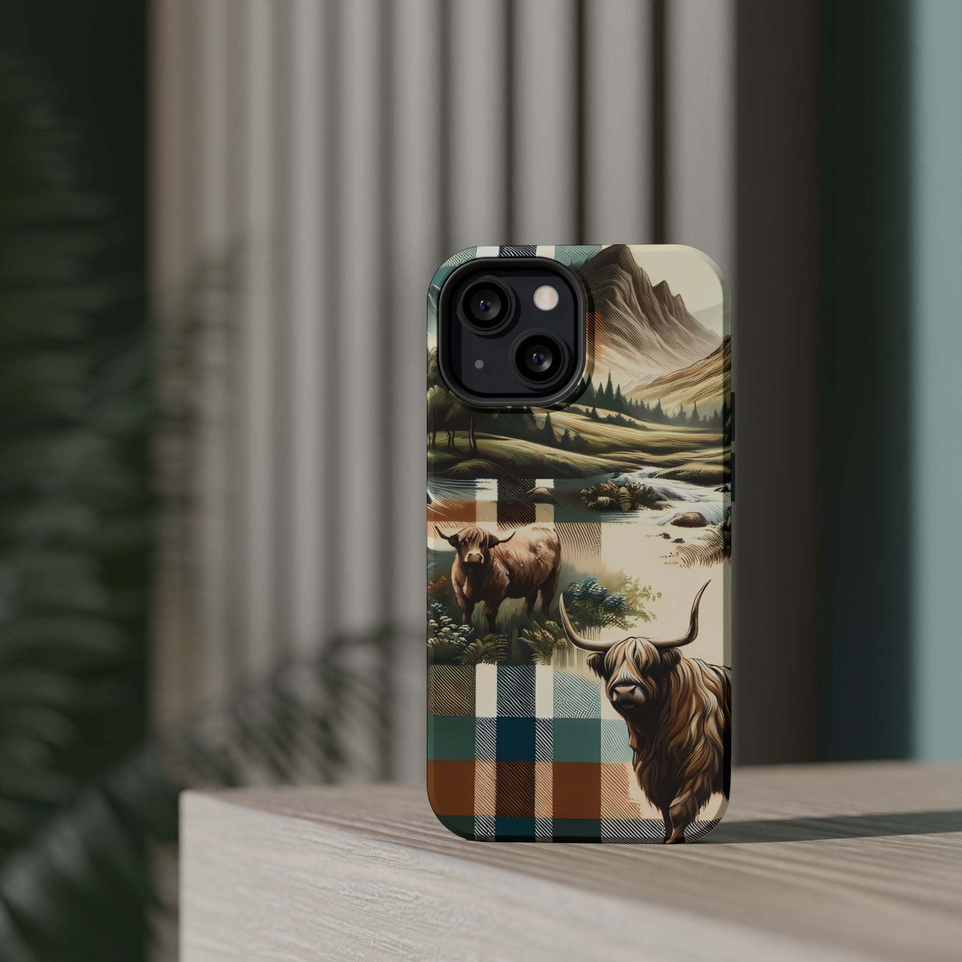 Celebrate the beauty of the countryside with this stunning Highland cow iPhone case. Featuring serene pastures, majestic mountains, and rustic plaid accents in warm earthy tones, this design captures a cozy, farmhouse aesthetic. Perfect for lovers of rural charm and nature-inspired style, this case provides top-notch protection for your phone while showcasing your personality. MagSafe-compatible, it’s as functional as it is fashionable, making it the perfect blend of practicality and charm.
