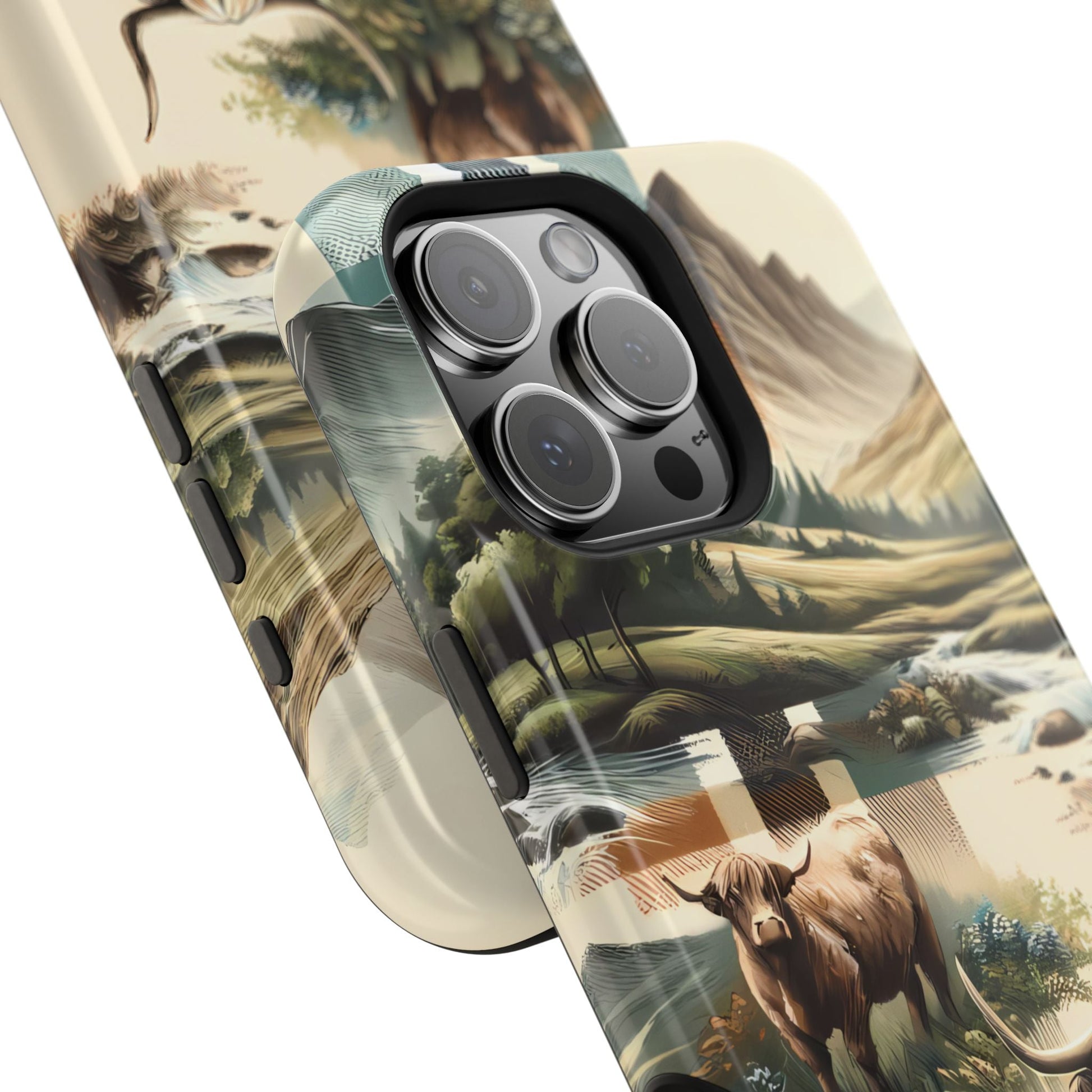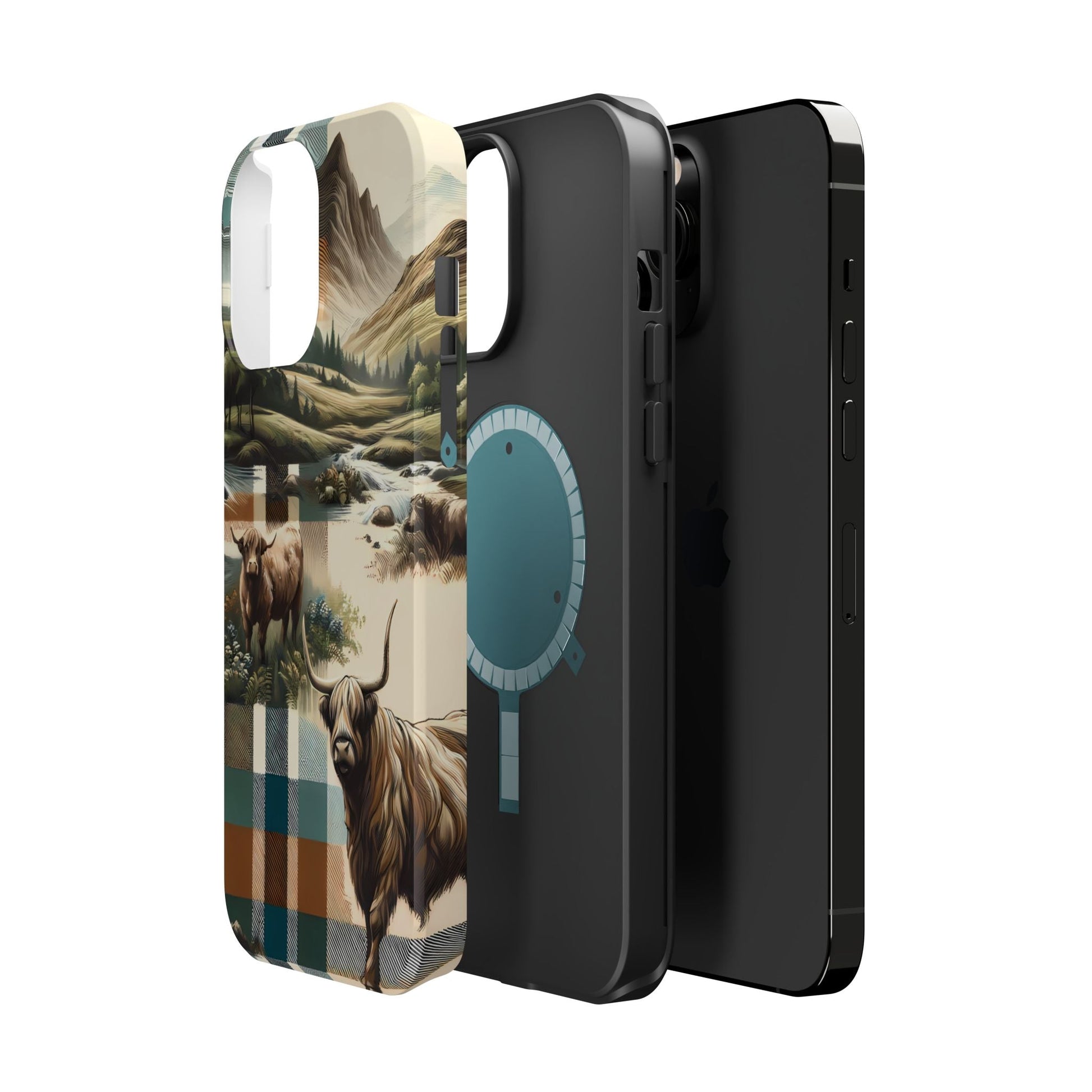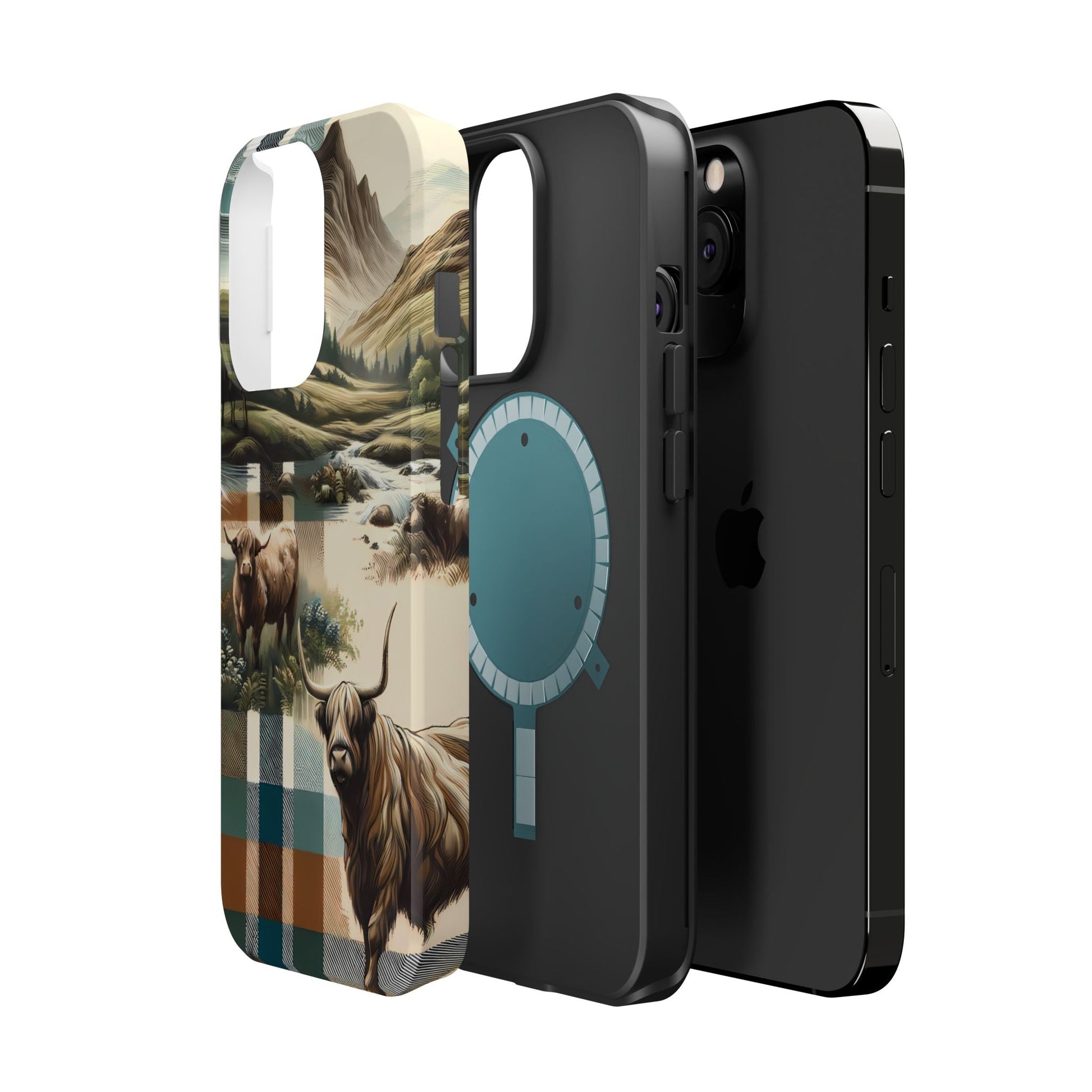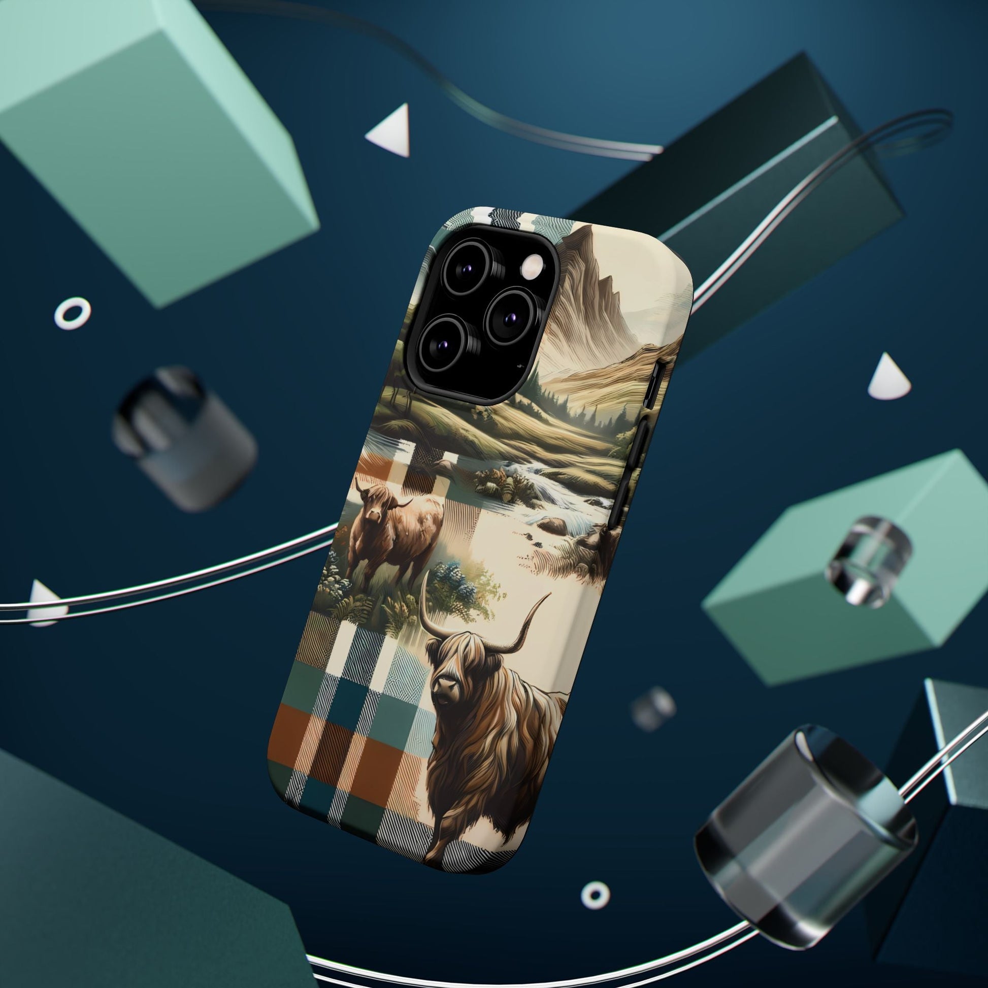 Celebrate the beauty of the countryside with this stunning Highland cow iPhone case. Featuring serene pastures, majestic mountains, and rustic plaid accents in warm earthy tones, this design captures a cozy, farmhouse aesthetic. Perfect for lovers of rural charm and nature-inspired style, this case provides top-notch protection for your phone while showcasing your personality. MagSafe-compatible, it’s as functional as it is fashionable, making it the perfect blend of practicality and charm.