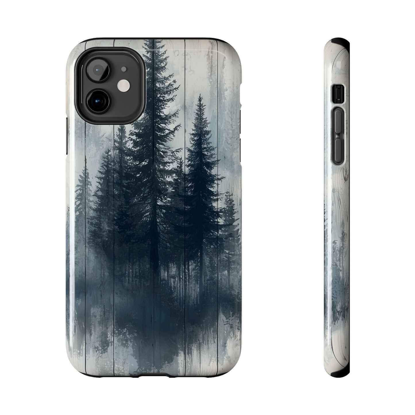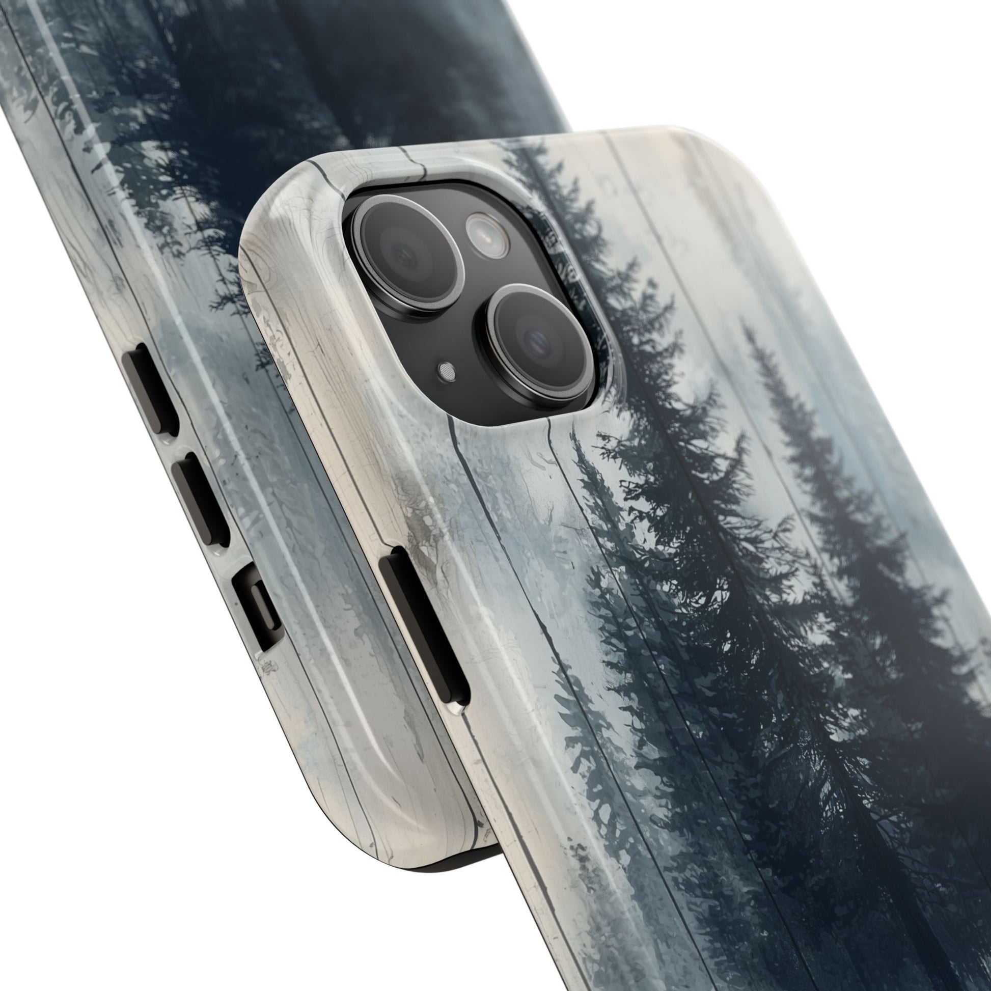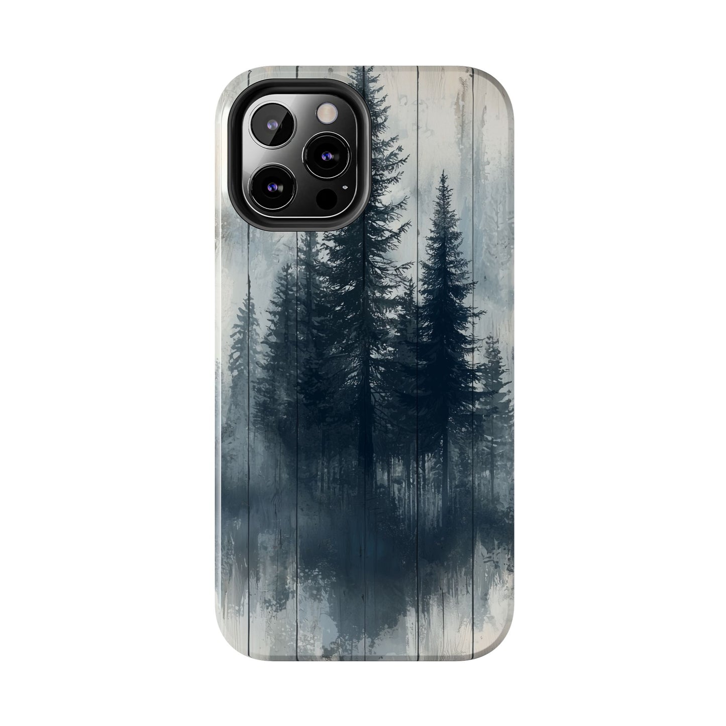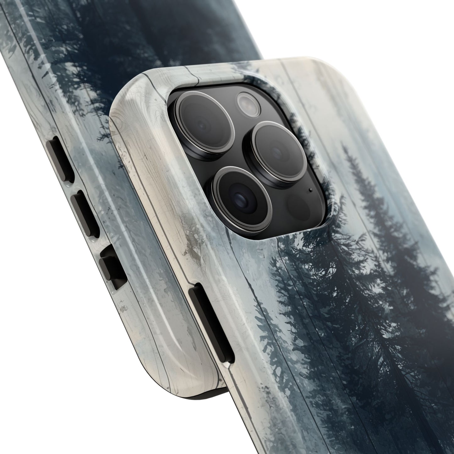 Experience nature's calm with our Rustic Pine Forest iPhone Case. The design showcases a misty, blue-toned pine forest, artfully printed on a rustic wood-textured background, perfect for outdoor enthusiasts or lovers of tranquil landscapes.